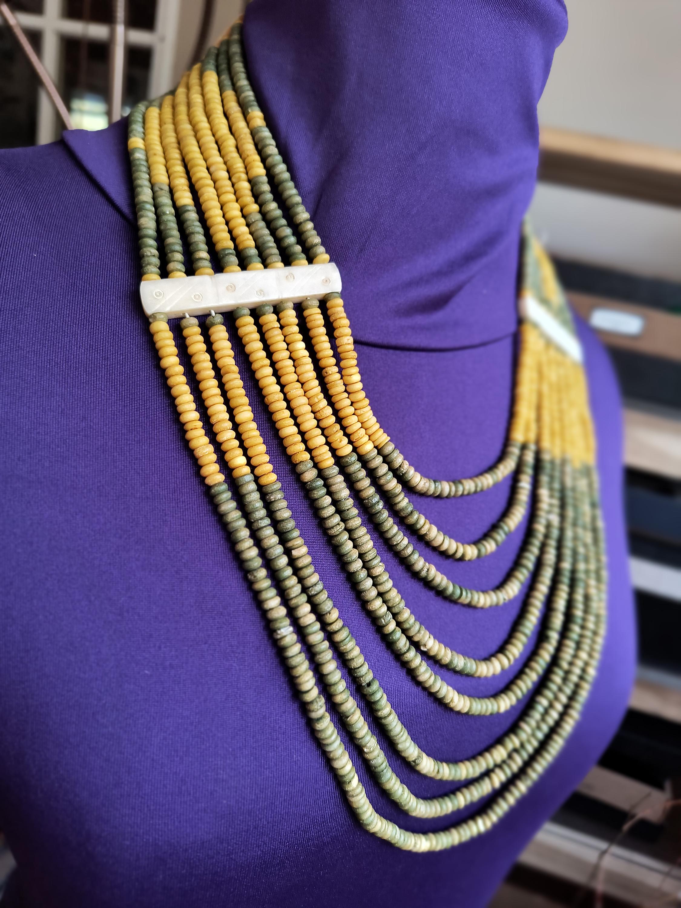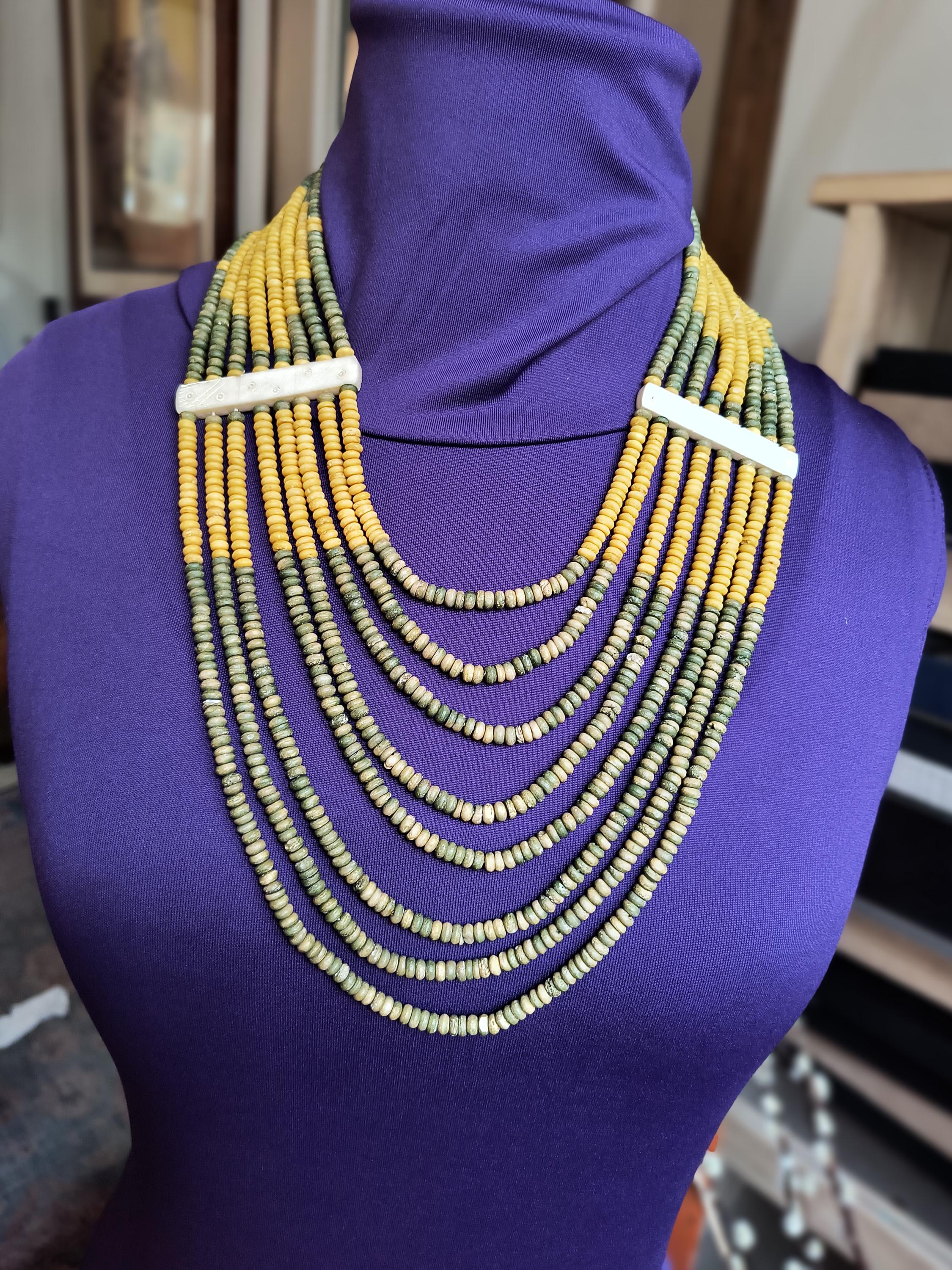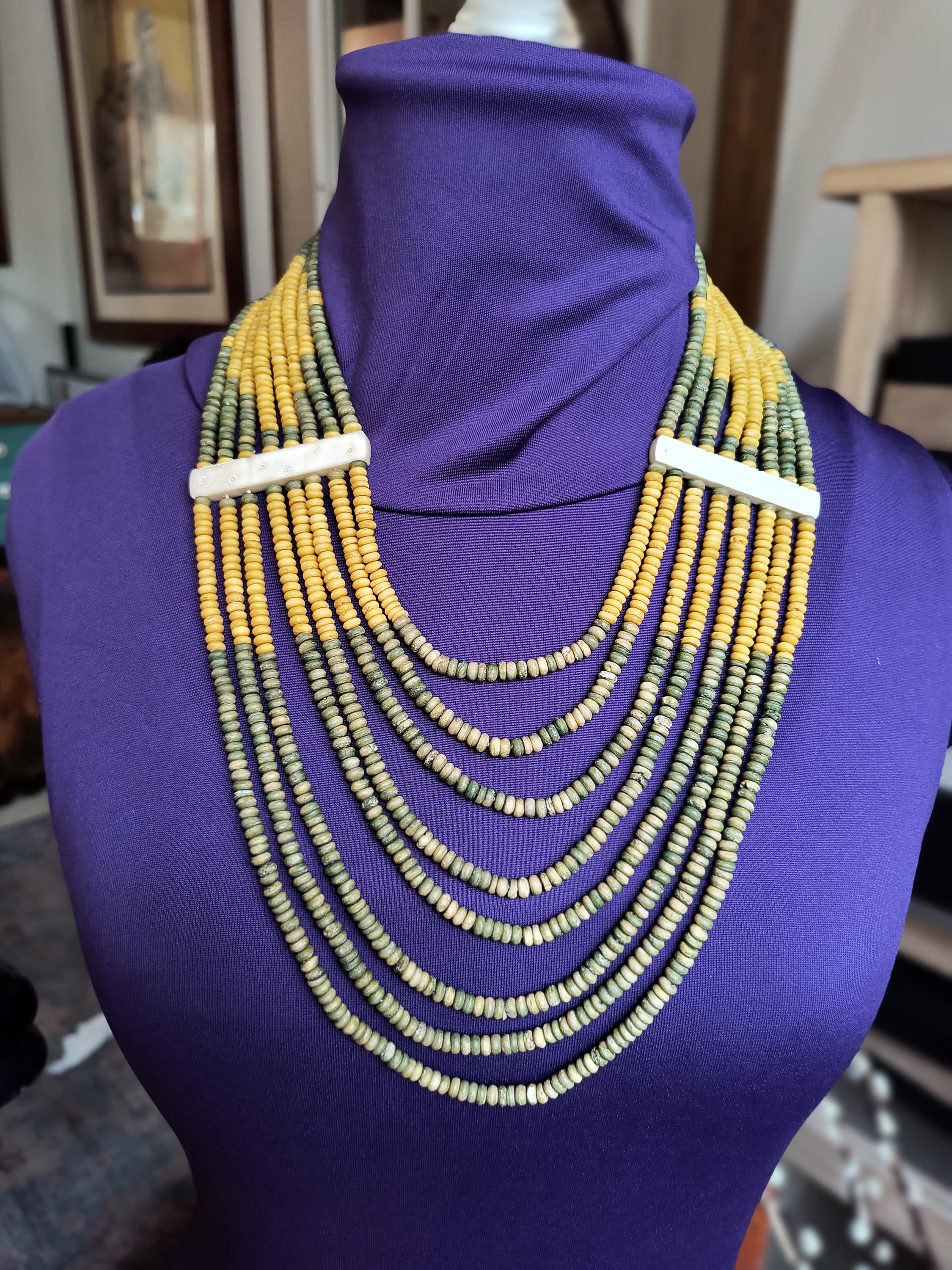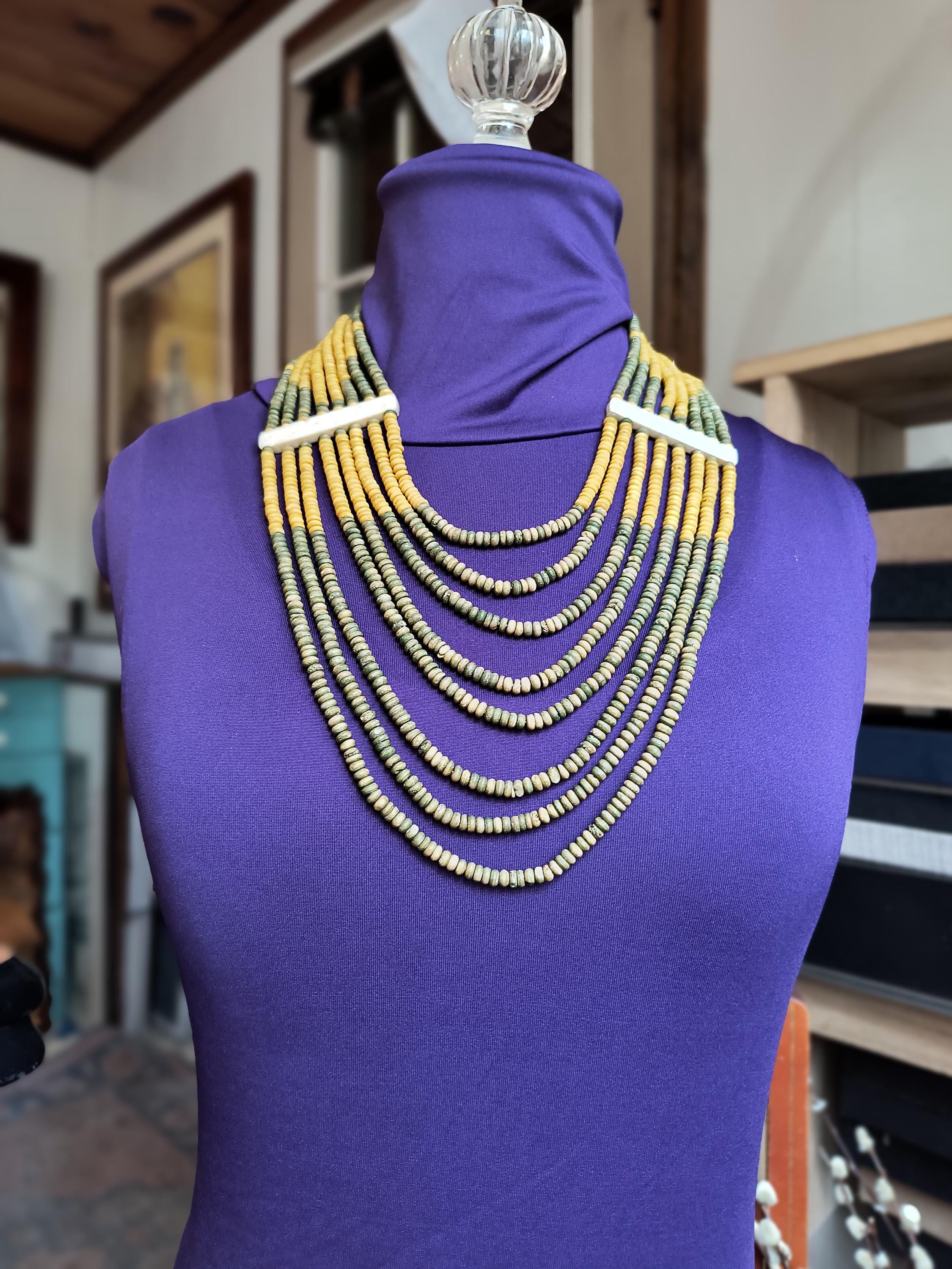 Sage green and deep golden yellow beads lay perfectly across the chest in this unique vintage necklace! Particularly nice is the use of bone spacers, all carved with a simple dot and line pattern.