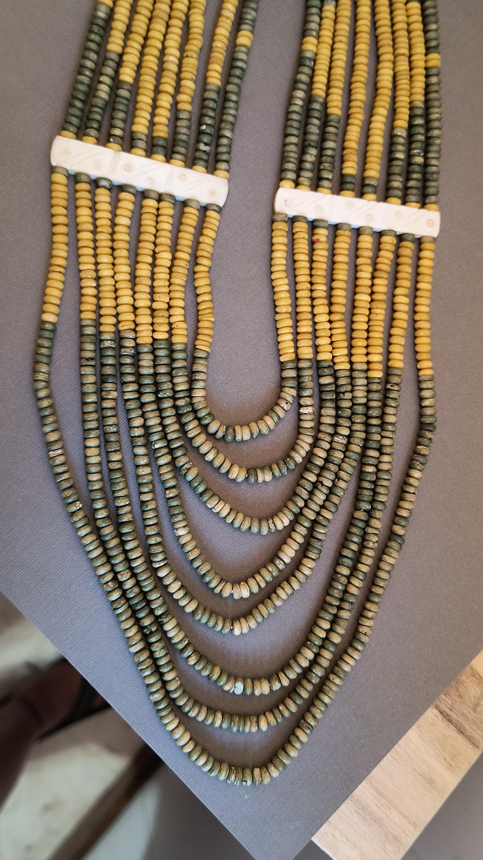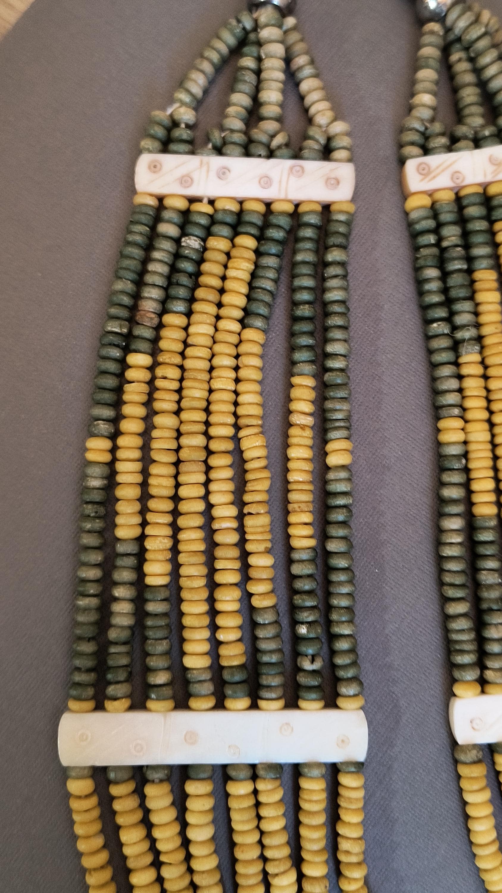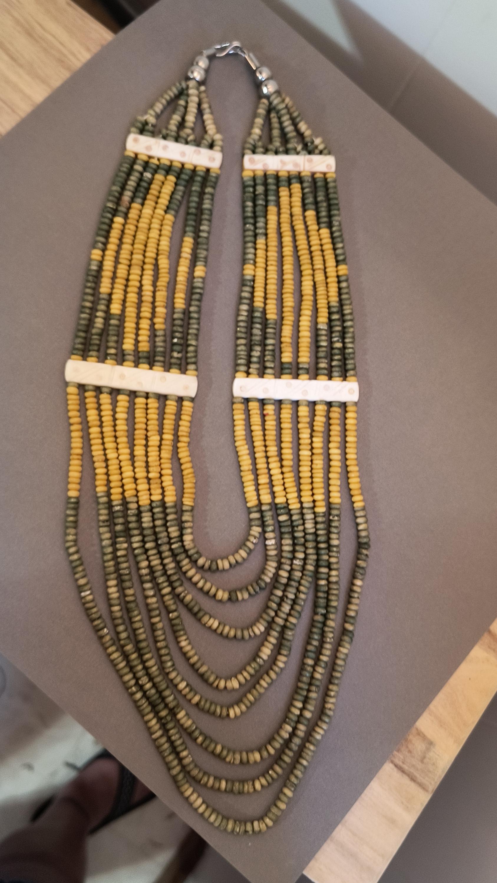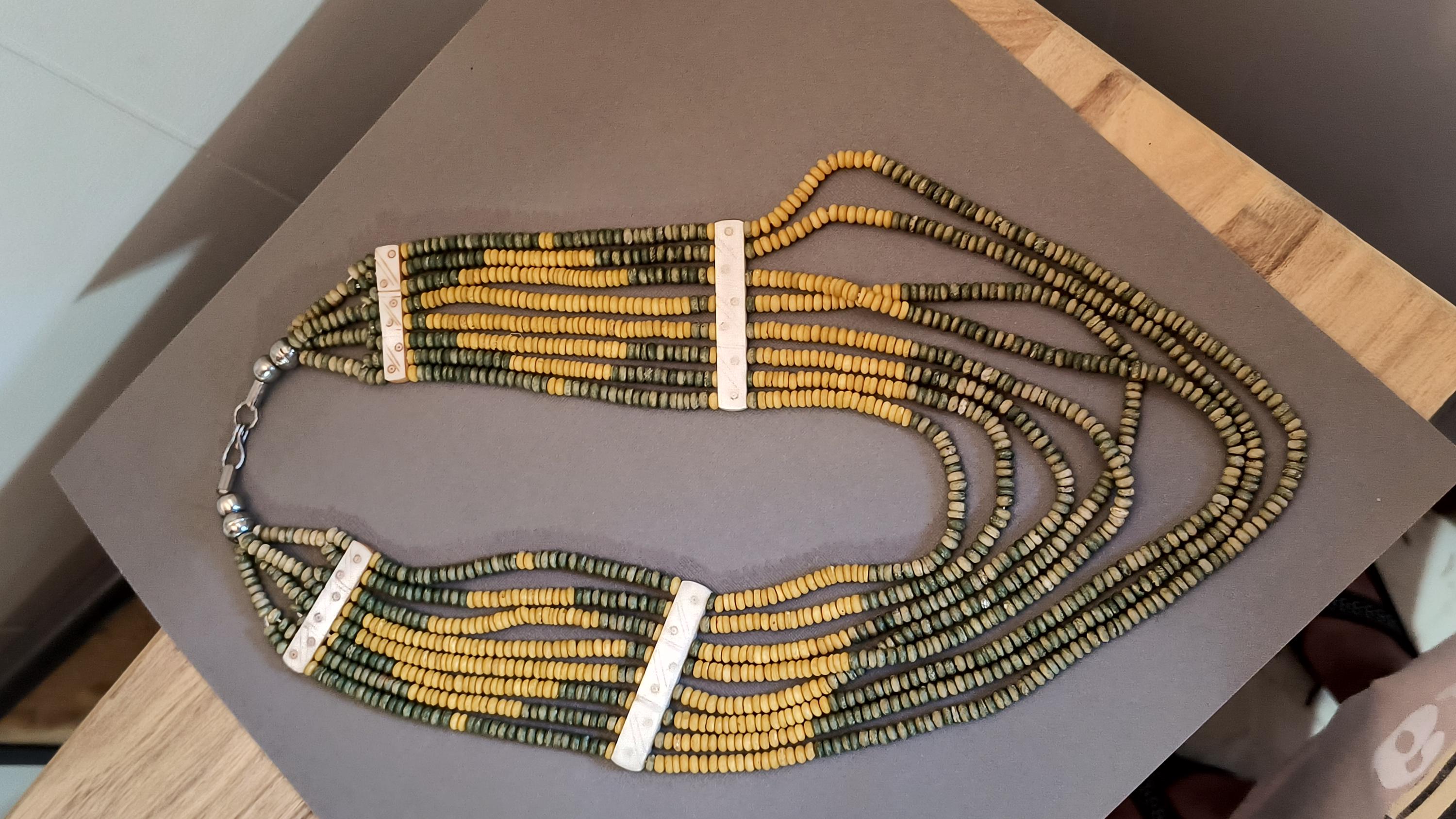 Sage green and deep golden yellow beads lay perfectly across the chest in this unique vintage necklace! Particularly nice is the use of bone spacers, all carved with a simple dot and line pattern.