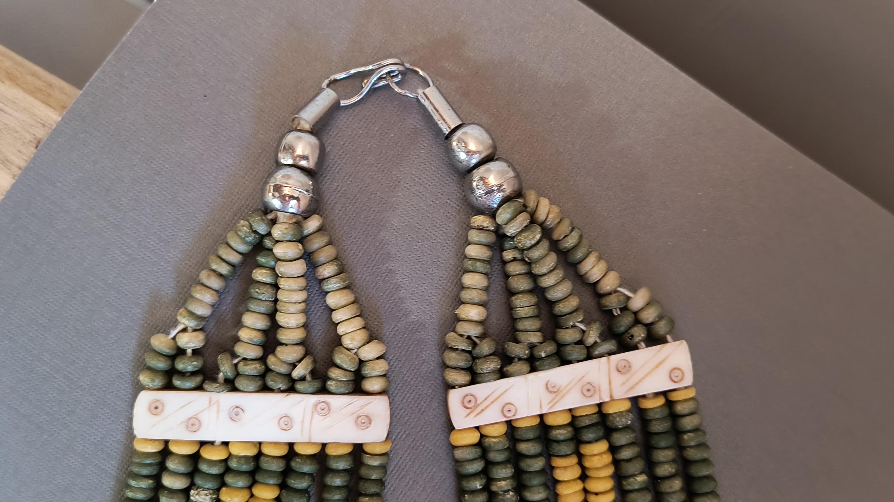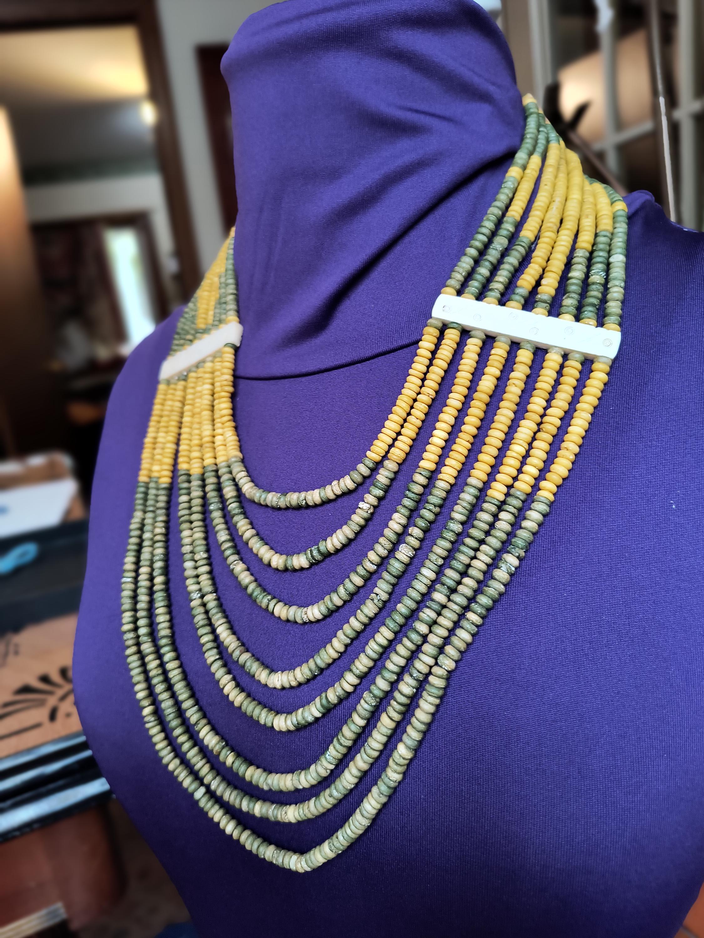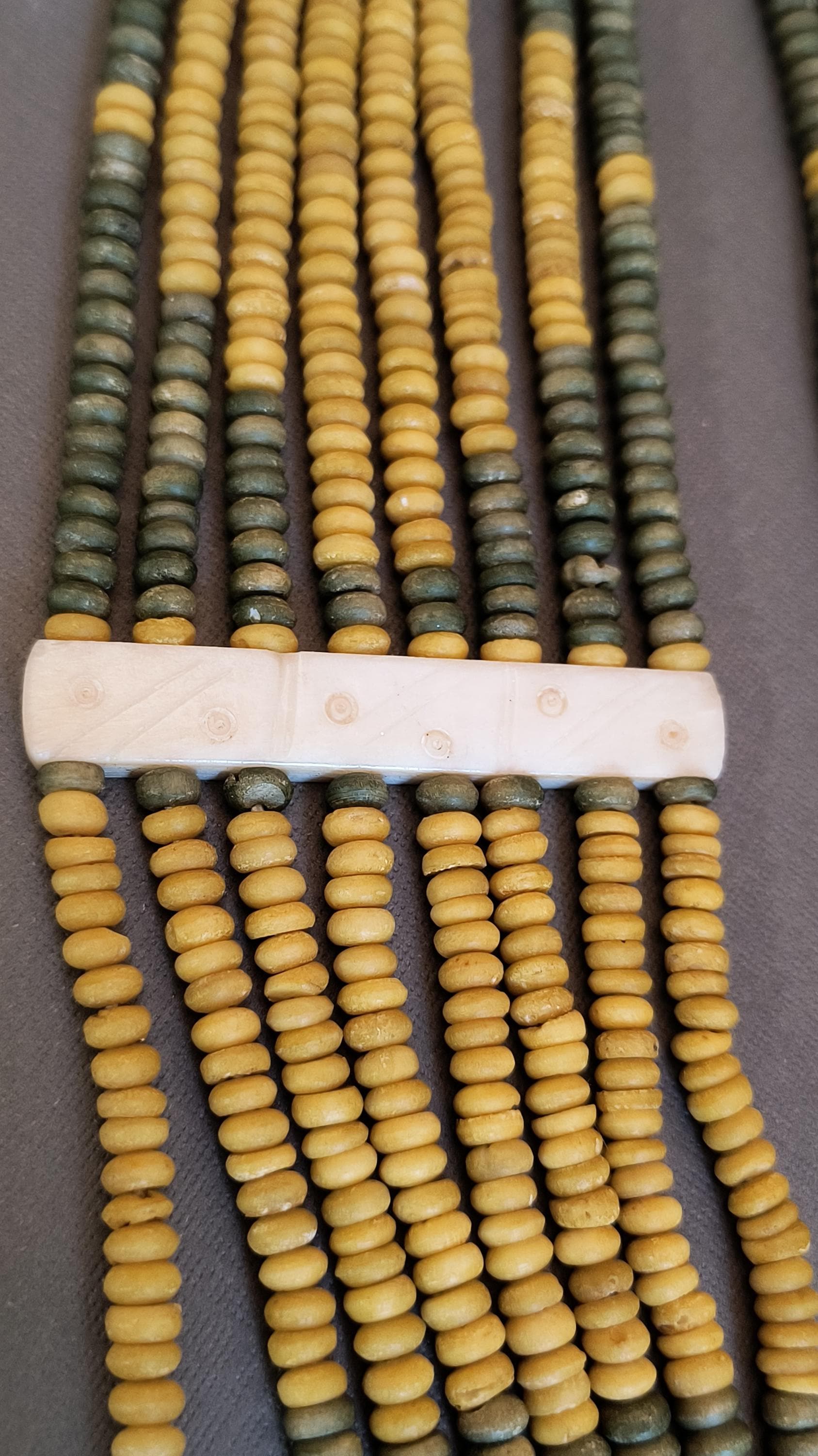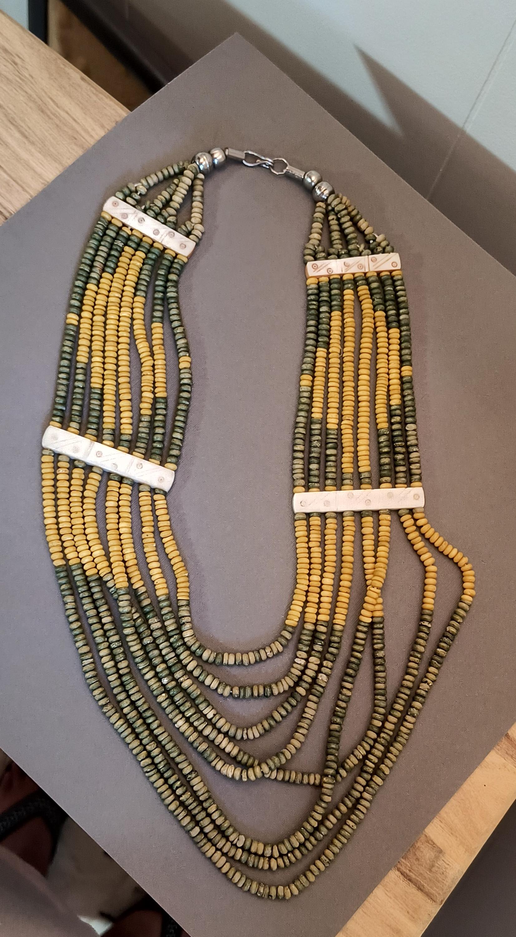 Sage green and deep golden yellow beads lay perfectly across the chest in this unique vintage necklace! Particularly nice is the use of bone spacers, all carved with a simple dot and line pattern.