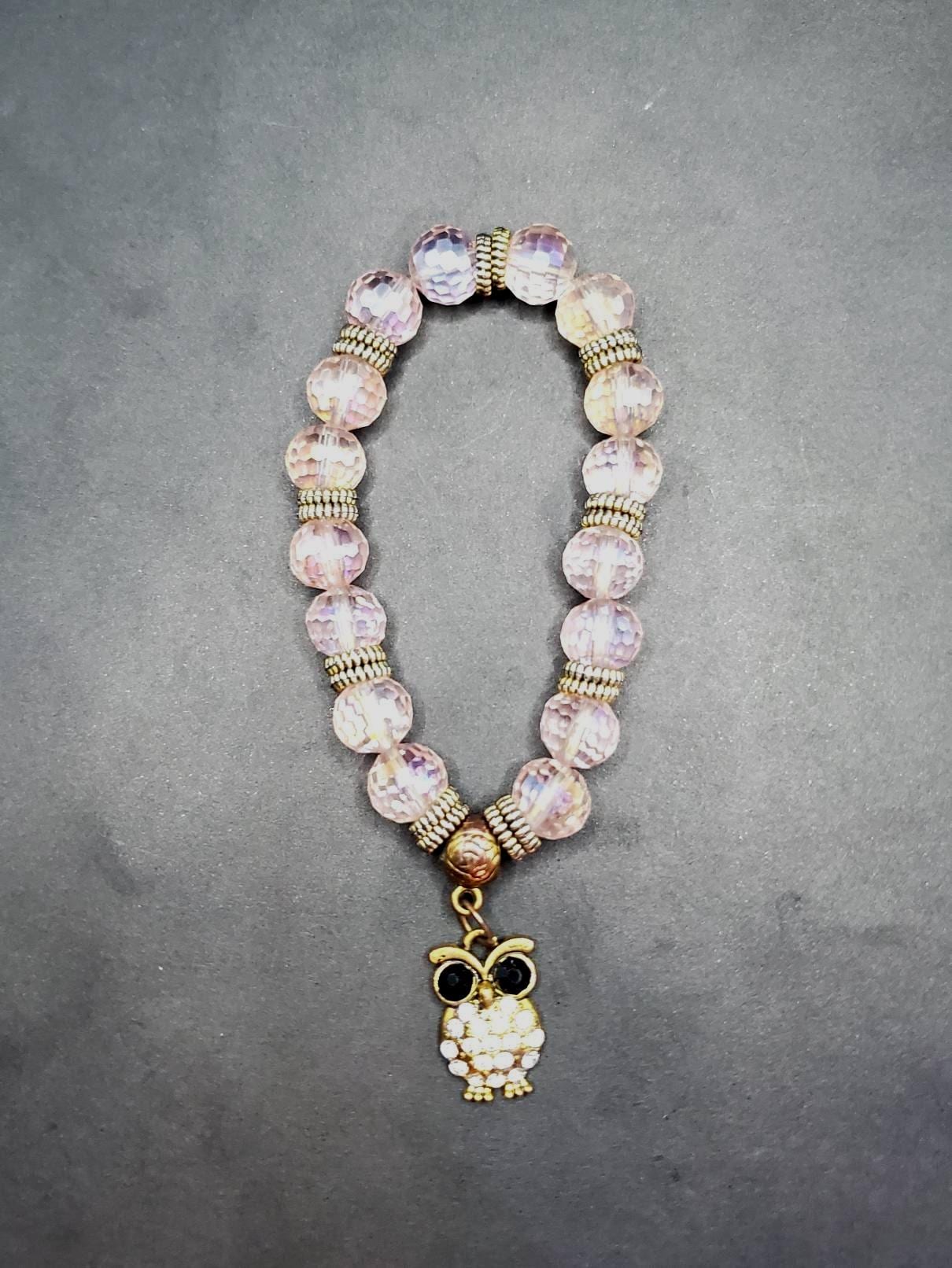 Here's a super fun, easy to wear bracelet for springtime! Half inch beads of bright pink and purple crystal glitter between silvertone spacers. A rhinestone owl charm drops demurely from a single decorative bead. This is bright and fun without being too over the top!
