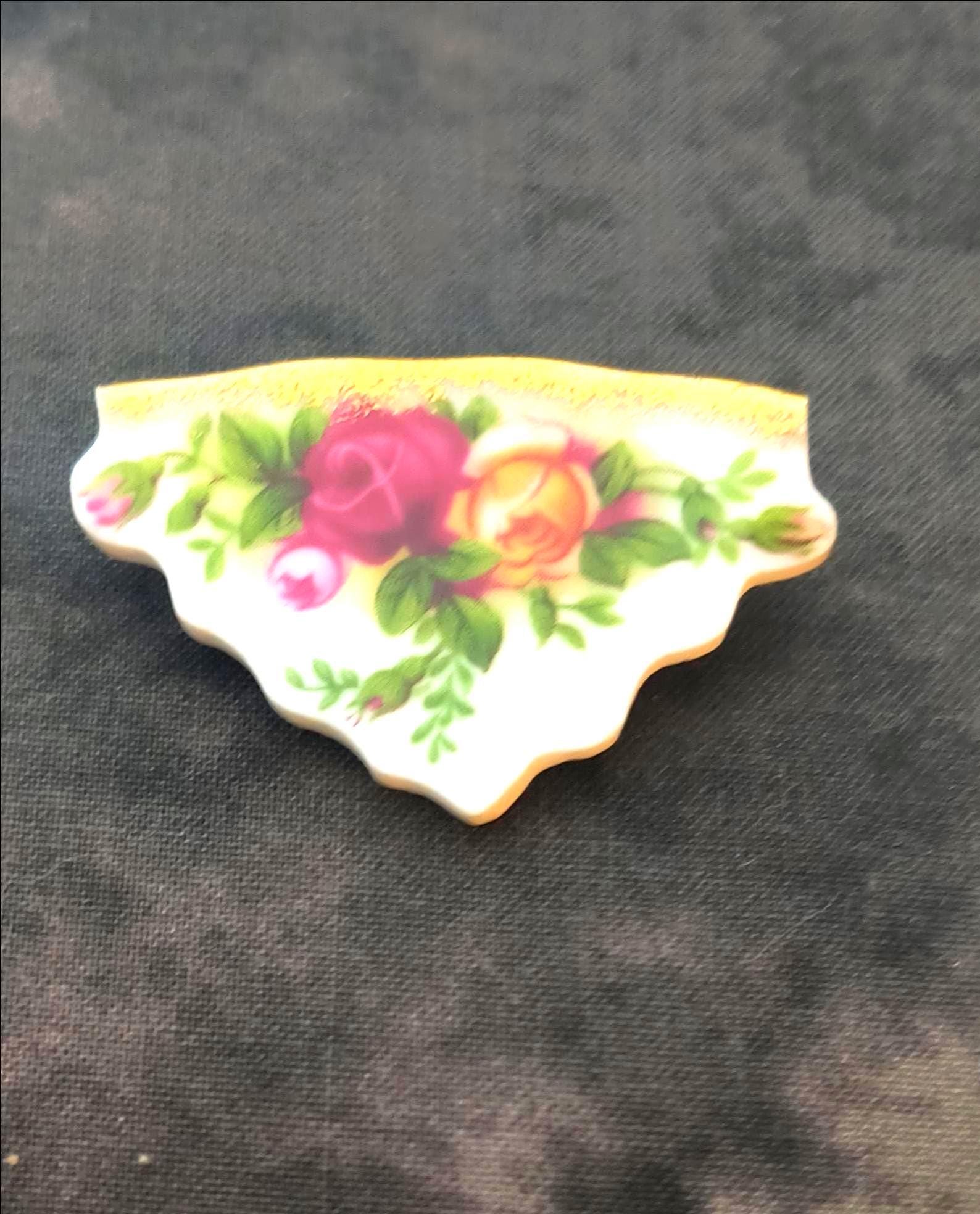 What a sweet, classic little piece! This is a bit of china, probably a piece of a teacup or saucer, that originated in the early 1900s. In the theme of making broken things whole, this has been cut into a pretty pattern, and a pin backing has been added to the back. This would be a perfect something old for a bride, or a gift for a member of the bridal party!