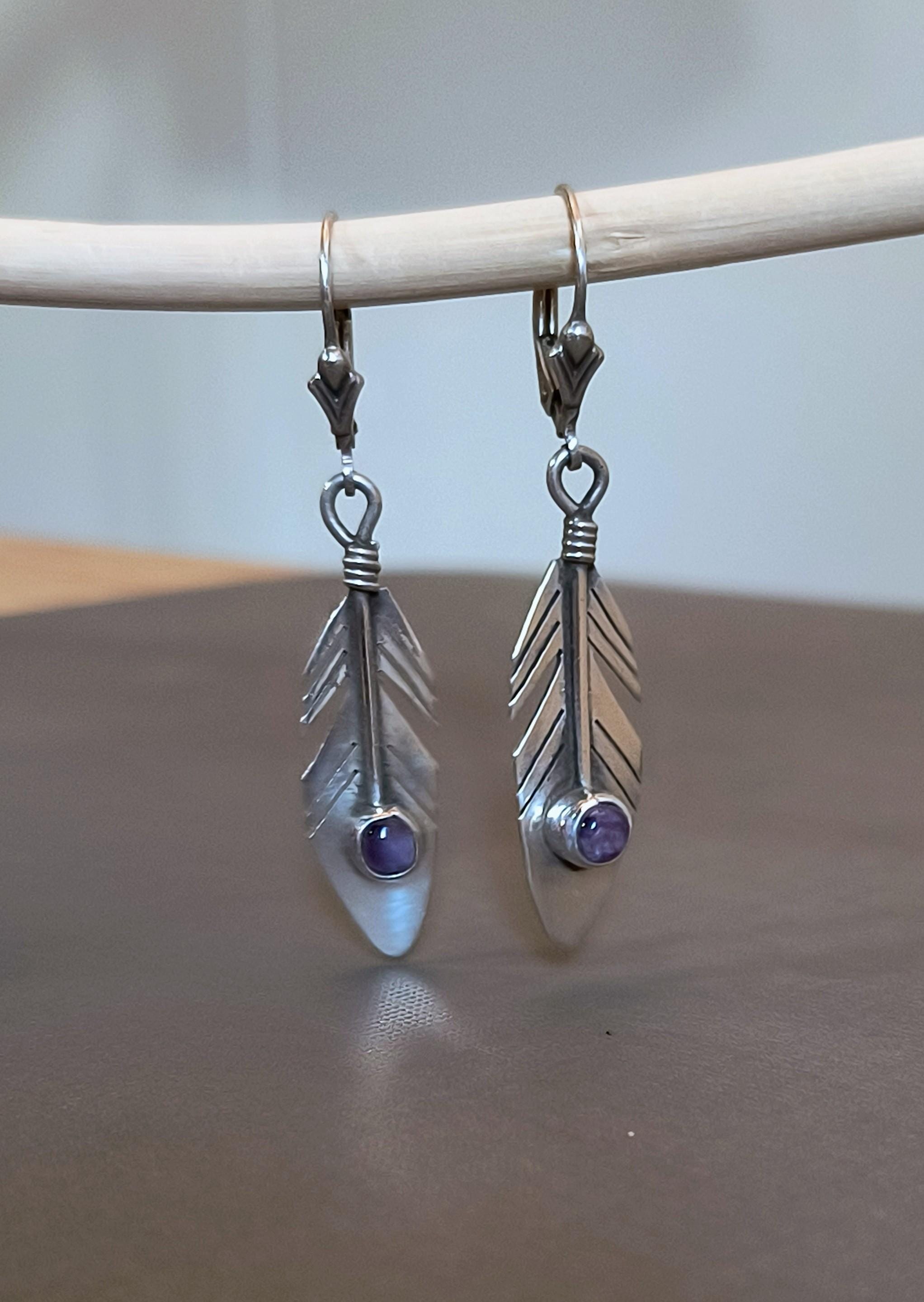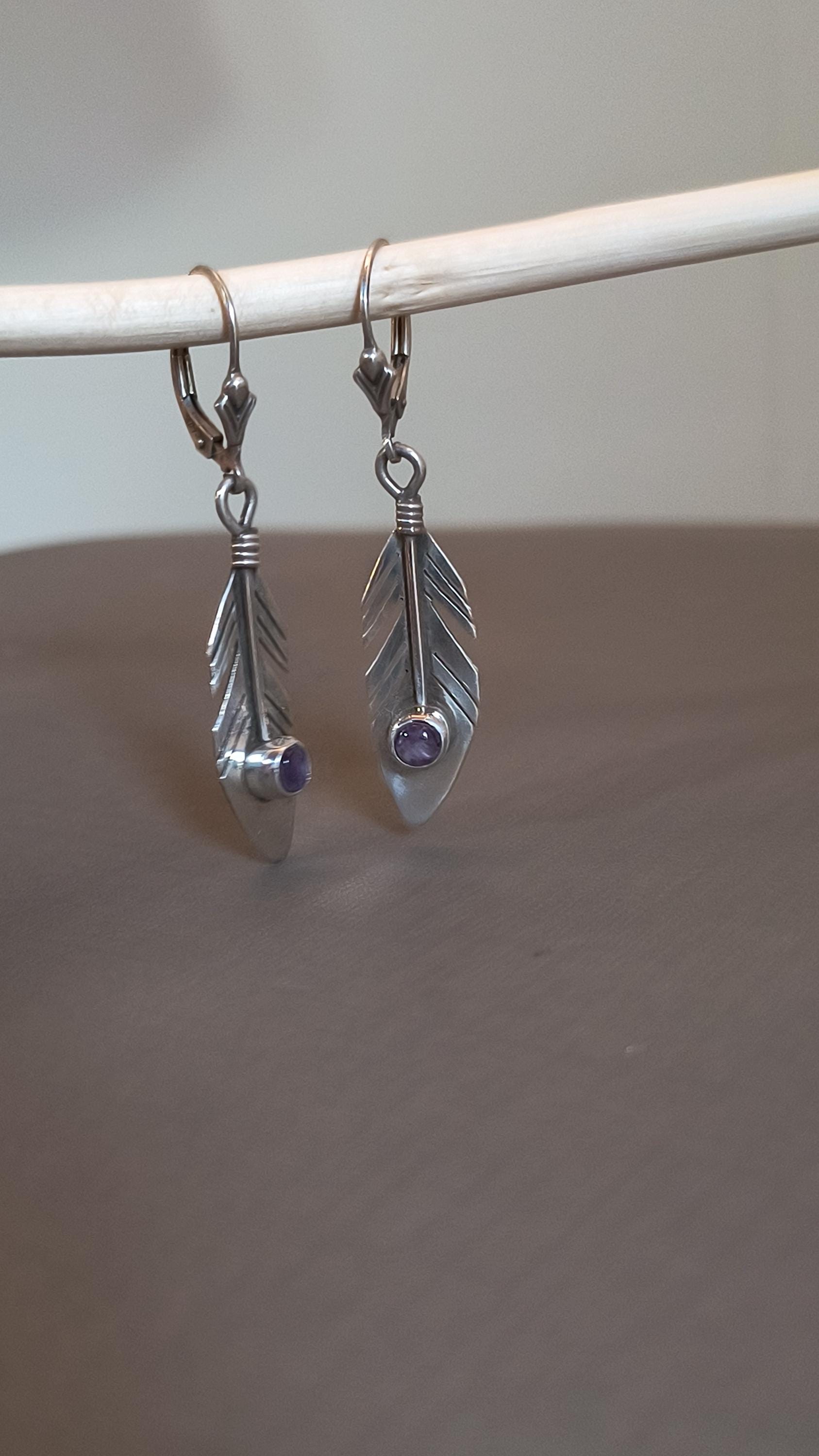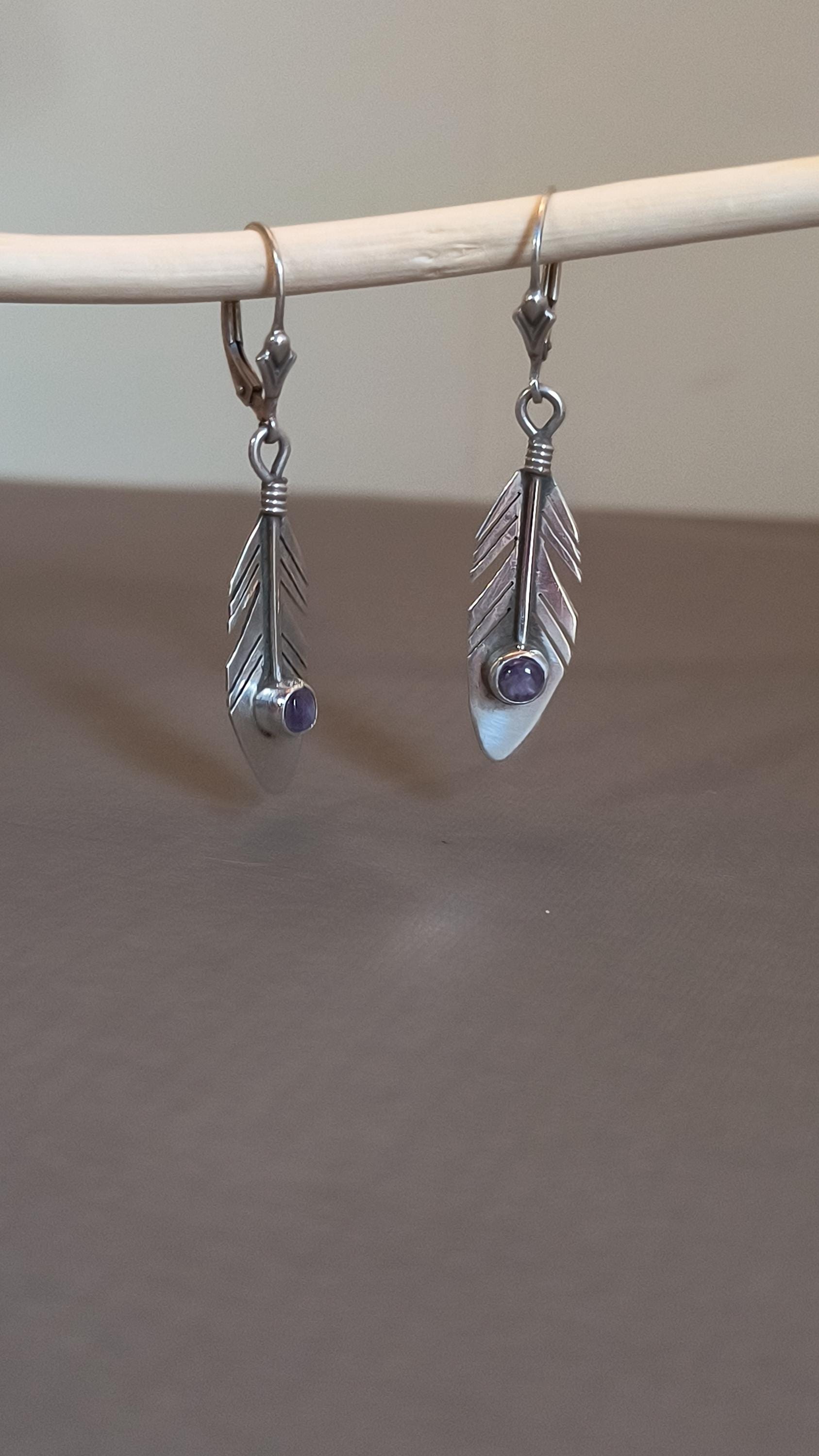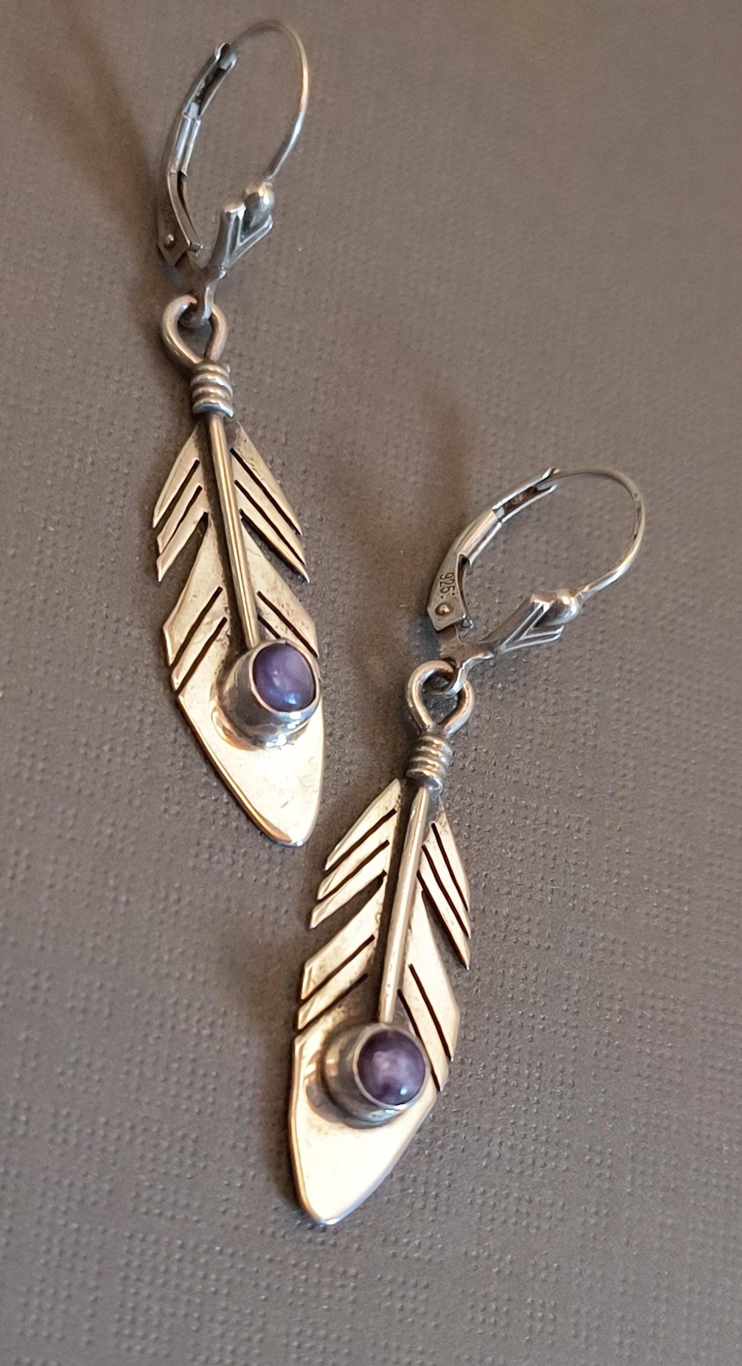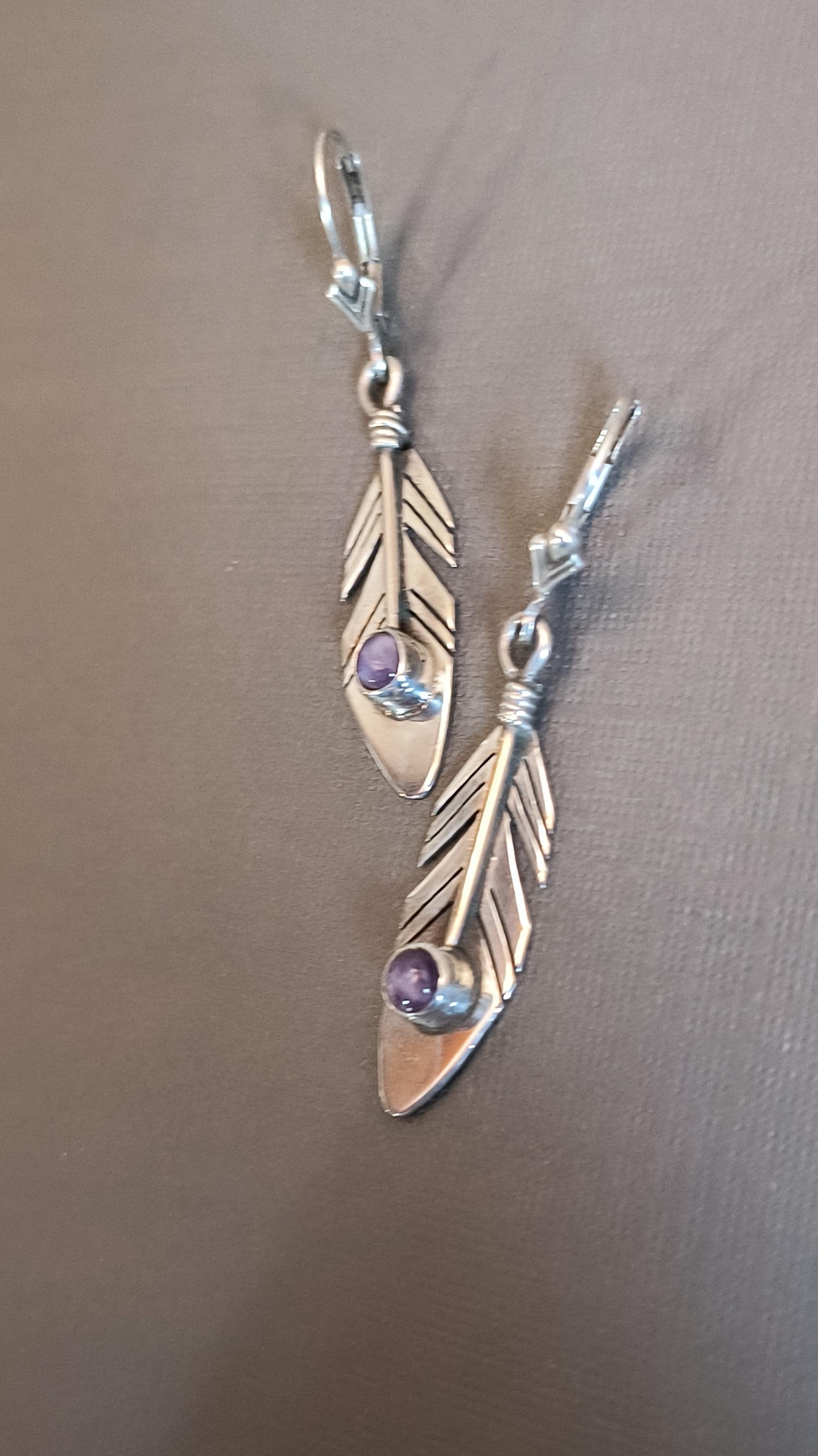 These are just lovely! Handcut feathers fall gracefully from secure, hinged earrings wires. Each feather is decorated with a small circle of 'Wampum' - a purple shell traditionally used in jewelry by the North Eastern Native American tribes for hundreds, perhaps thousands, of years.