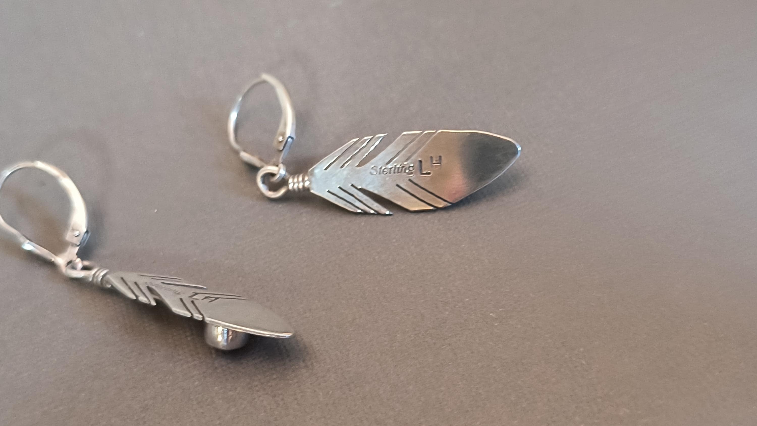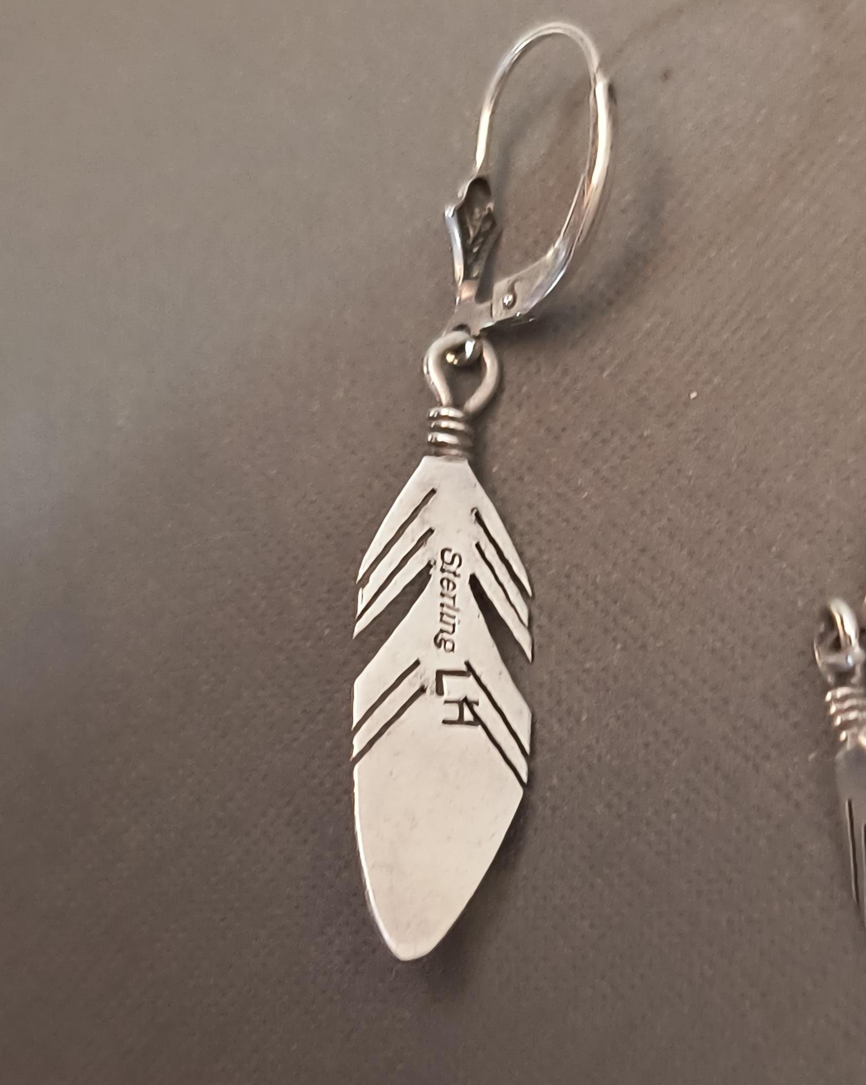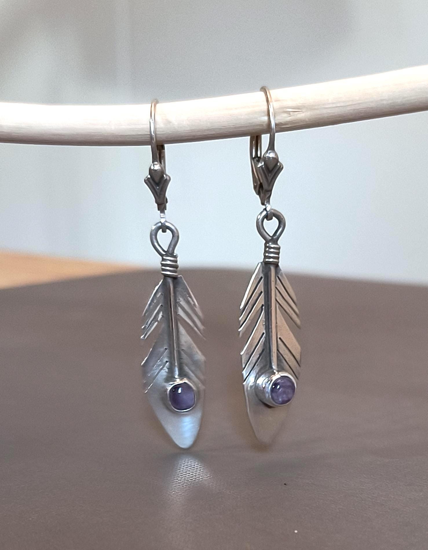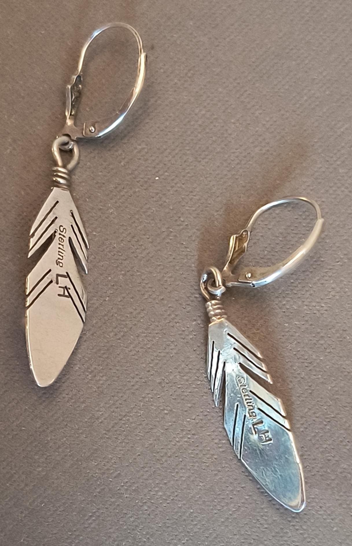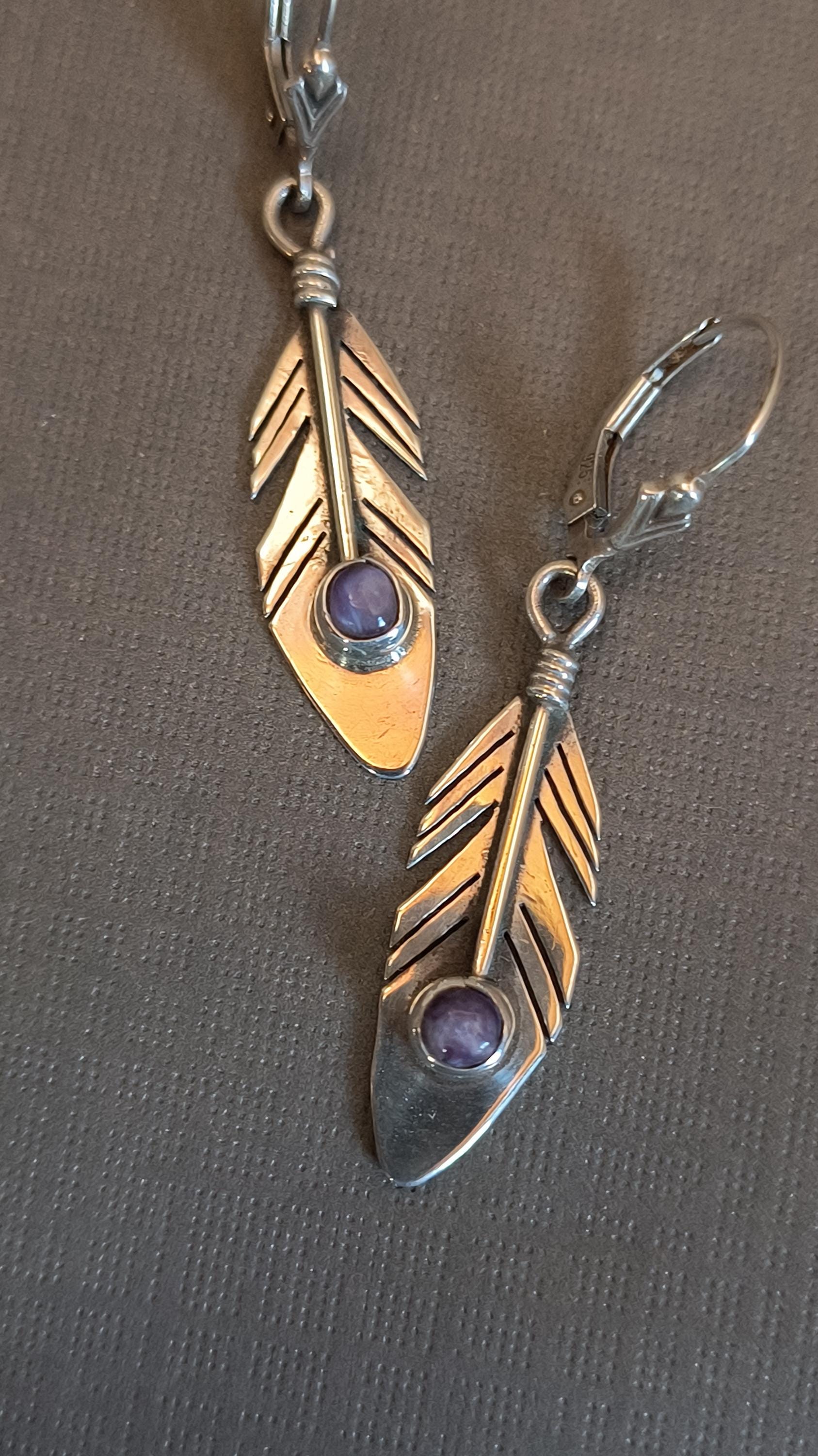 These are just lovely! Handcut feathers fall gracefully from secure, hinged earrings wires. Each feather is decorated with a small circle of 'Wampum' - a purple shell traditionally used in jewelry by the North Eastern Native American tribes for hundreds, perhaps thousands, of years.