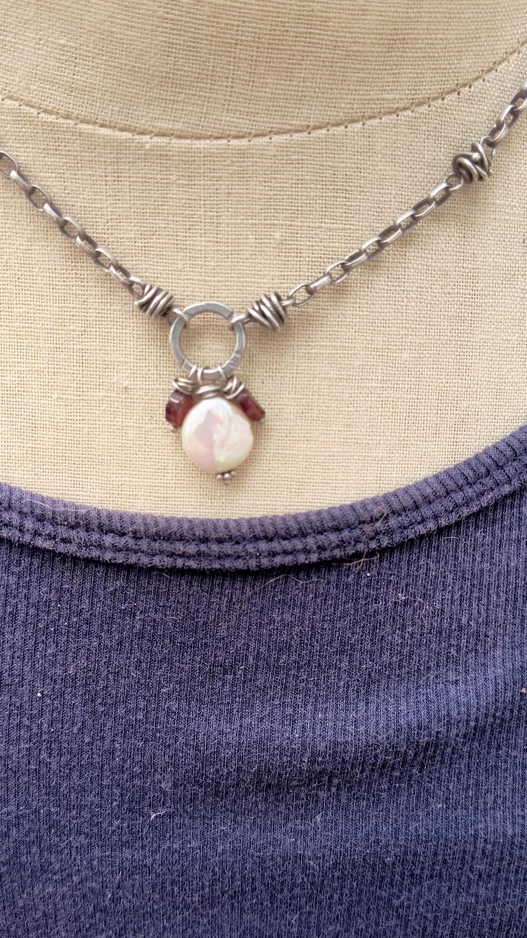 This vintage sterling silver chain is handmade, and from my personal collection! I had thoughts of using this to make a custom necklace, once upon a time, but that never happened and now it's time to let it go! This is 16 inches long, with an added one inch drop in the sterling silver circle, pearl and garnet pendant. The 'knots' that decorate the chain are hand wrapped sterling silver wire. This can be worn with the pendant dropping straight down, or off to the side!