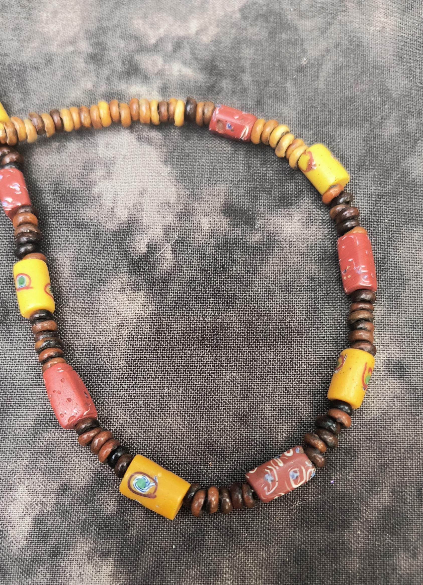 Here's a beautiful piece of wearable history! This necklace is comprised of botanical seed beads that all date from 50 to 100 years old. The focal poinsts are the yellow and brick red beads that are even older - these are glasswork African trade beads dating to the 1800s.