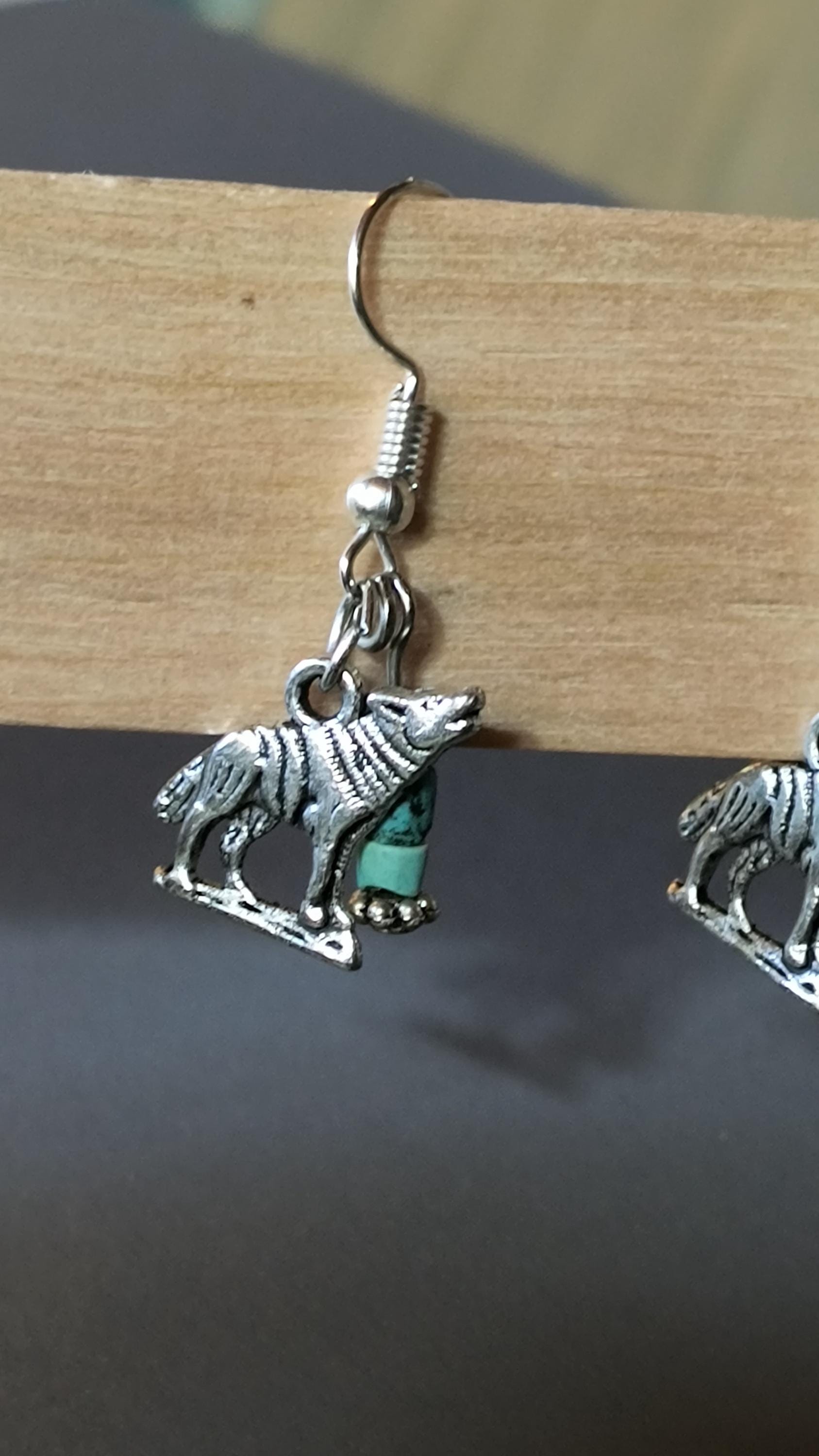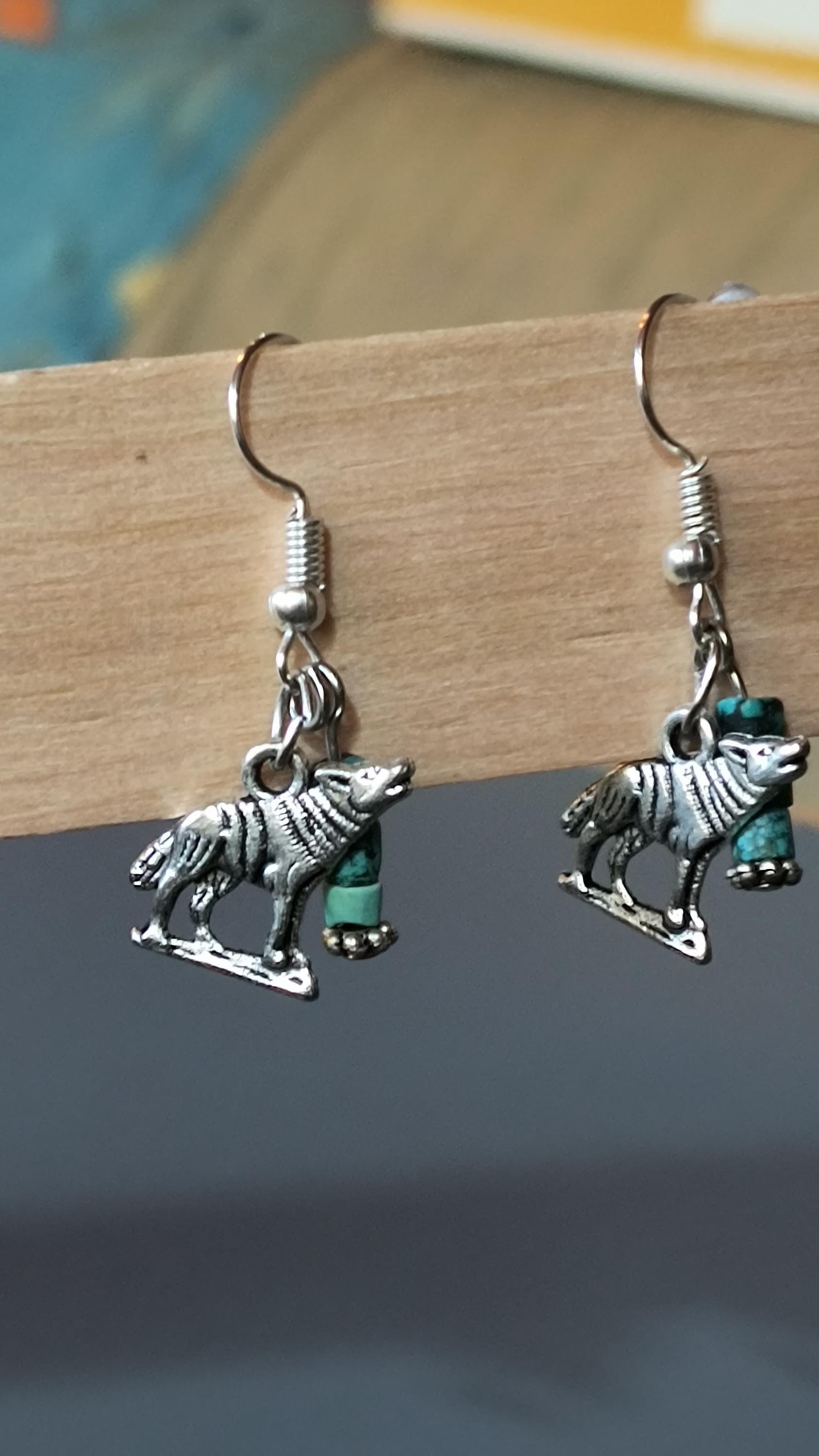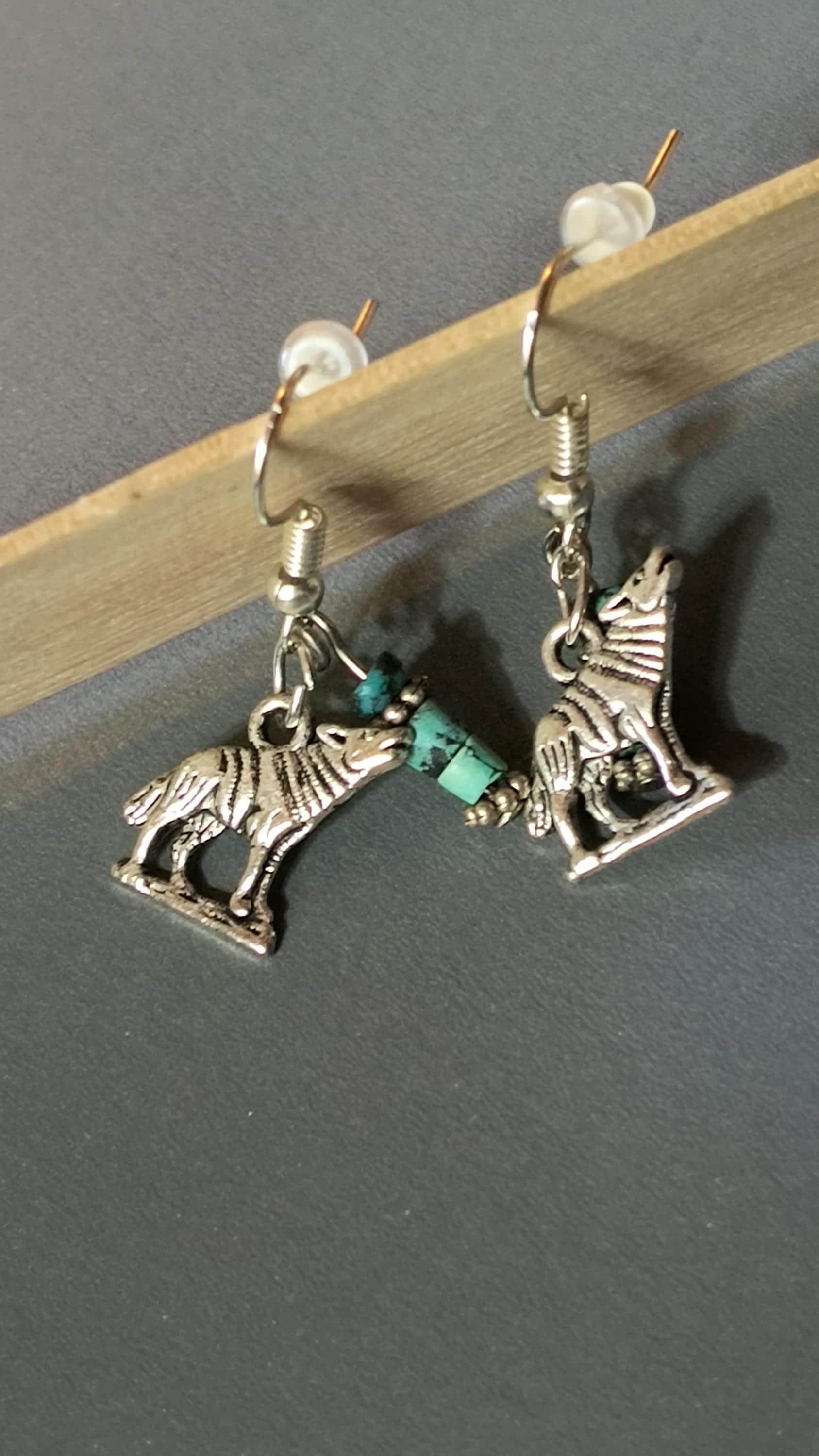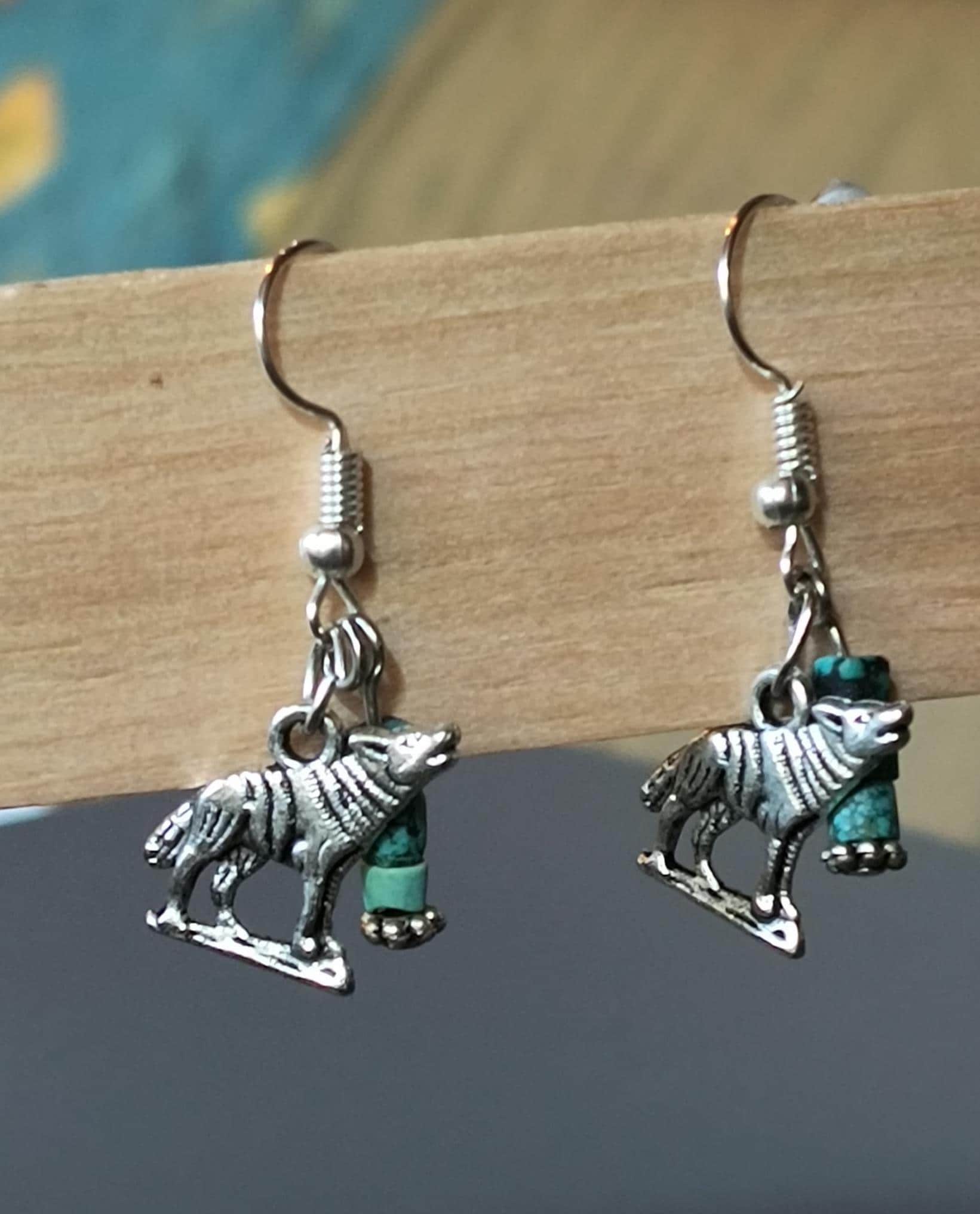 These little wolf drops are sweet enough on their won, but I wanted to add a little pop of color behind them! These are sterling silver - the turquoise beads behind them make it look like a wolf howling at the Northern Lights!