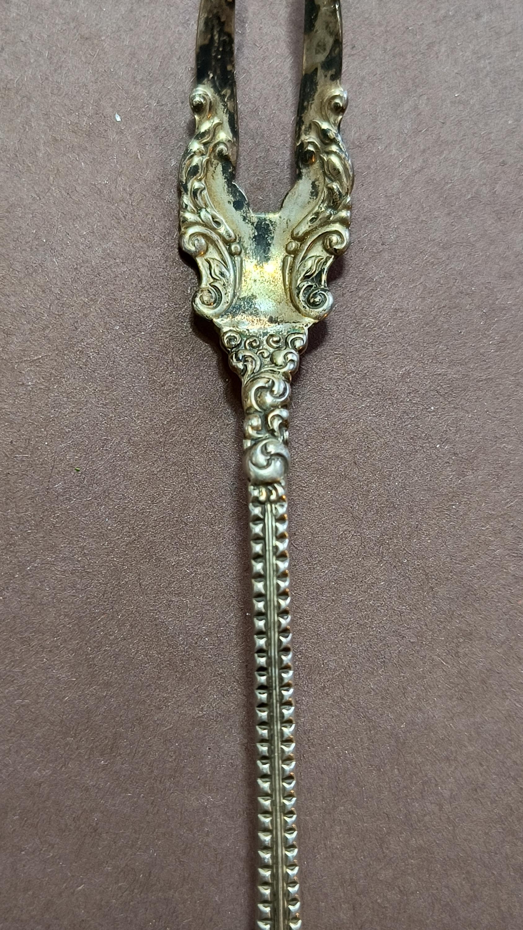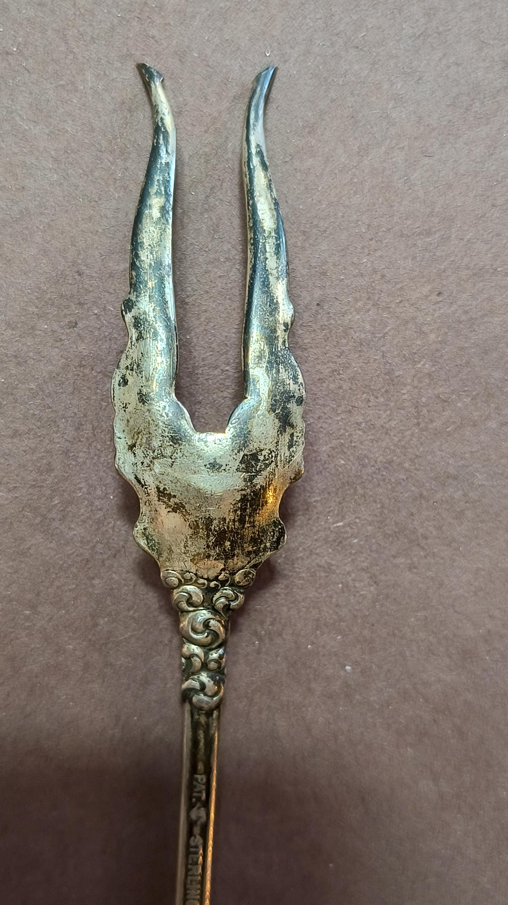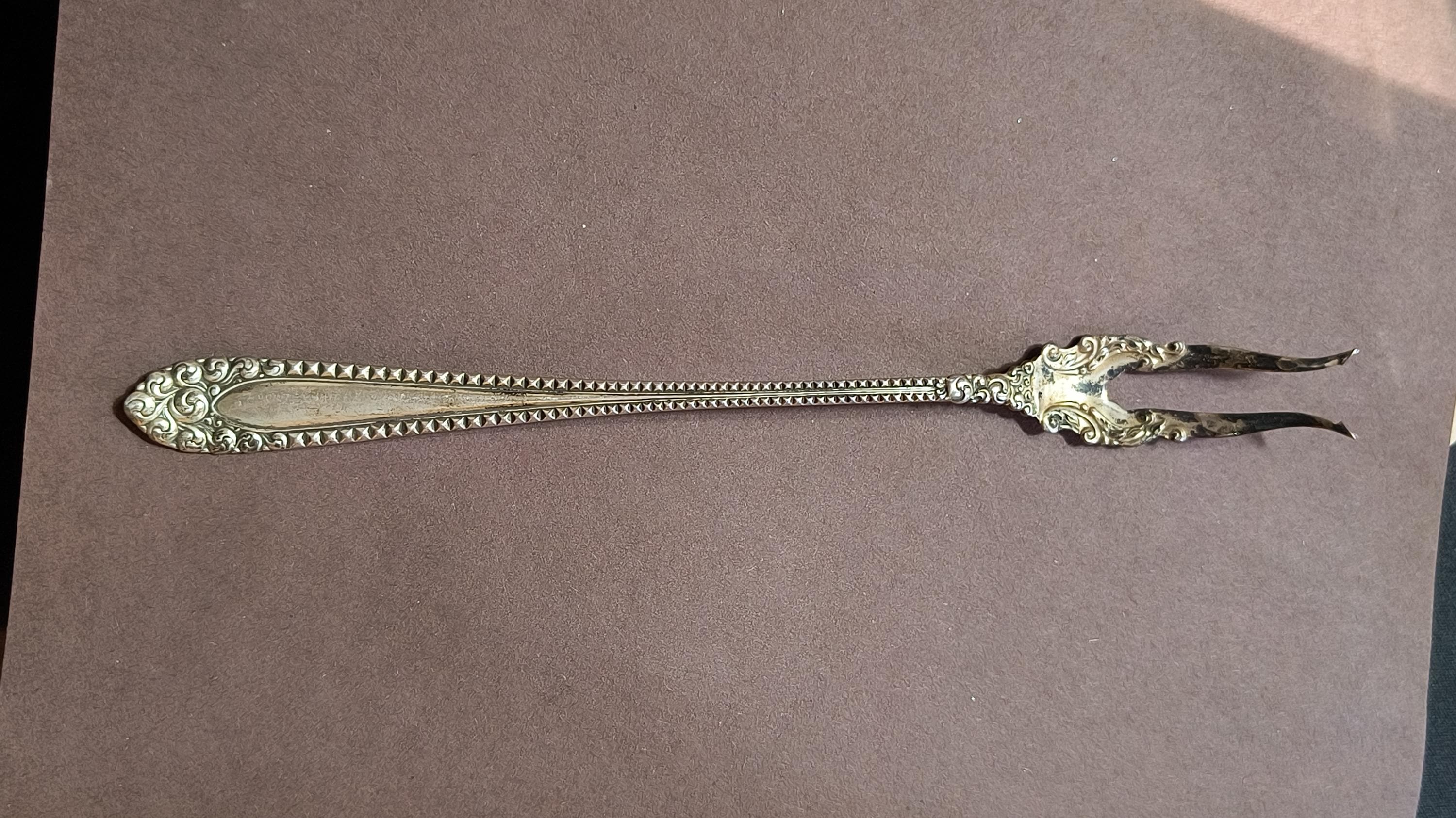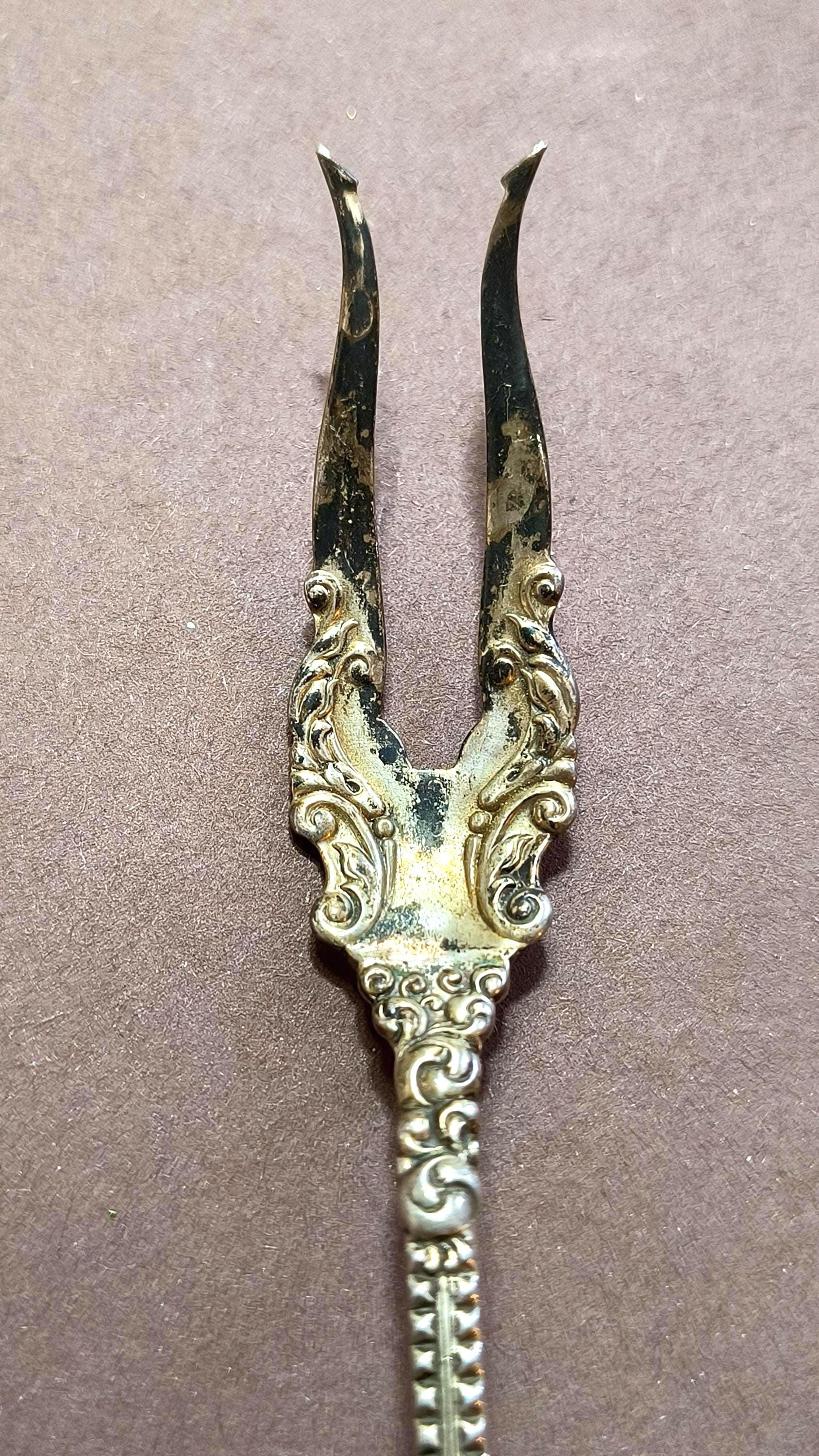 I just love this piece - the swirls and curlicutes, the devilish curve of the two prongs - the pattern actually reminds me of ancient Irish Celtic Trinity and triskel carvings. This antique fork (probably a pickle fork) is a great display piece - and I would be happy to polish it, just ask!