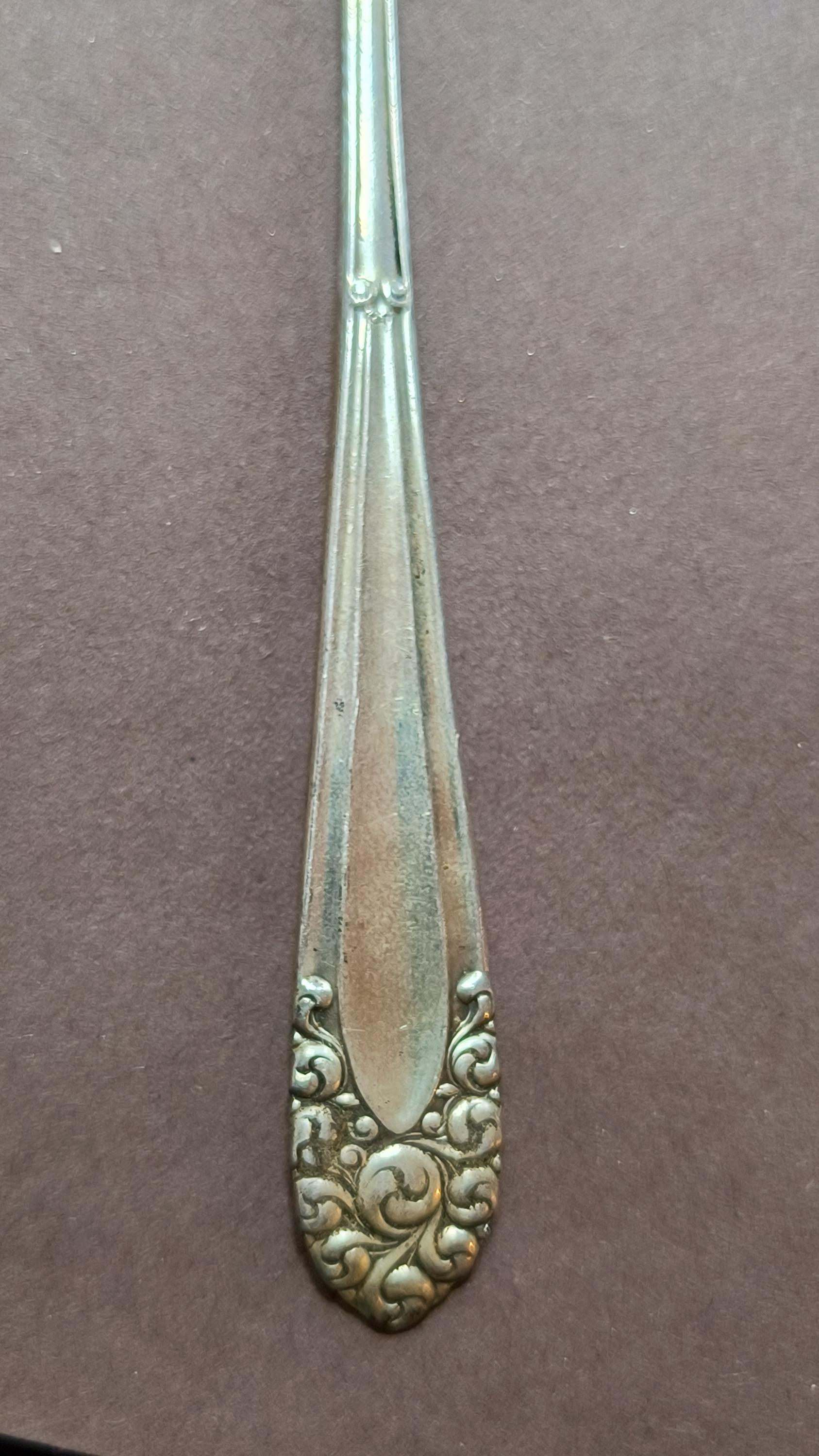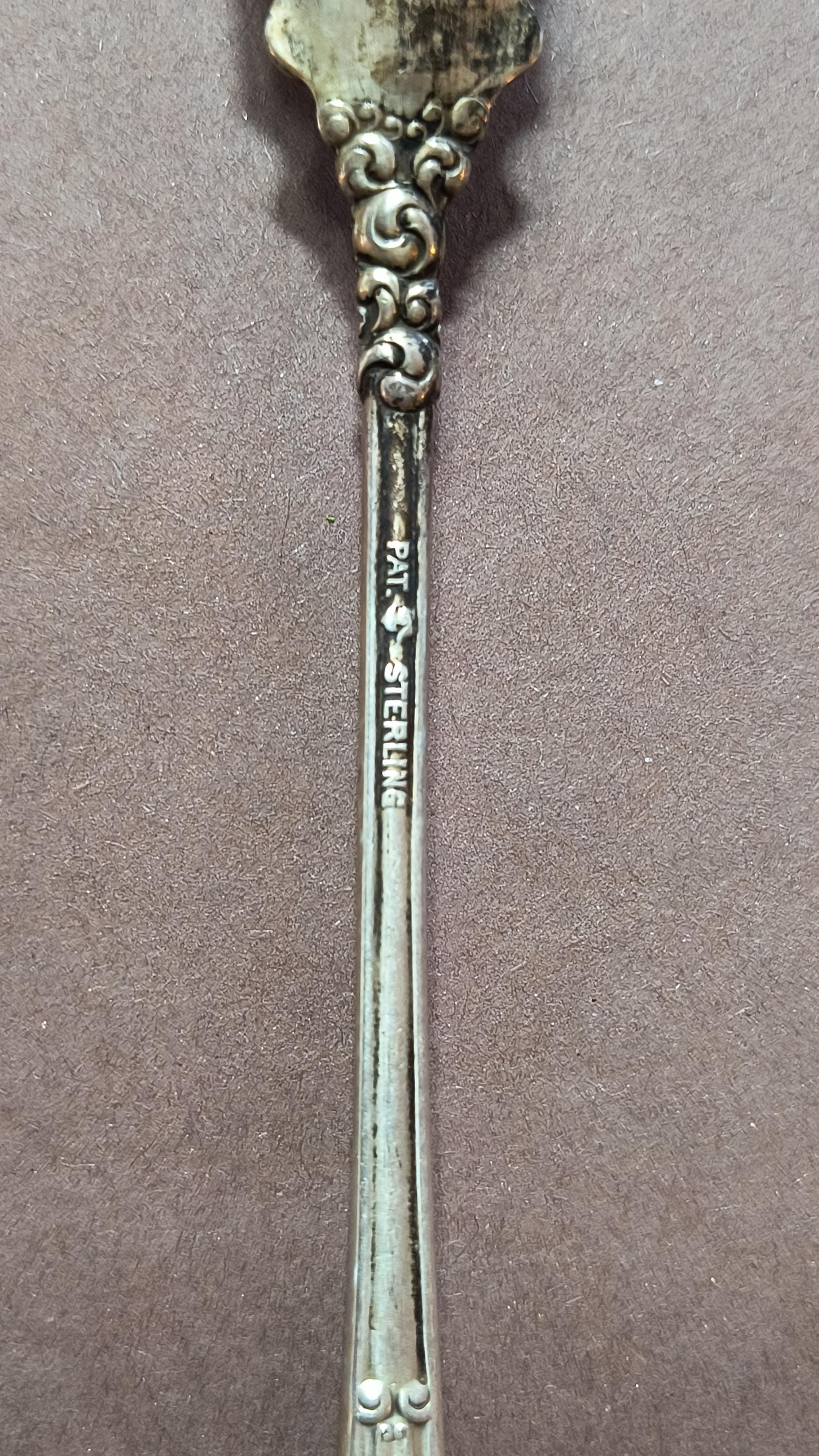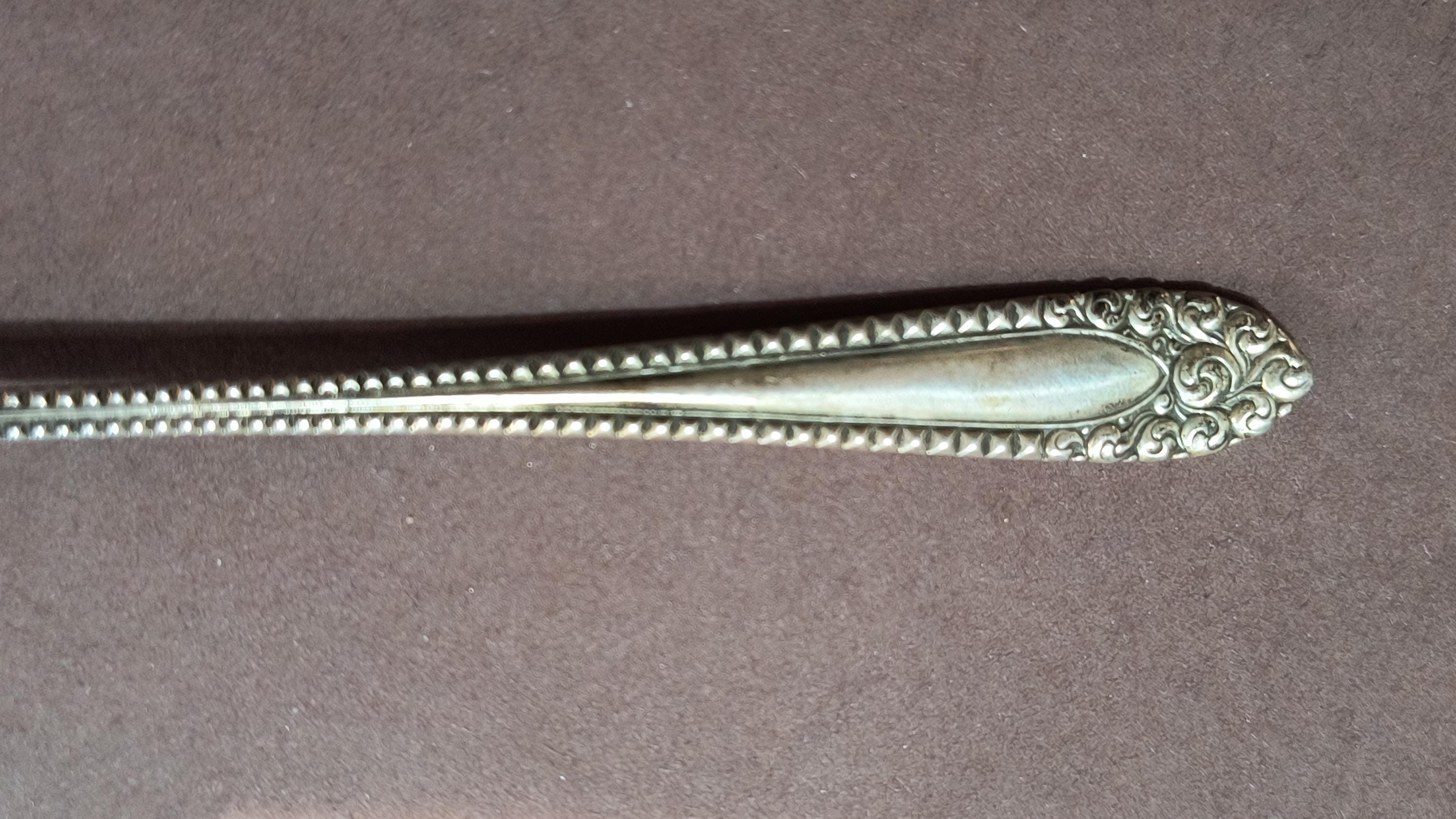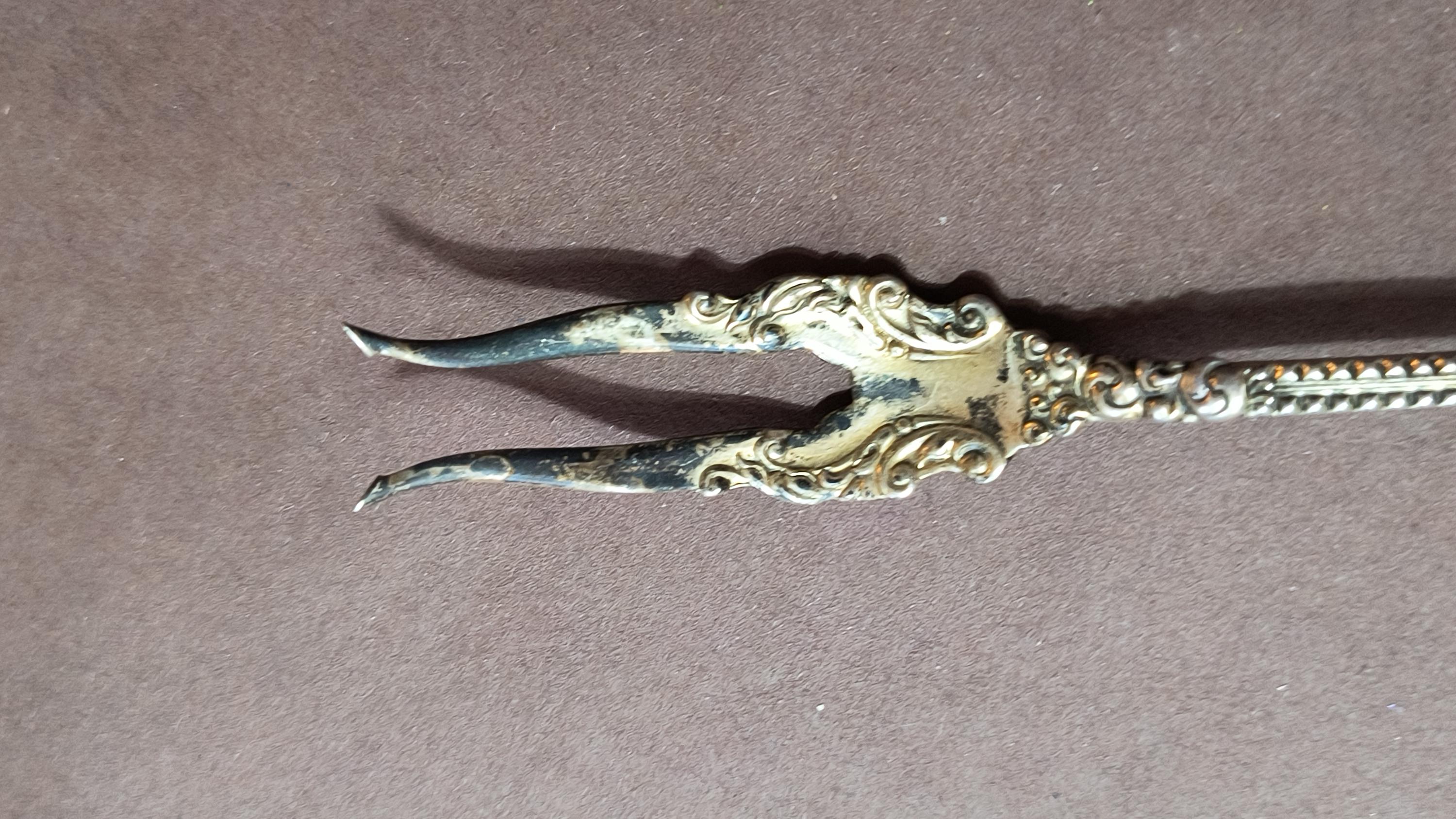 I just love this piece - the swirls and curlicutes, the devilish curve of the two prongs - the pattern actually reminds me of ancient Irish Celtic Trinity and triskel carvings. This antique fork (probably a pickle fork) is a great display piece - and I would be happy to polish it, just ask!
