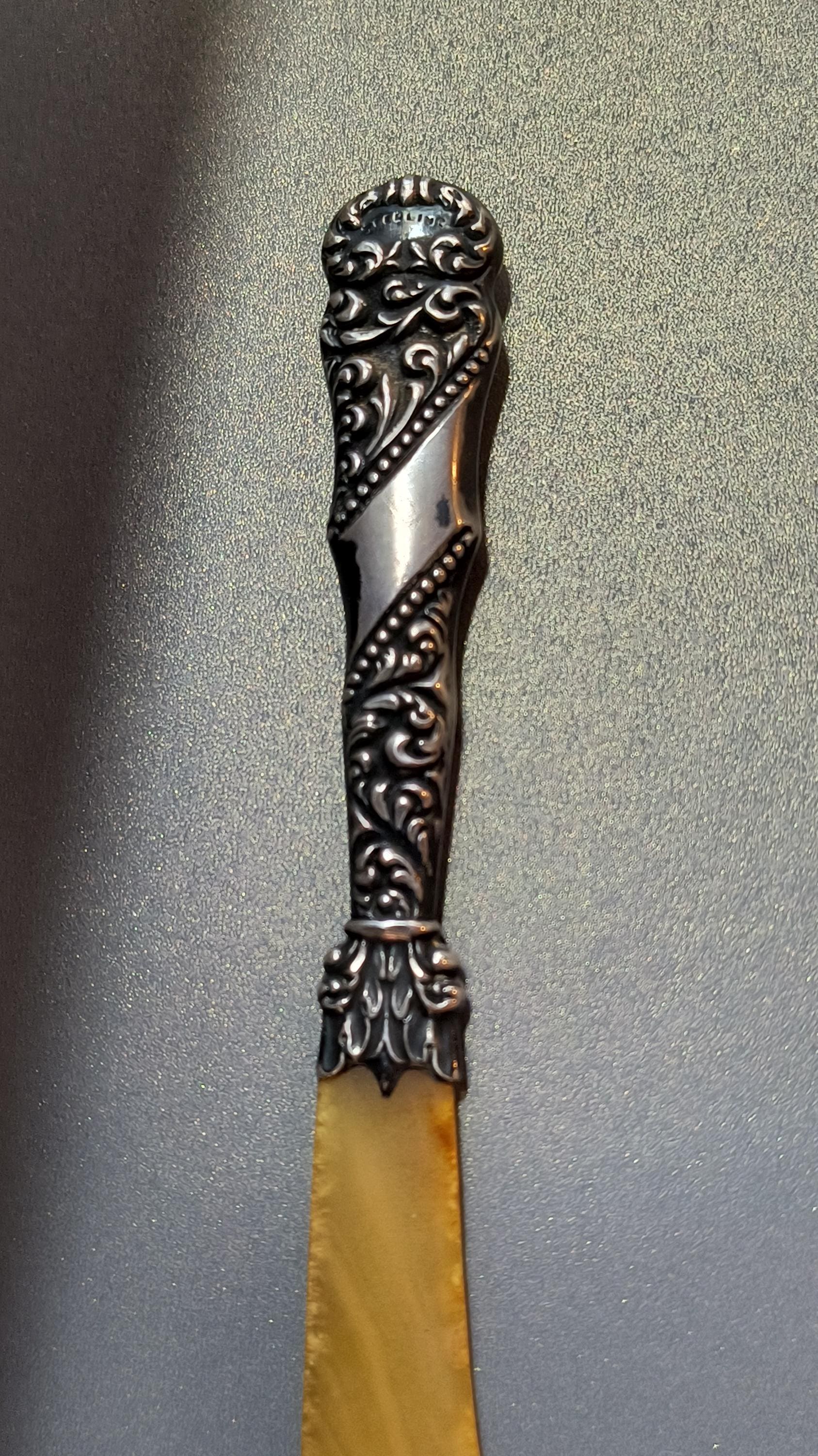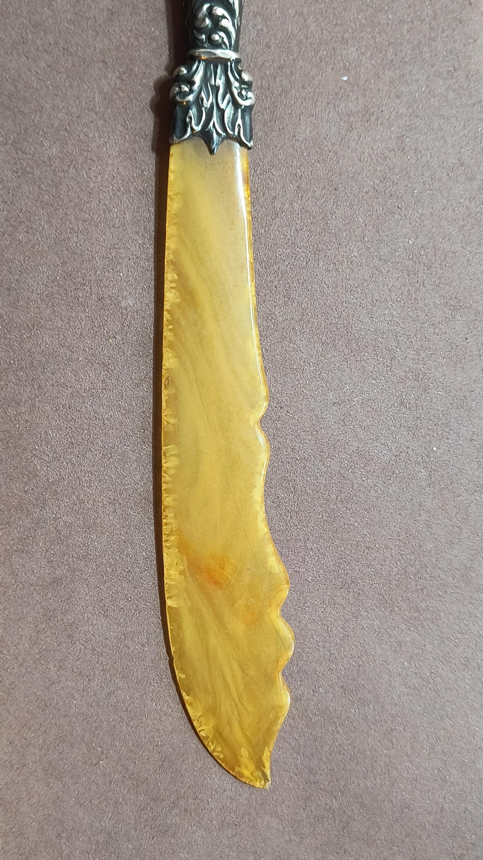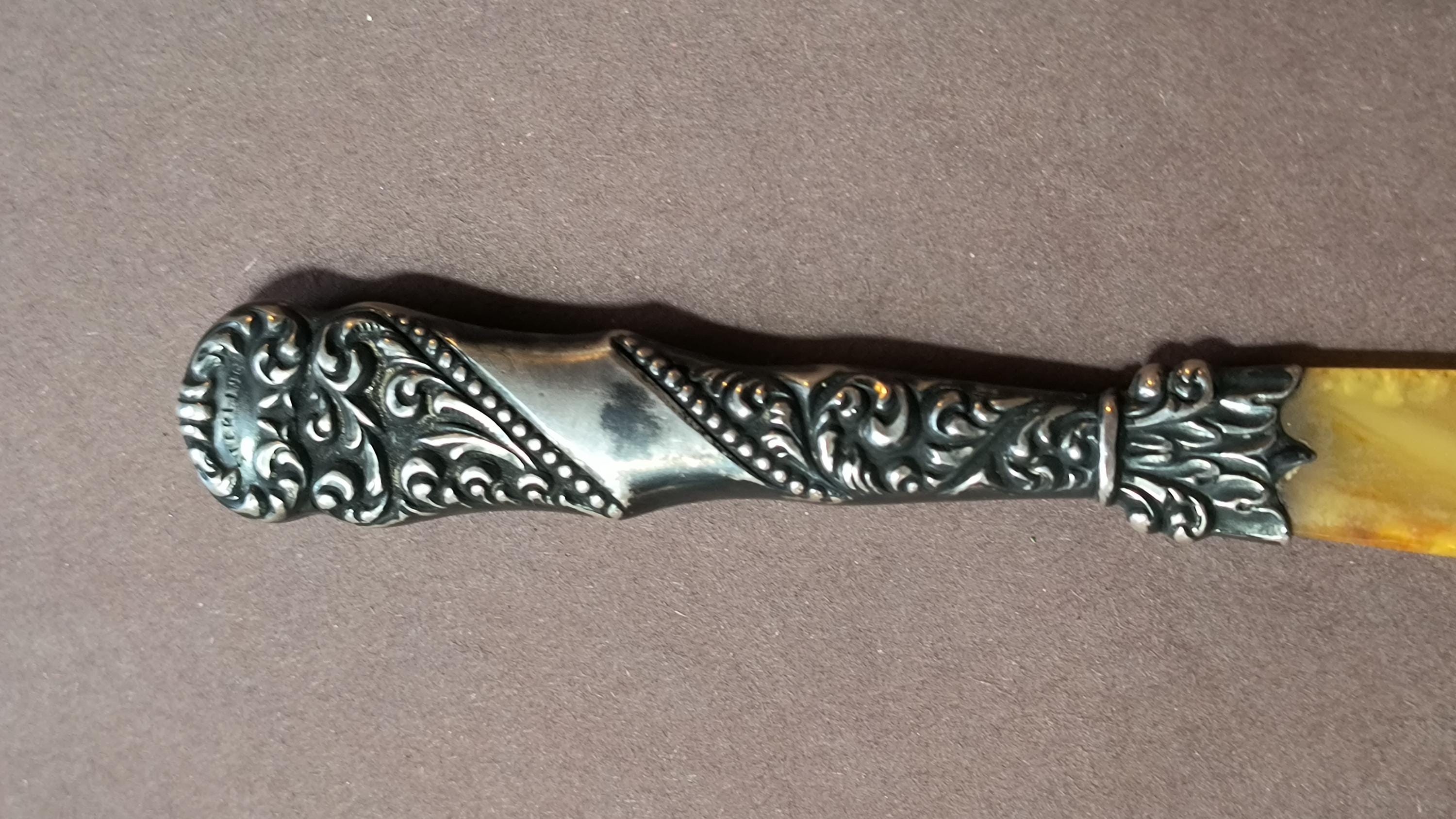 Beautiful antique sterling silver and faux amber knife letter opener. This lovely, and unique piece is approximately 7 1/4 inches long and marked sterling on both sides. It is in excellent antique condition and ready to make a stunning statement wherever you use or place it!