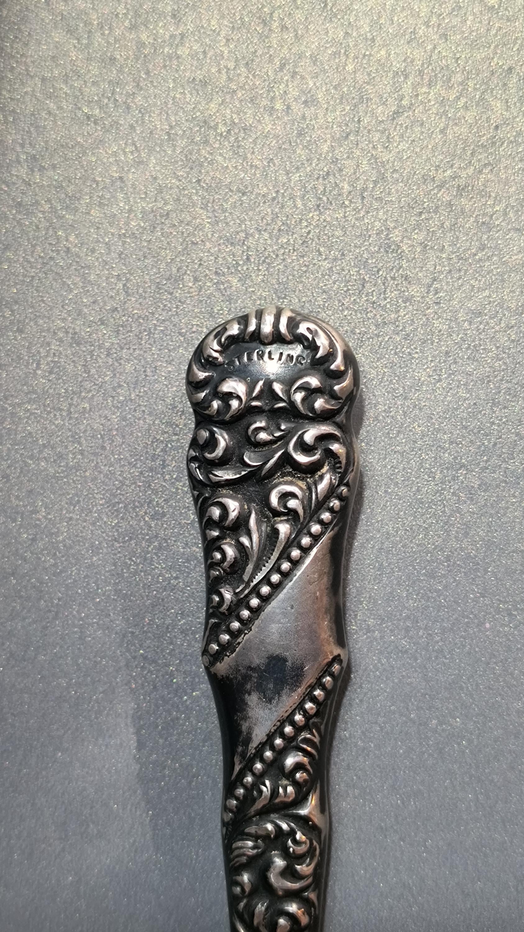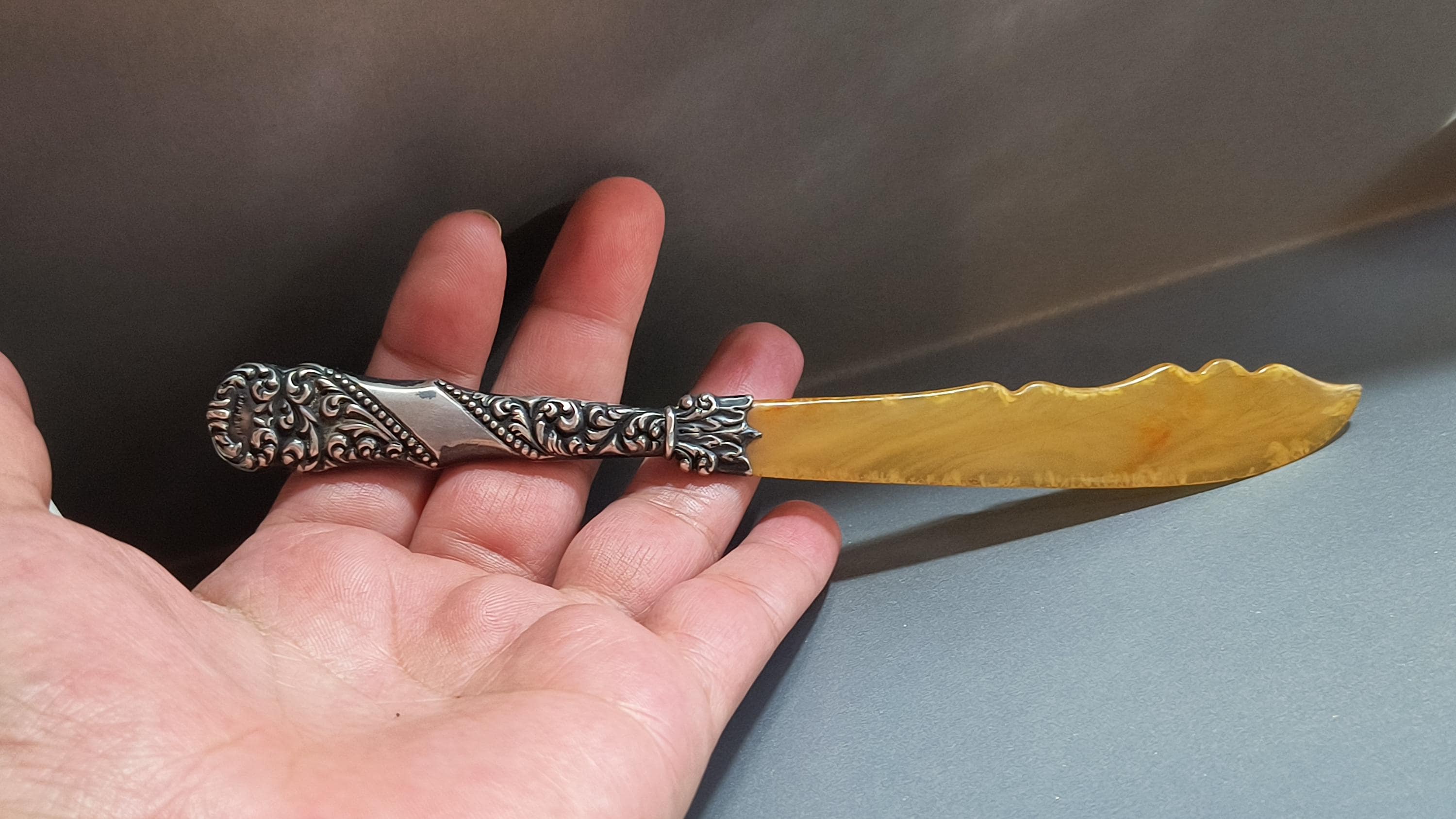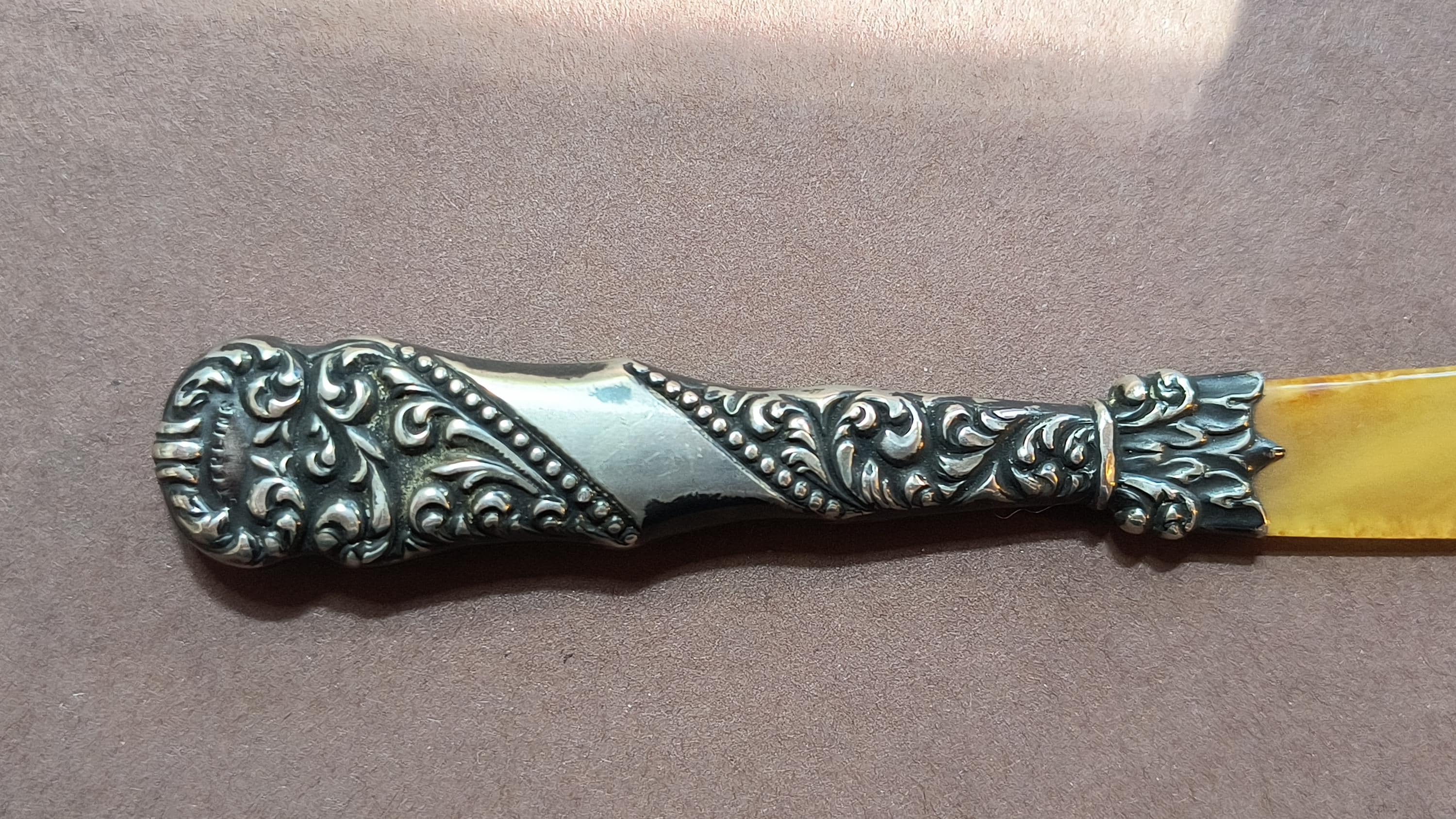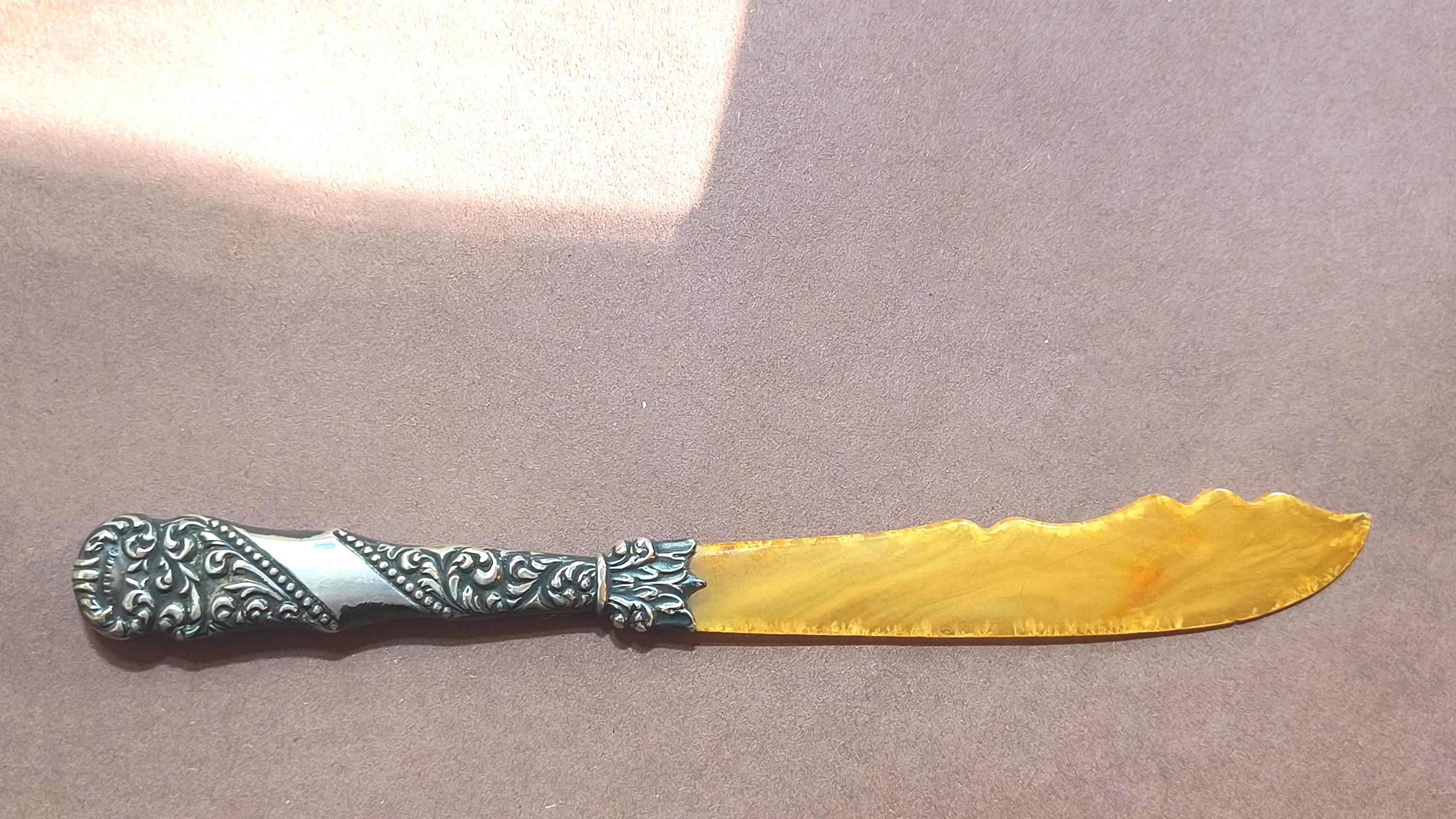 Beautiful antique sterling silver and faux amber knife letter opener. This lovely, and unique piece is approximately 7 1/4 inches long and marked sterling on both sides. It is in excellent antique condition and ready to make a stunning statement wherever you use or place it!