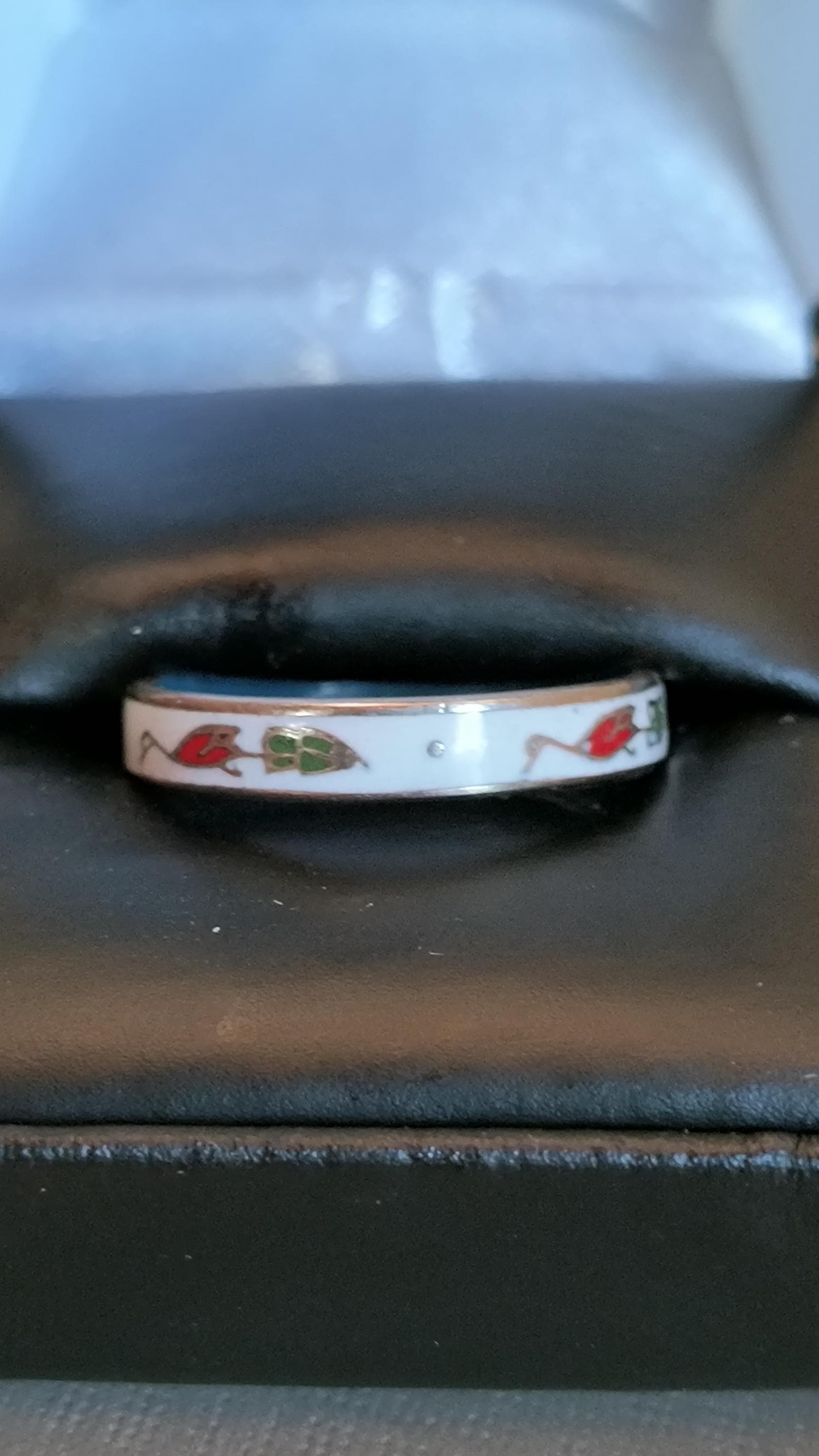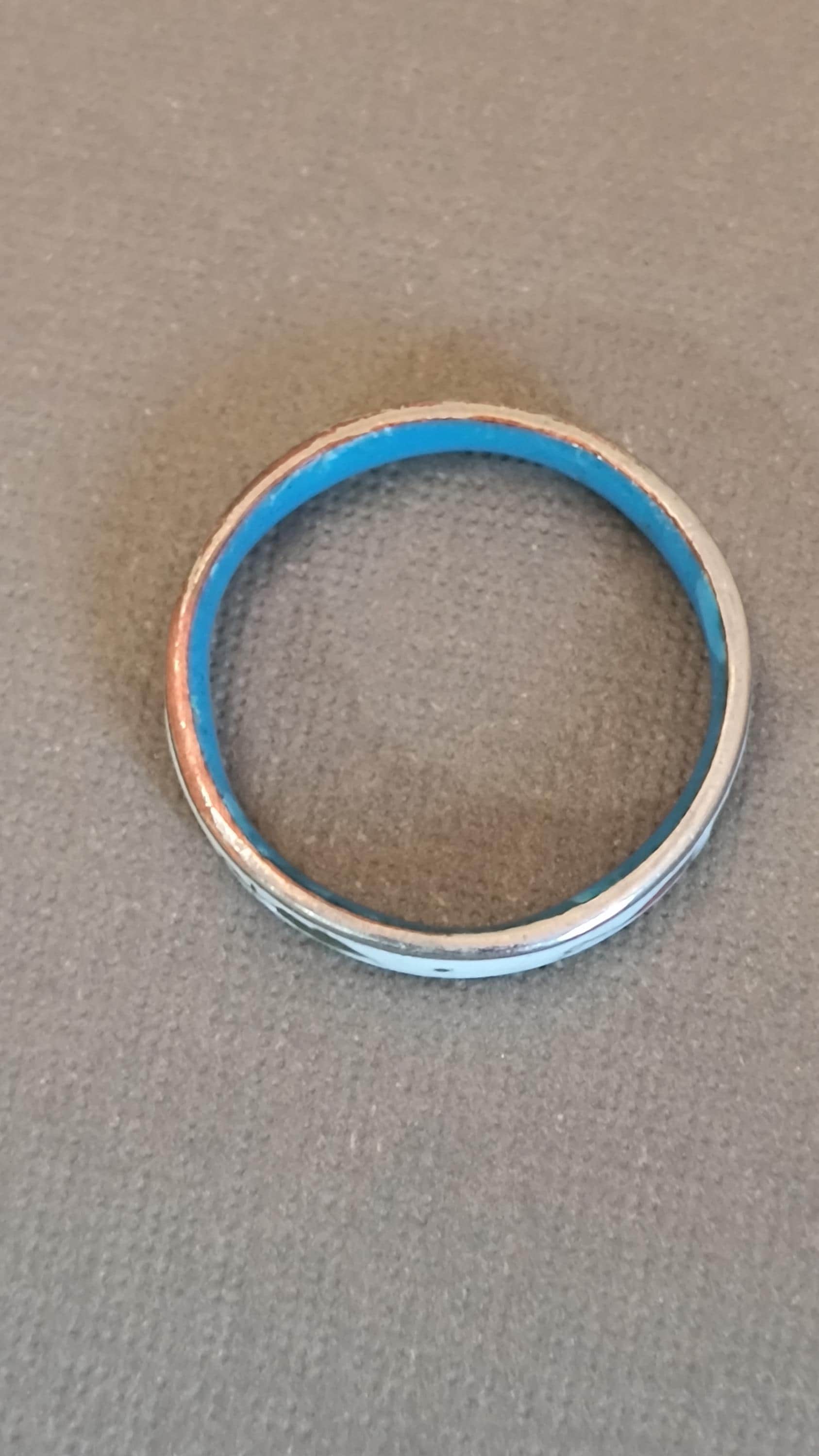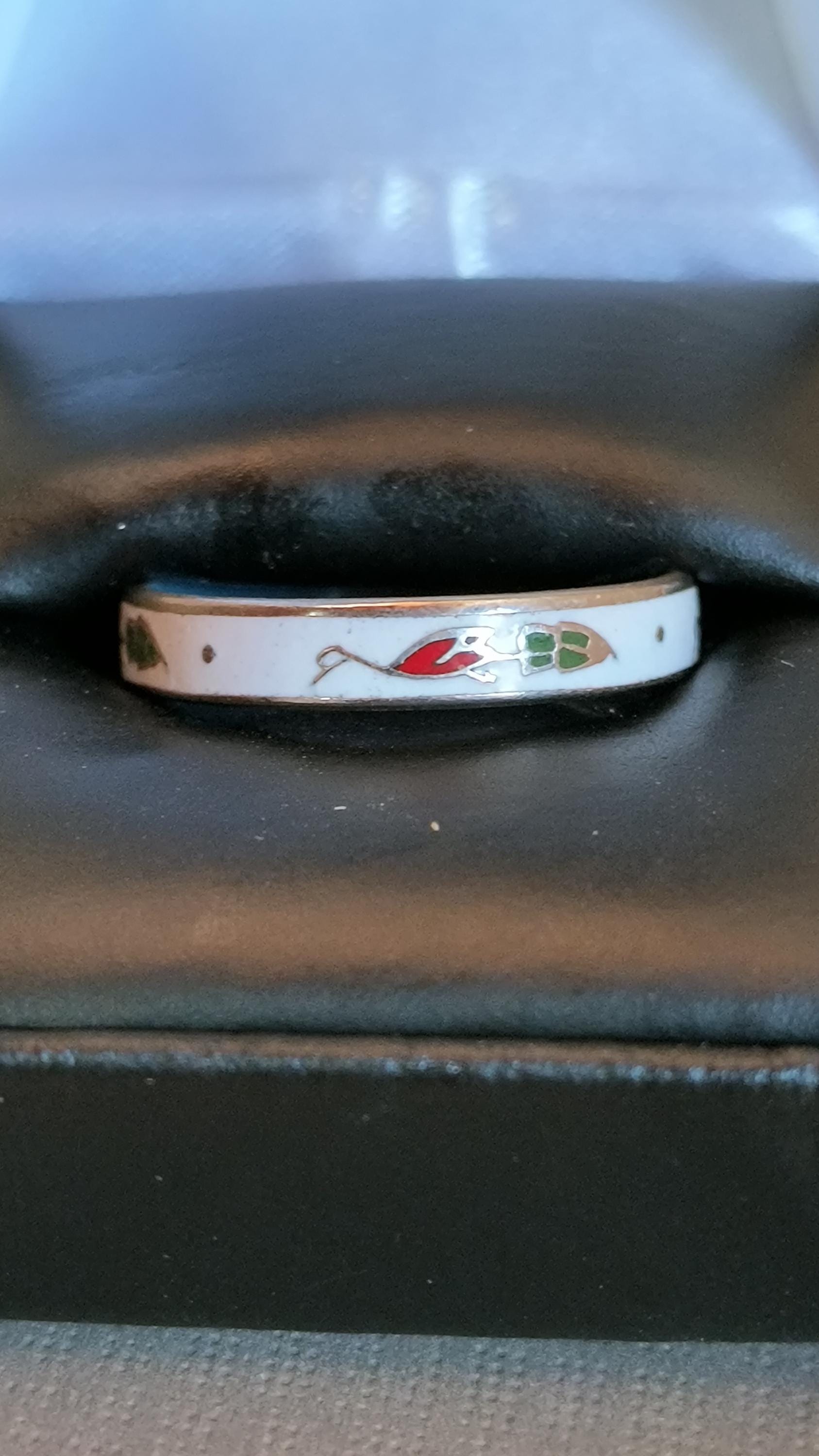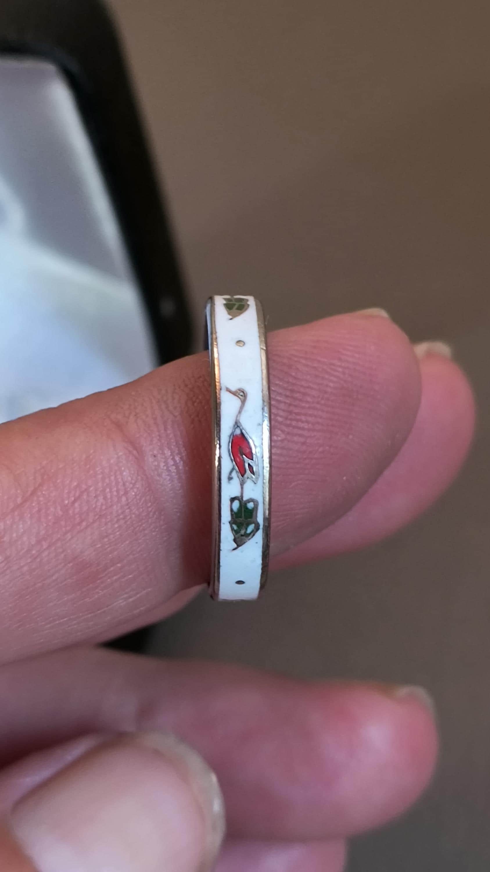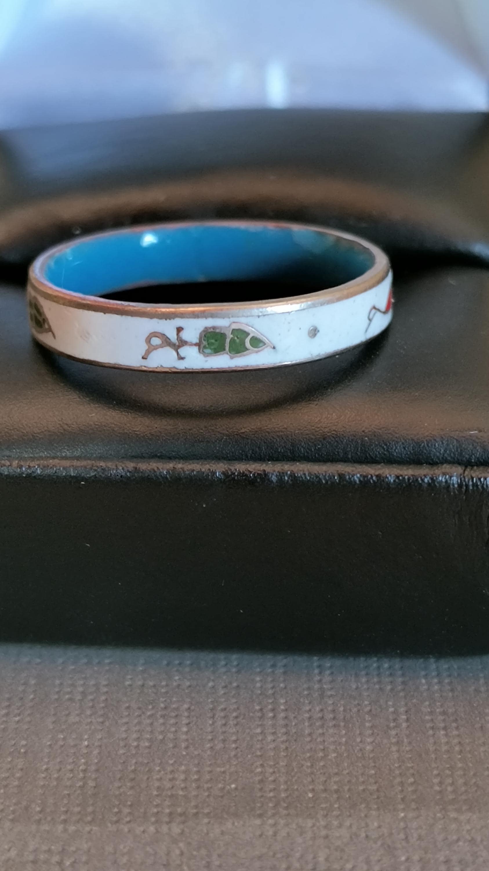 This is such an interesting little band - it's super comfortable on the finger, thanks to the comfort fit and light blue enamel. If anyone knows the meaning of the red heron, please let me know!