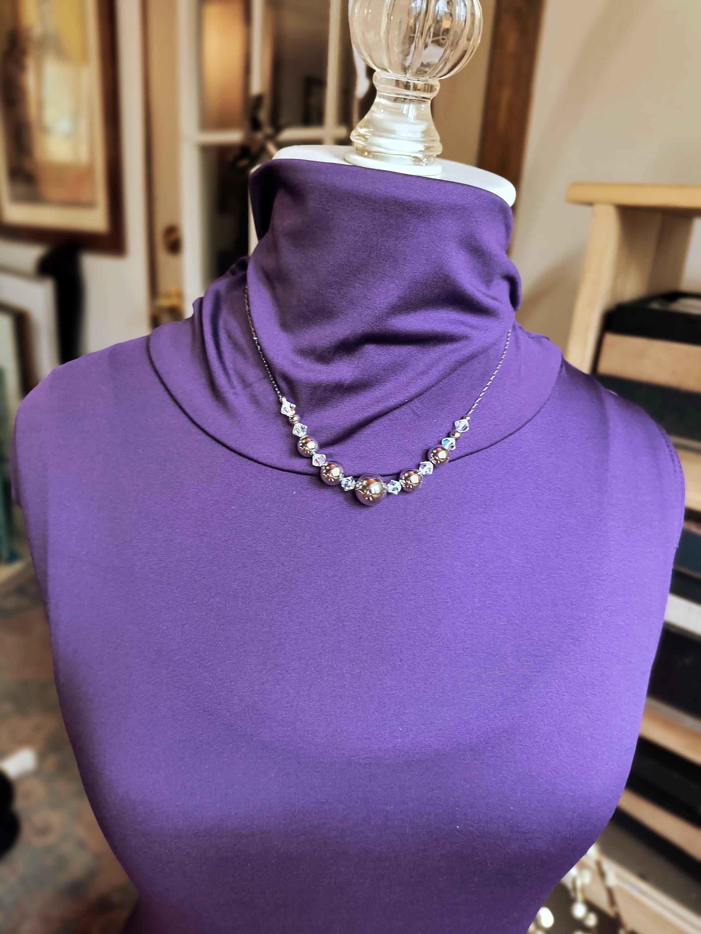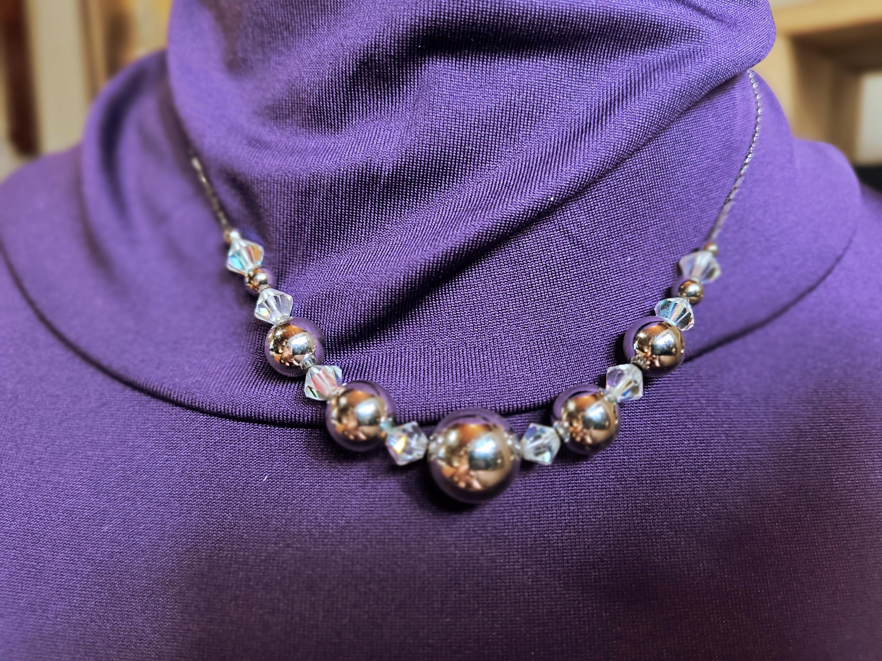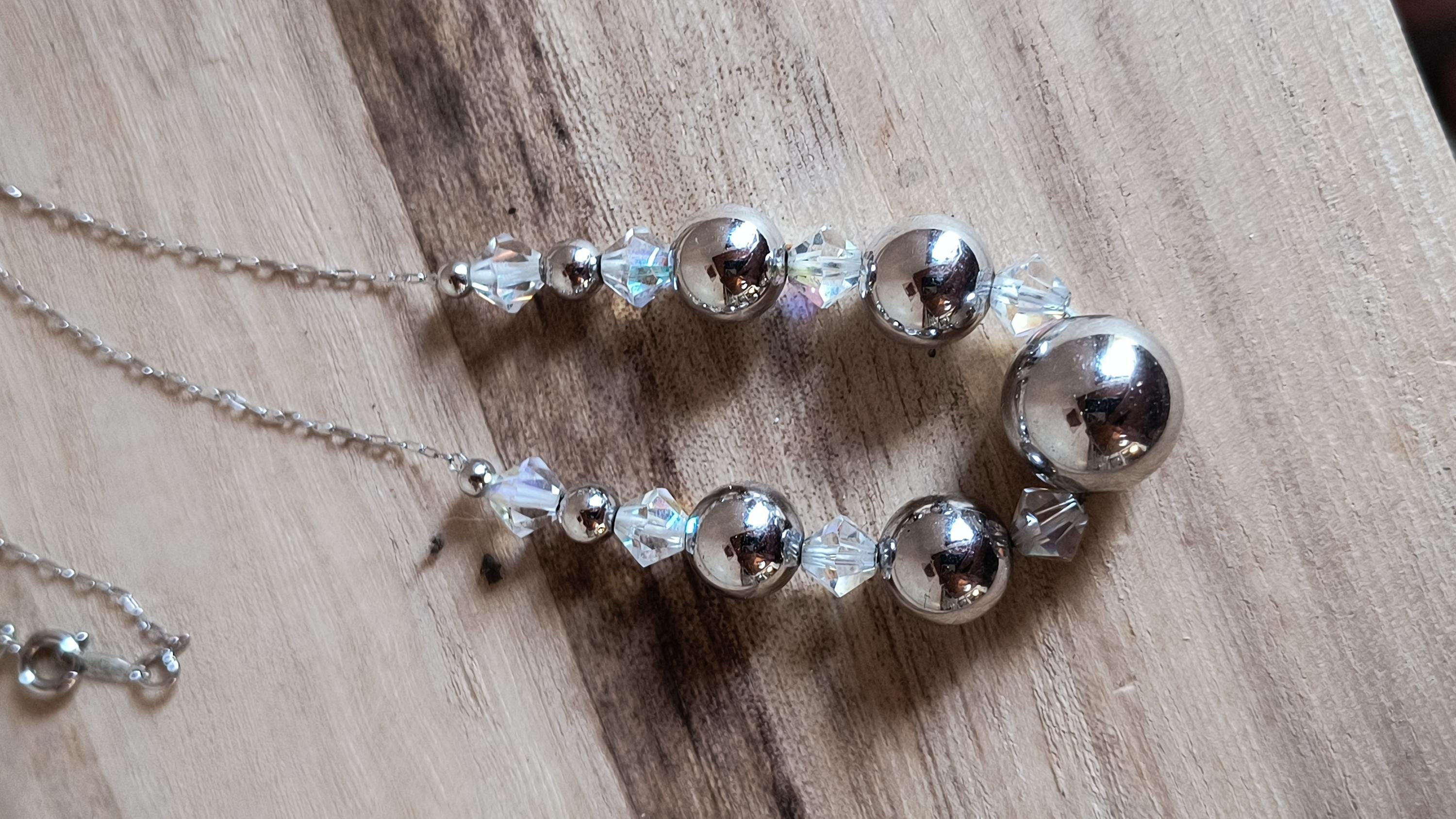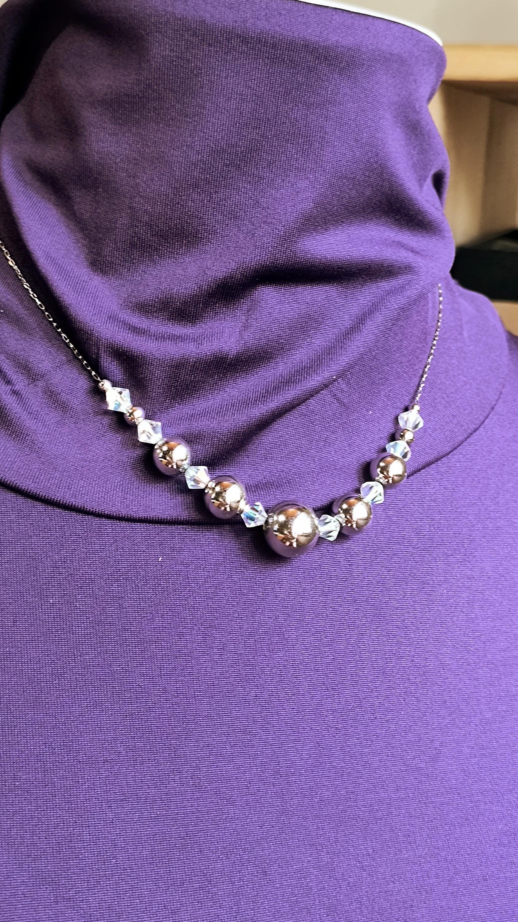 Here's a great, light weight piece that's easy to wear with just about anything. The silvertone beads are subtle, but the vintage aurora borealis beads give a bit of colorful sparkle!