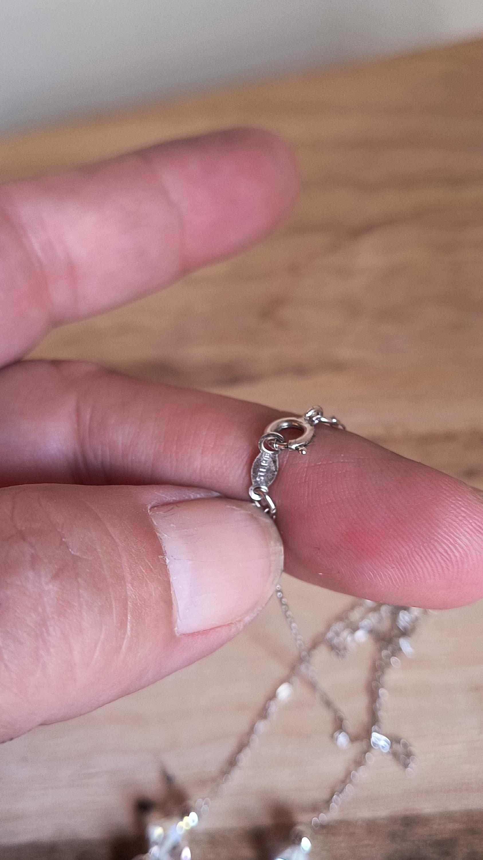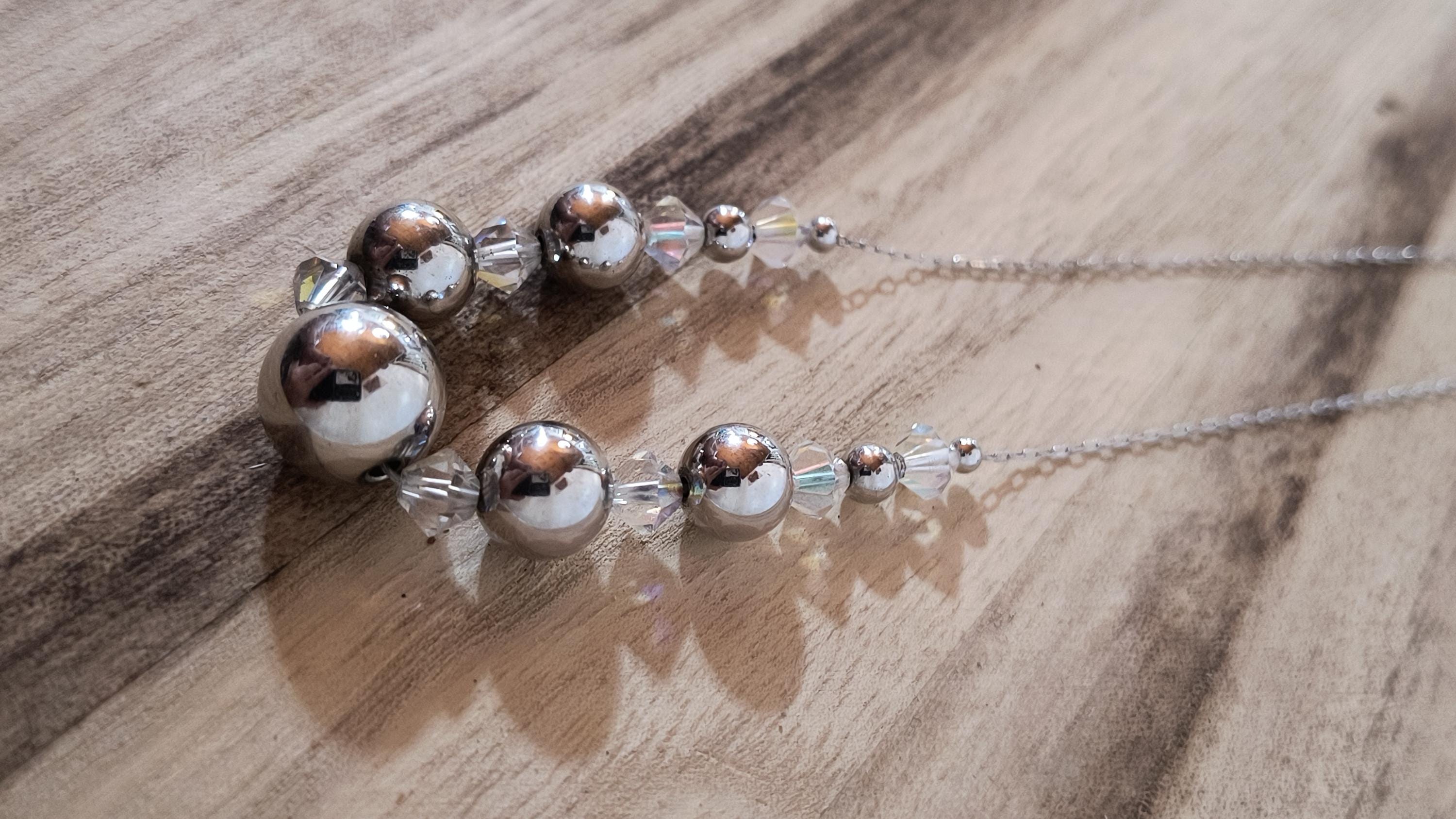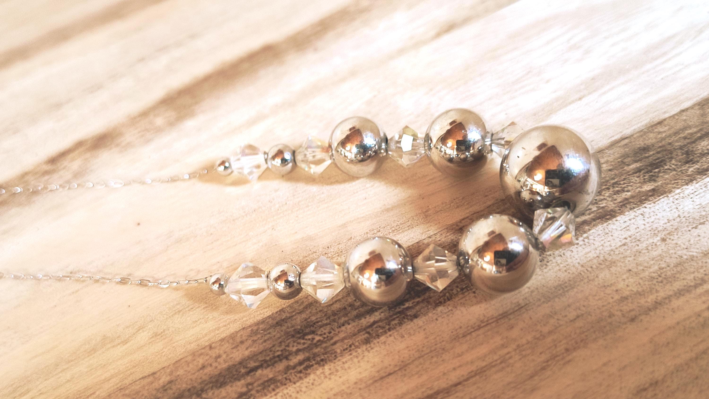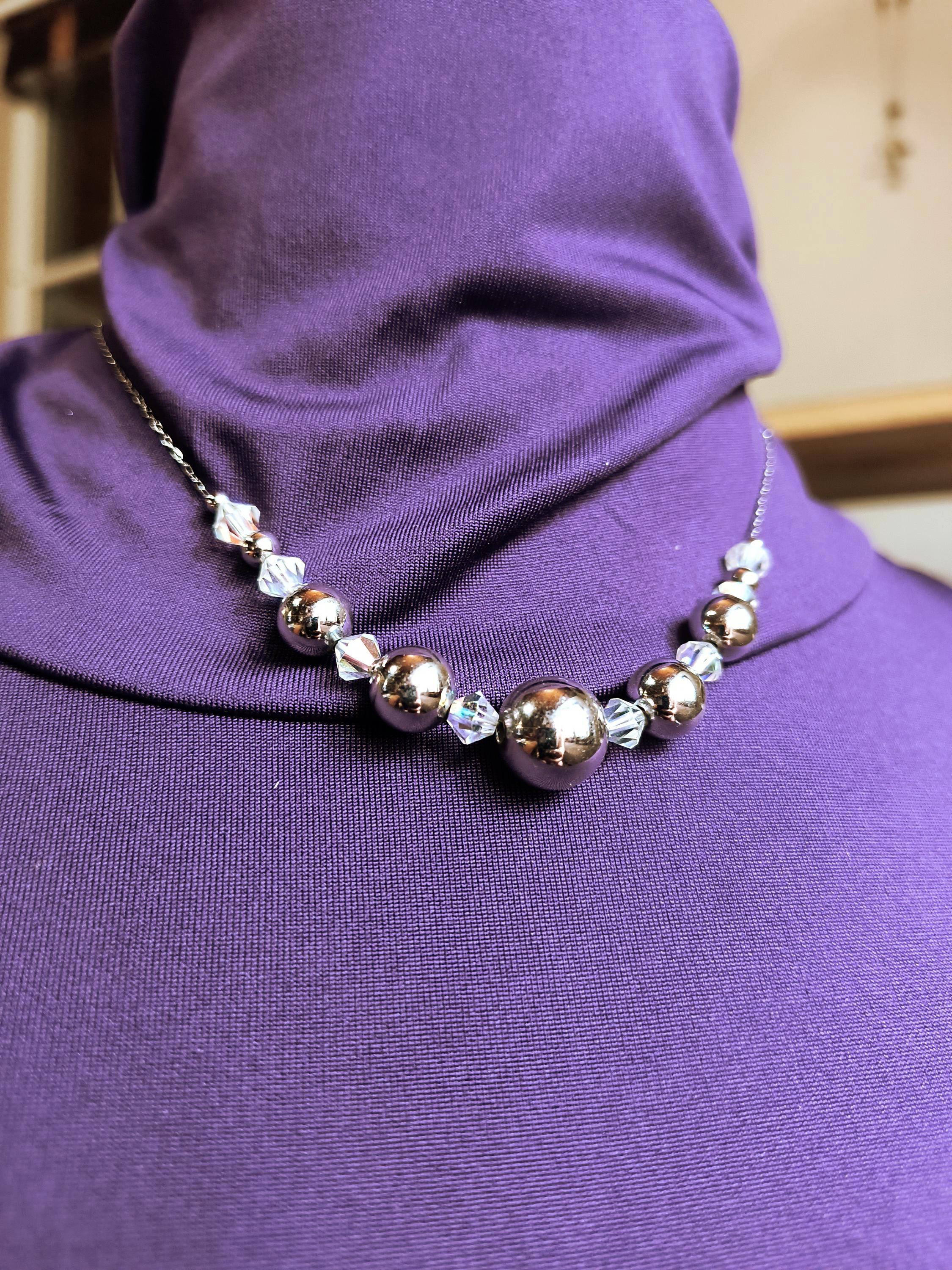Here's a great, light weight piece that's easy to wear with just about anything. The silvertone beads are subtle, but the vintage aurora borealis beads give a bit of colorful sparkle!