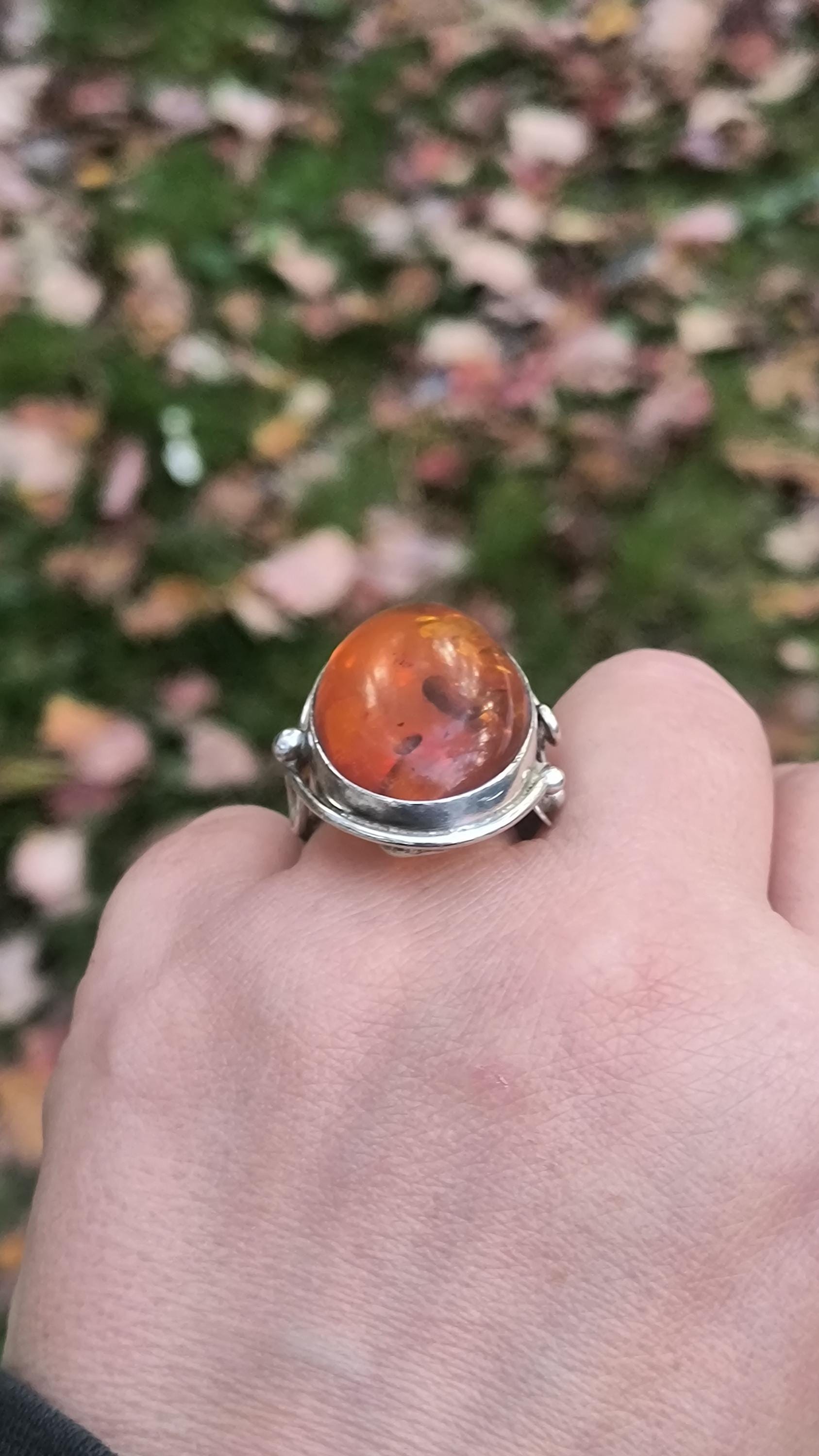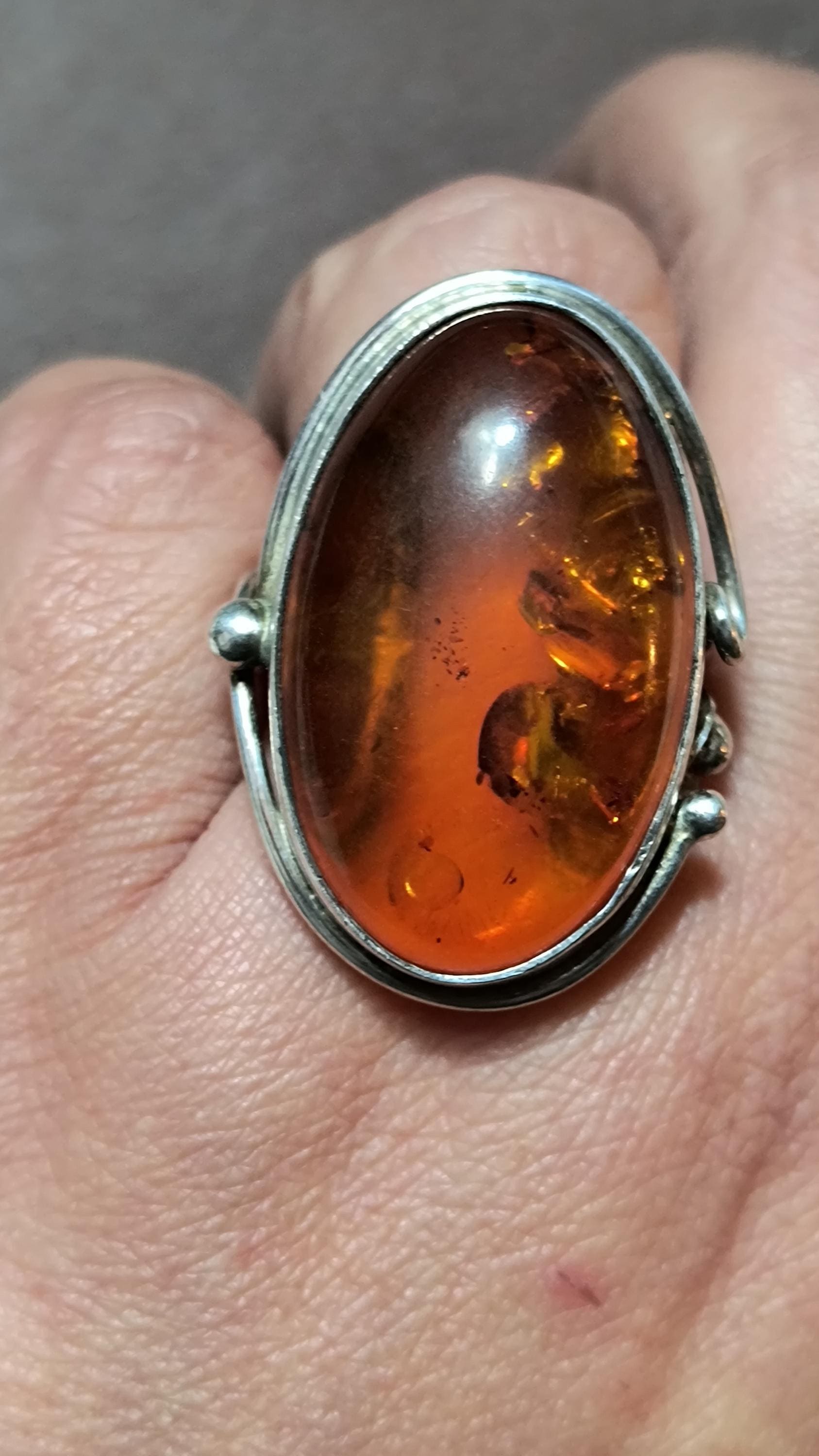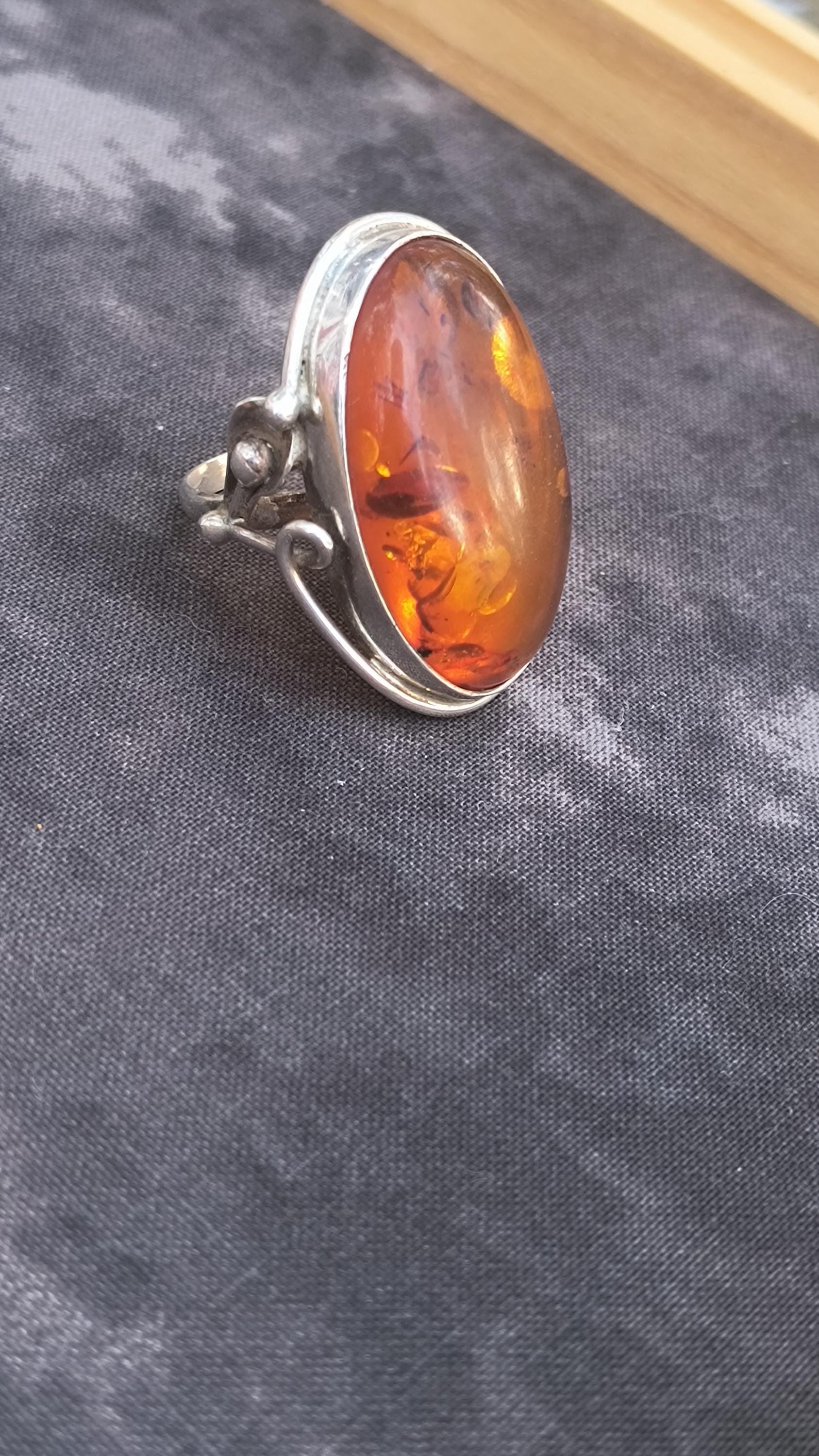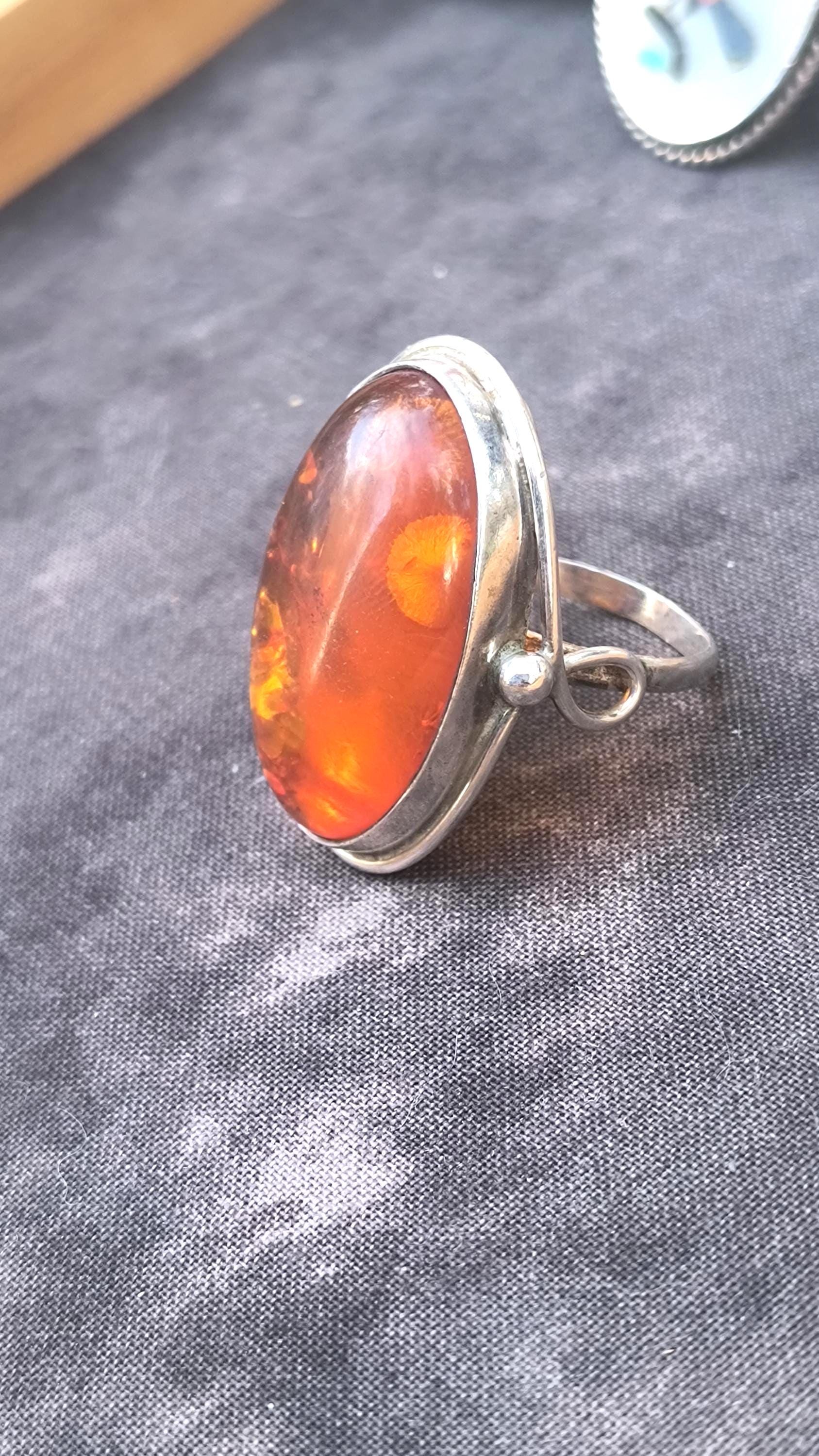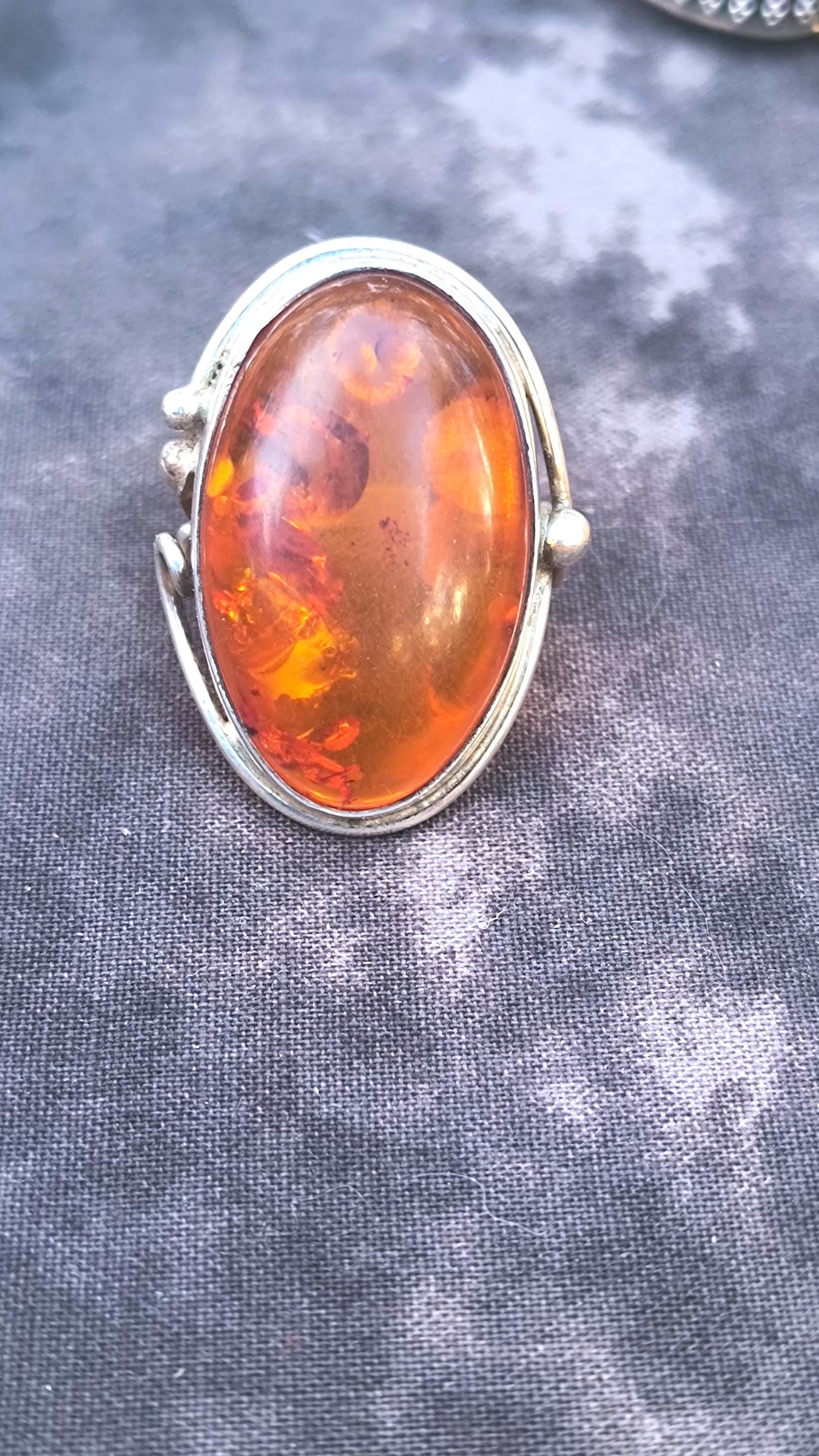 Baltic amber is known for having some unique healing properties, mostly relating to the immune system and reducing inflamation. This particular ring dates to the 1990s, and is created in the revival of the Art Nouveau style that was so popular then! The spangles (yes, that's a real term!) inside the gem bring light and life to the amber, echoing the great age of the fossilized sap!