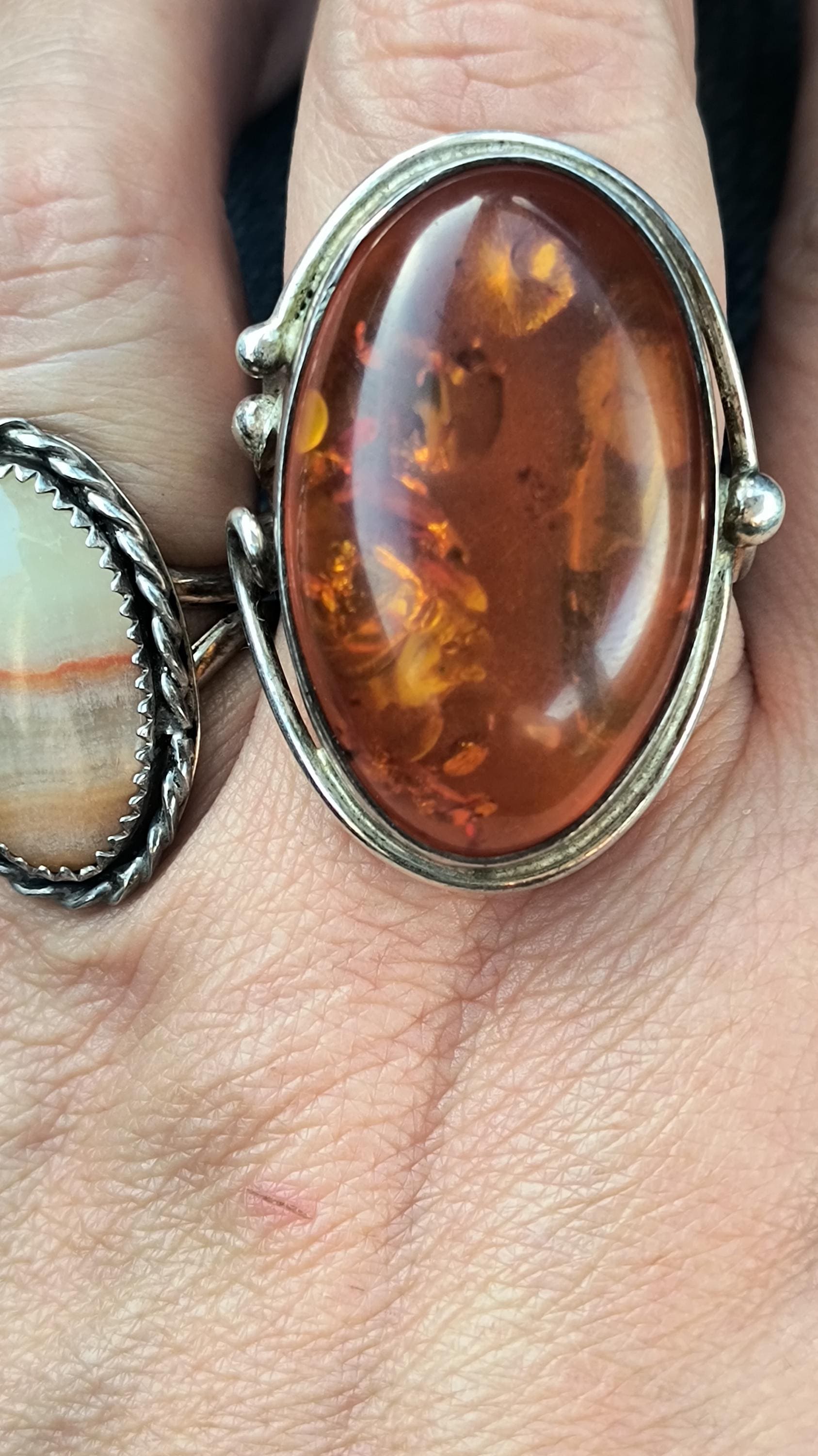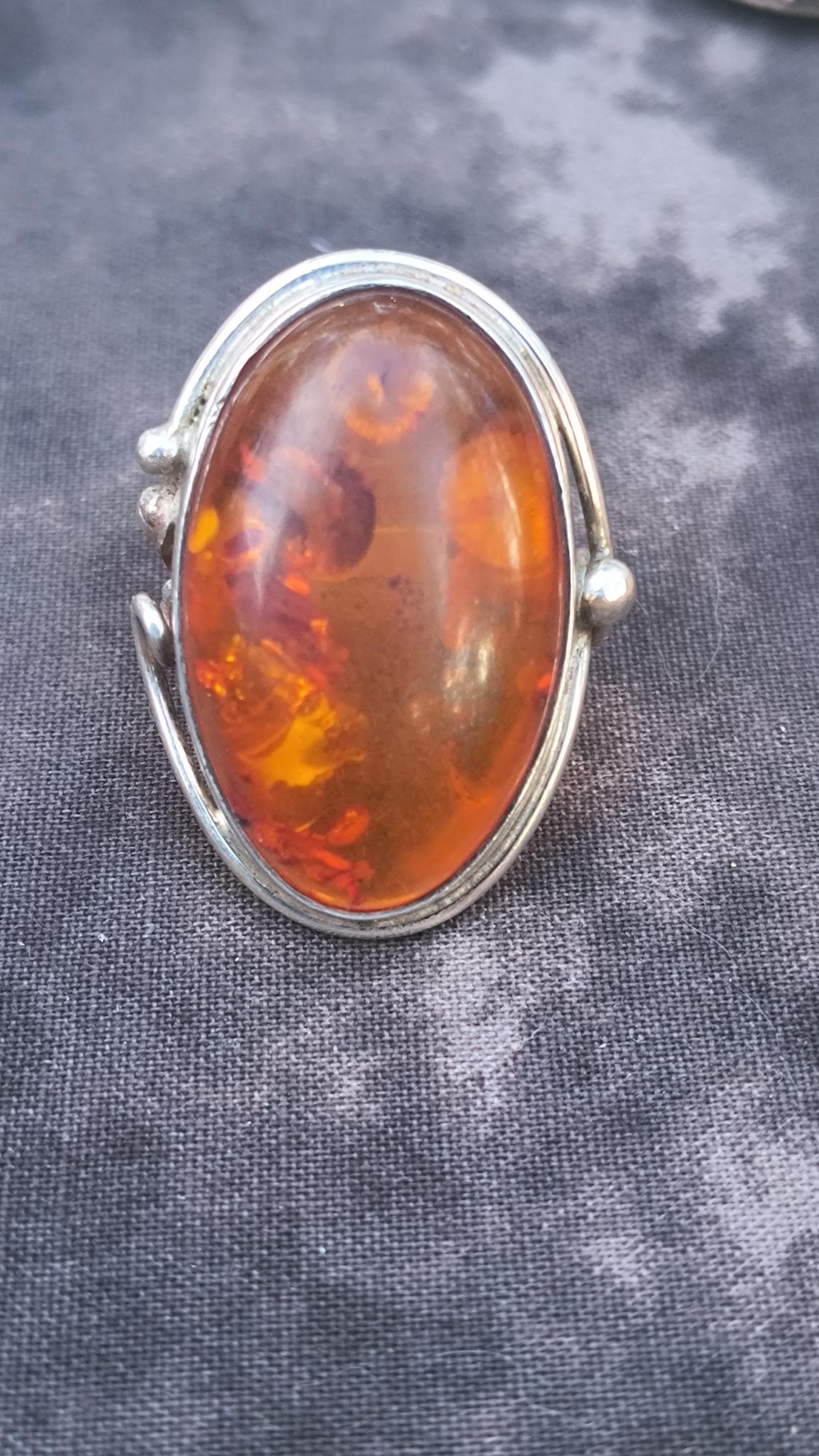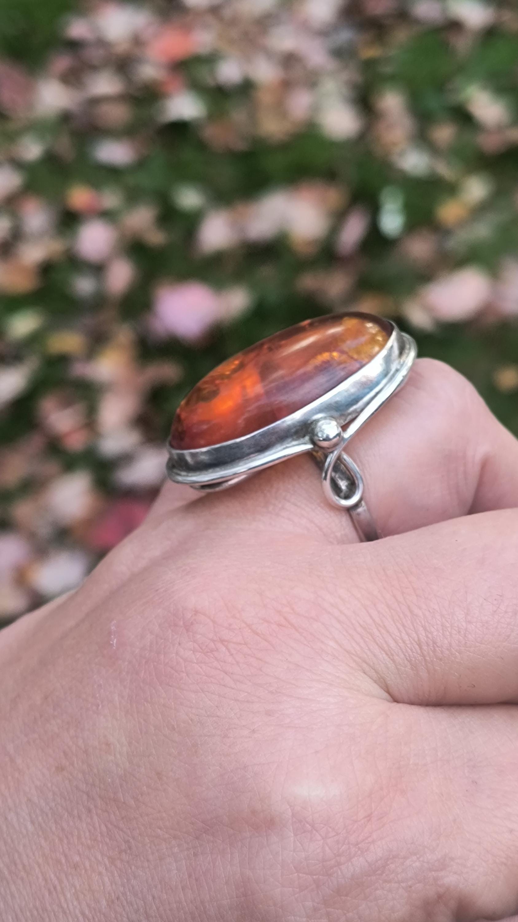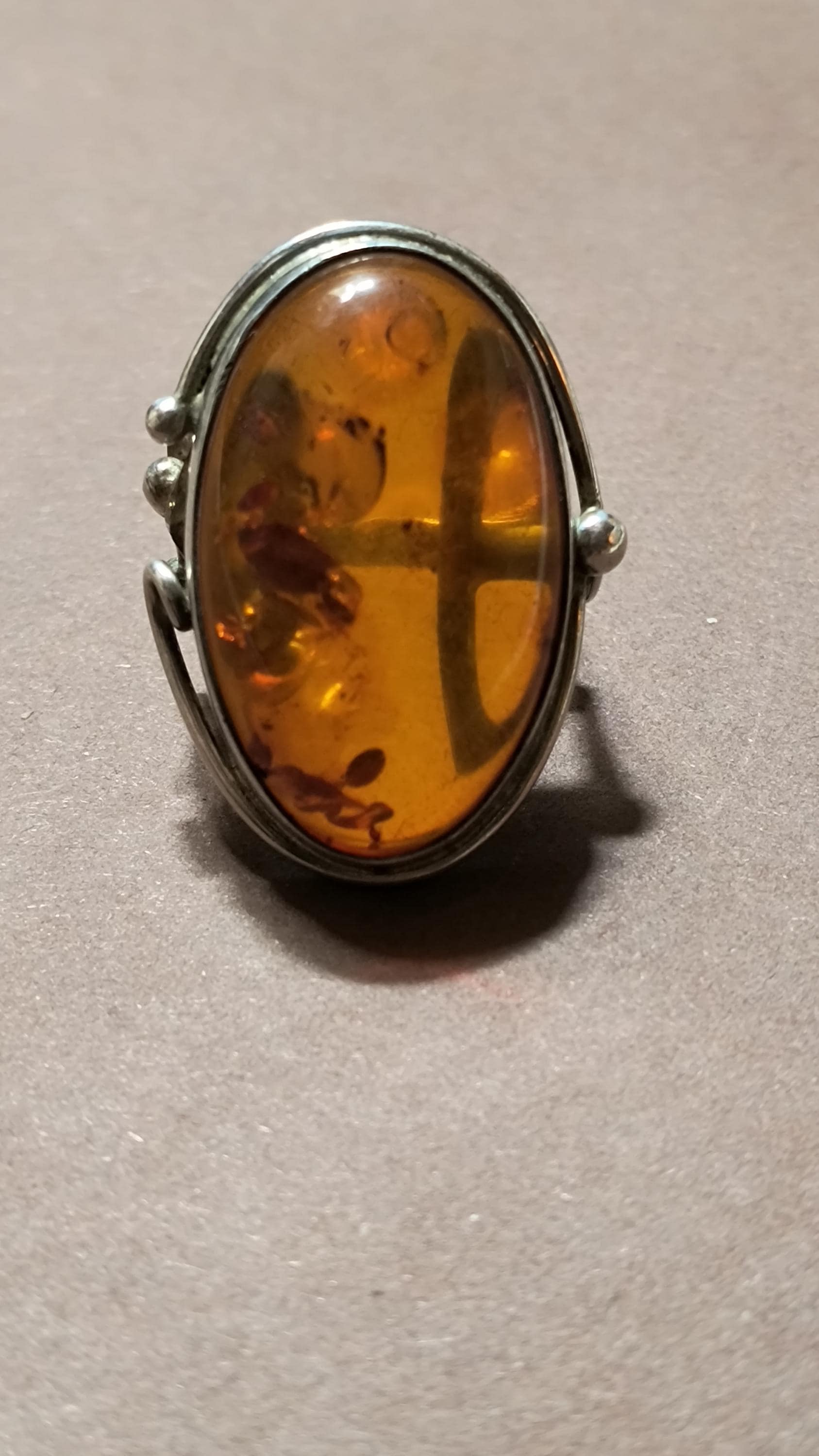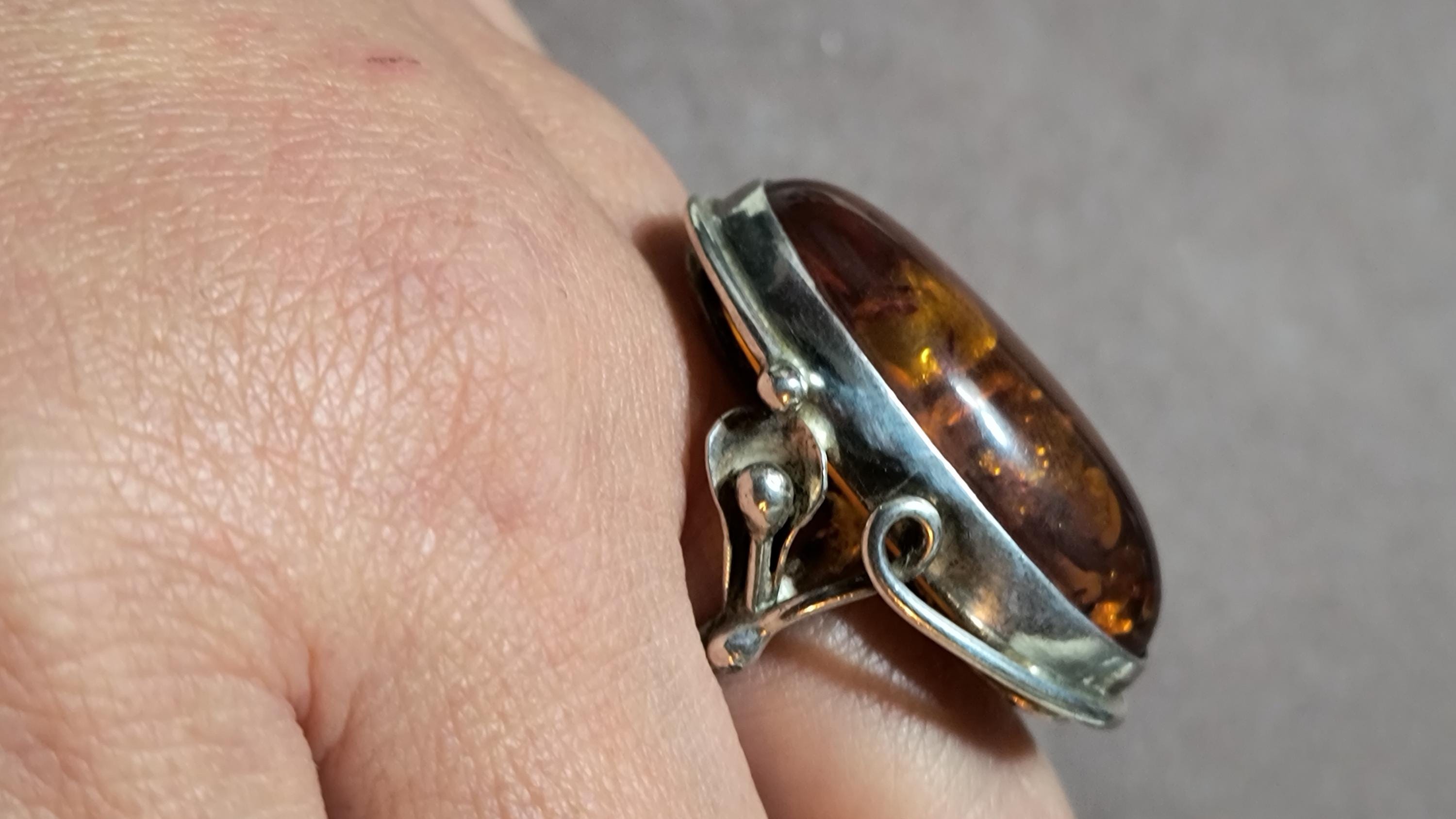 Baltic amber is known for having some unique healing properties, mostly relating to the immune system and reducing inflamation. This particular ring dates to the 1990s, and is created in the revival of the Art Nouveau style that was so popular then! The spangles (yes, that's a real term!) inside the gem bring light and life to the amber, echoing the great age of the fossilized sap!