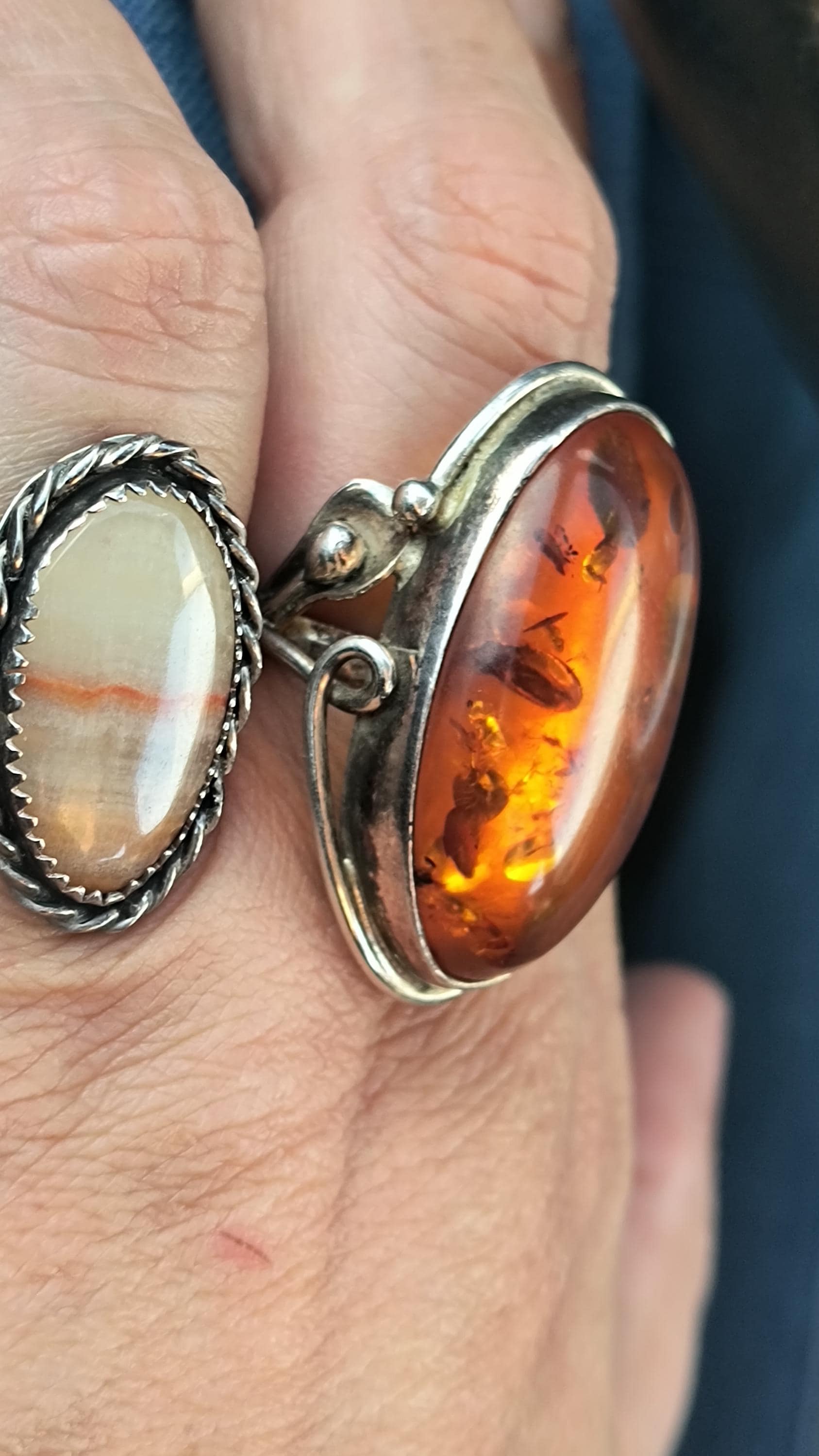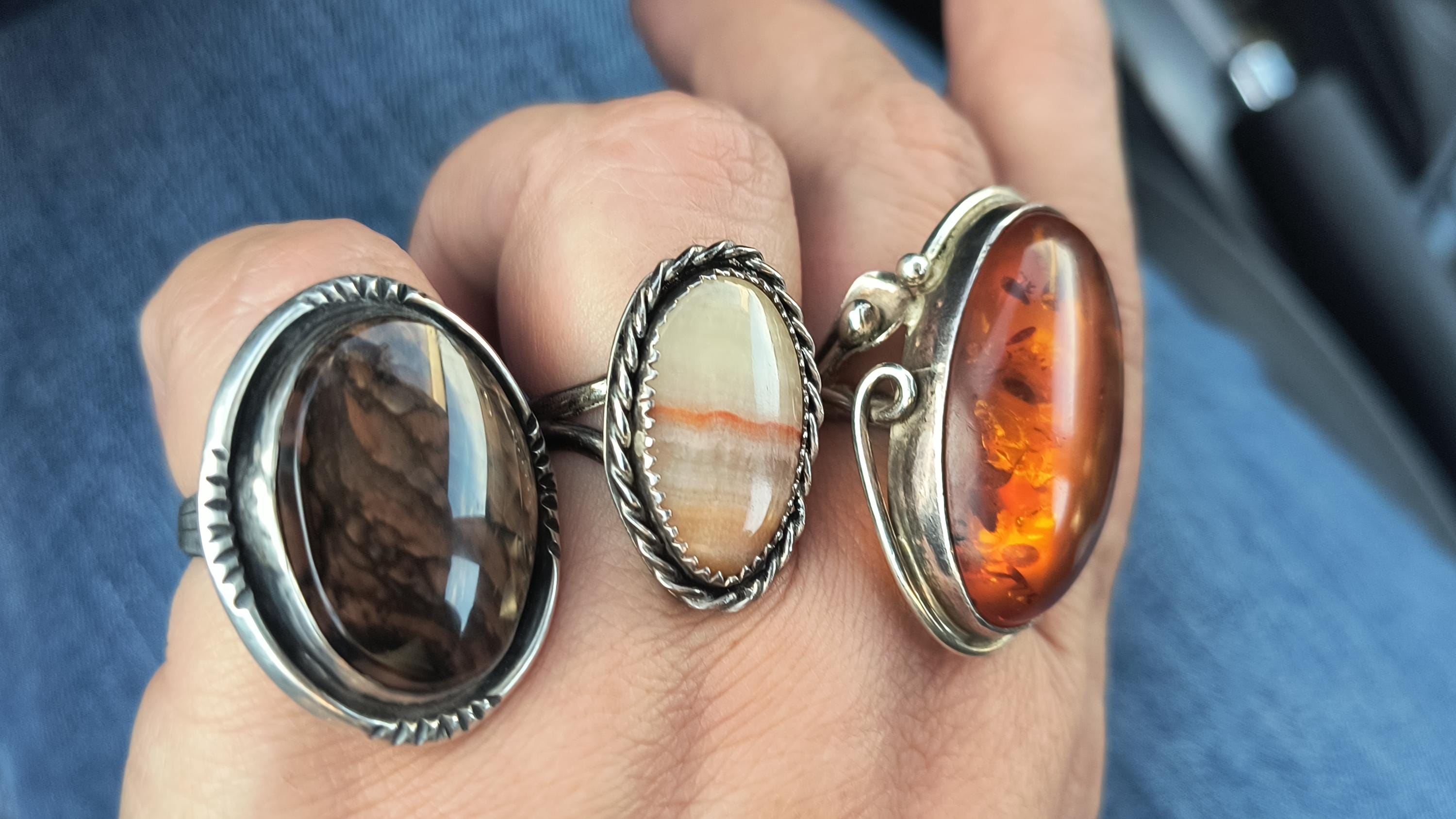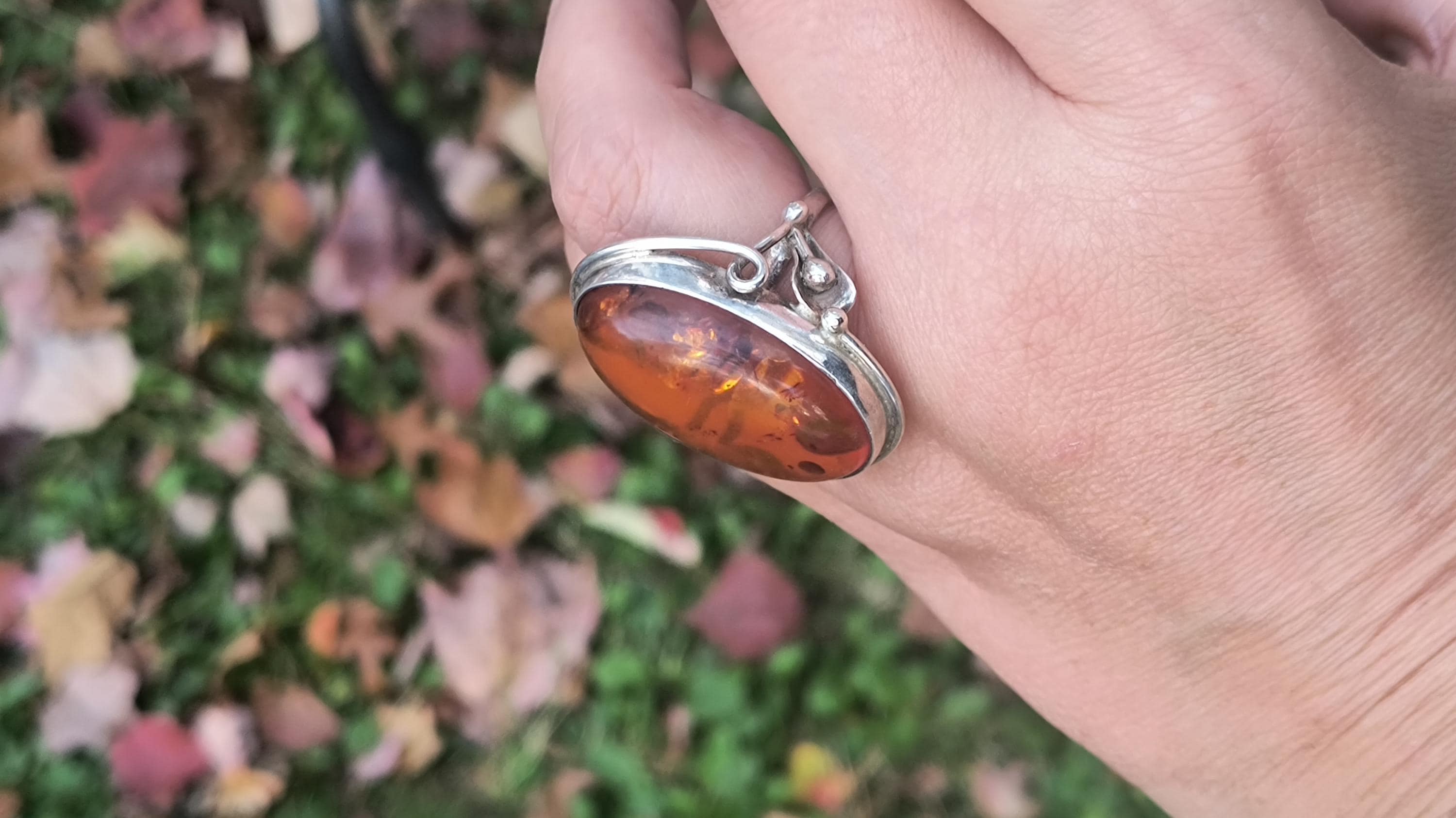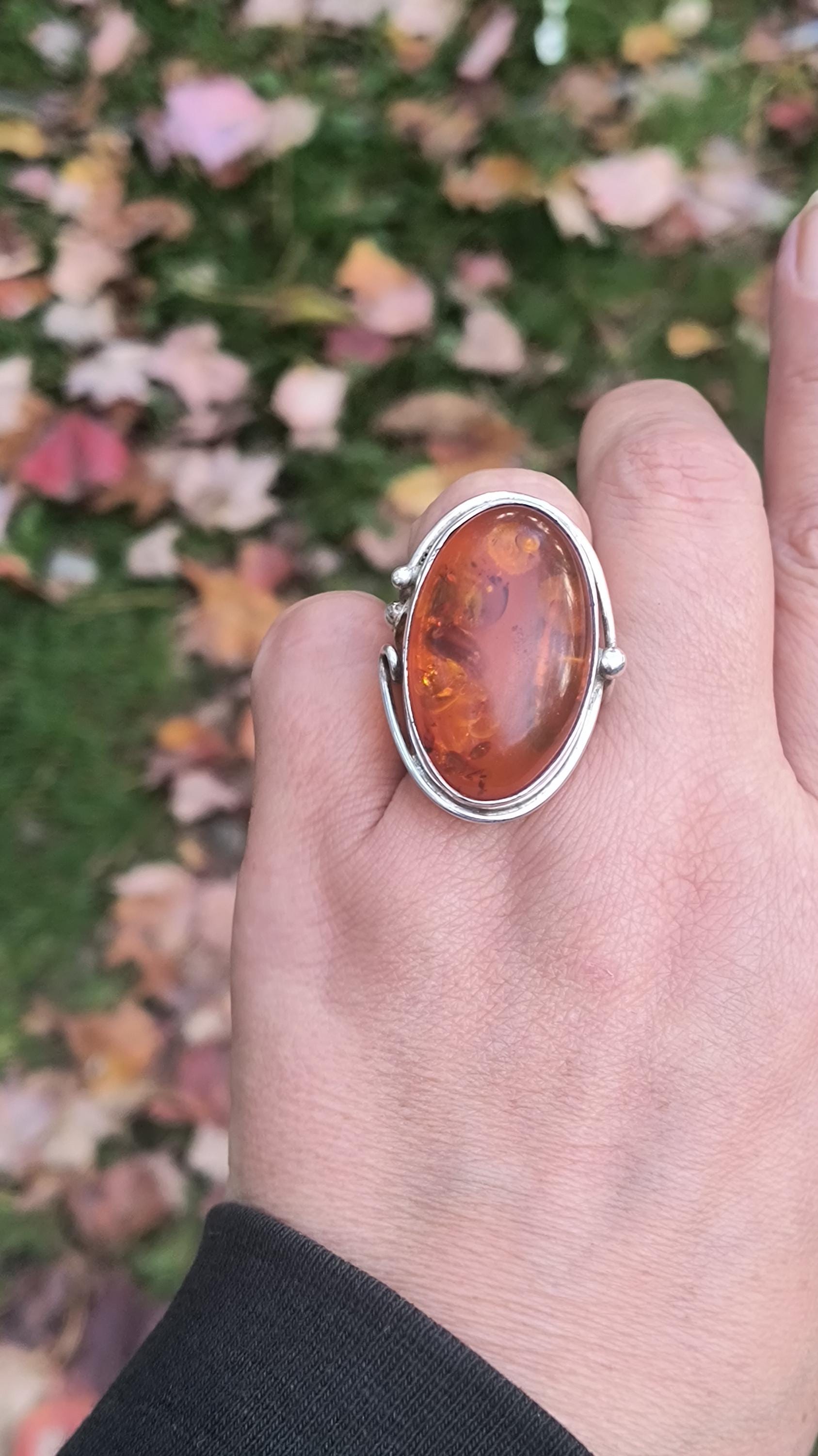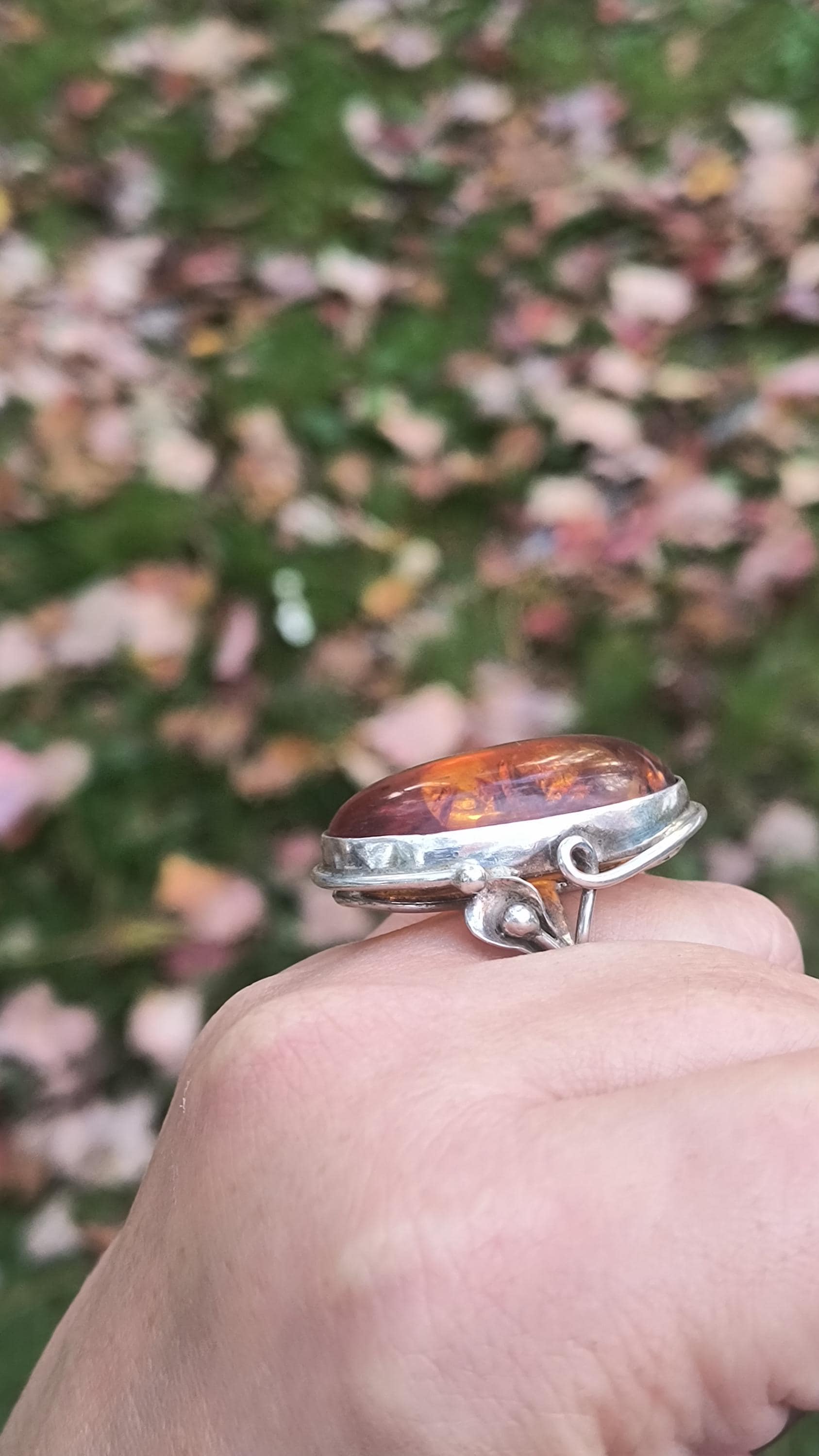 Baltic amber is known for having some unique healing properties, mostly relating to the immune system and reducing inflamation. This particular ring dates to the 1990s, and is created in the revival of the Art Nouveau style that was so popular then! The spangles (yes, that's a real term!) inside the gem bring light and life to the amber, echoing the great age of the fossilized sap!