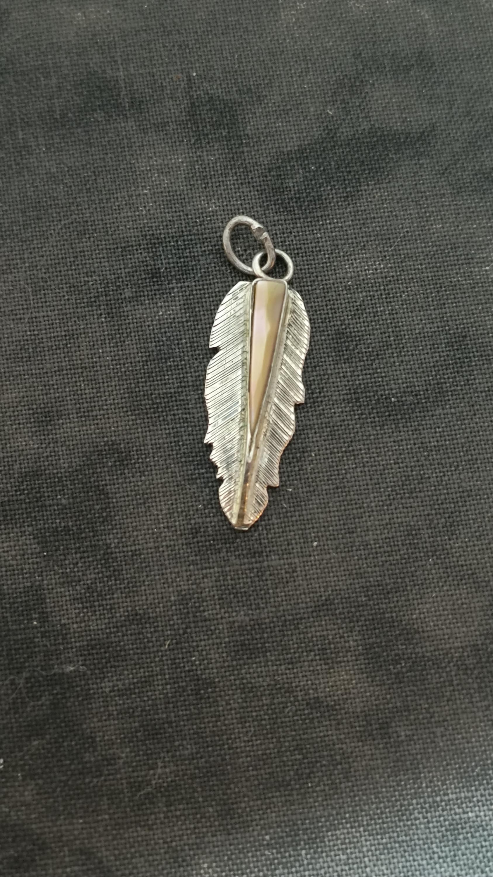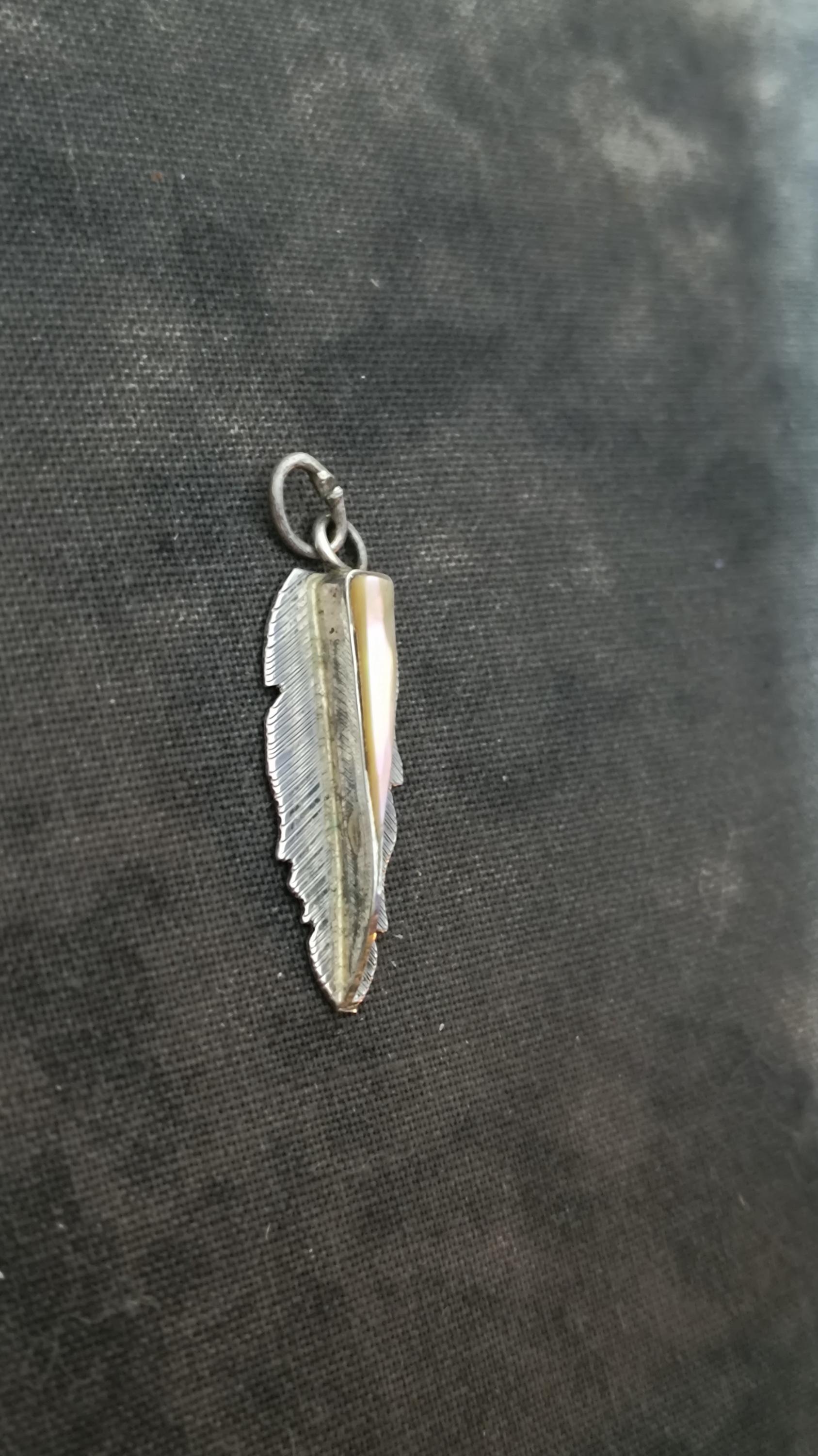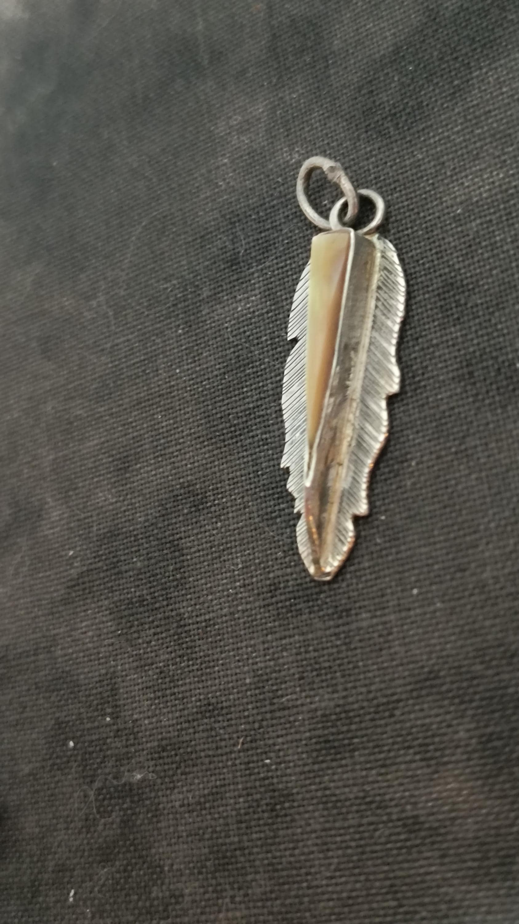 I love the feel of this vintage drop! It has the feel of an arrowhead, but with the feather shape softening the outlines. The center is mother of pearl, with a great luster! *This comes with a free, 18 inch extendable, silver plated chain*