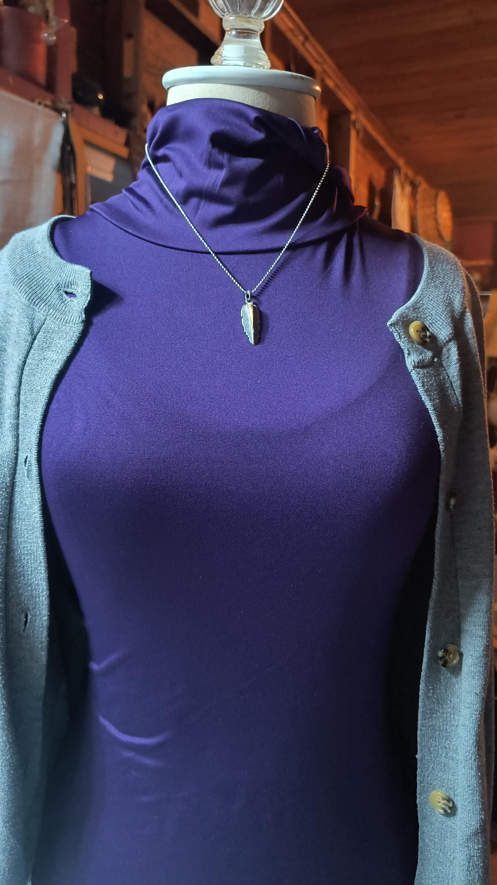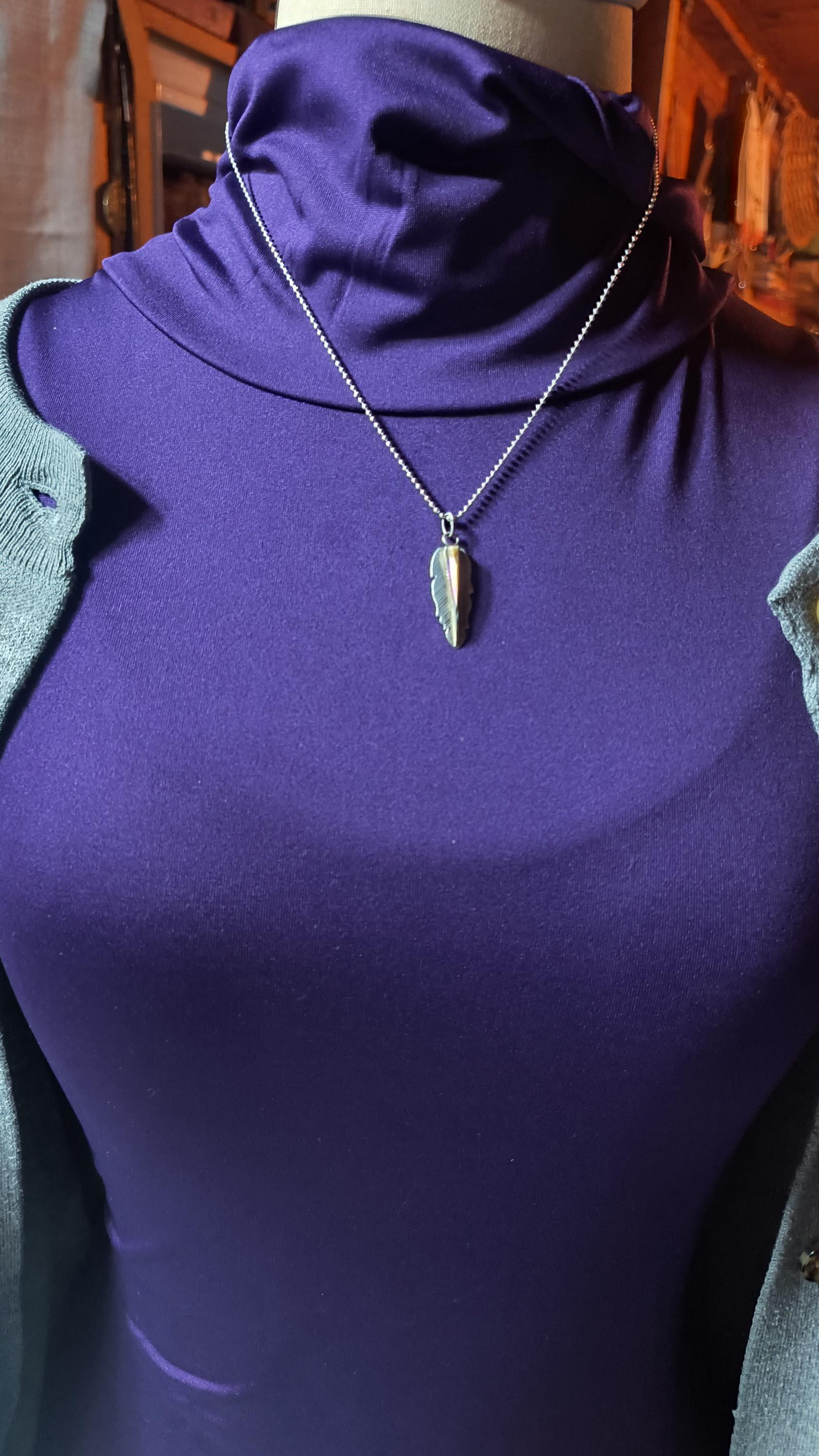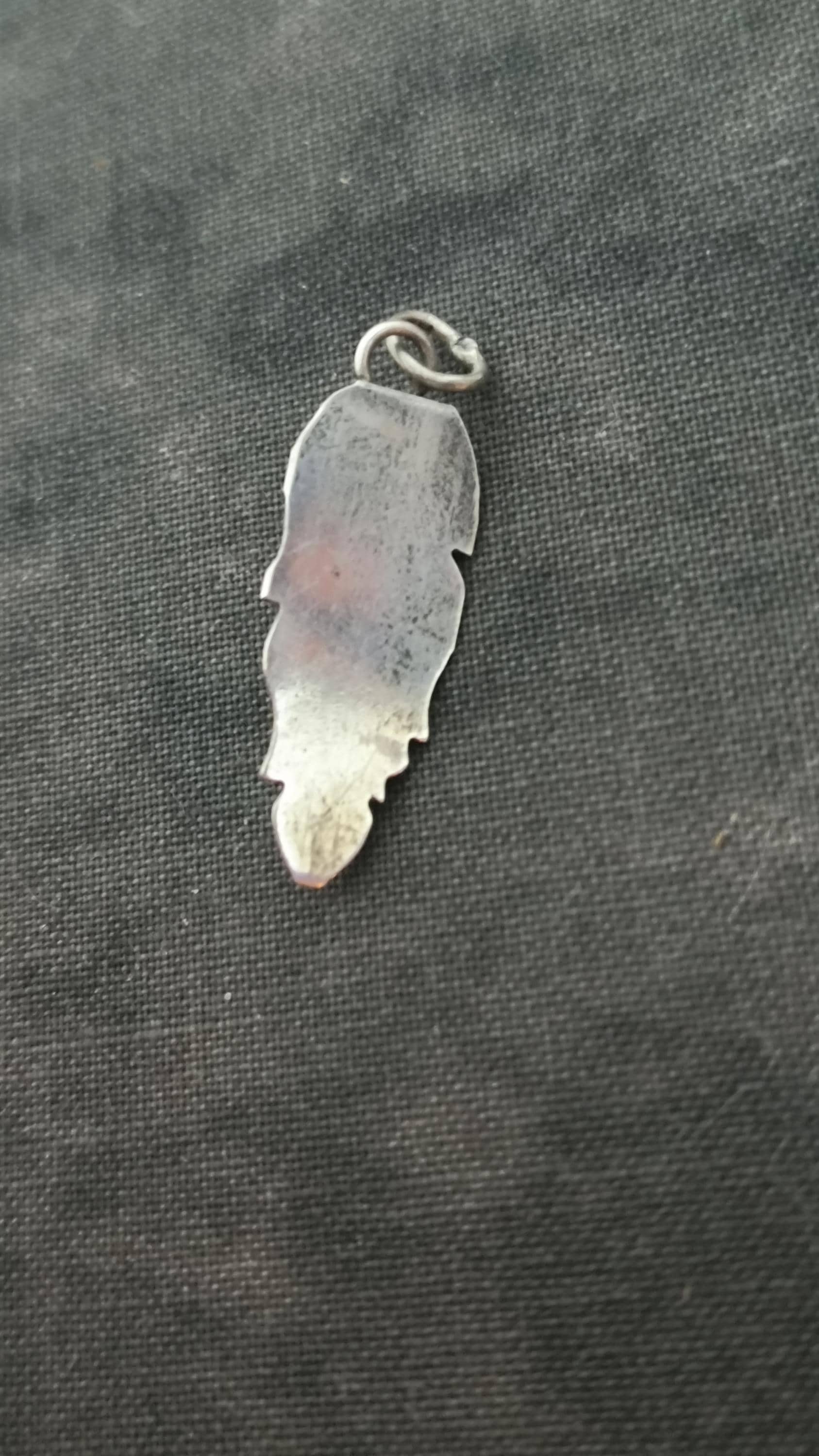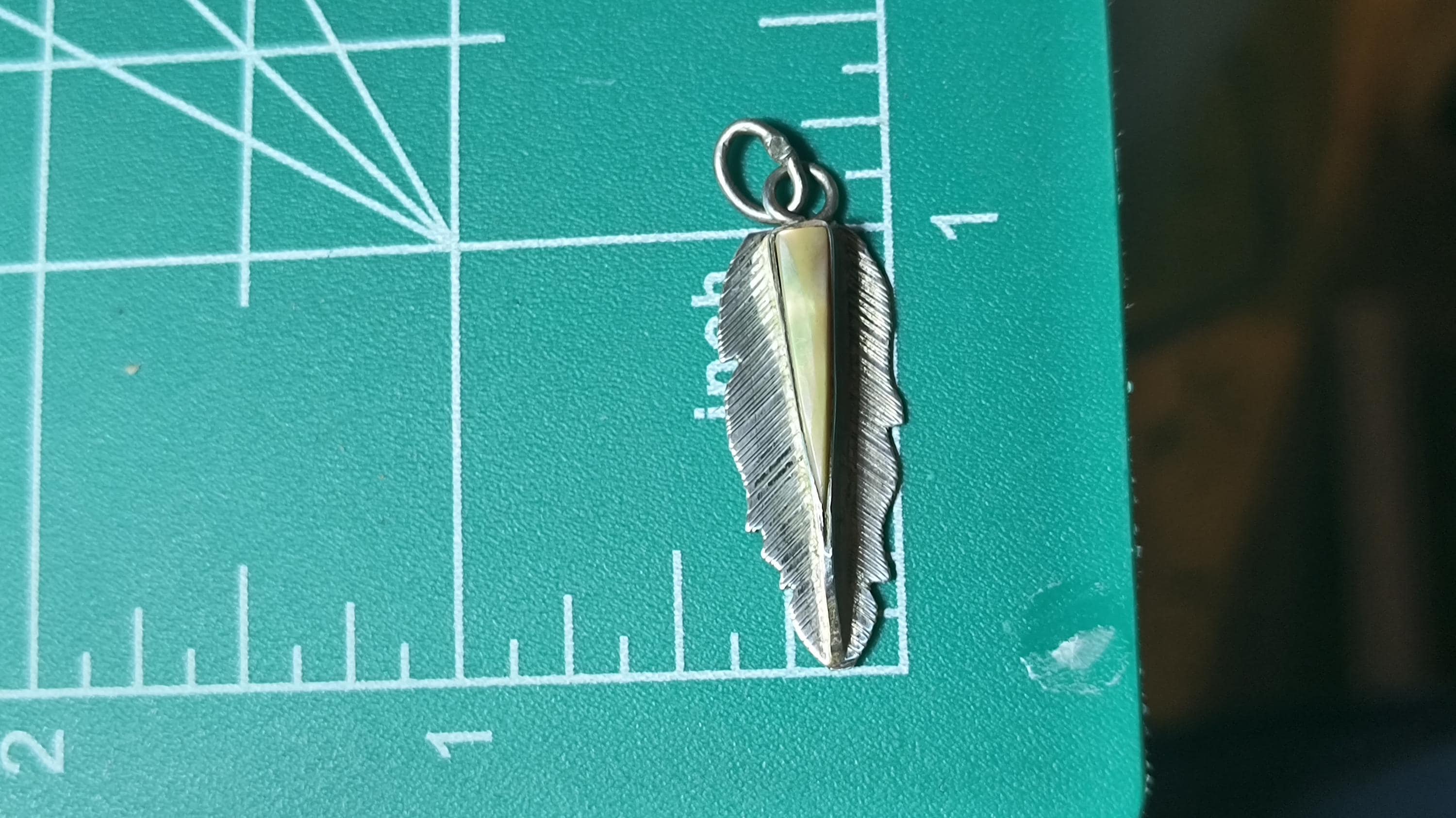 I love the feel of this vintage drop! It has the feel of an arrowhead, but with the feather shape softening the outlines. The center is mother of pearl, with a great luster! *This comes with a free, 18 inch extendable, silver plated chain*