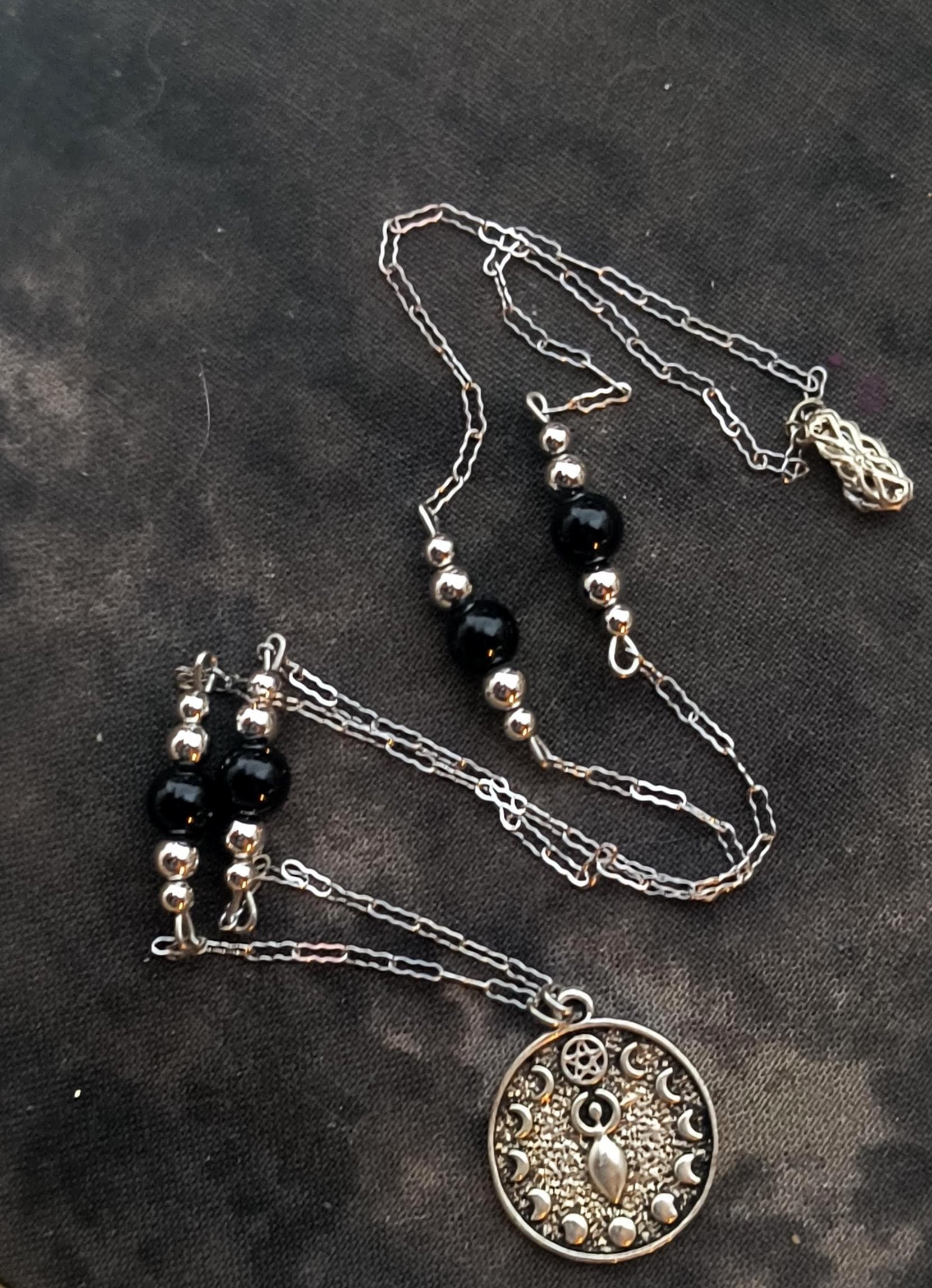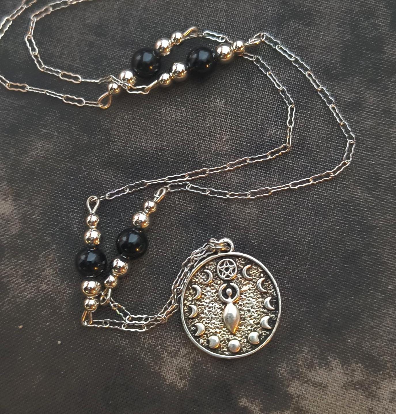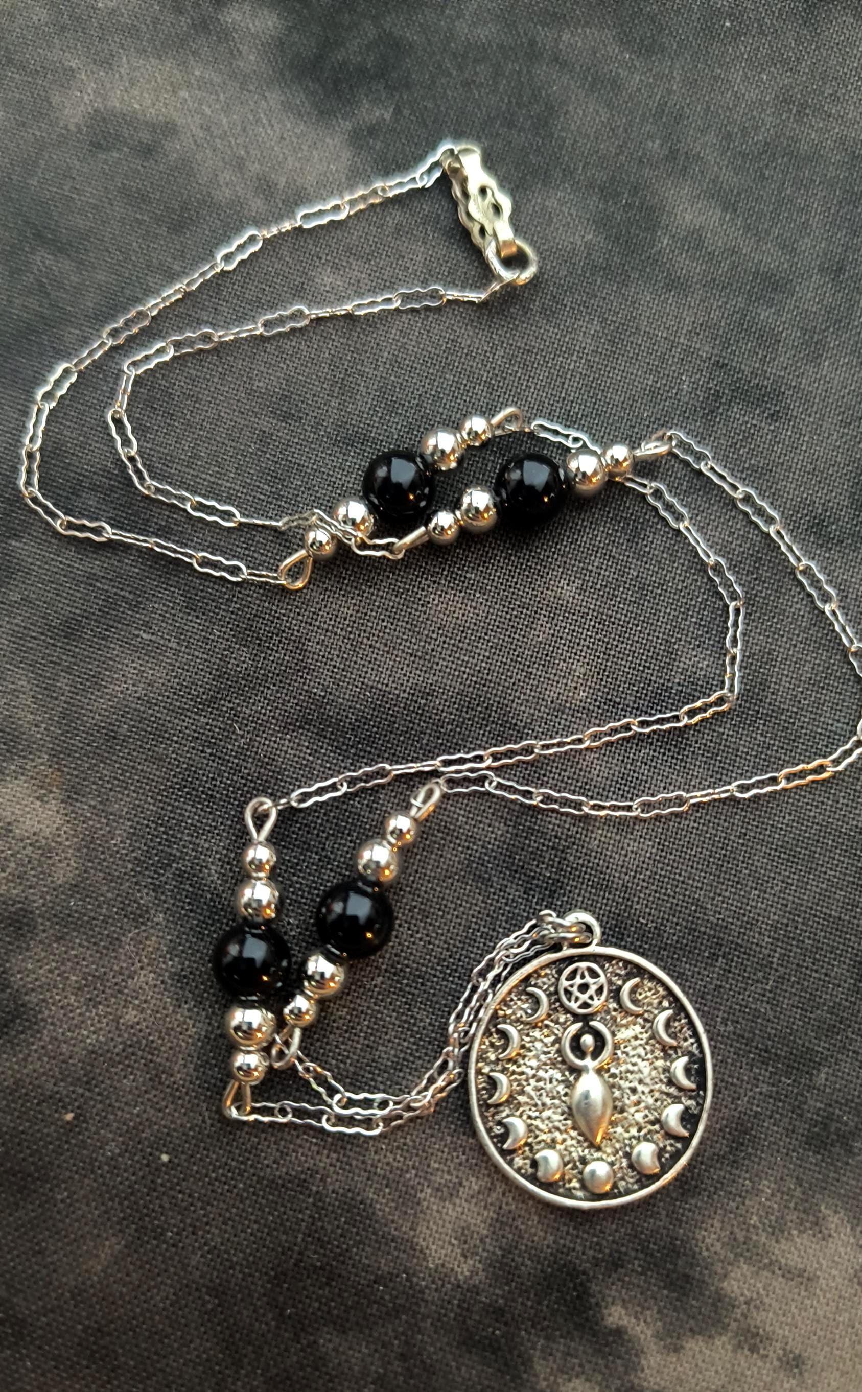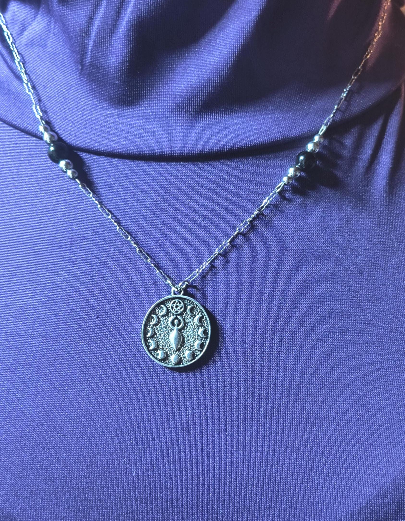 Handmade by Hillary here in our Maine studio, this one of a kind necklace features a pewter charm as the center piece. The charm depicts an ancient symbol of feminine divinity - a goddess with her arms raised over her head. Around her appear the phases of the moon, the full moon below her feet fueling her fire, the new moon above her head represented by a lovely pentacle.