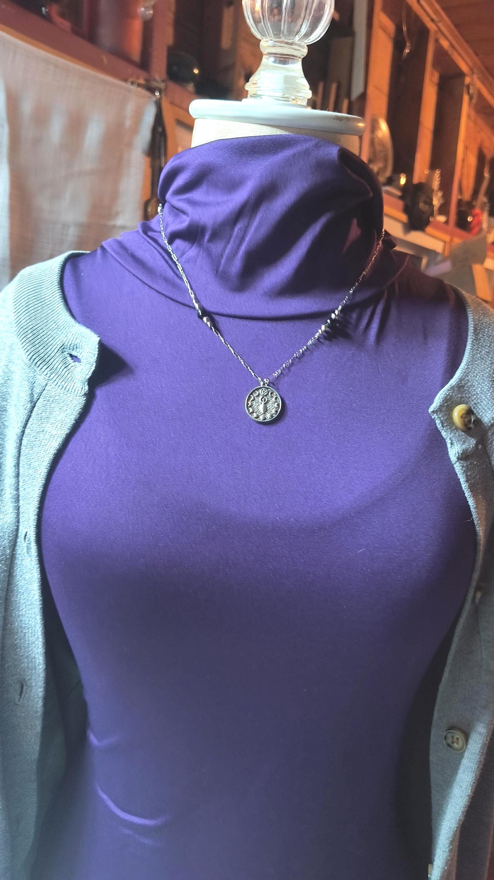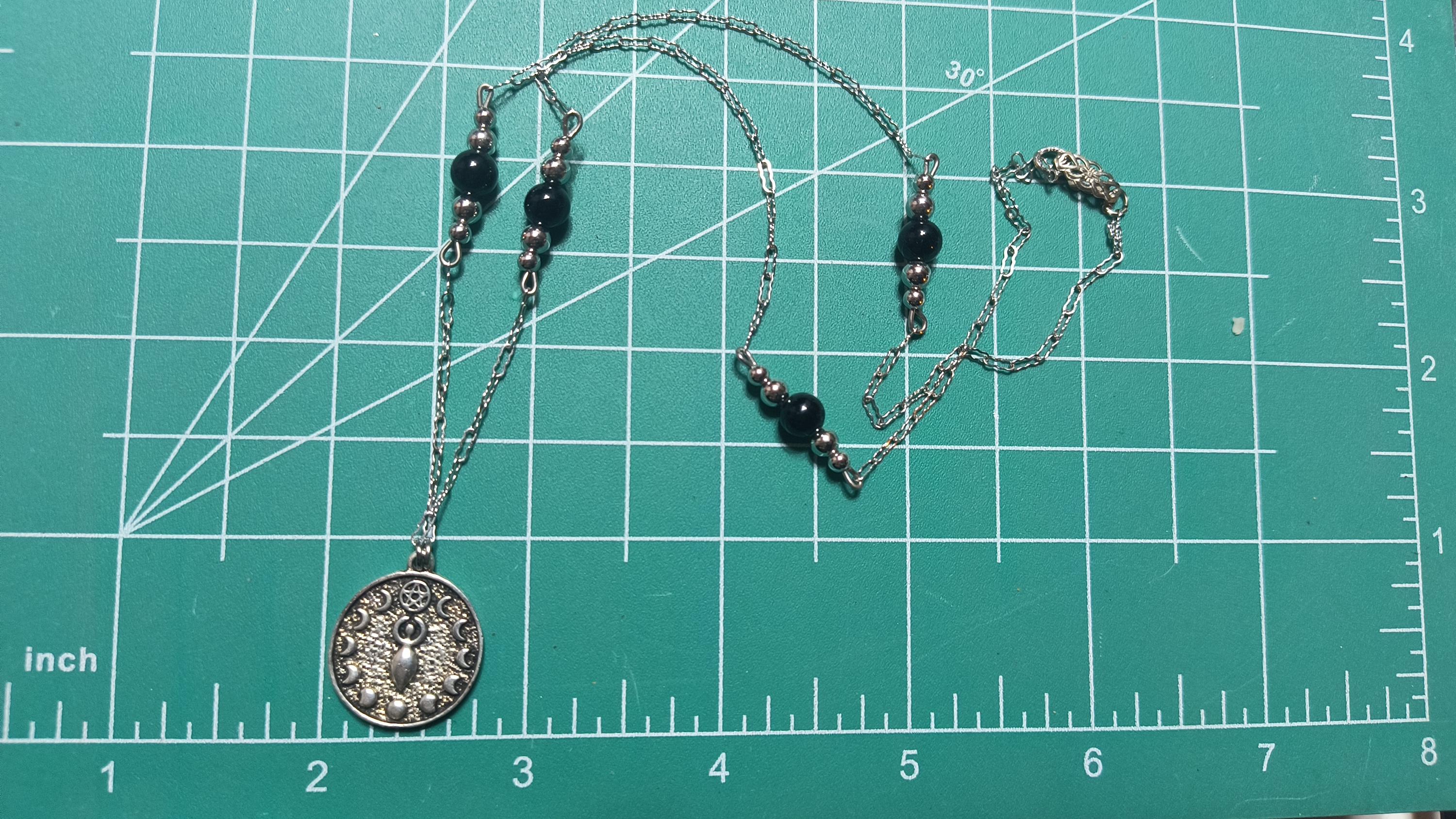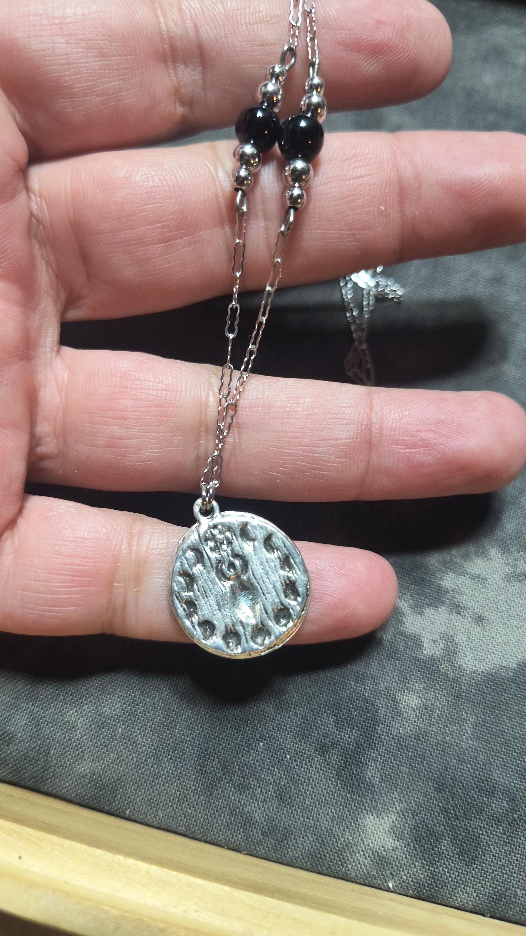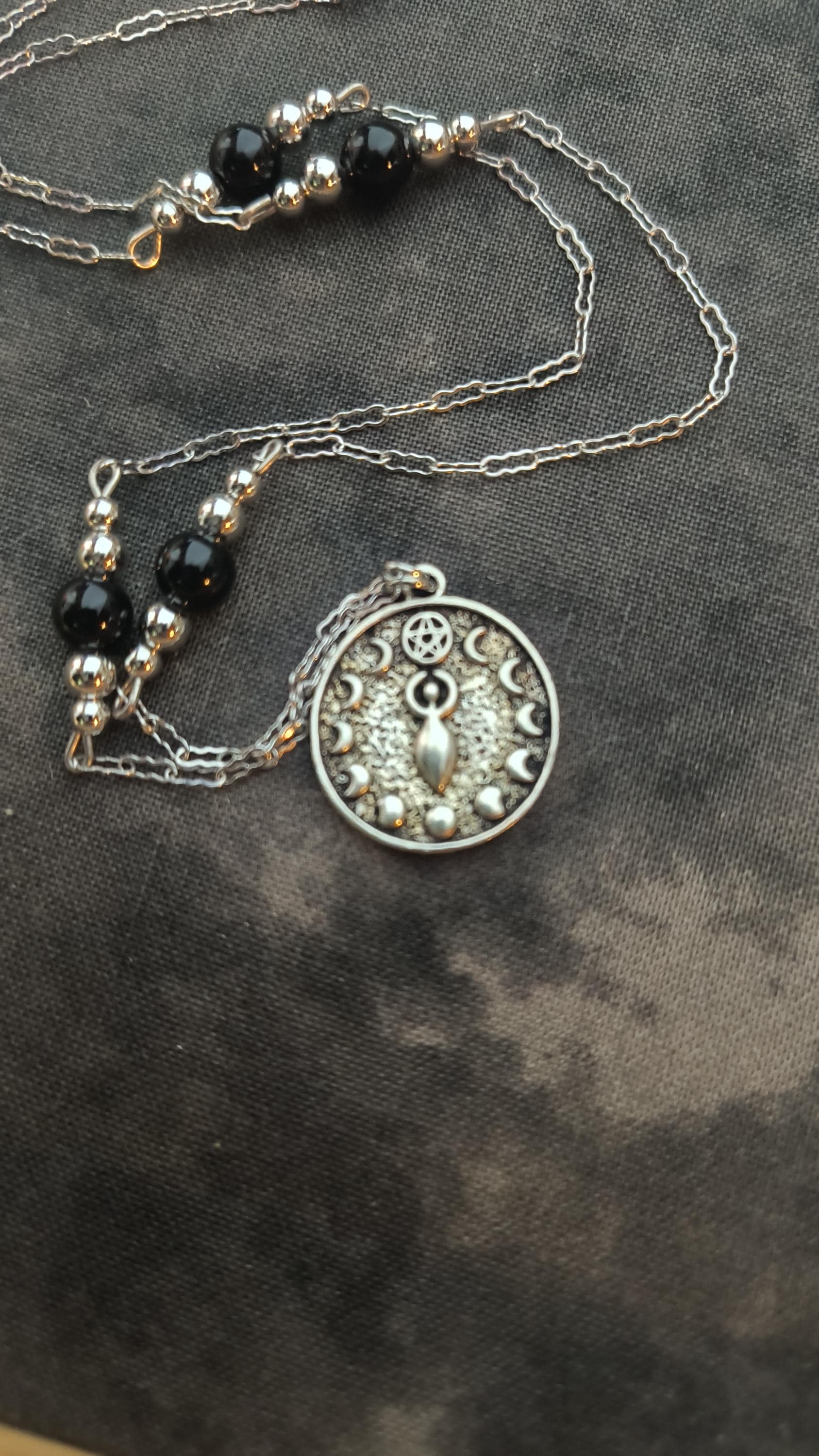 Handmade by Hillary here in our Maine studio, this one of a kind necklace features a pewter charm as the center piece. The charm depicts an ancient symbol of feminine divinity - a goddess with her arms raised over her head. Around her appear the phases of the moon, the full moon below her feet fueling her fire, the new moon above her head represented by a lovely pentacle.