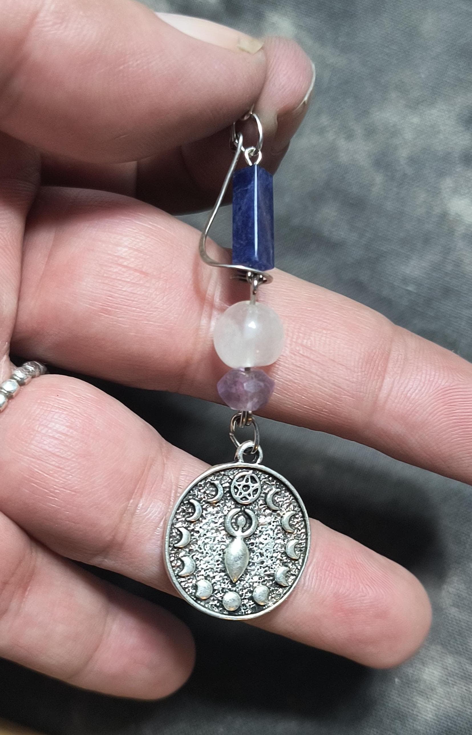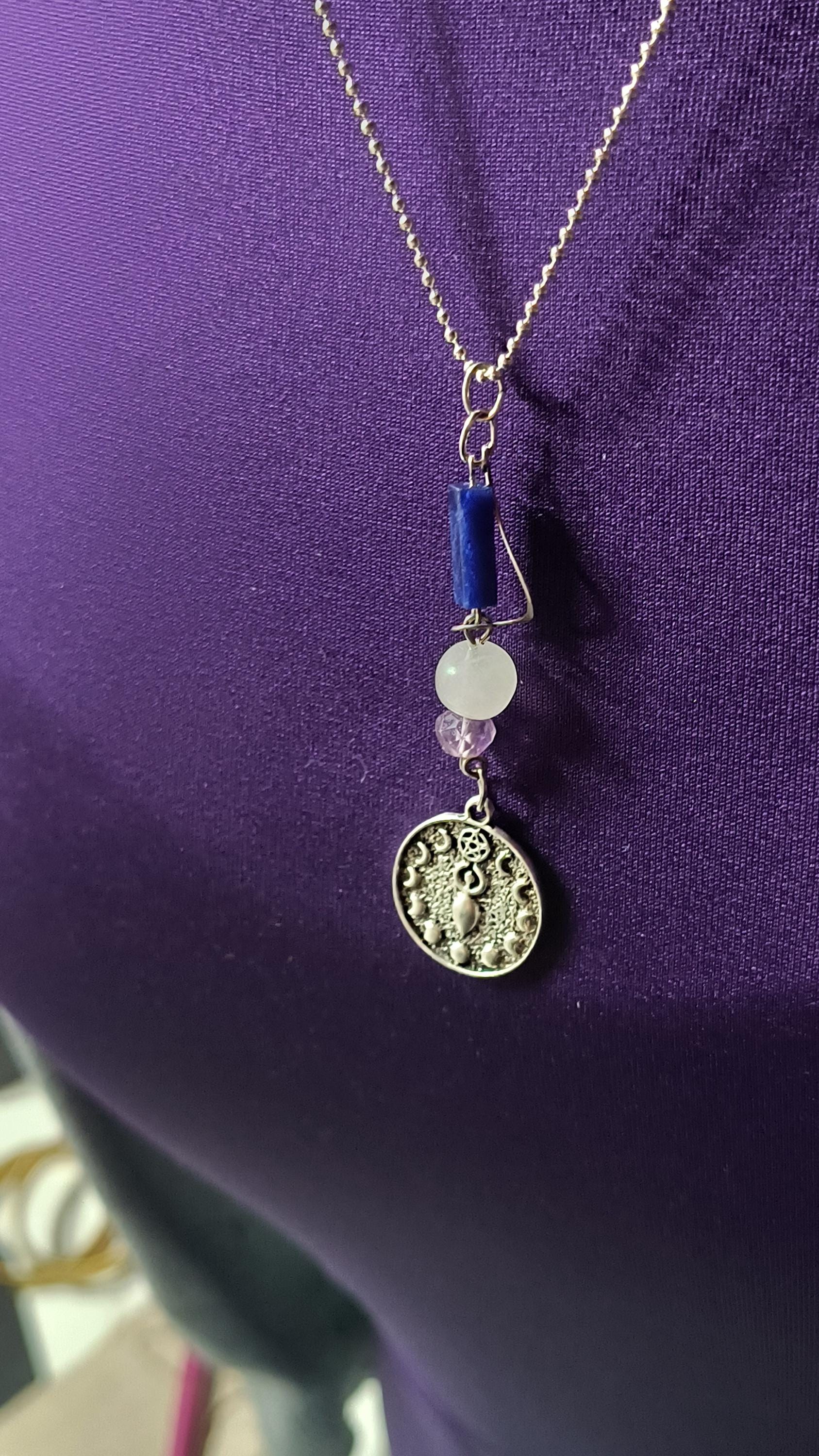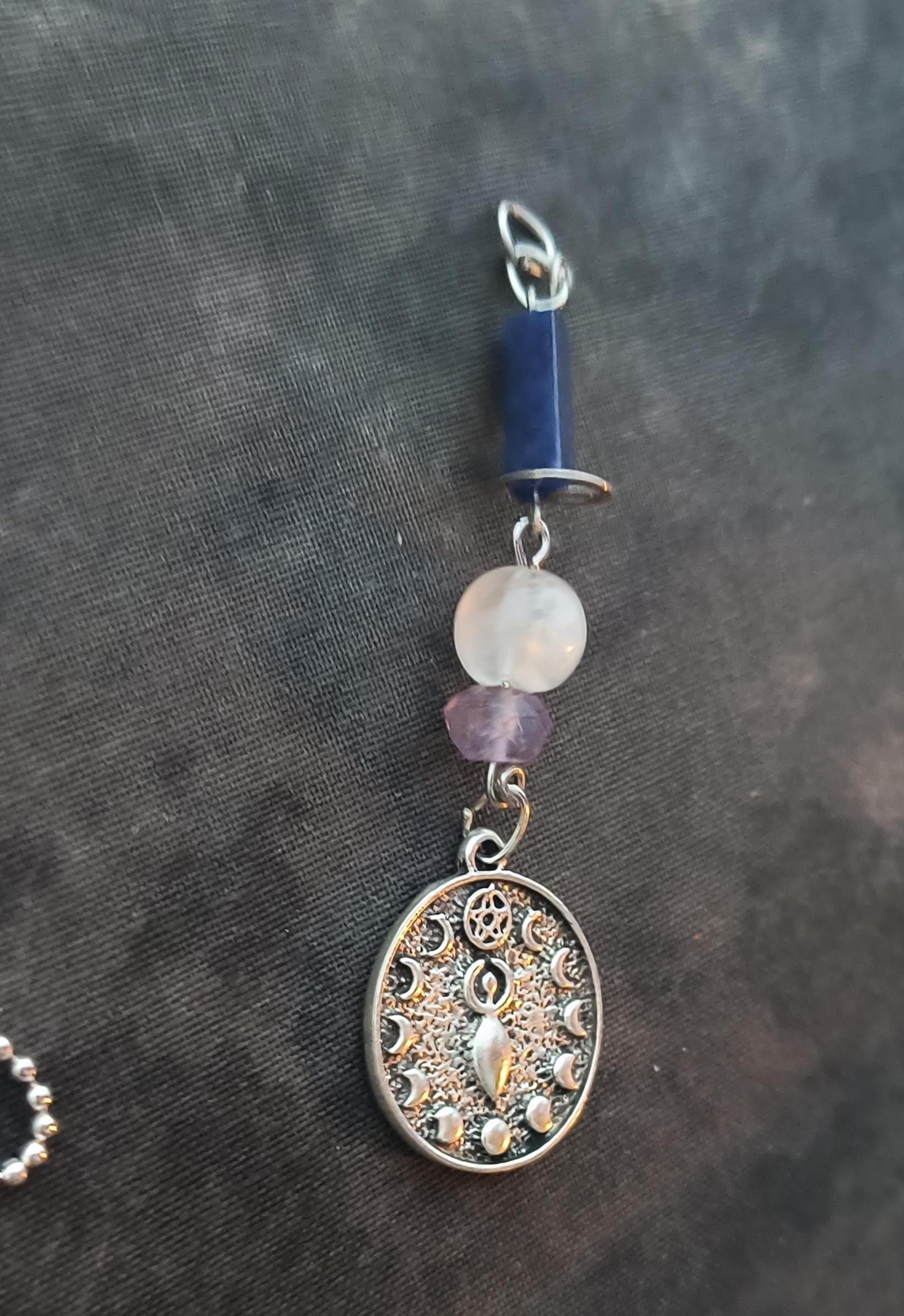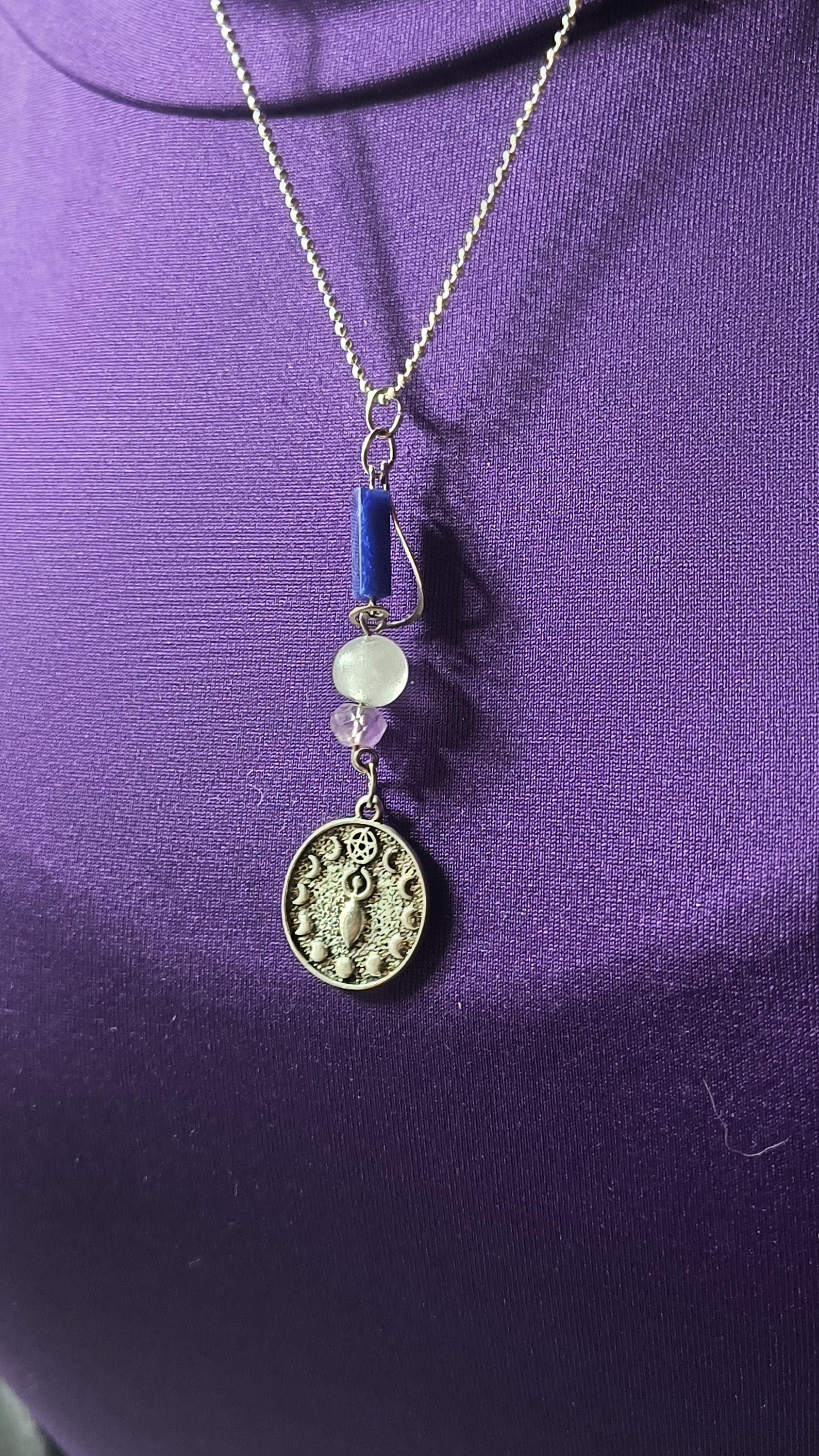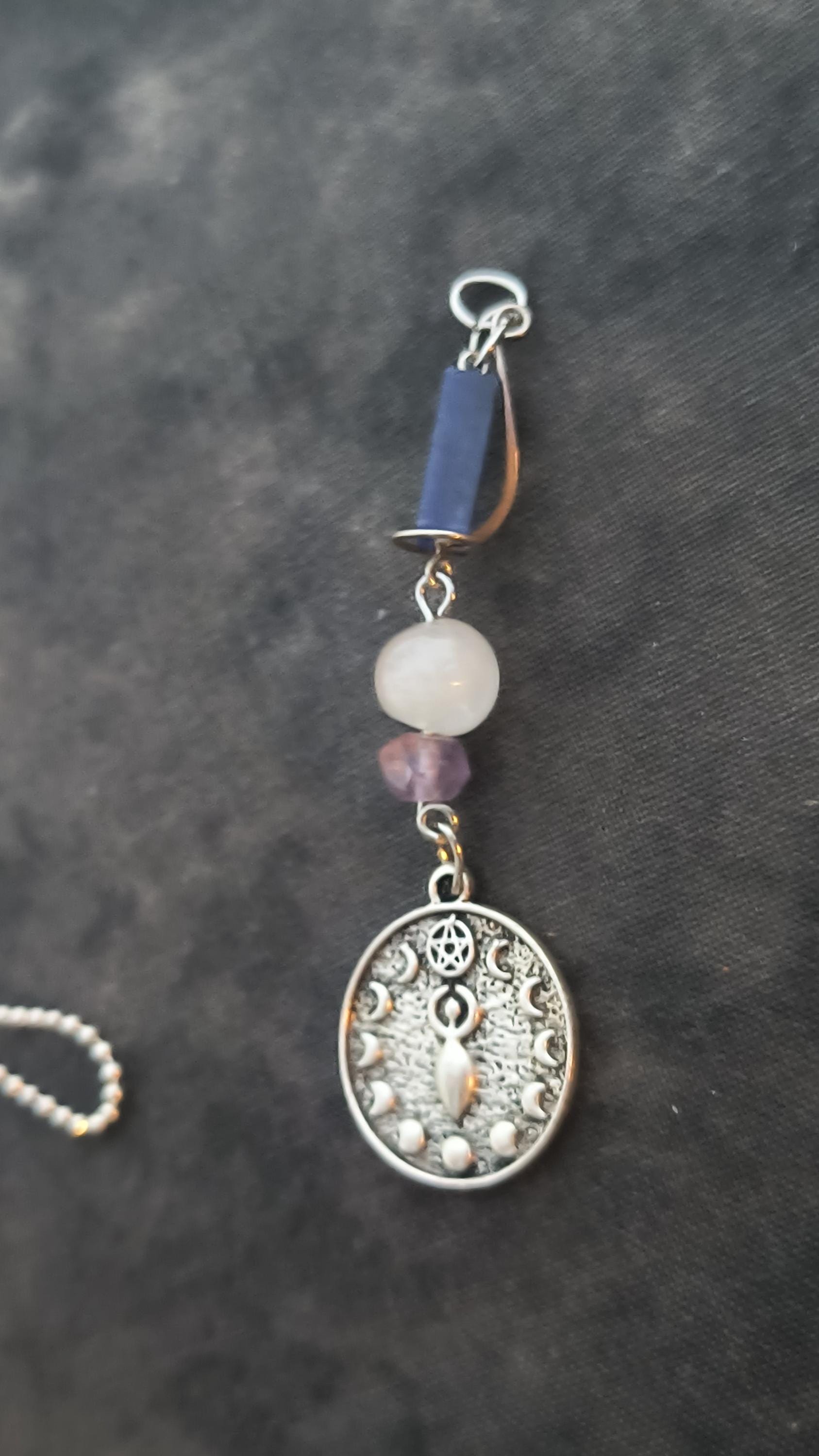 Handmade by Hillary here in our Maine studio, this one of a kind good luck charm features a pewter amulet as the center piece. The pewter disc depicts an ancient symbol of feminine divinity - a goddess with her arms raised over her head. Around her appear the phases of the moon, the full moon below her feet fueling her fire, the new moon above her head represented by a lovely pentacle.