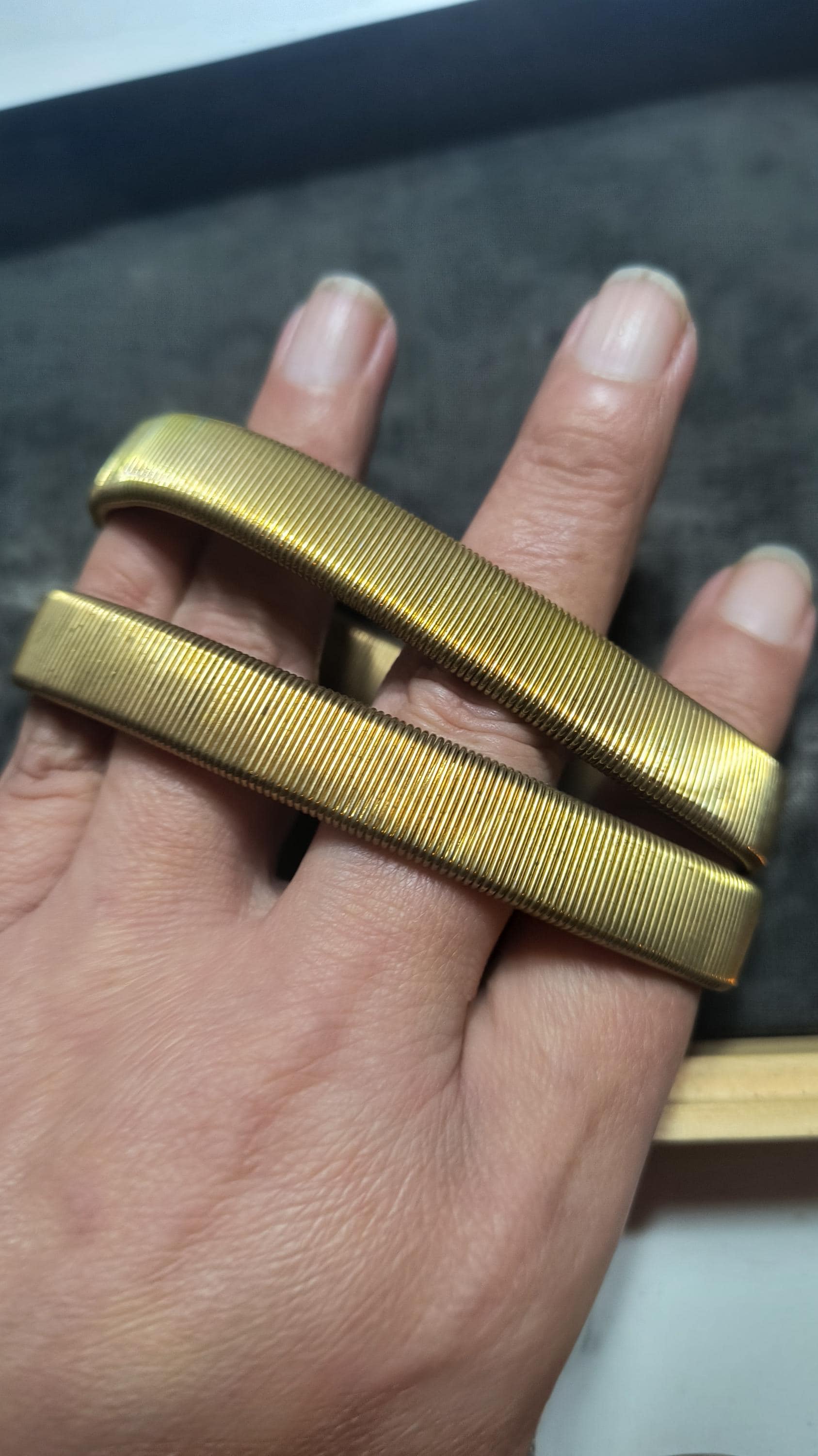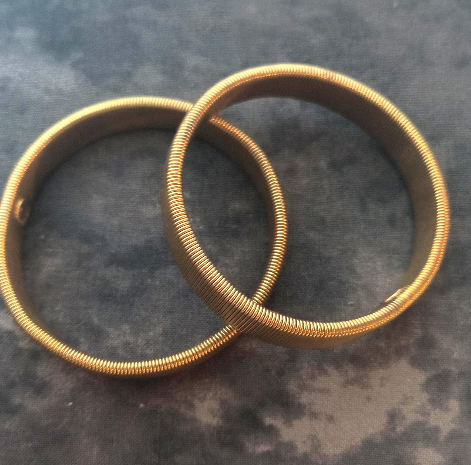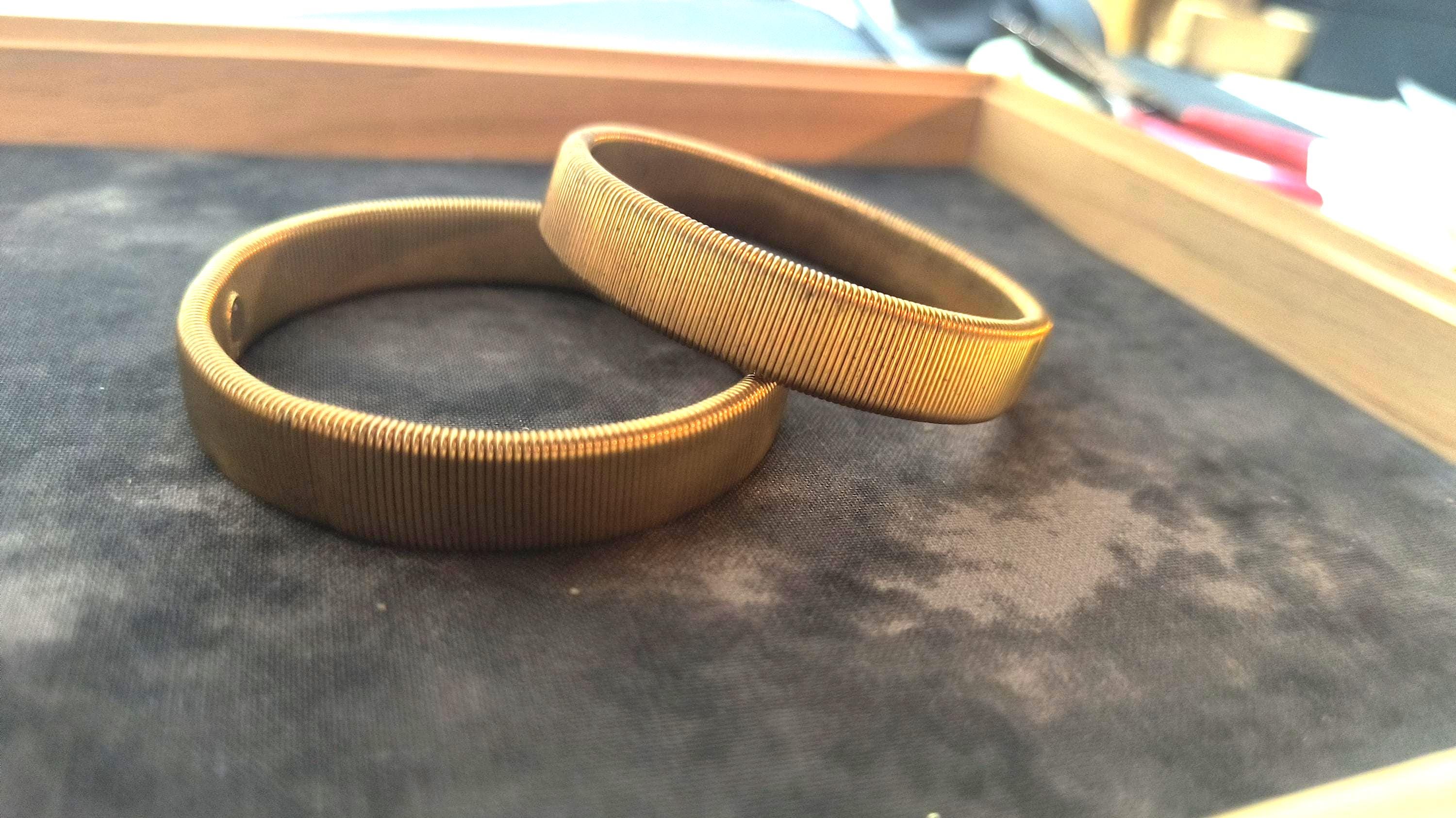 Someone start making these again, please? Timeless arm garters need to make a comeback! These are from the 40s or 50s, and they are meant to be worn by a man but work just as well for a blouse, trust me! These are clean, stretchy brass that imitate the way that elastic works - they slide over the wrist, over the sleeves of your shirt, and then can be used to hold sleeves in place anywhere on the arm!