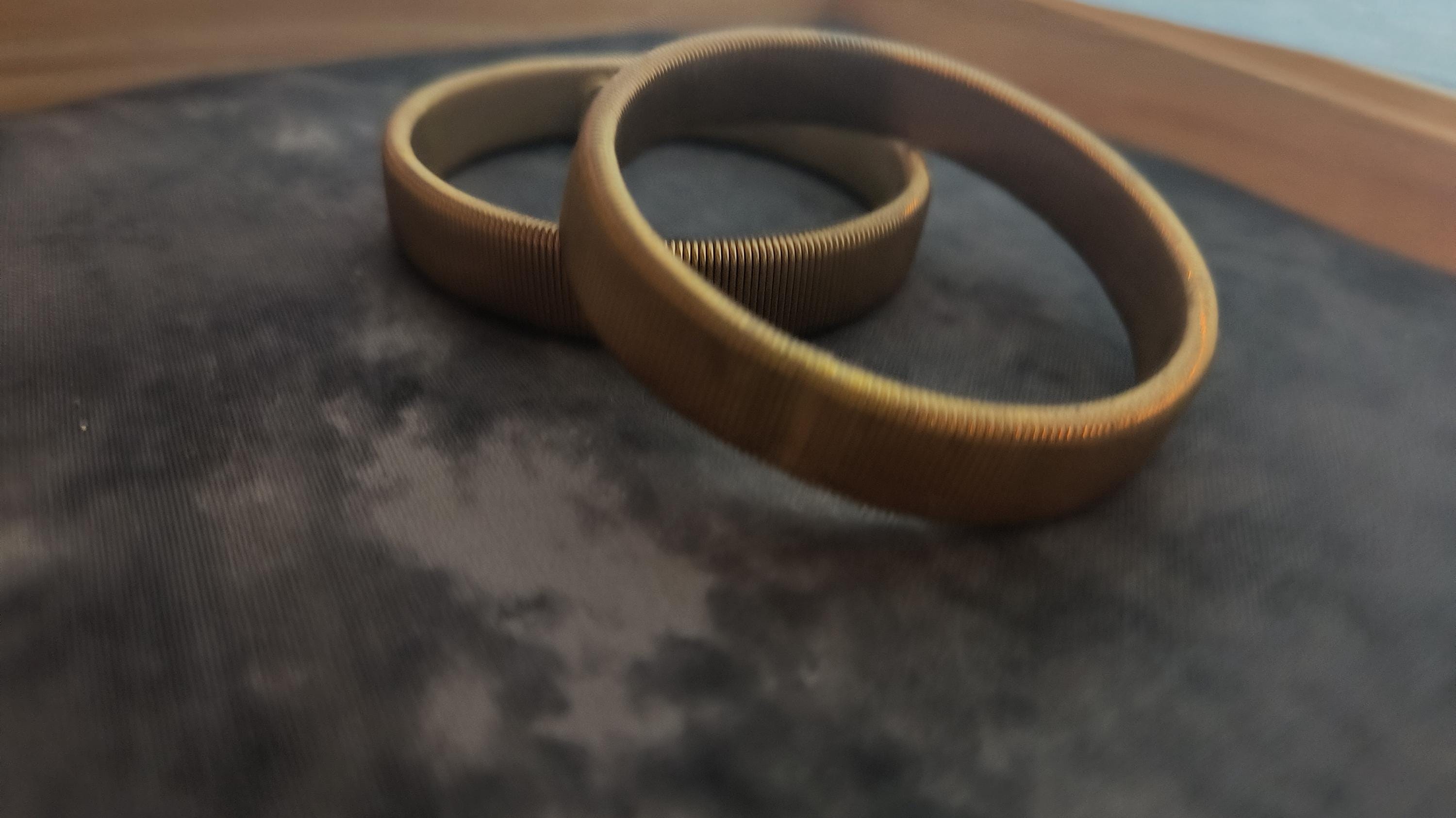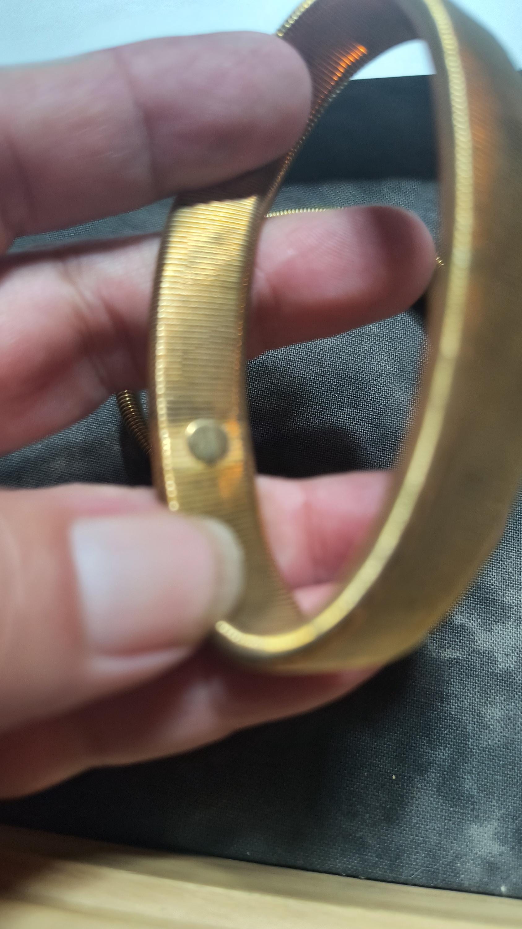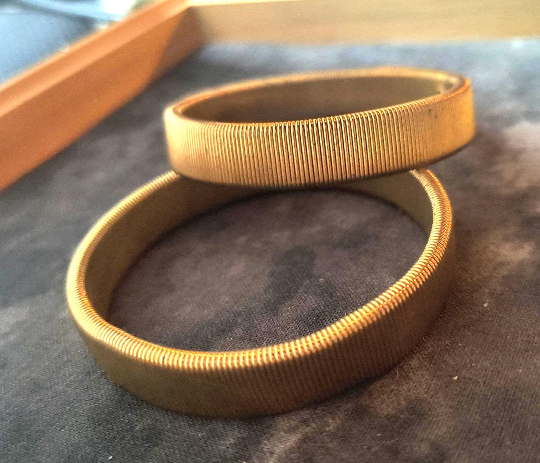 Someone start making these again, please? Timeless arm garters need to make a comeback! These are from the 40s or 50s, and they are meant to be worn by a man but work just as well for a blouse, trust me! These are clean, stretchy brass that imitate the way that elastic works - they slide over the wrist, over the sleeves of your shirt, and then can be used to hold sleeves in place anywhere on the arm!