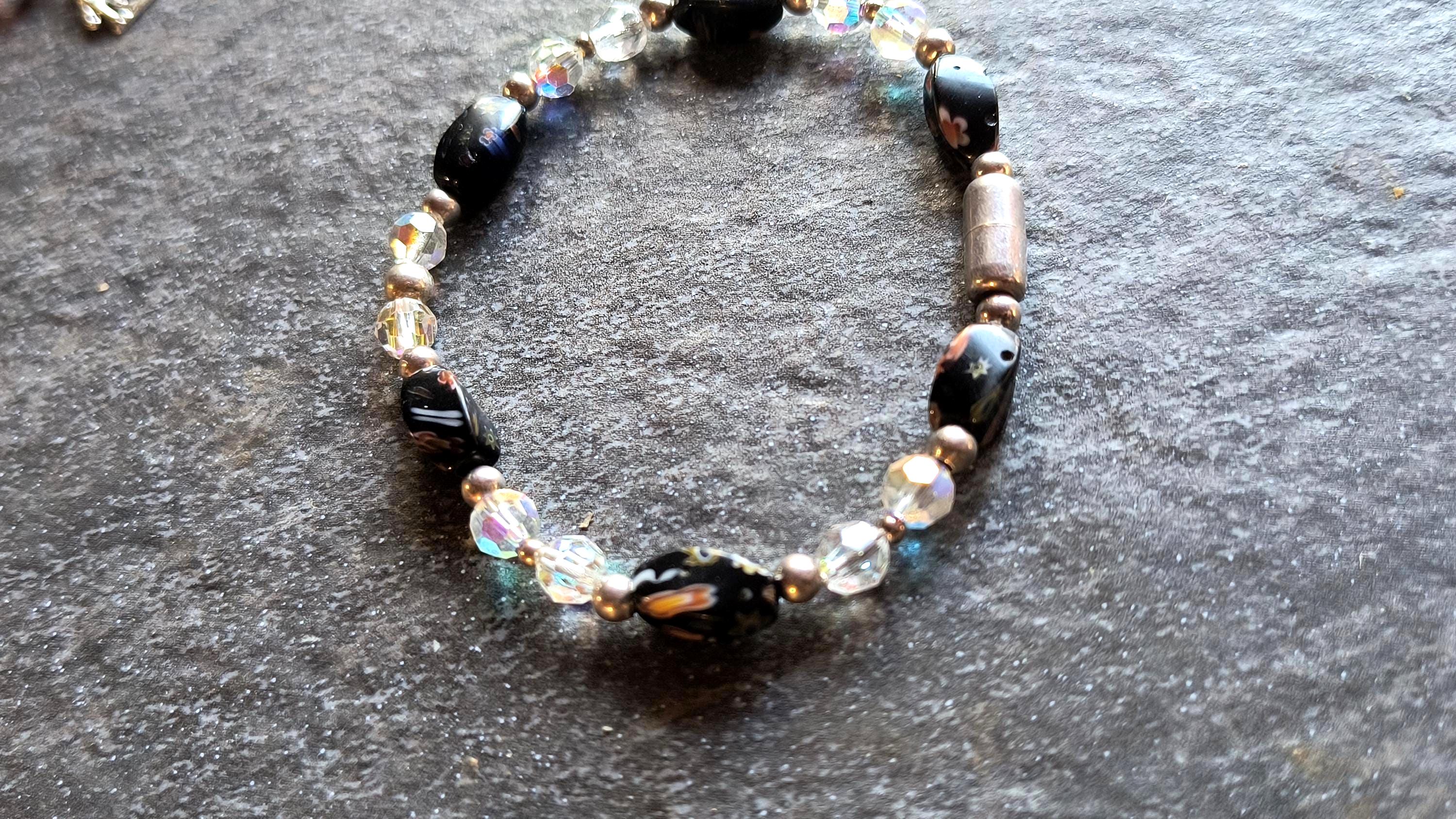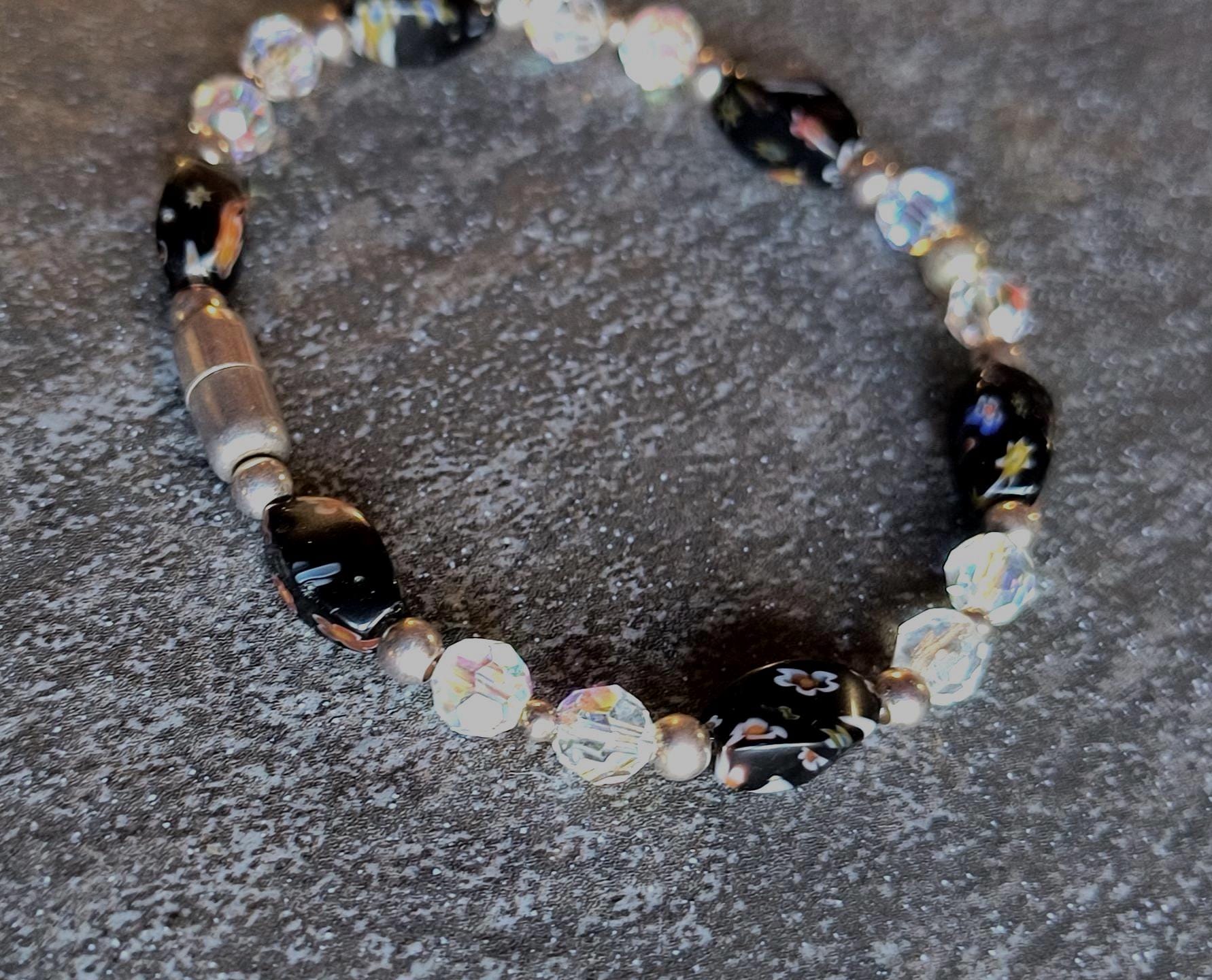Here's a great piece if you're looking for a day to day bracelet that goes with anything! Black beads with unique florals on each facet. These are handmade, lapwork glass beads, and they've been combined with Austrian Crystal beads that have an Aurora Borealis shine! The metallic magenta clasp makes this super easy to wear!