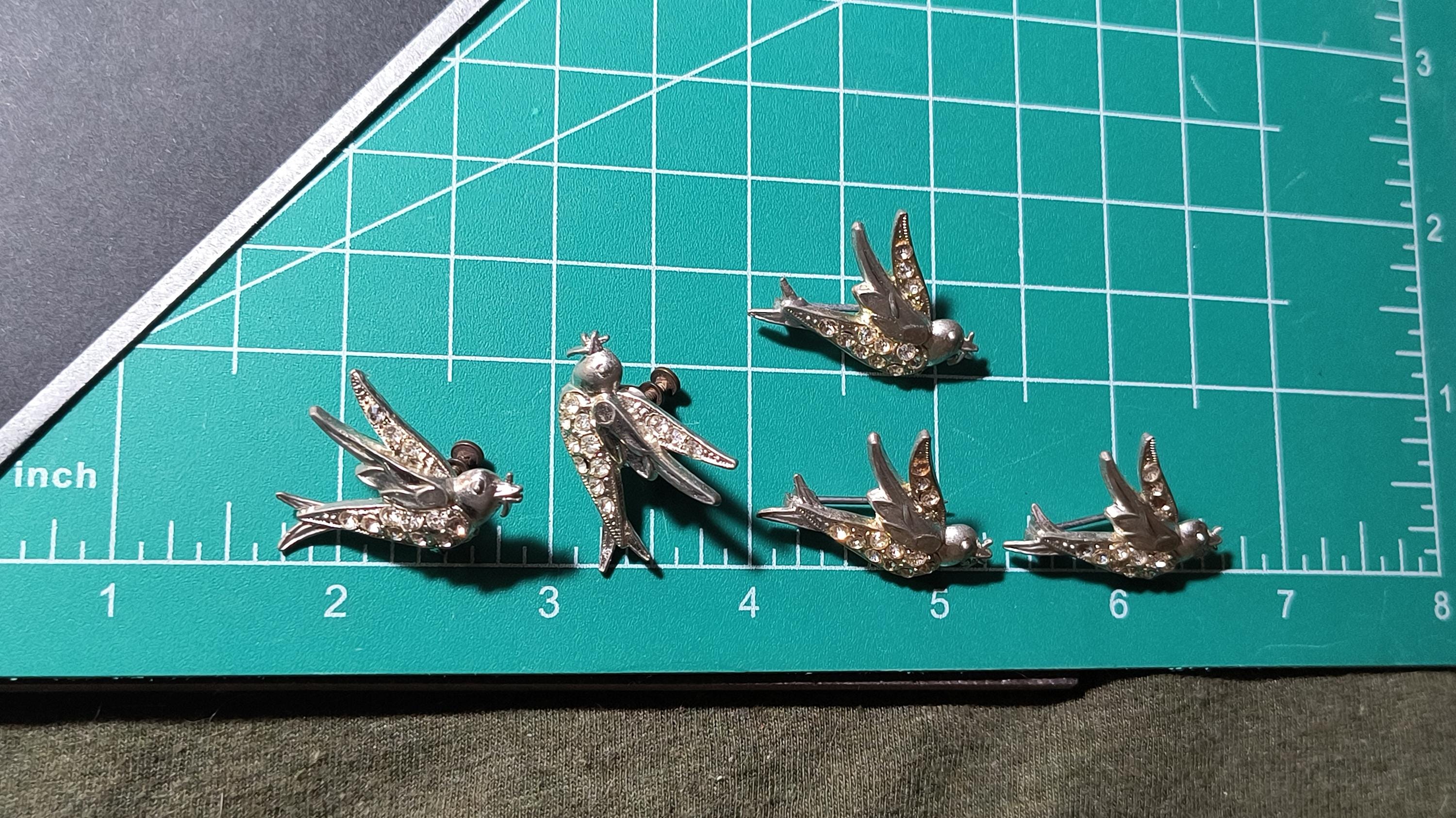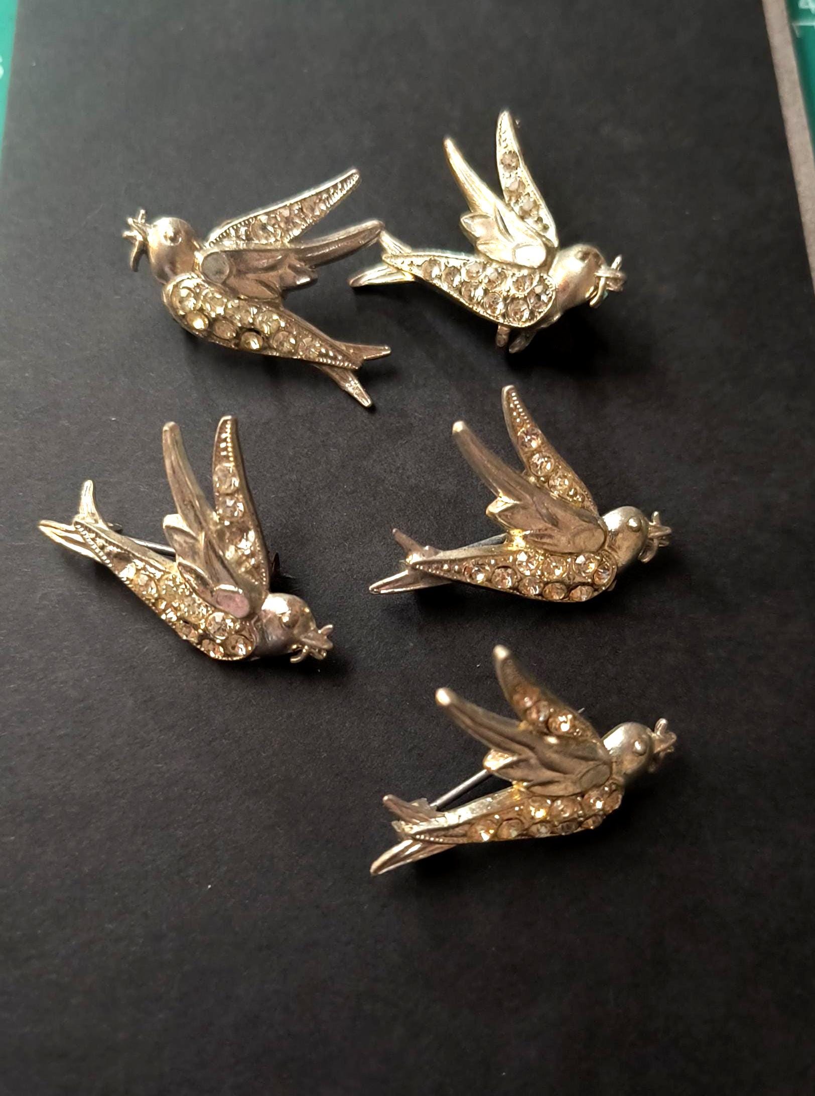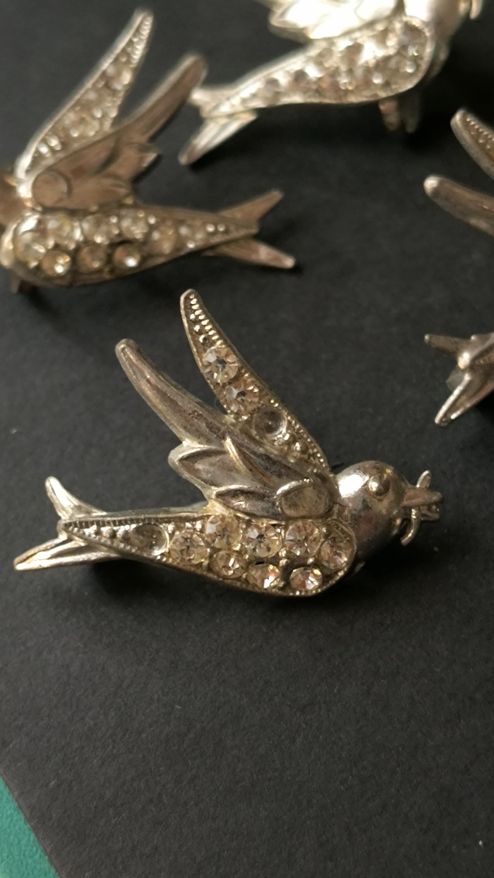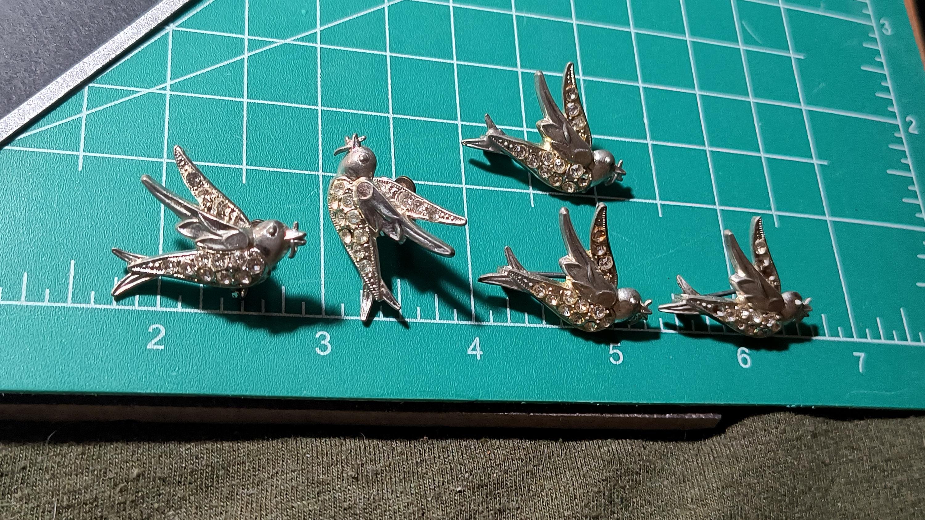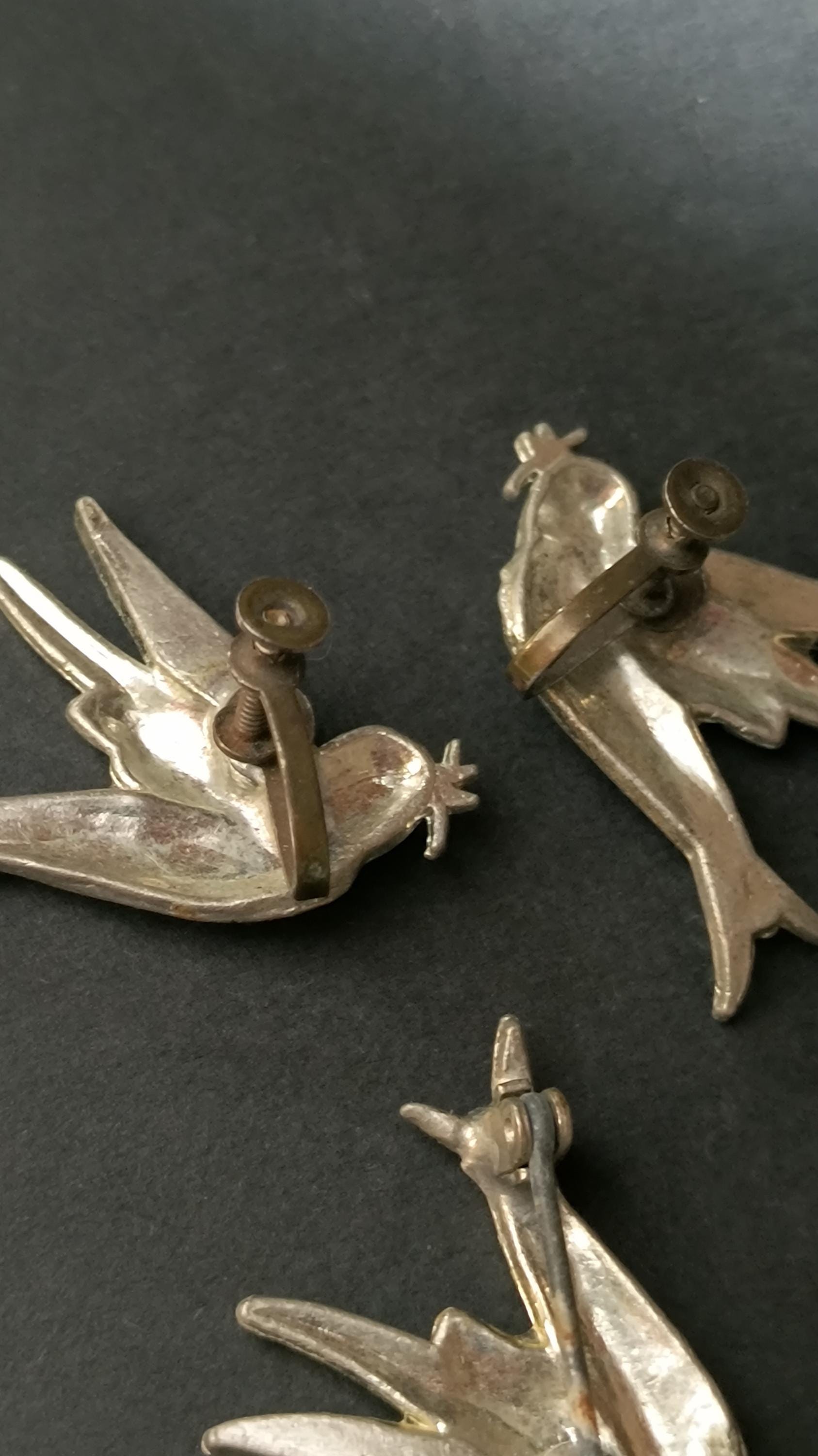 This set is wonderful, a true bit of history from the 1940s or early 1950s! There are three pins here, meant to be worn scattered across a dress or the lapel of a jacket. The birds are swallows, popular during the Victorian period as symbols of travel and freedom - and before that, across cultures, for centuries.