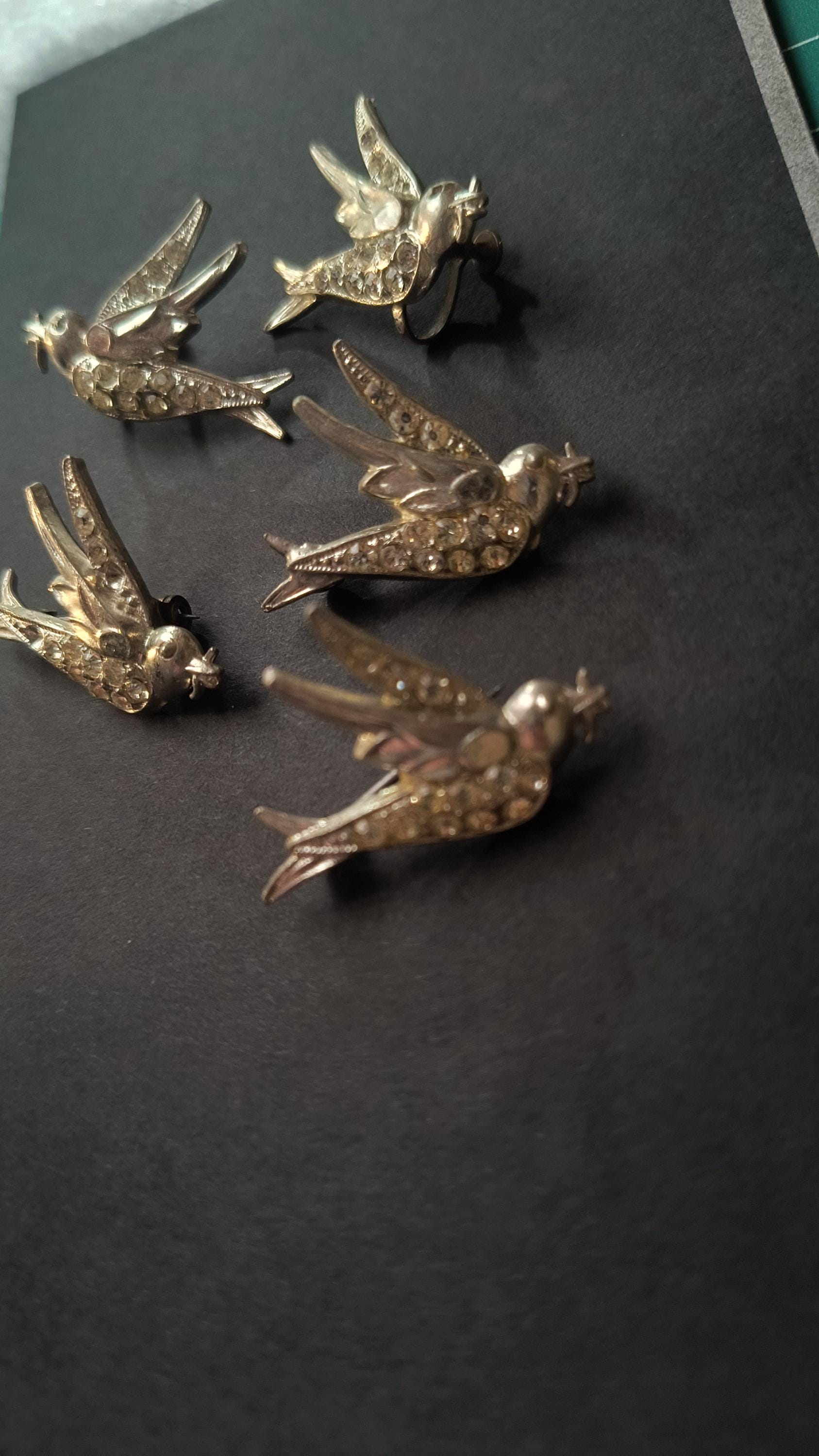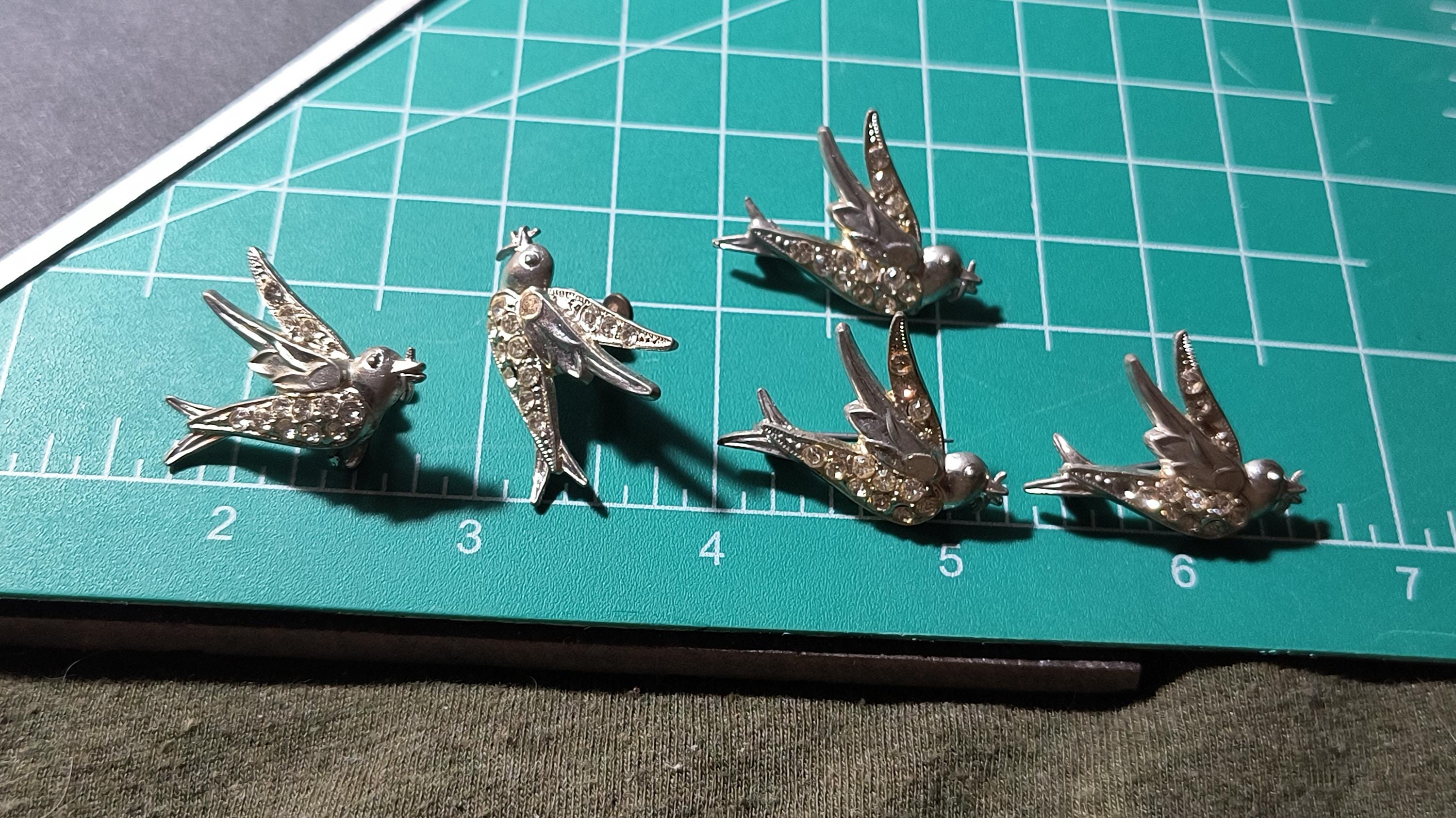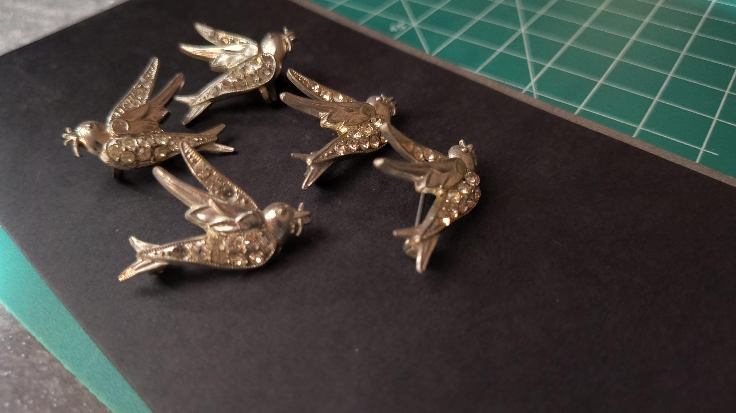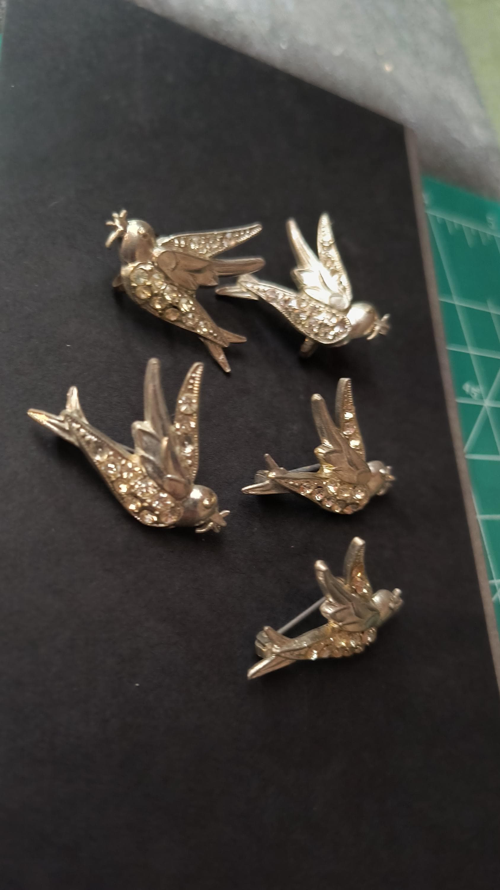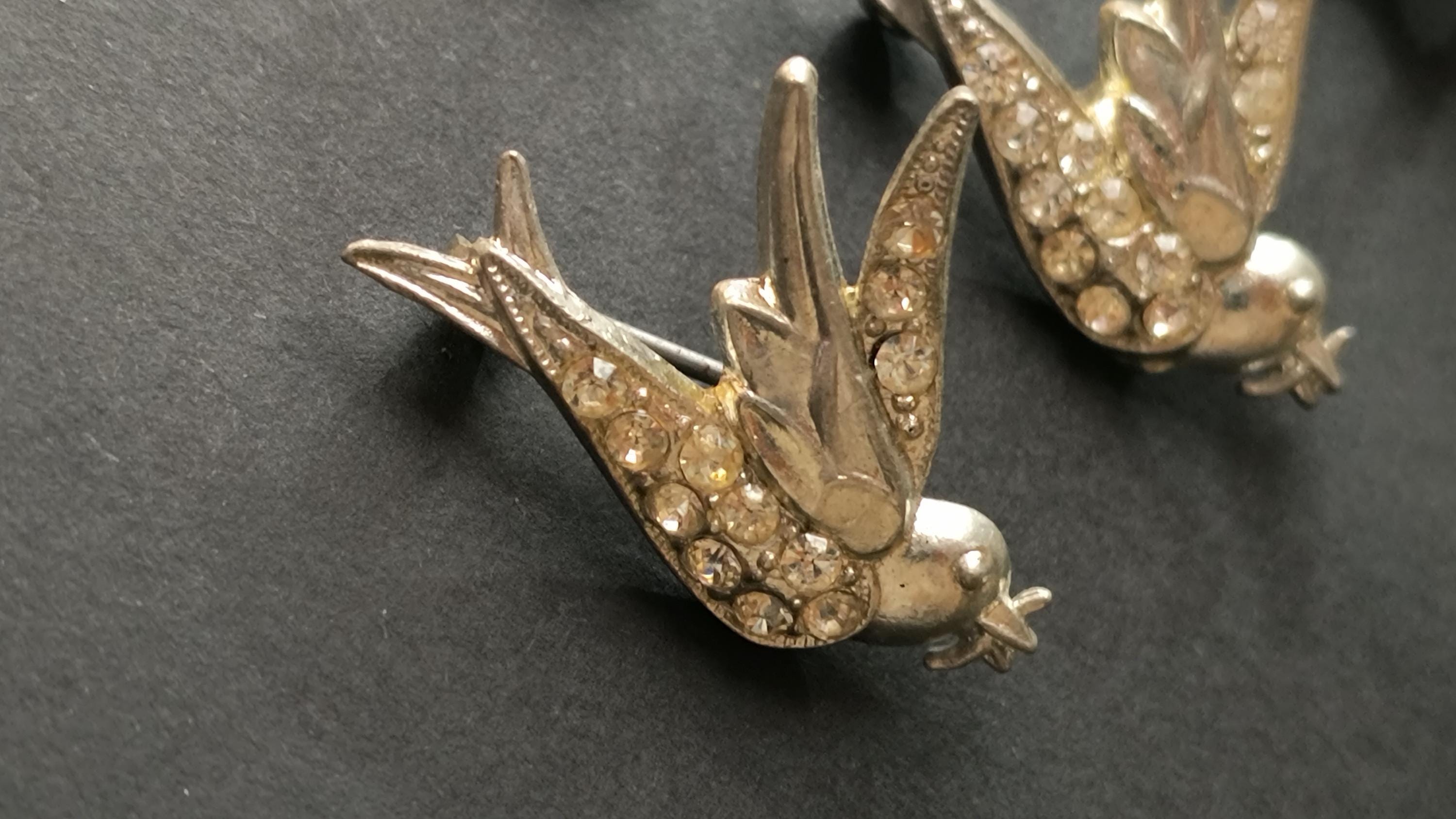 This set is wonderful, a true bit of history from the 1940s or early 1950s! There are three pins here, meant to be worn scattered across a dress or the lapel of a jacket. The birds are swallows, popular during the Victorian period as symbols of travel and freedom - and before that, across cultures, for centuries.