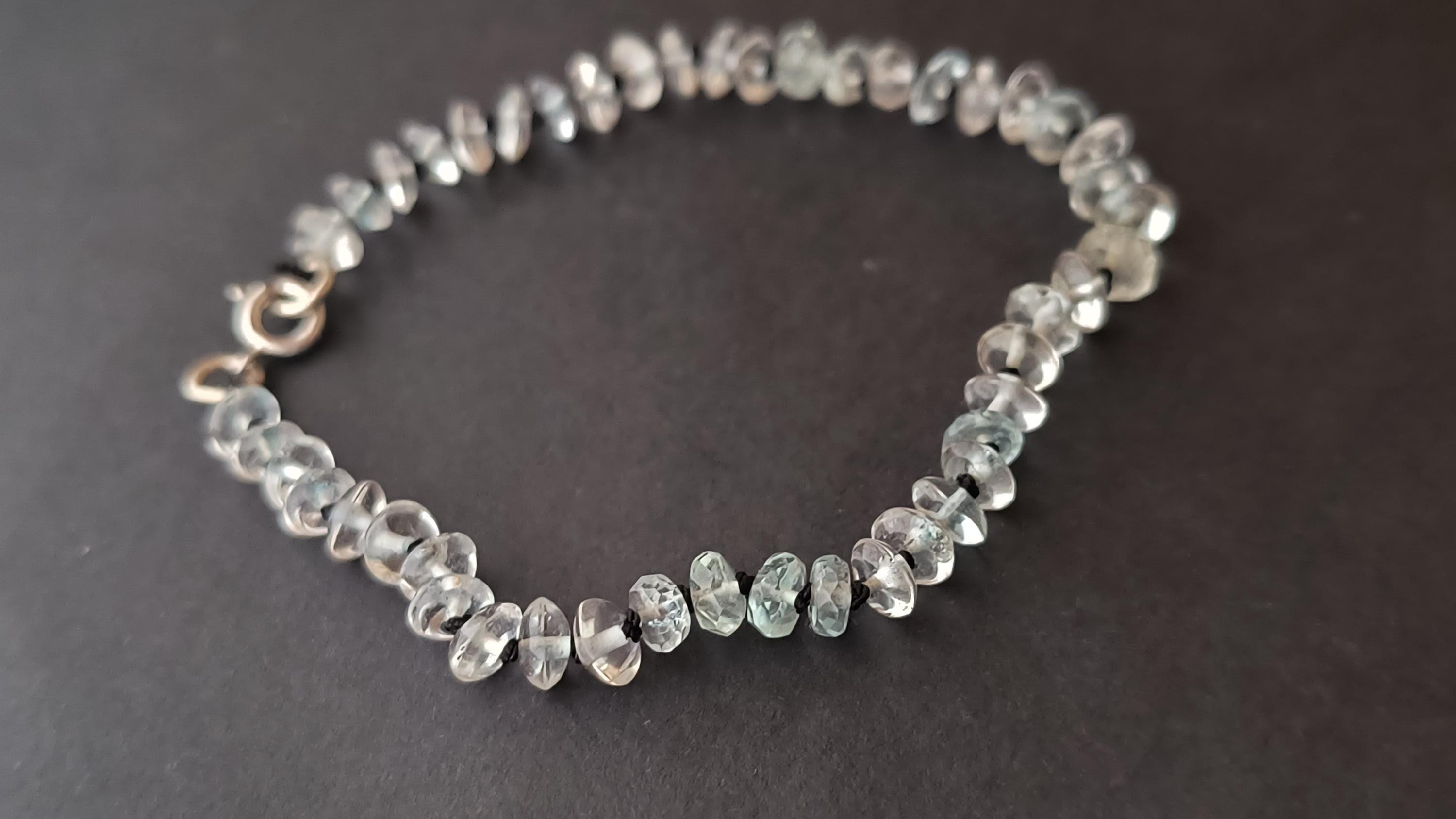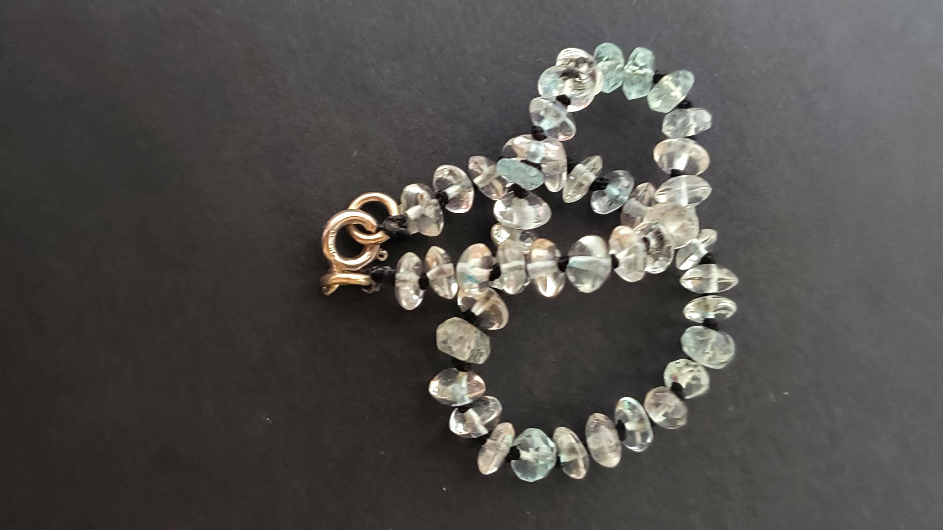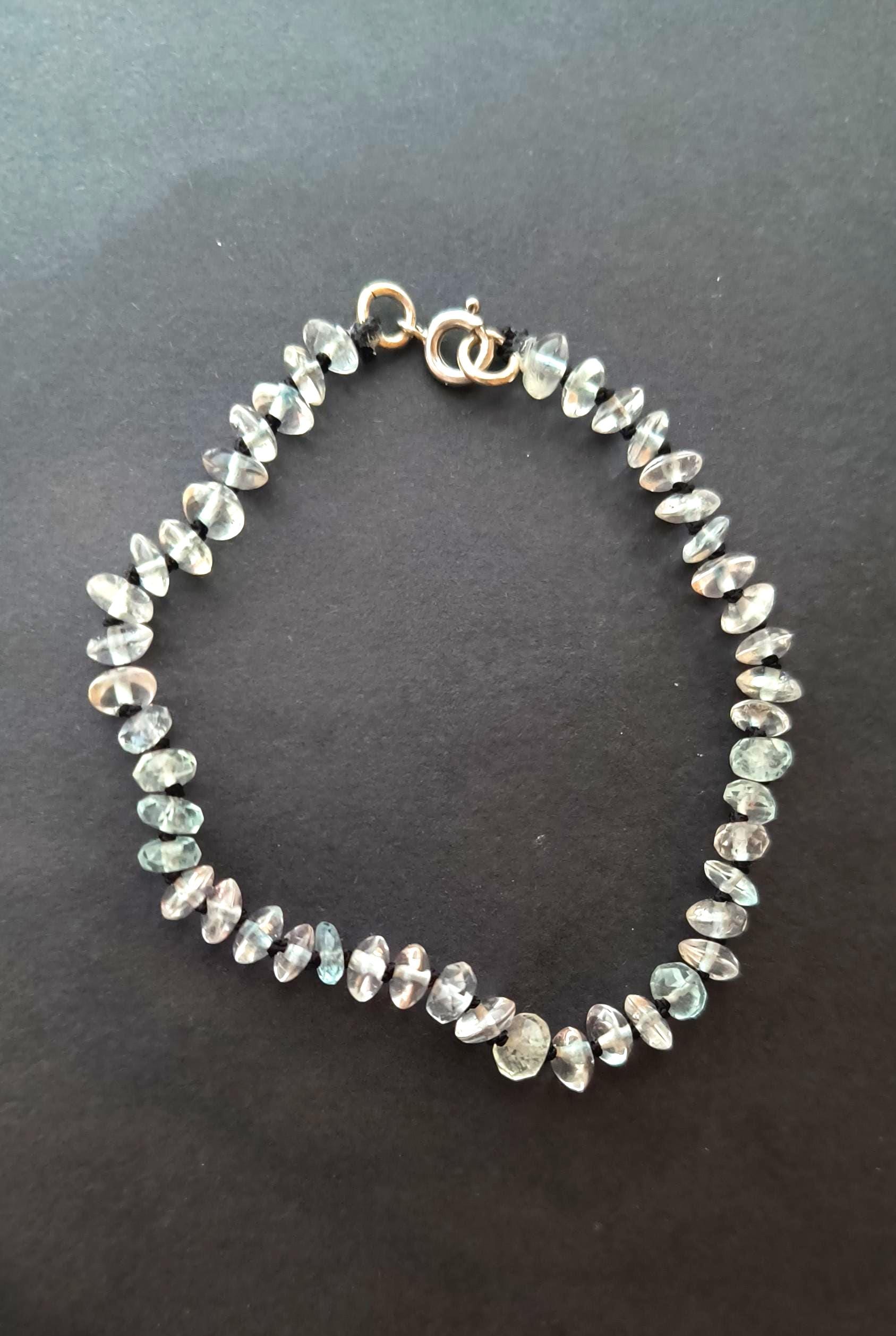 Knotting beads and pearls is an ancient art, one that both gives the finished jewelry piece a sense of grandeur and showcases each individual bead! These particular beads are a lovely mix of blues - perfectly polished saucers of blue topaz mixed with glittering, icy aquarines that have a glittery cut! This bracelet is Knotted on navy blue silk, and finished with a Sterling silver clasp. Currently Knotted at 6.75 inches, this will stretch a bit - or can easily be lengthened upon request.