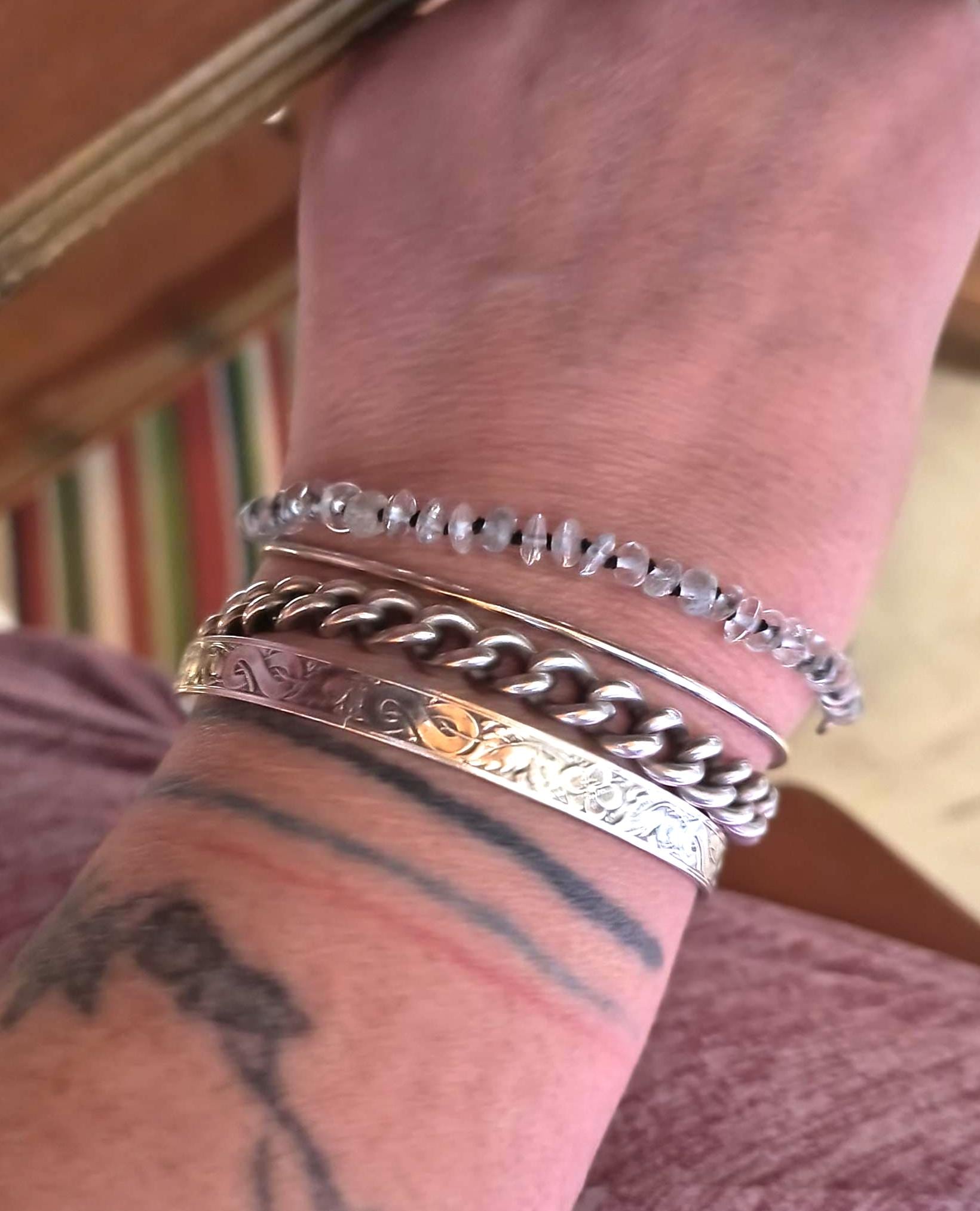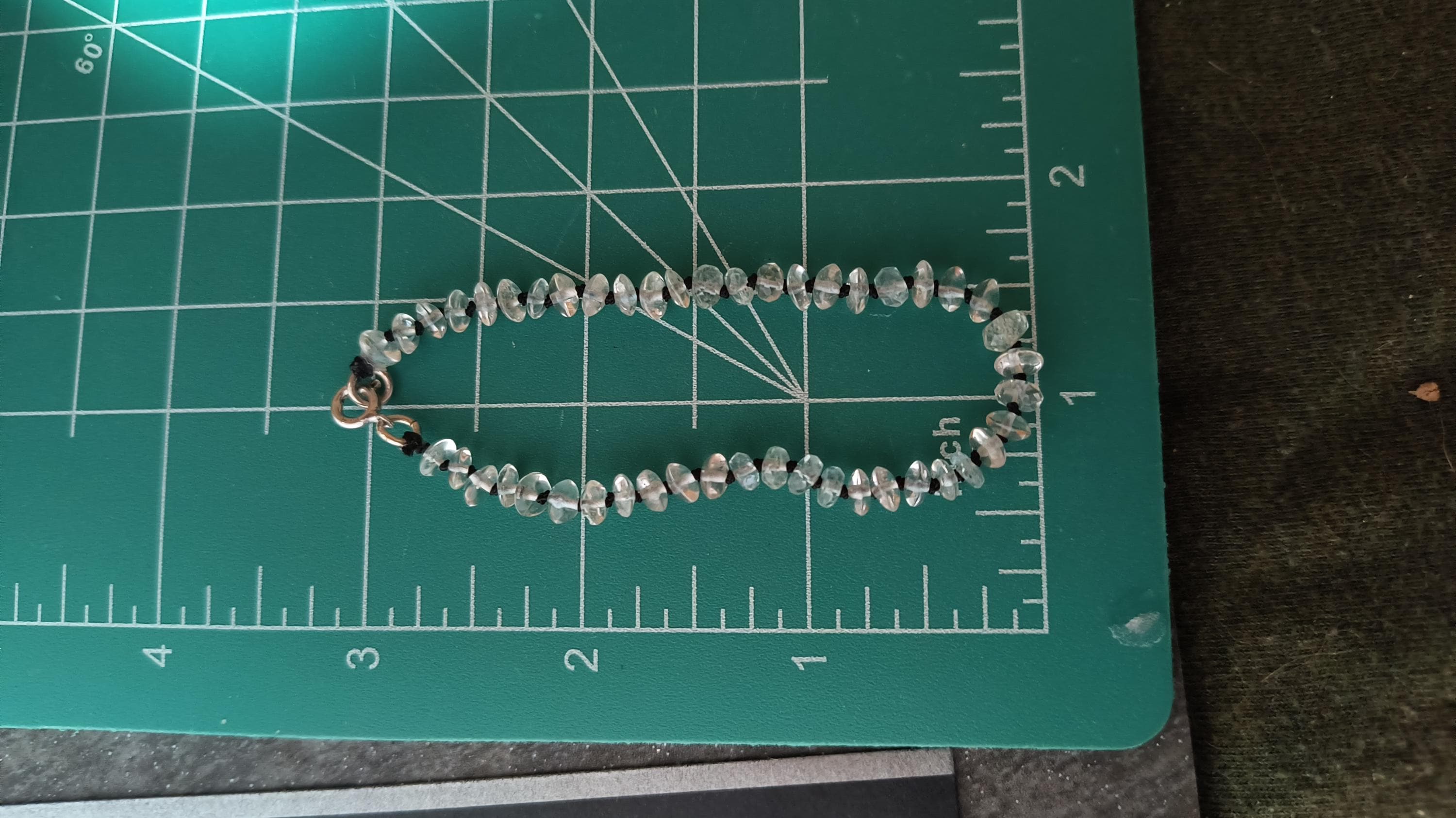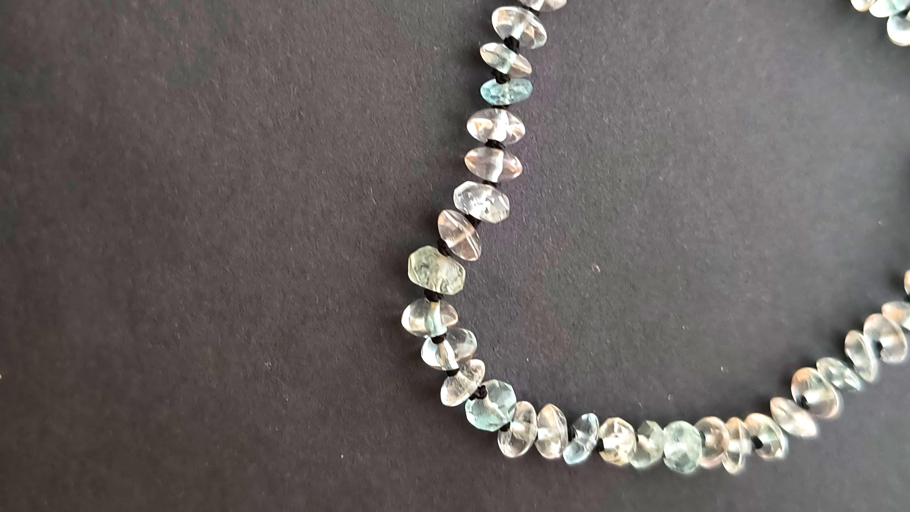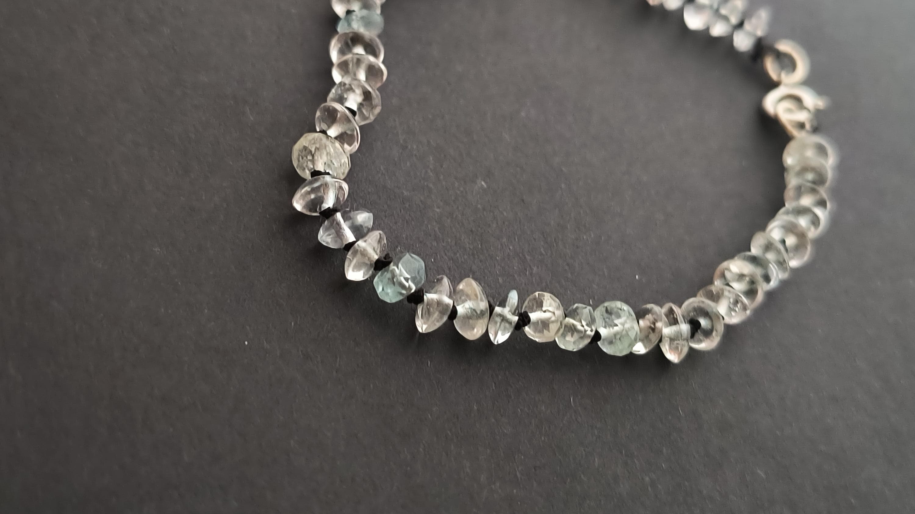 Knotting beads and pearls is an ancient art, one that both gives the finished jewelry piece a sense of grandeur and showcases each individual bead! These particular beads are a lovely mix of blues - perfectly polished saucers of blue topaz mixed with glittering, icy aquarines that have a glittery cut! This bracelet is Knotted on navy blue silk, and finished with a Sterling silver clasp. Currently Knotted at 6.75 inches, this will stretch a bit - or can easily be lengthened upon request.