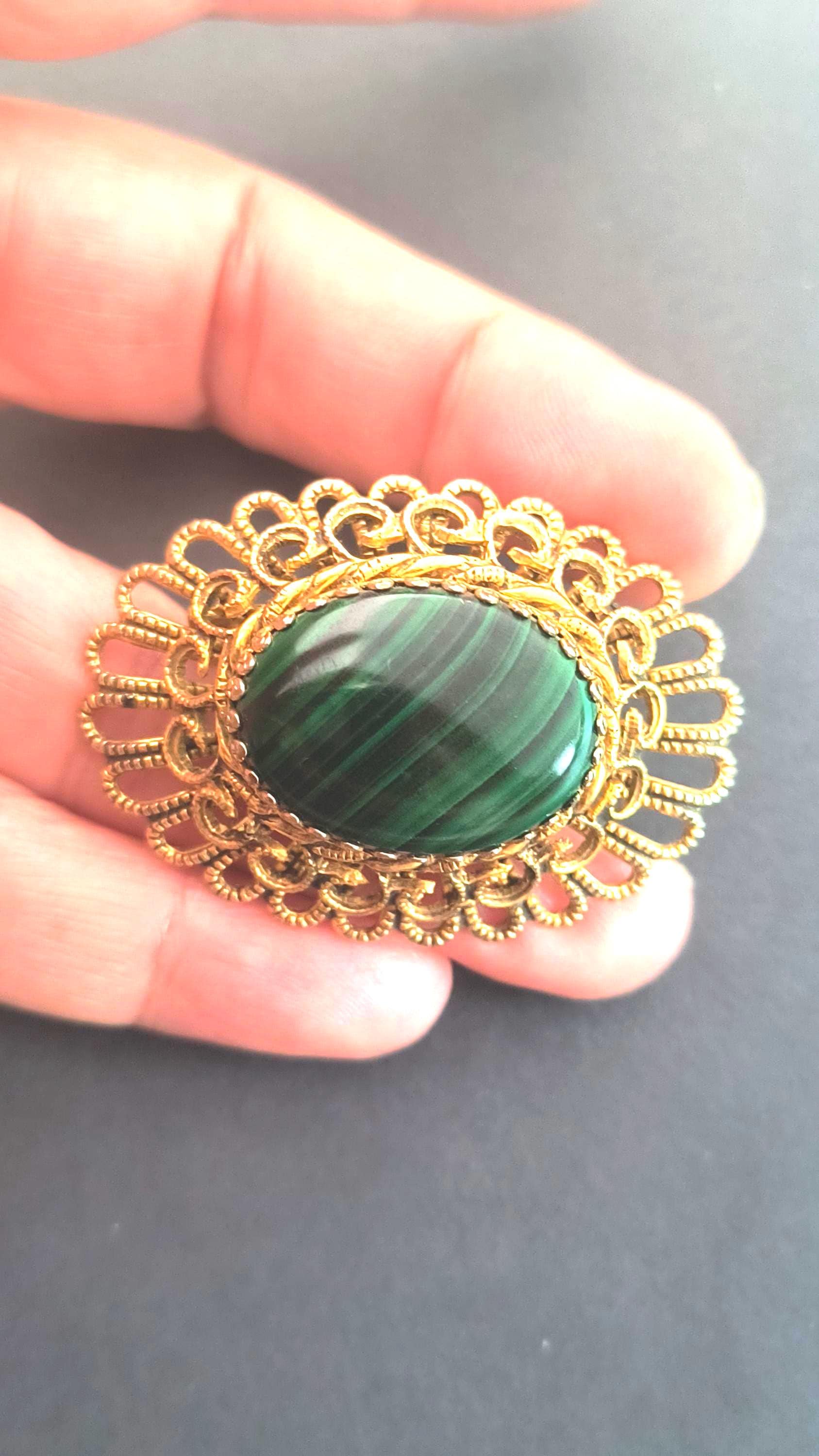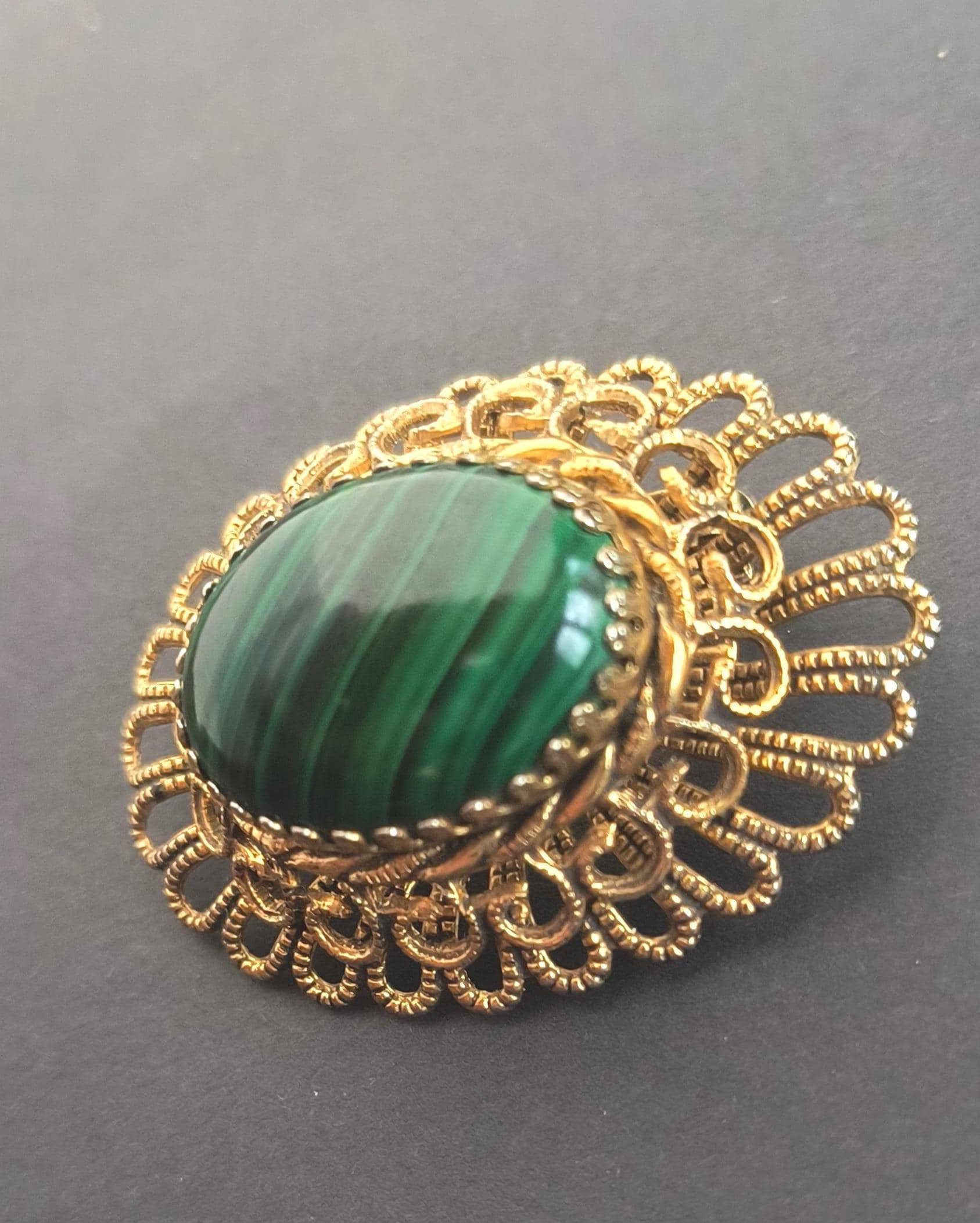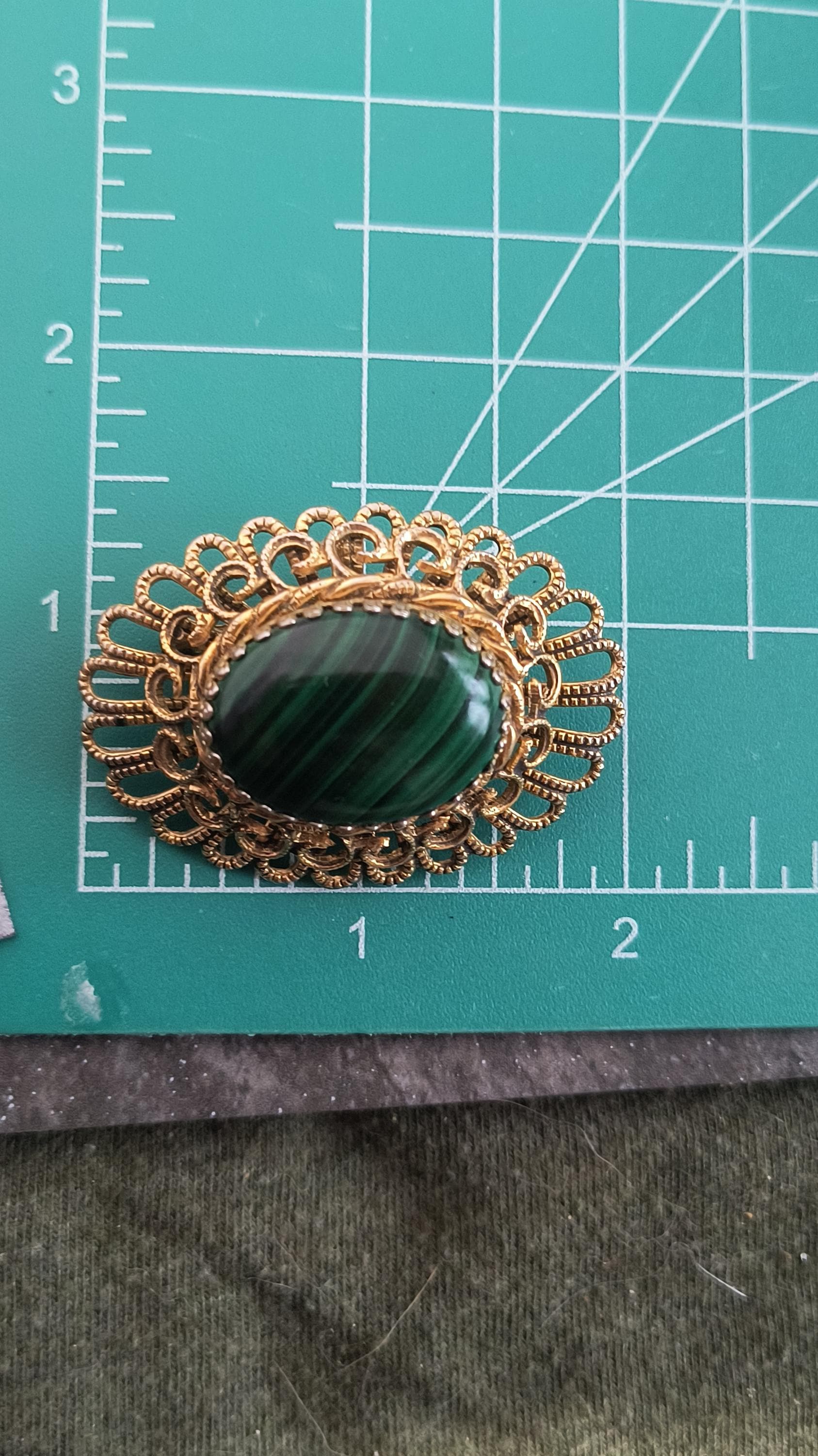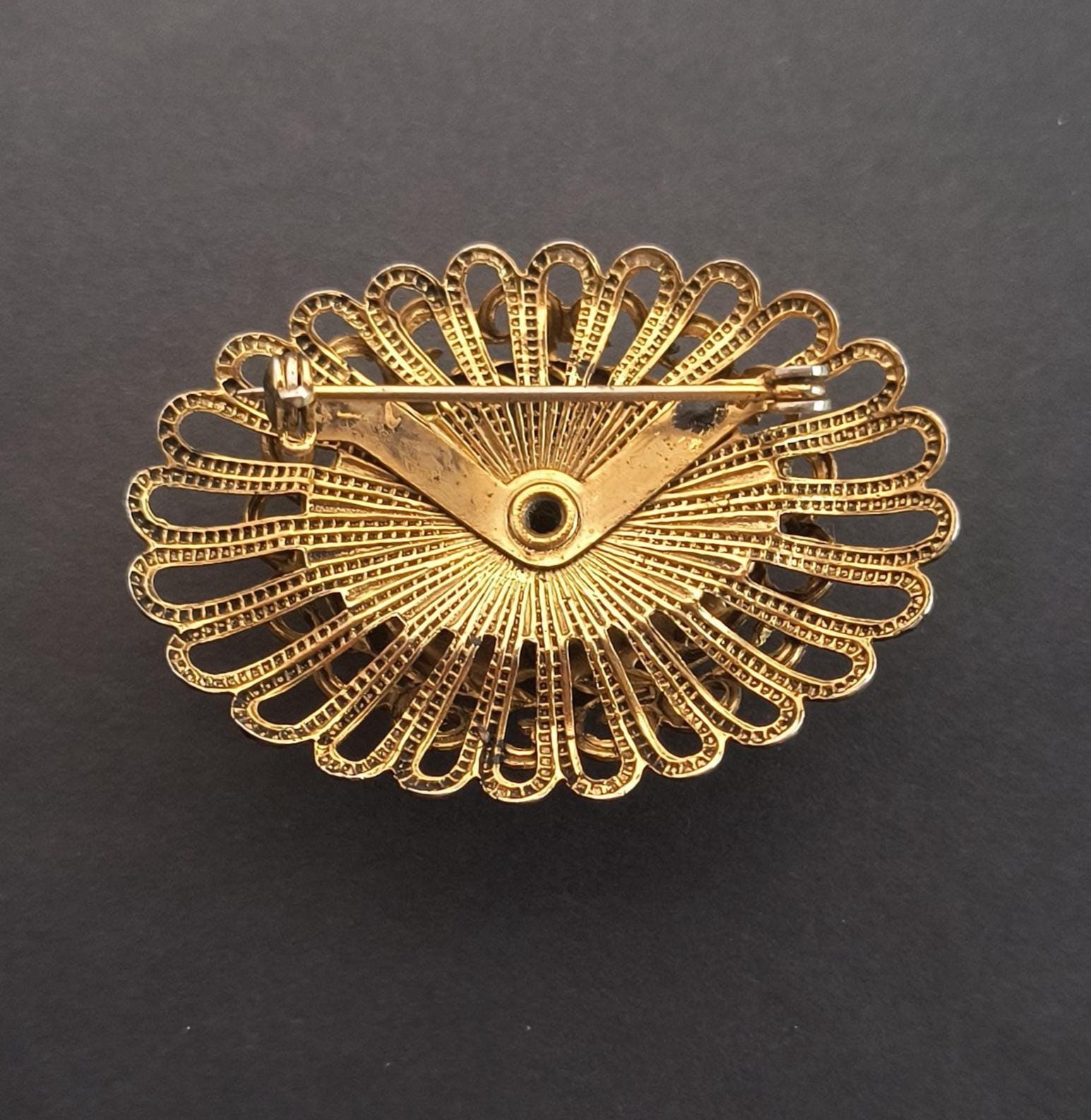 I just love the bold, eye catching design of this vintage Brooch! The goldstone metal loops and swirls, wraps around itself and than rises into a crown of decorative prongs. This is from the 60s or 70s - a nod to the Rococo, and a tip of the hat to Victorian design!