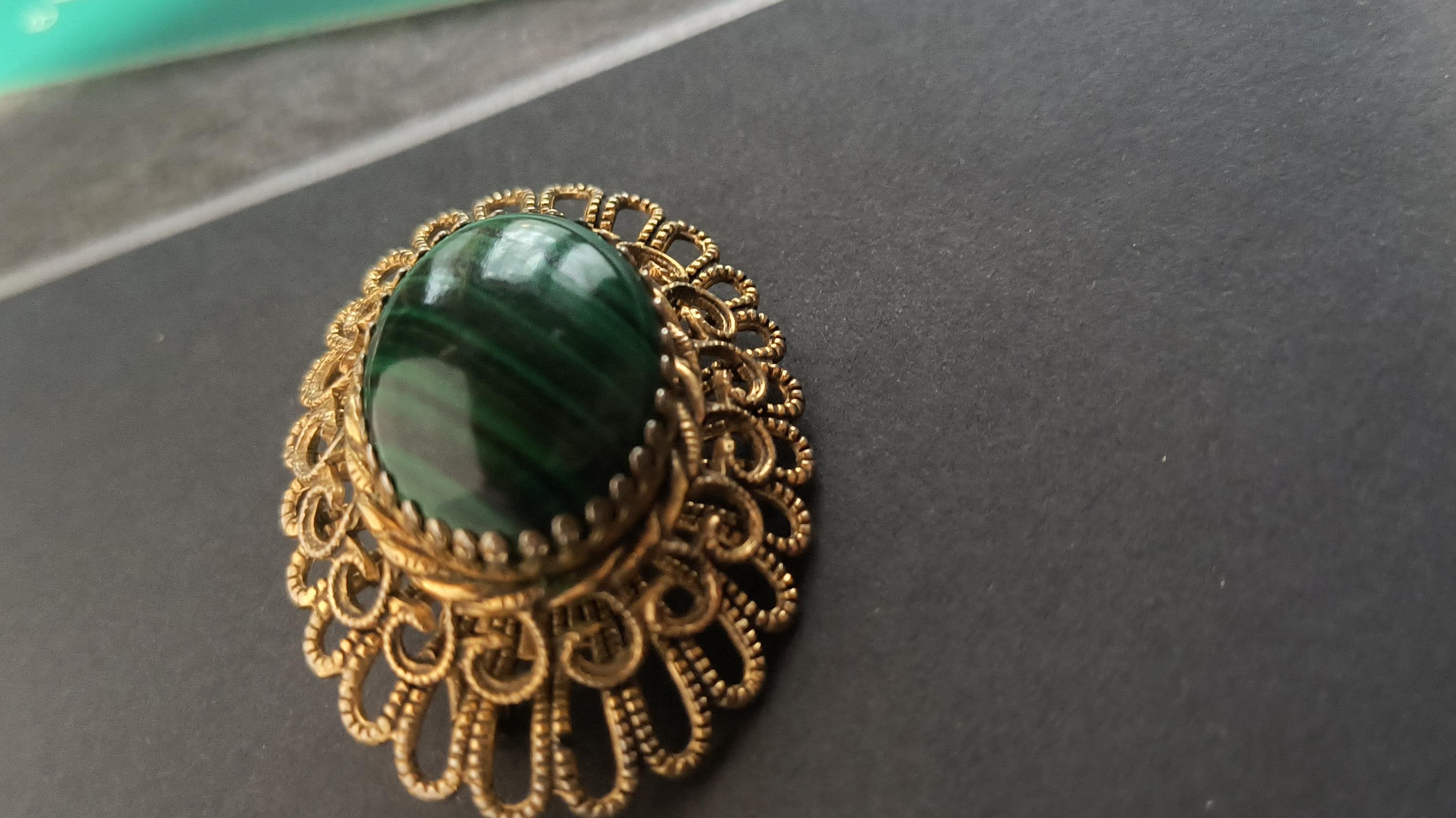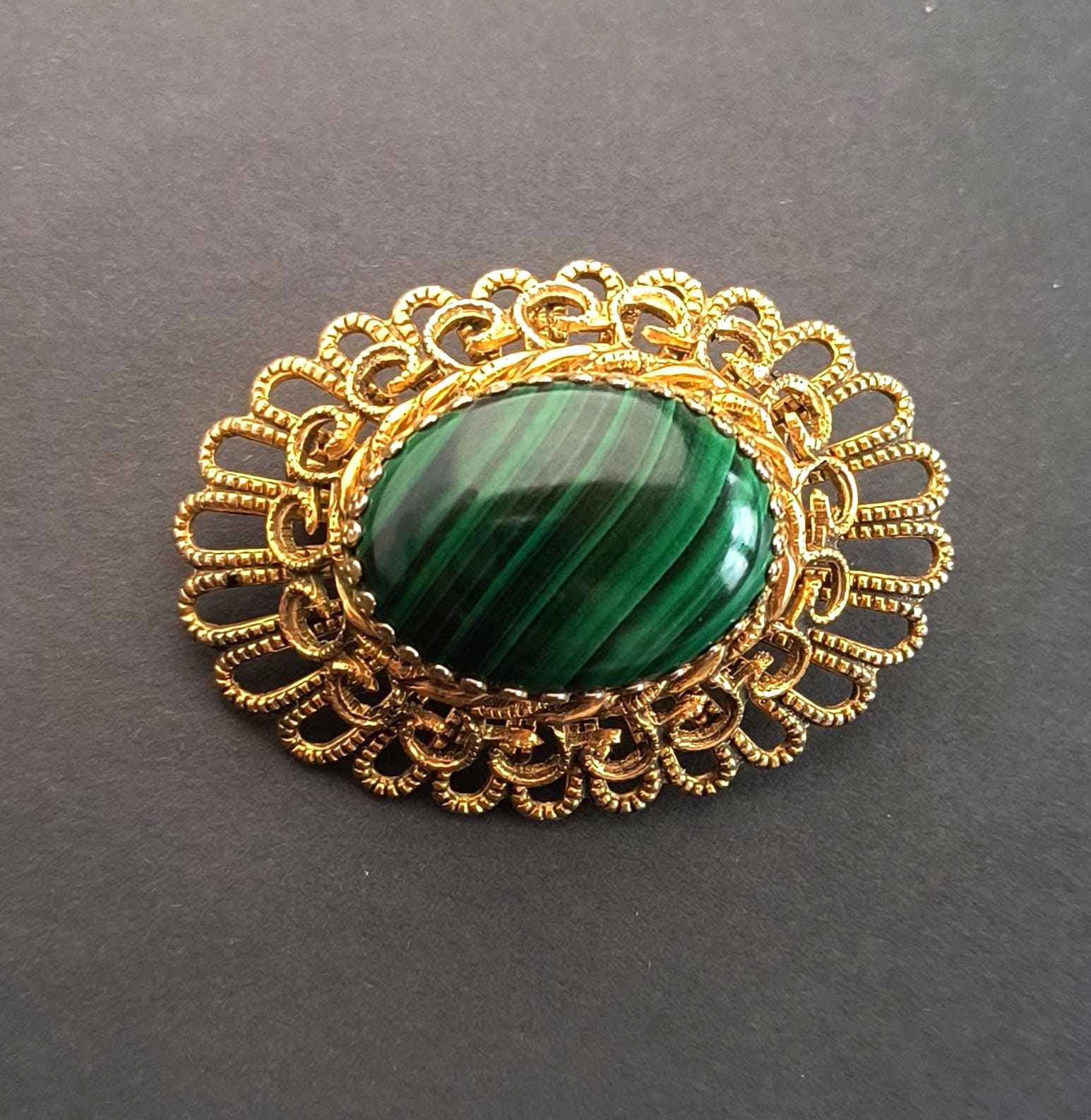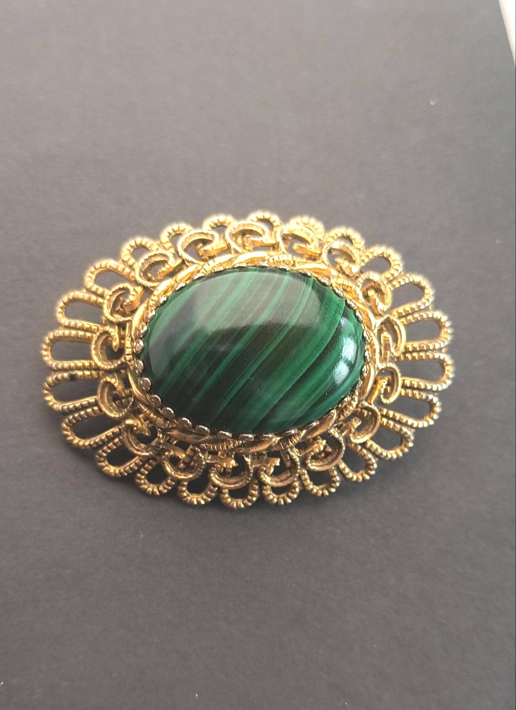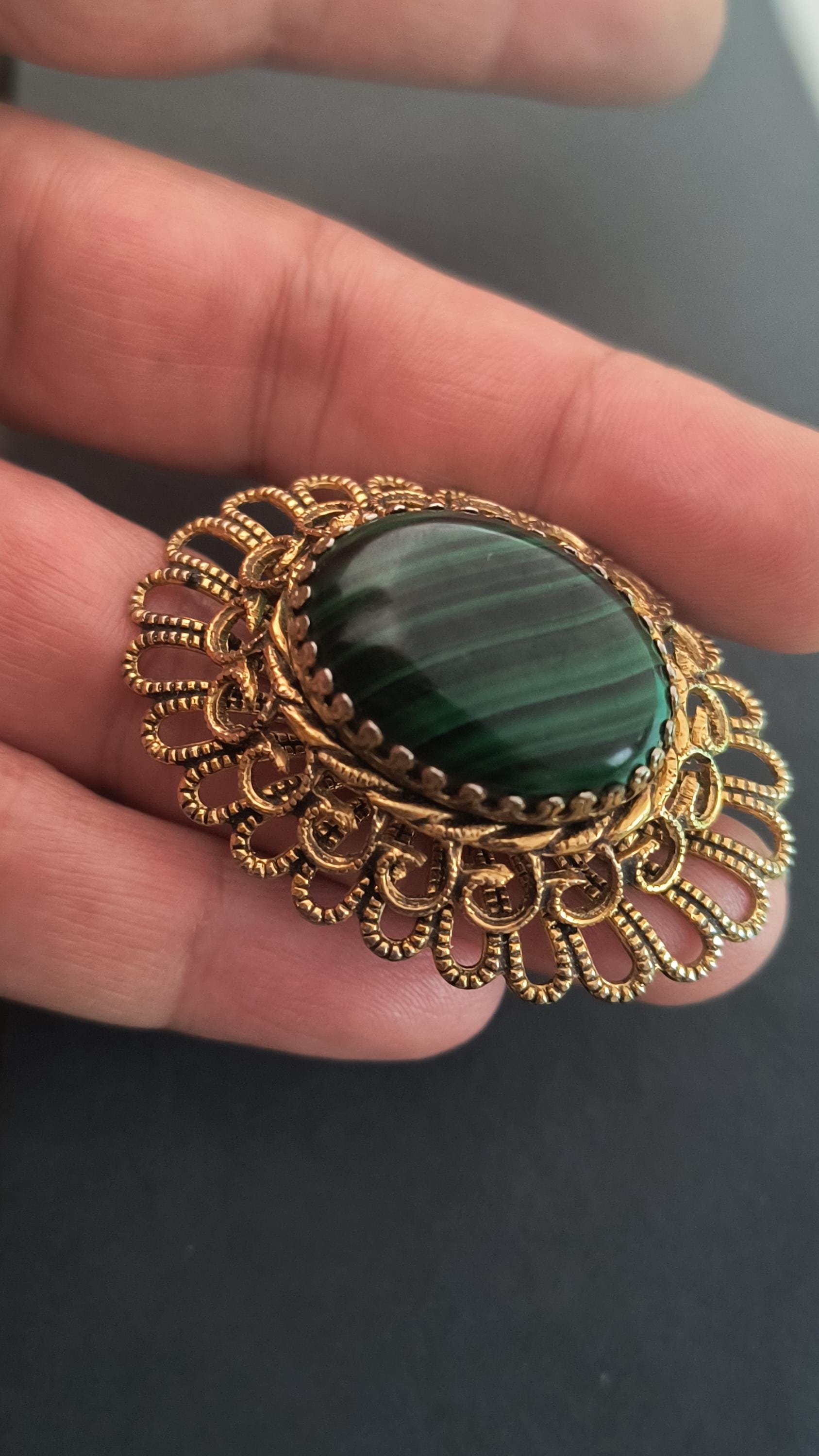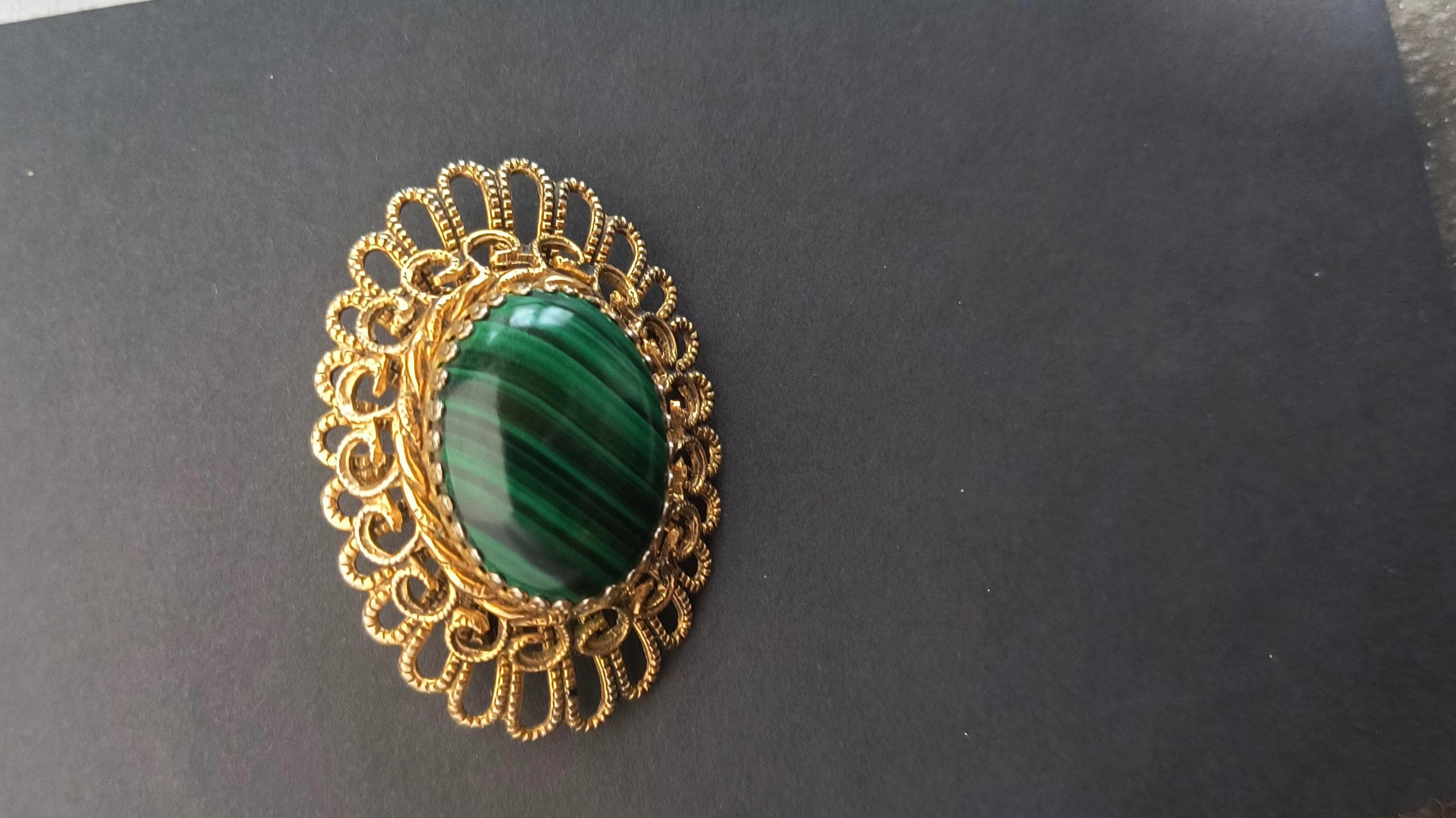 I just love the bold, eye catching design of this vintage Brooch! The goldstone metal loops and swirls, wraps around itself and than rises into a crown of decorative prongs. This is from the 60s or 70s - a nod to the Rococo, and a tip of the hat to Victorian design!