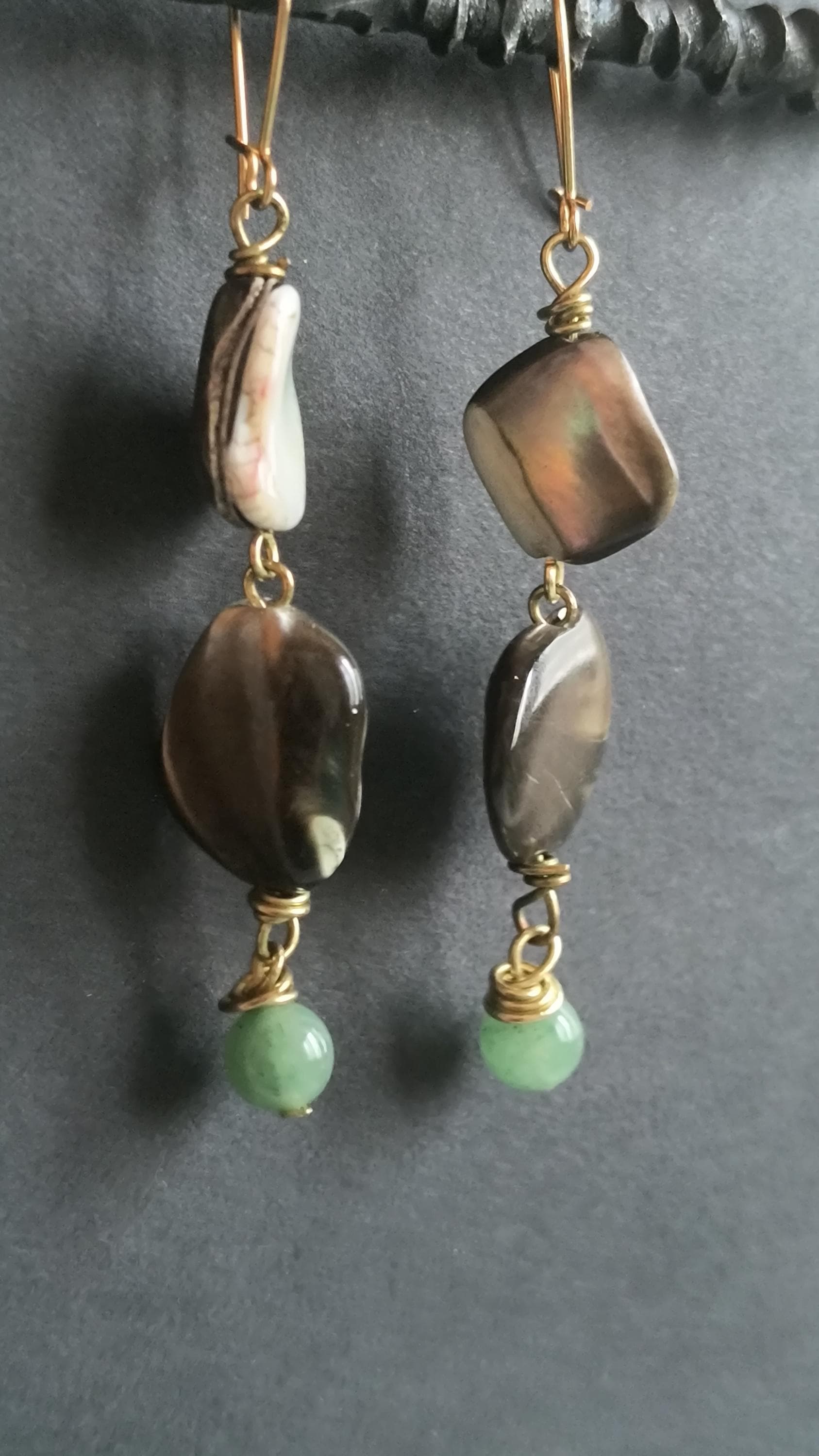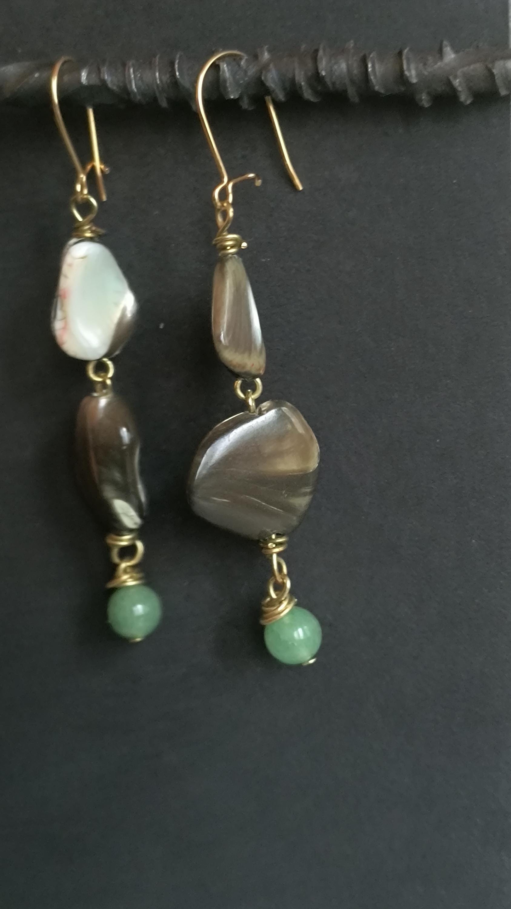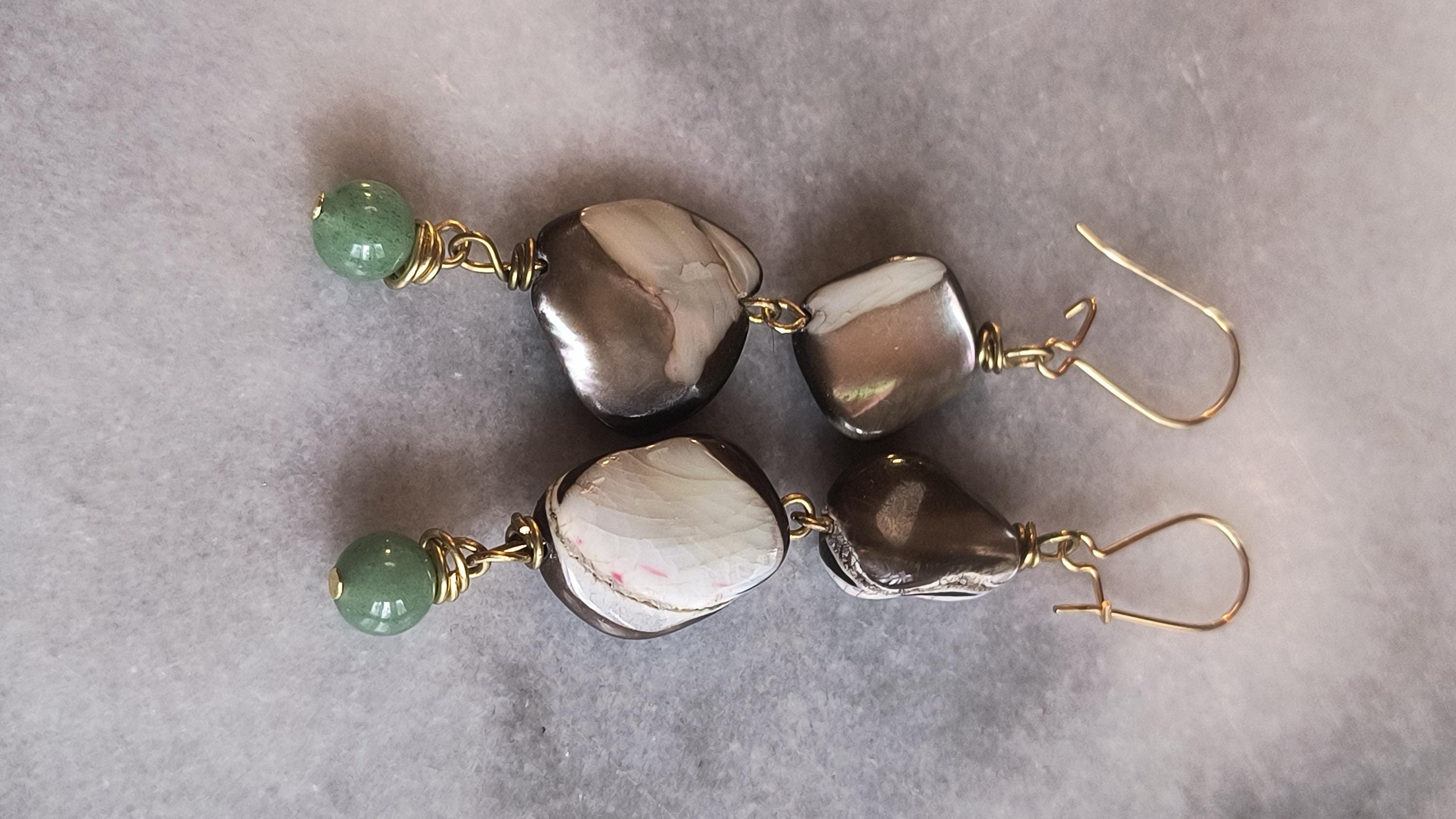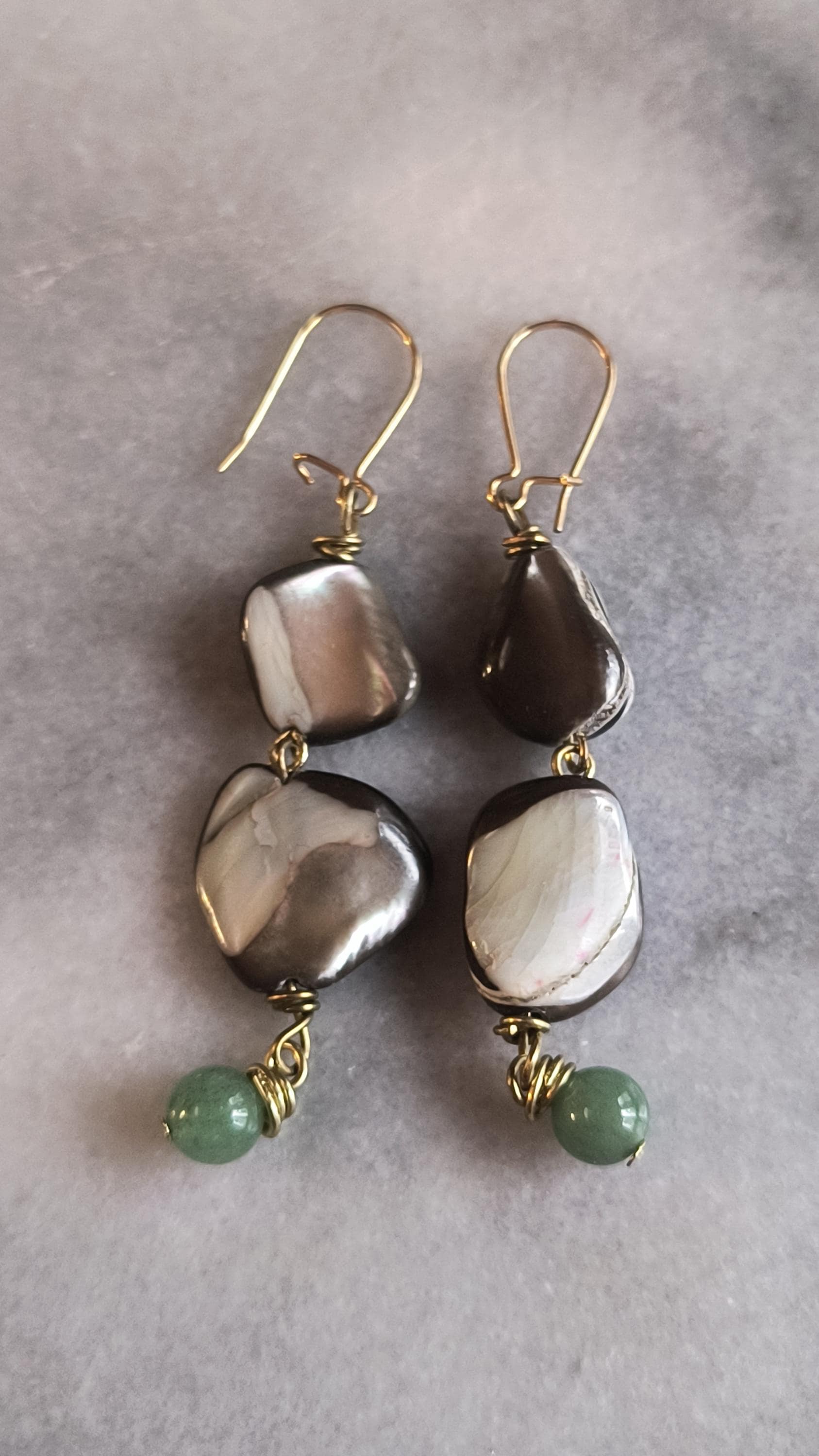 Velvety, natural mother of pearl pairs perfectly with green jade in these one of a kind earrings! The overall effect is luxurious and oceanic - a combination of colors and shapes that is bohemian, natural, and refined all at the same time!