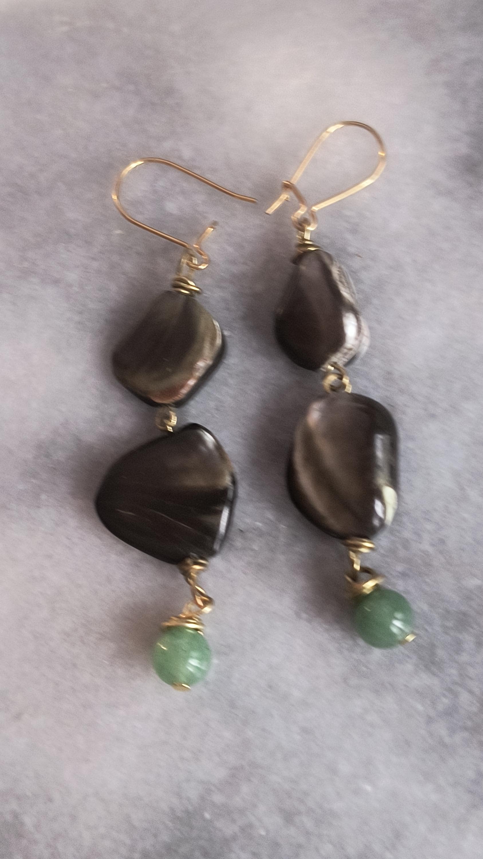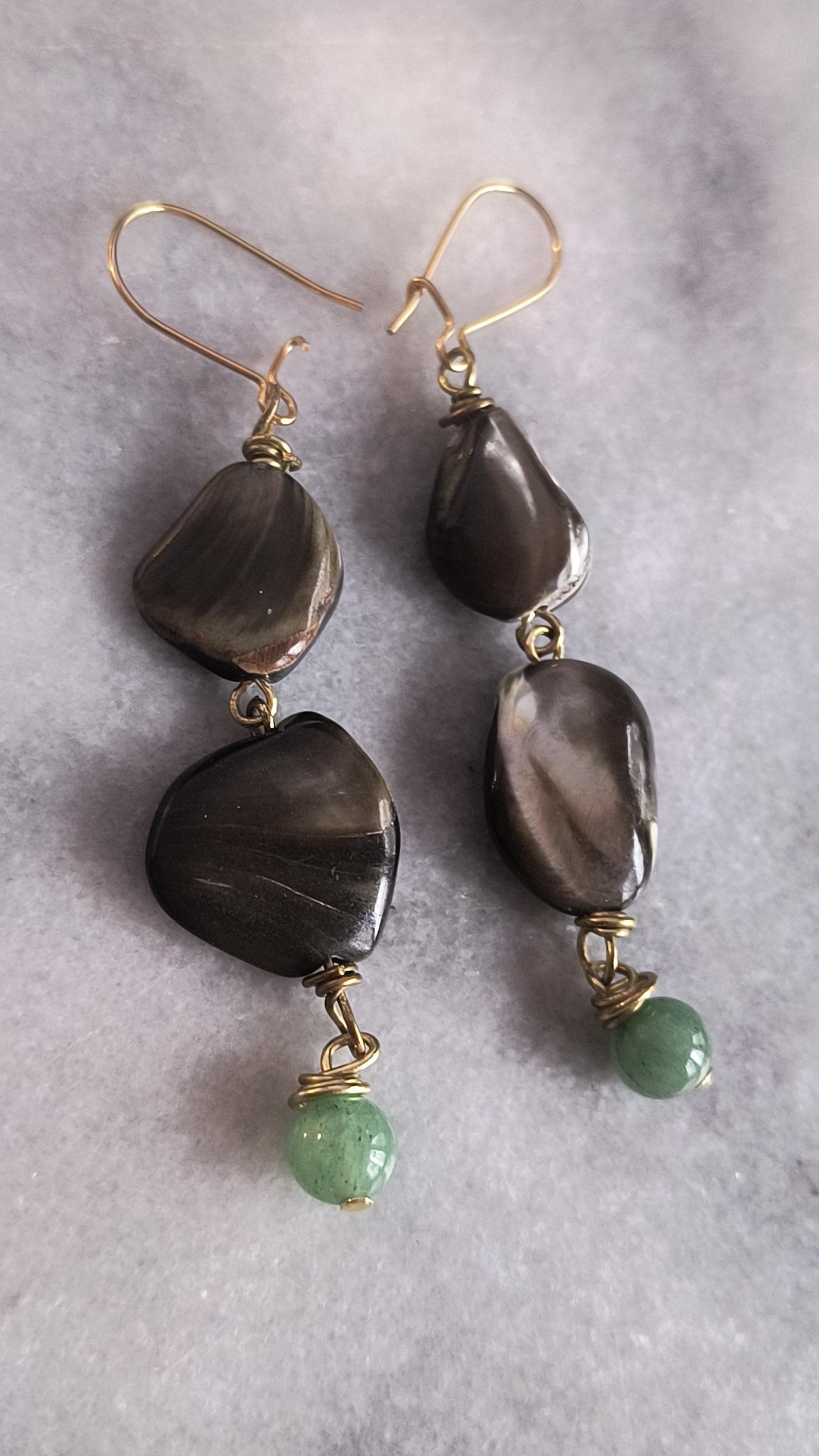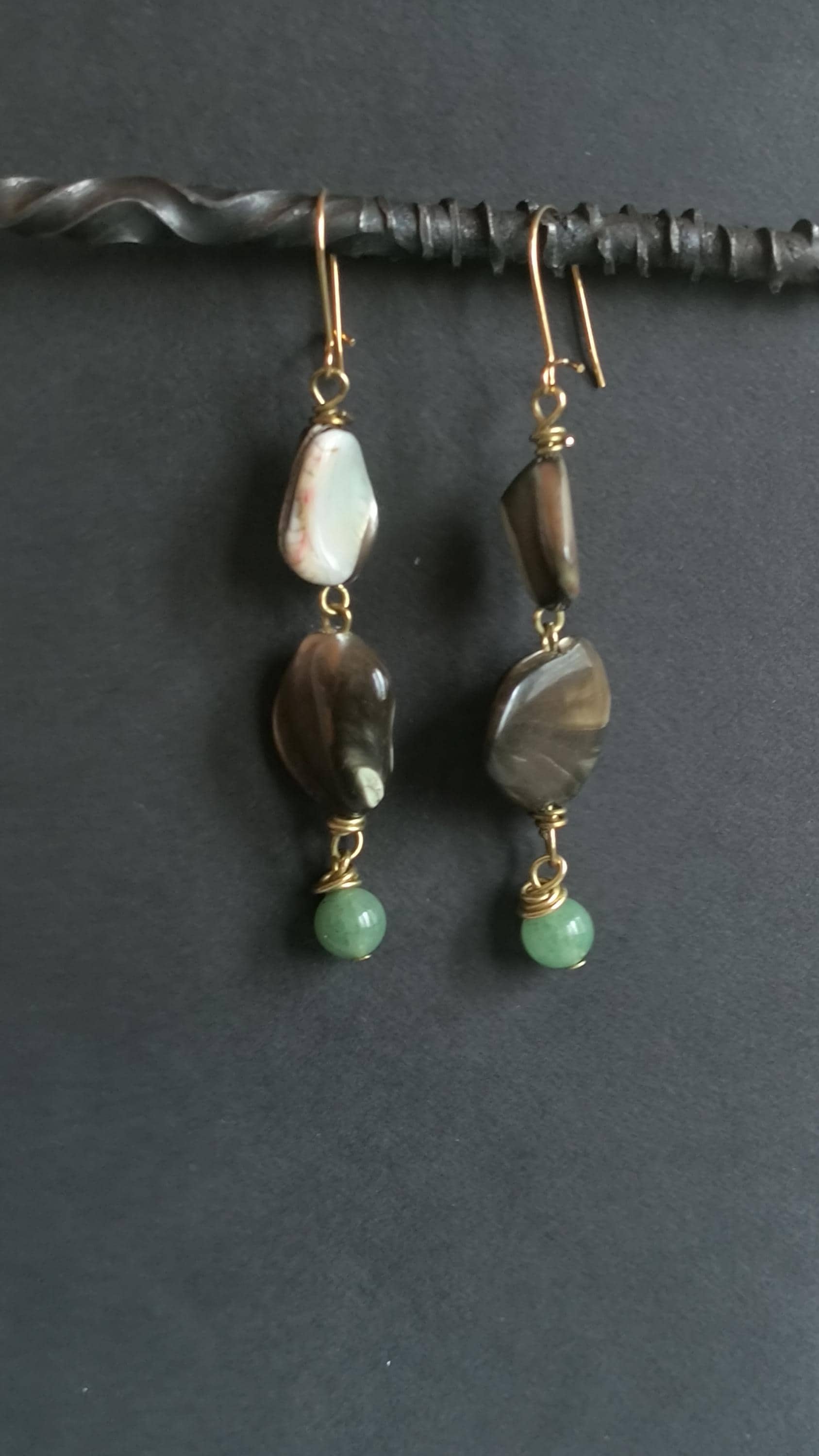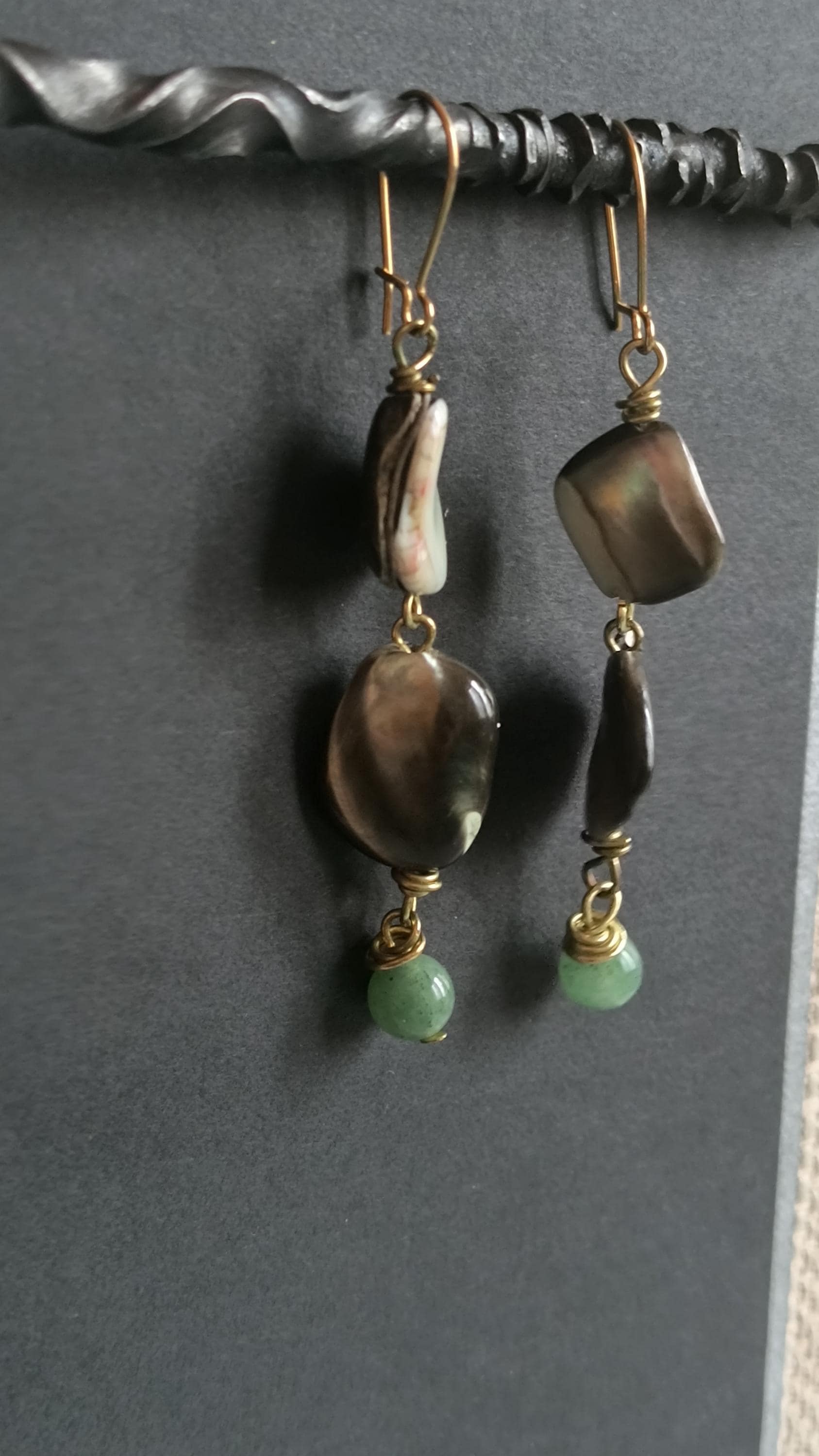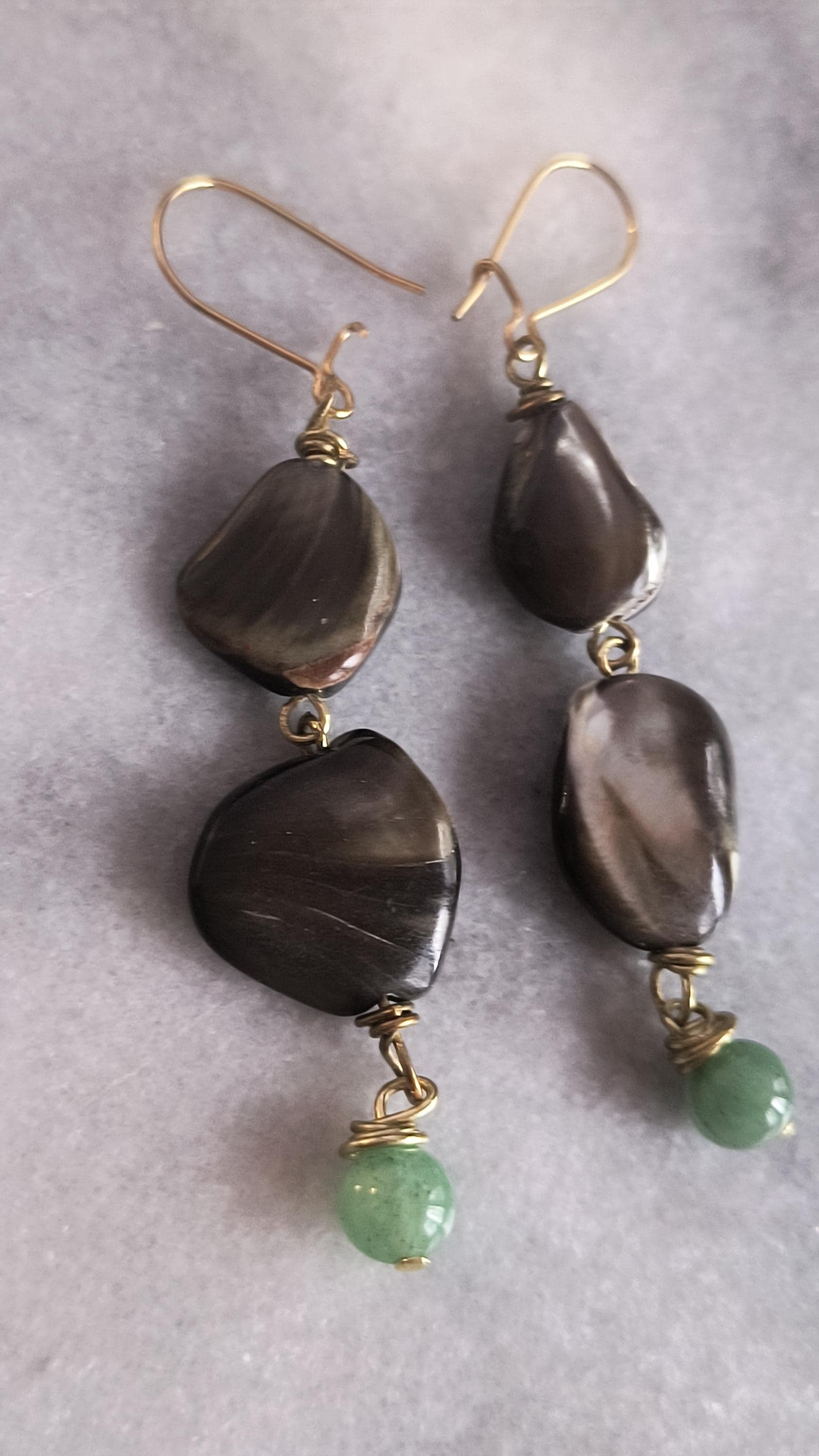 Velvety, natural mother of pearl pairs perfectly with green jade in these one of a kind earrings! The overall effect is luxurious and oceanic - a combination of colors and shapes that is bohemian, natural, and refined all at the same time!