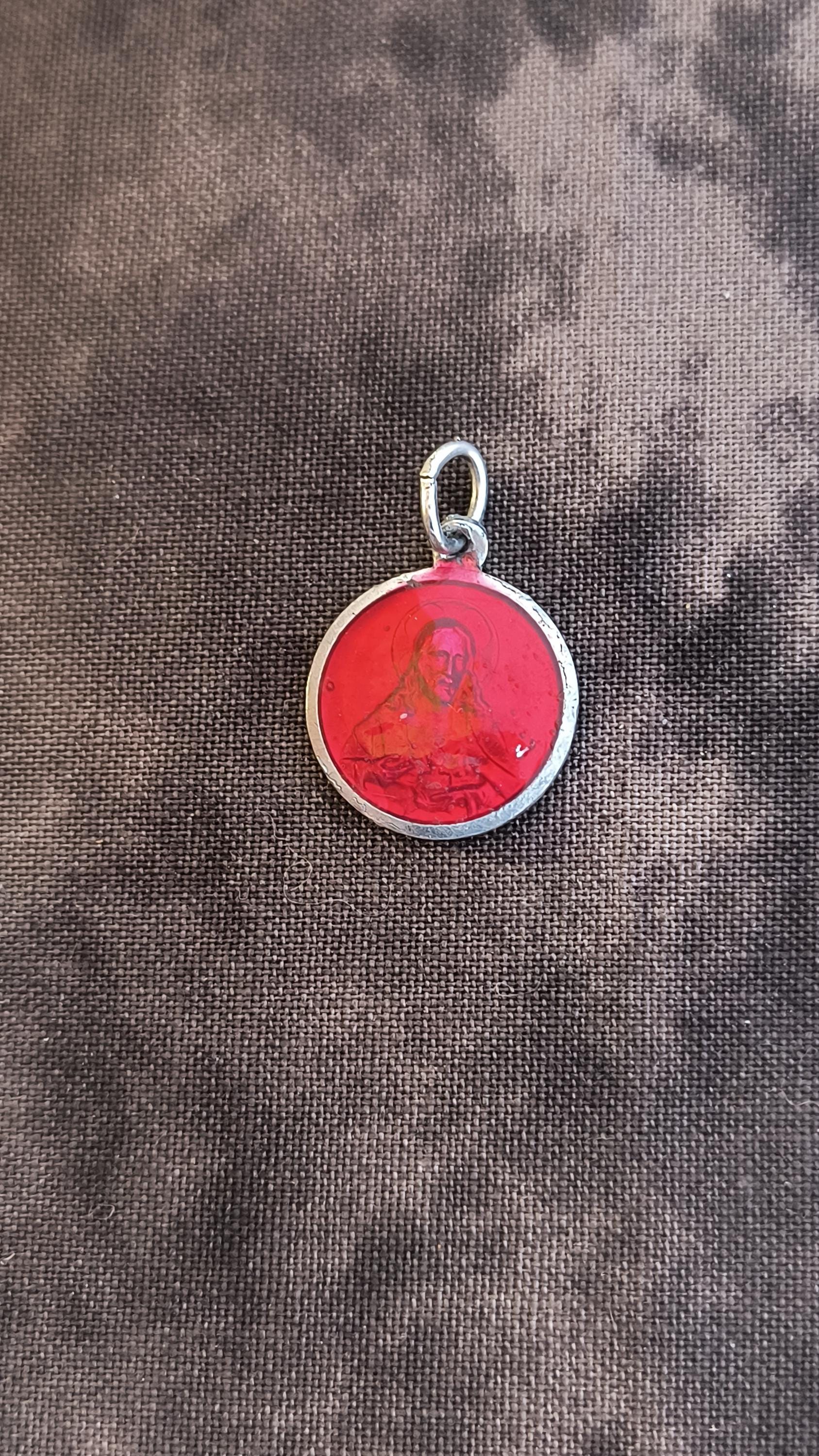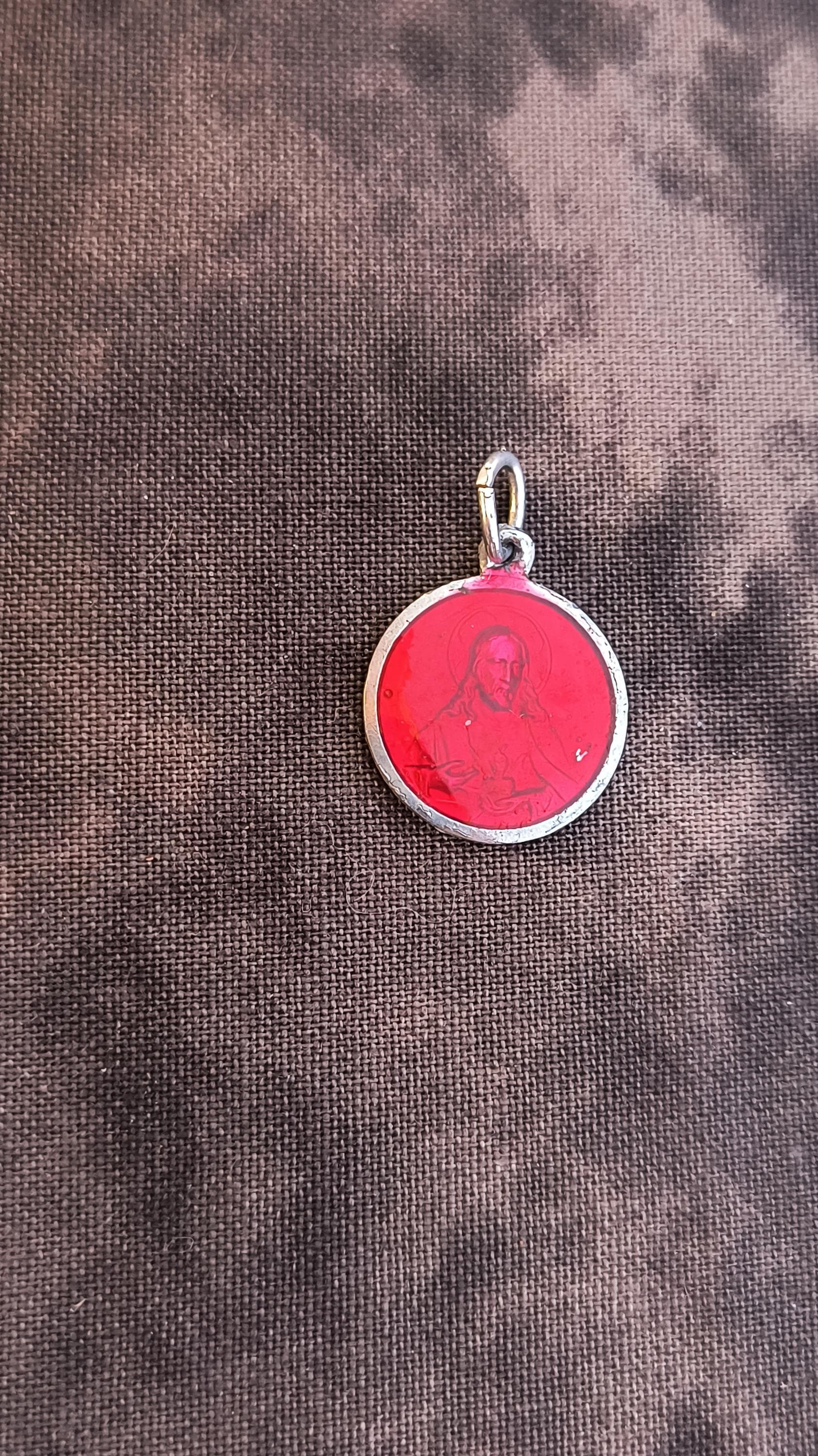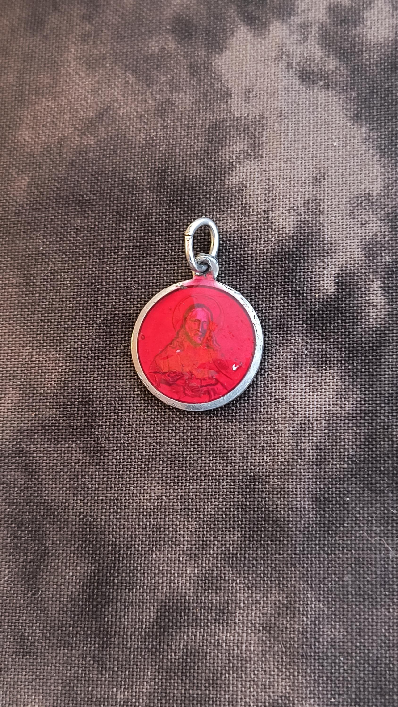 Quite likely made in France, this antique medal is from the early 1900s. The metal is aluminum or some other light, Silvertone Metal. The front bears the image of the Sacred Heart, while the reverse is stamped with the Mother and Child. The front of the medal is enameled in bright, clear red!