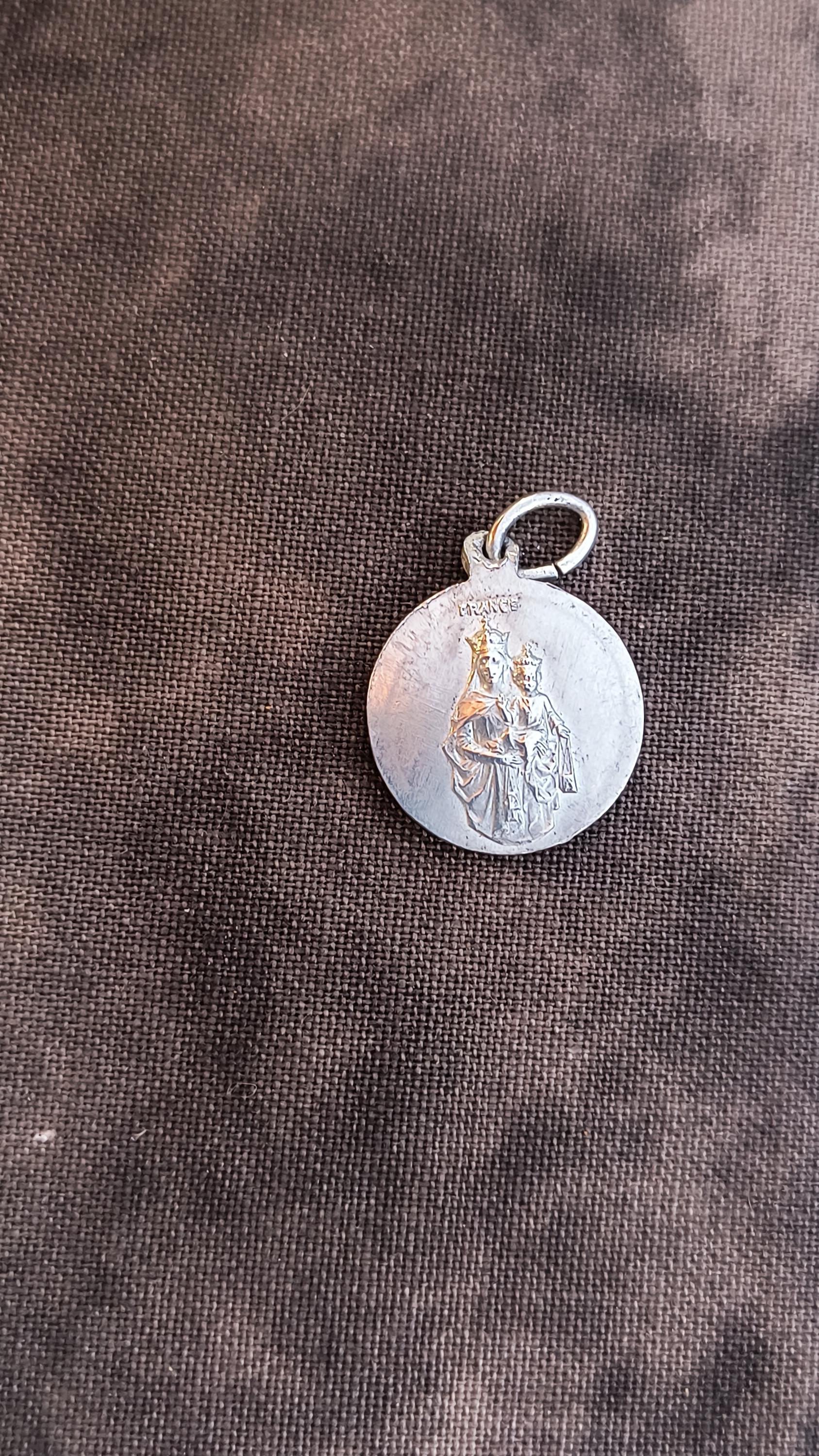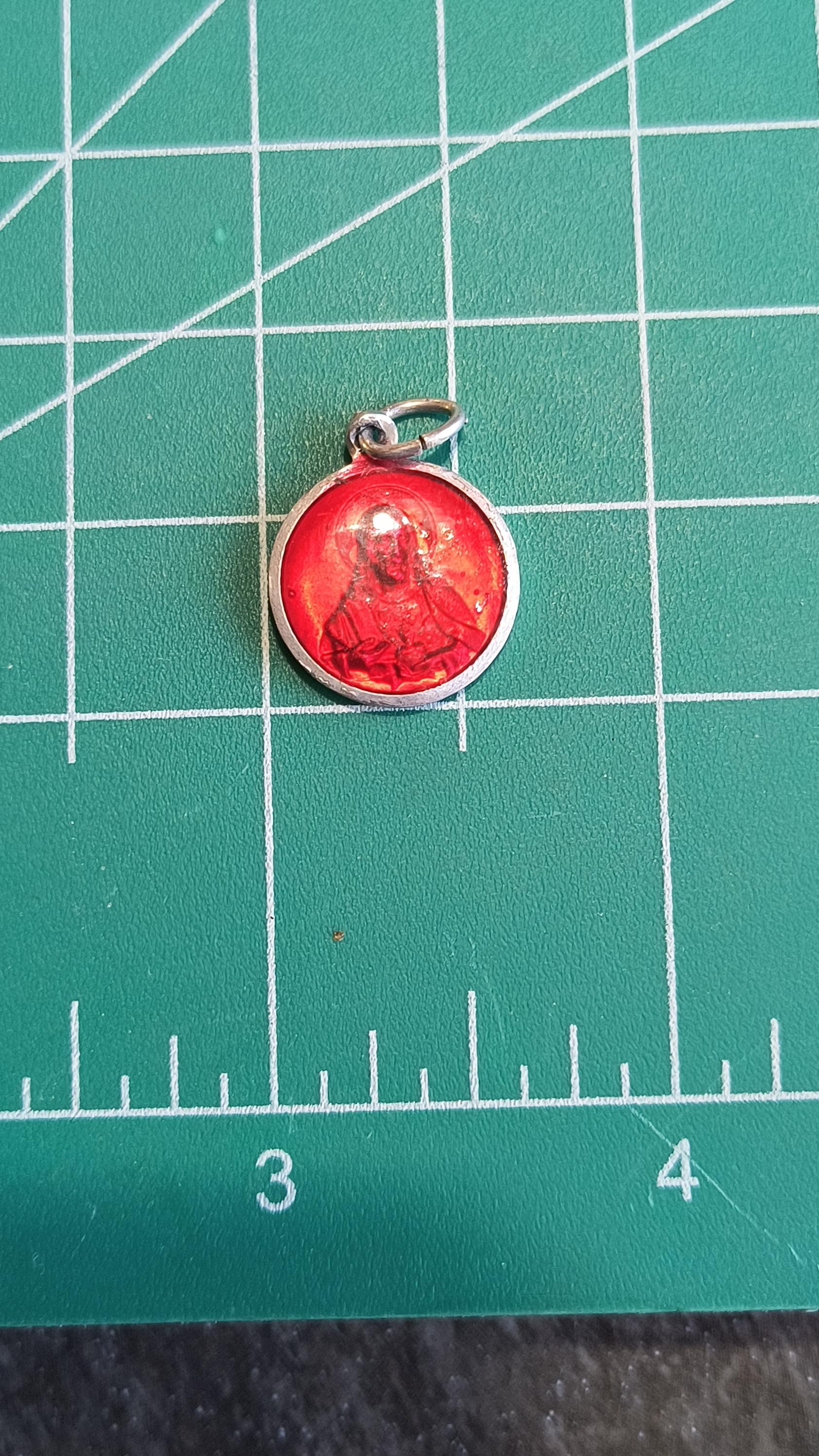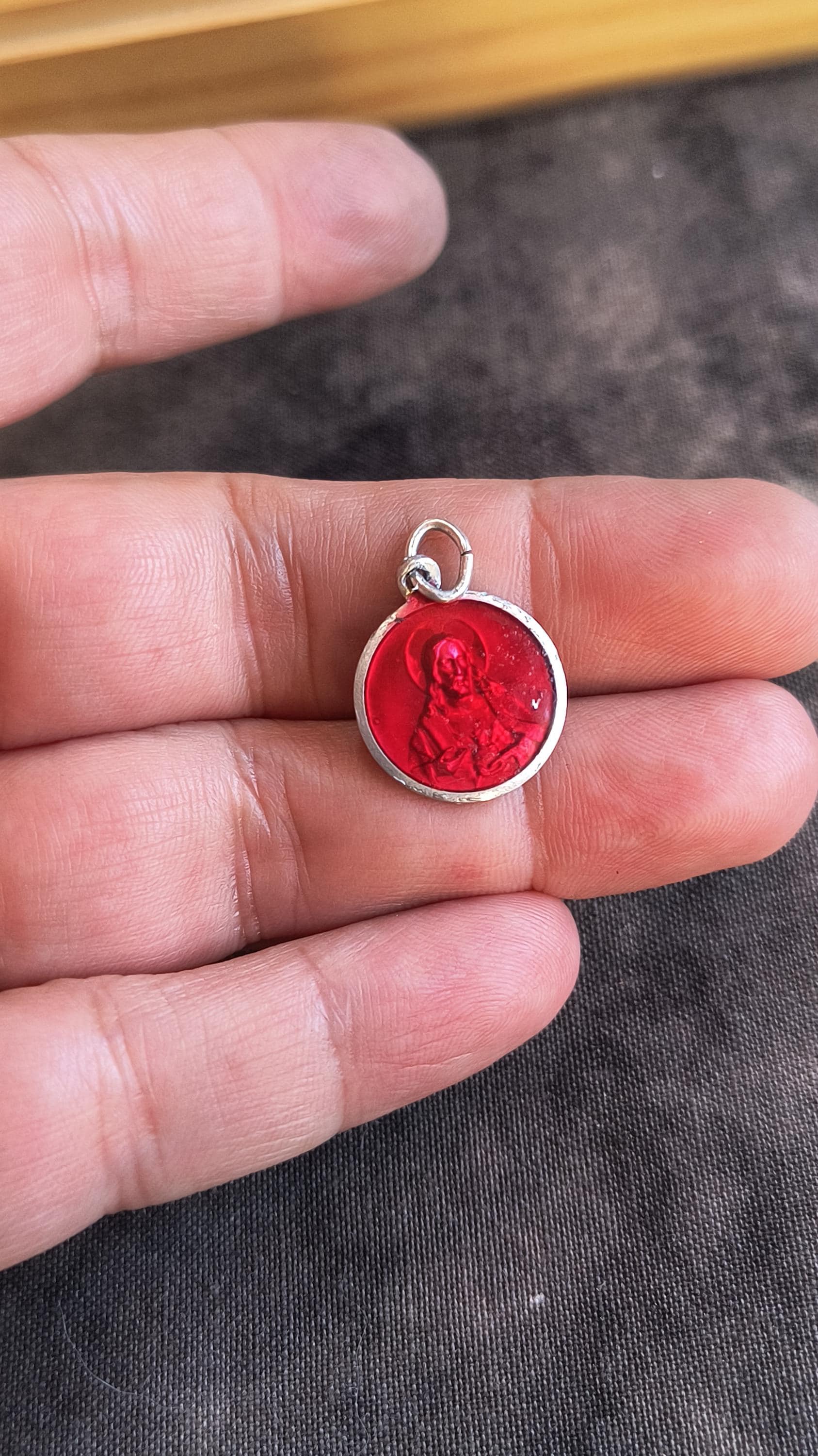 Quite likely made in France, this antique medal is from the early 1900s. The metal is aluminum or some other light, Silvertone Metal. The front bears the image of the Sacred Heart, while the reverse is stamped with the Mother and Child. The front of the medal is enameled in bright, clear red!
