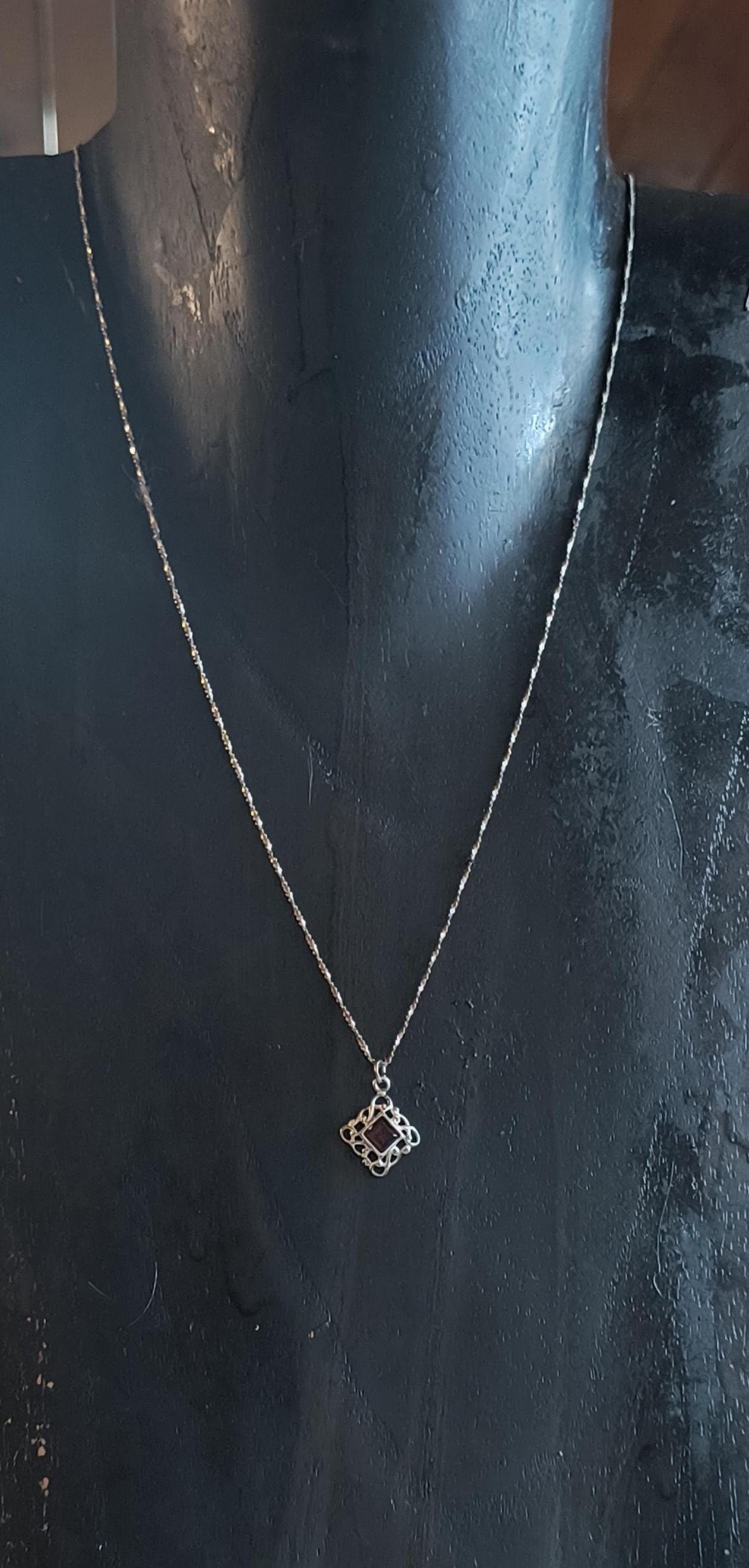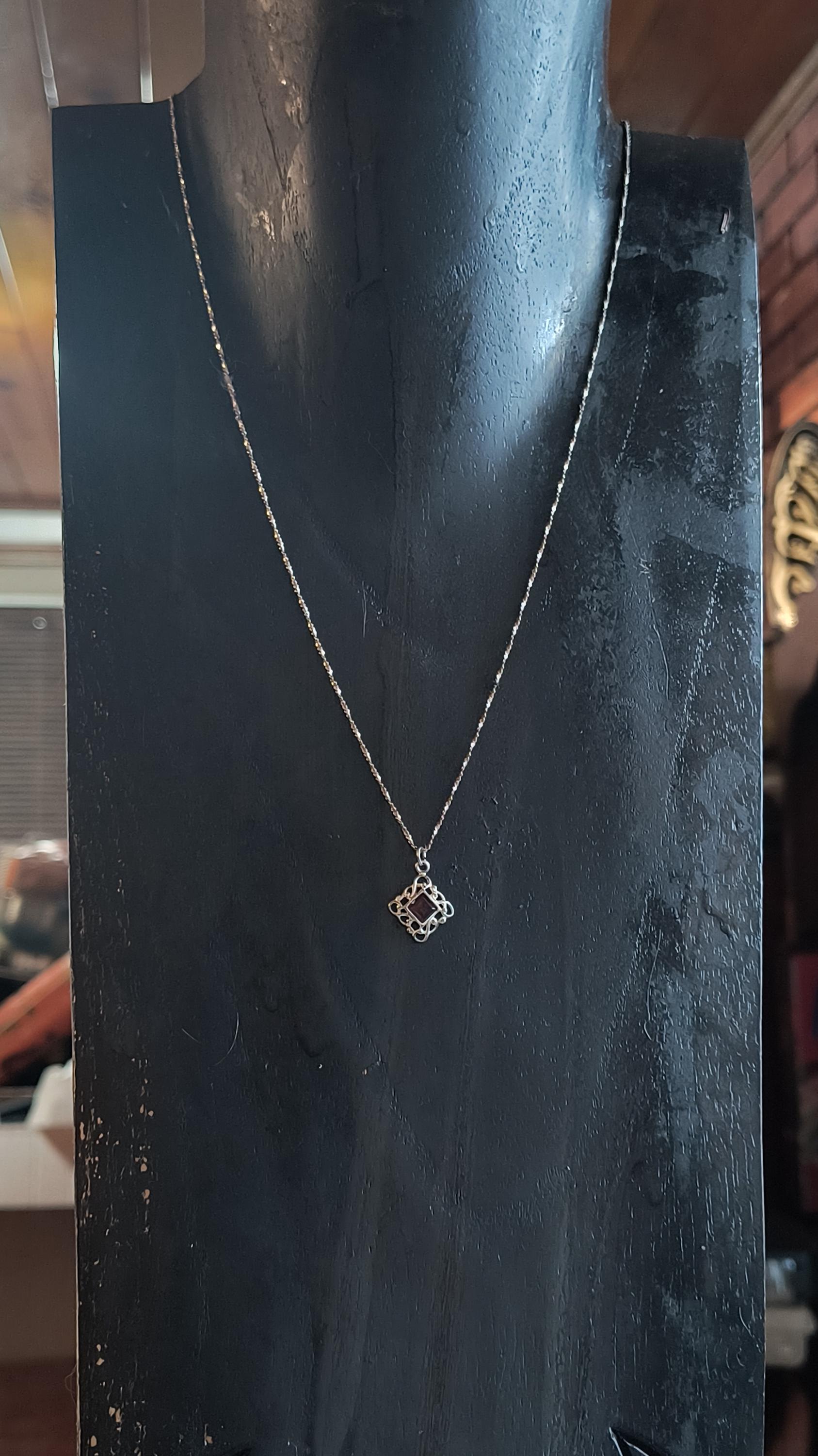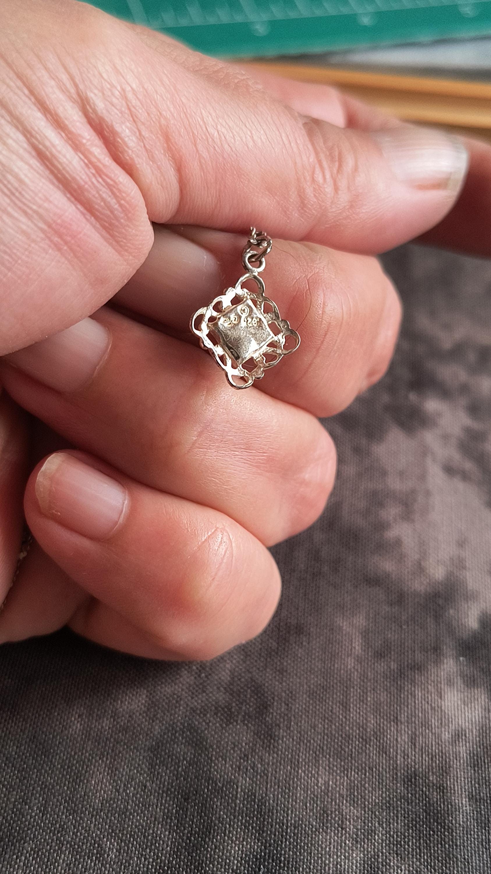 SIZE: 10mm square, 2mm bail, 18 inch silver plated chain