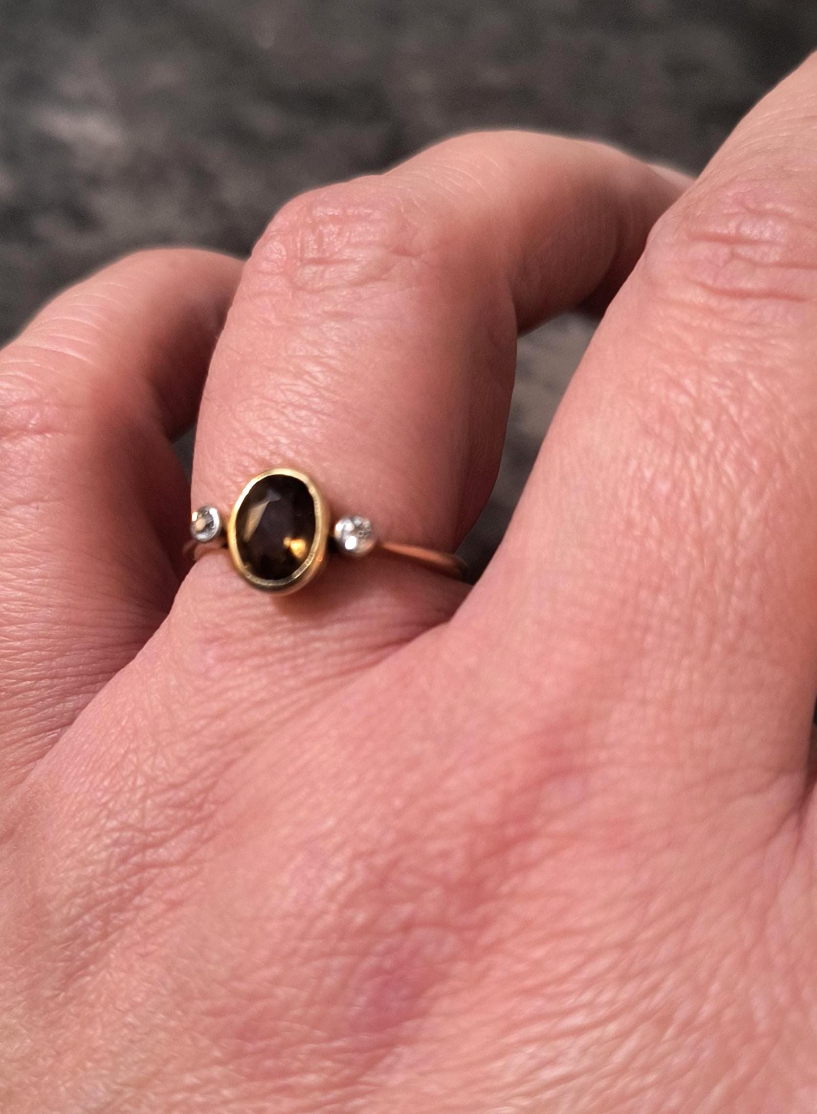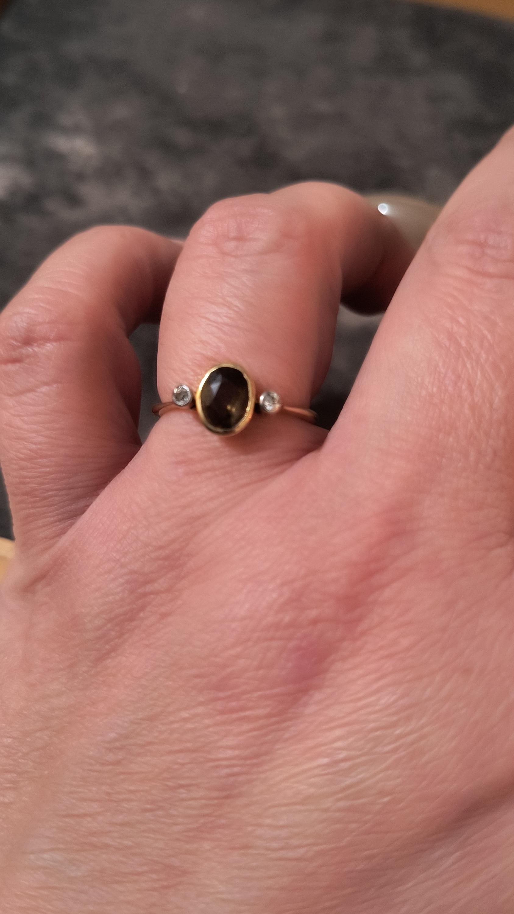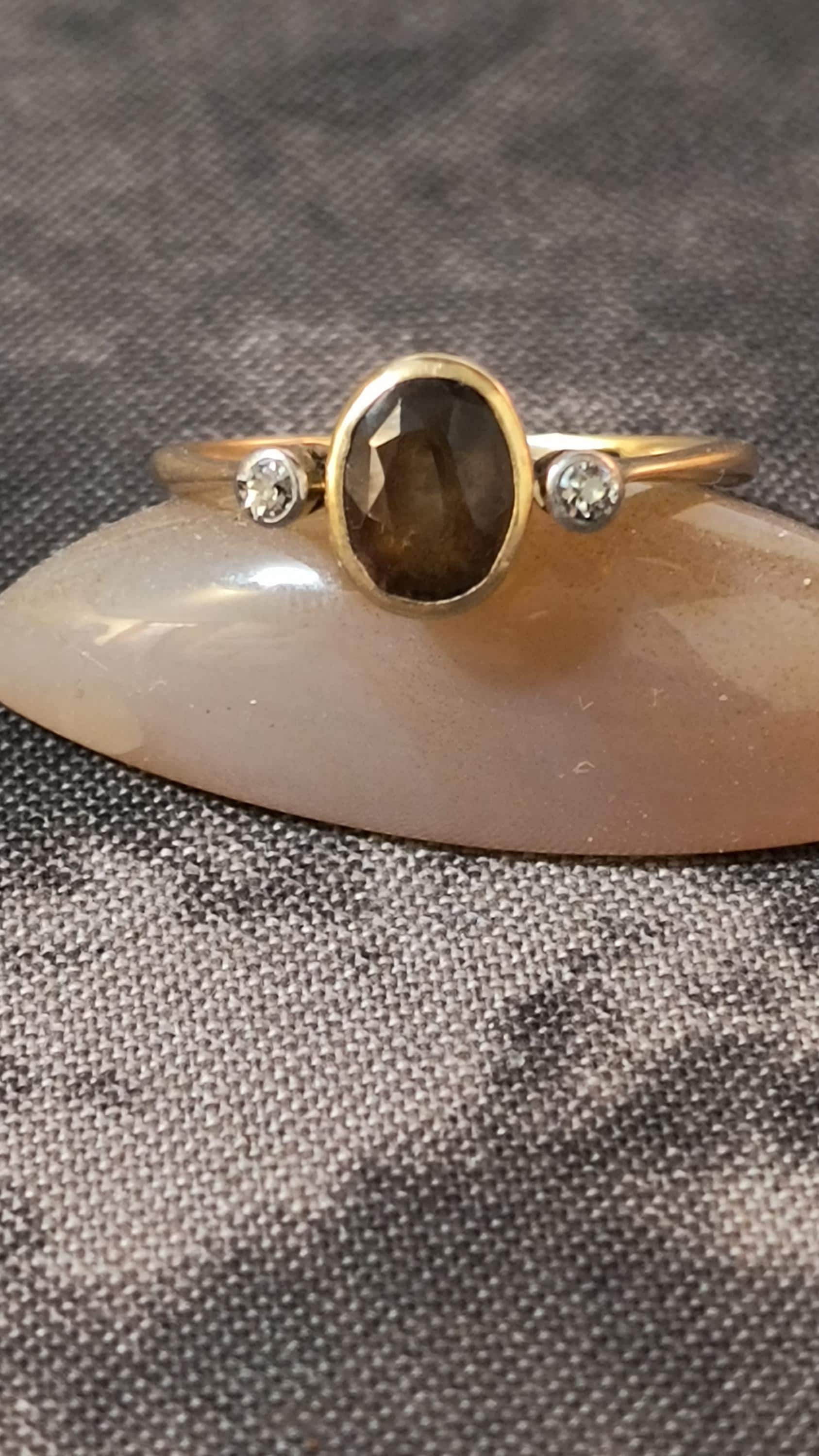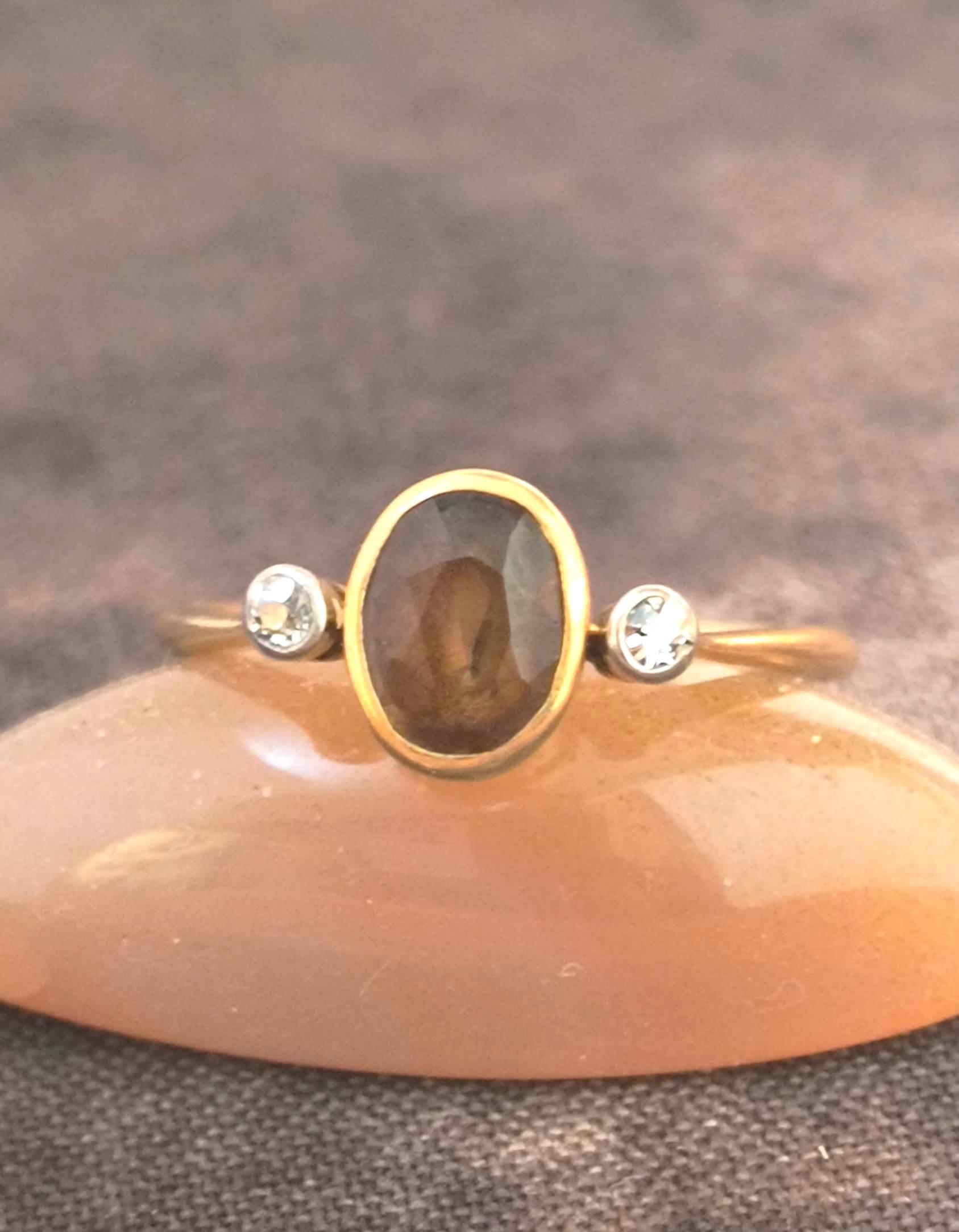 This particular ring is particularly interesting - the gem at the center is a bright, Hazel hued Sapphire. The stone is golden brown with hightlights of honey and soft green undertones. The diamonds on either side are single cuts, helping confirm the age of this lovely ring!