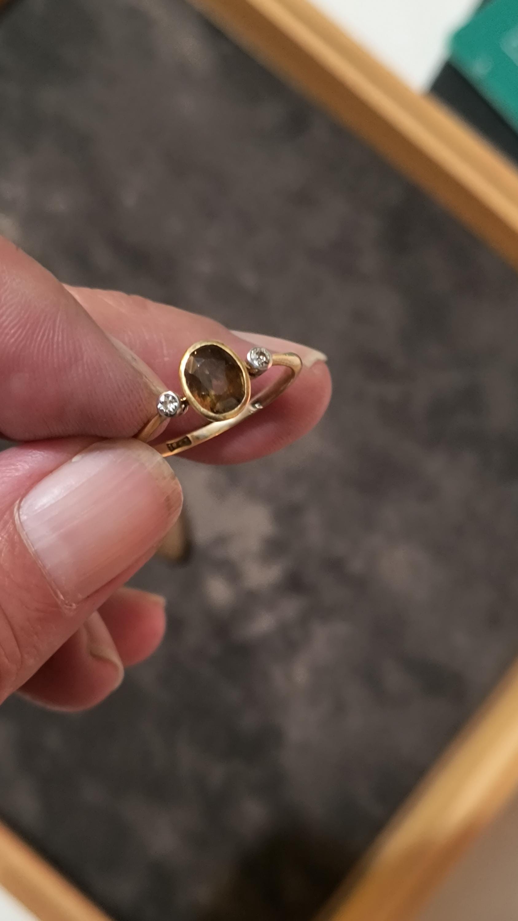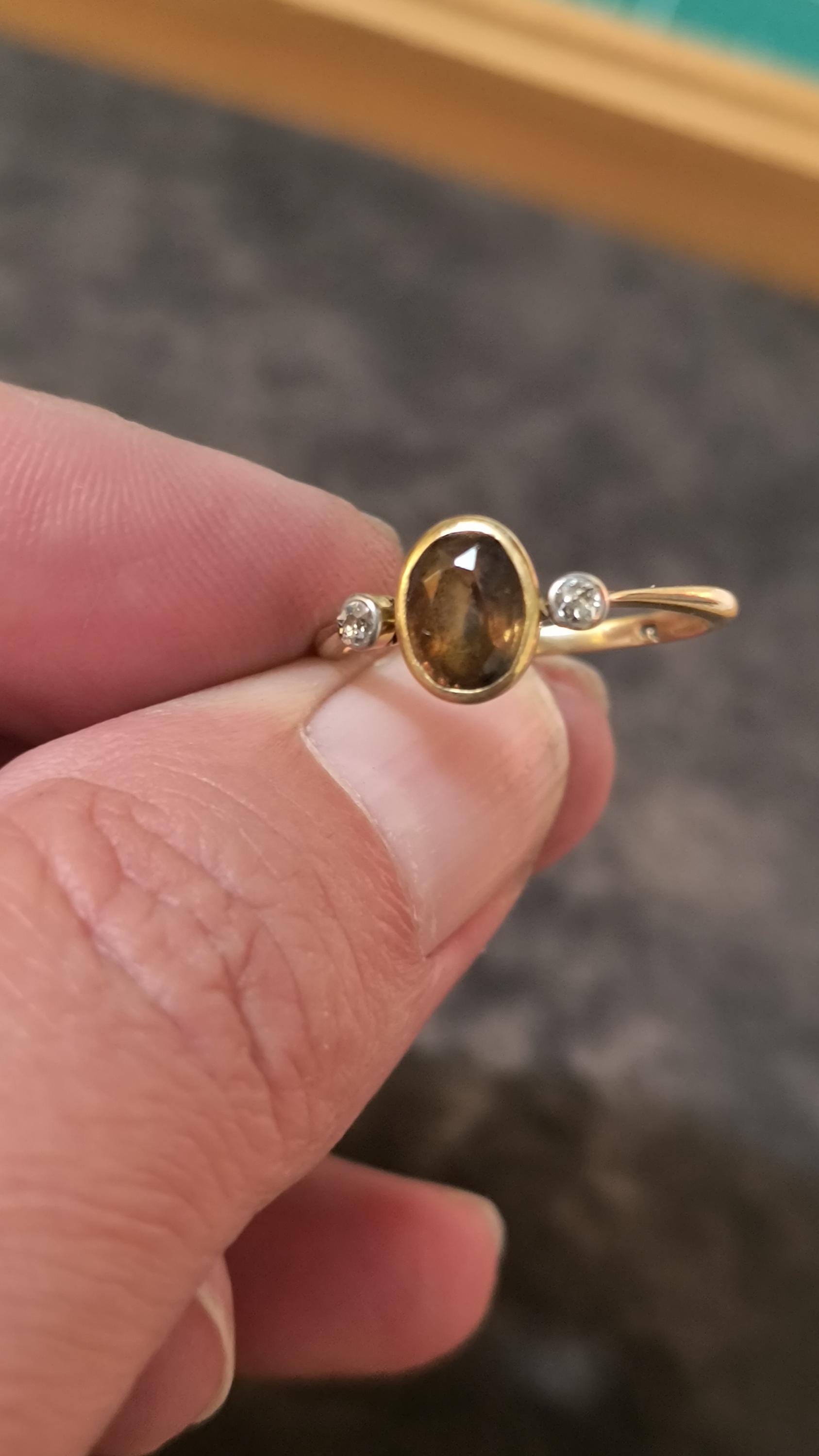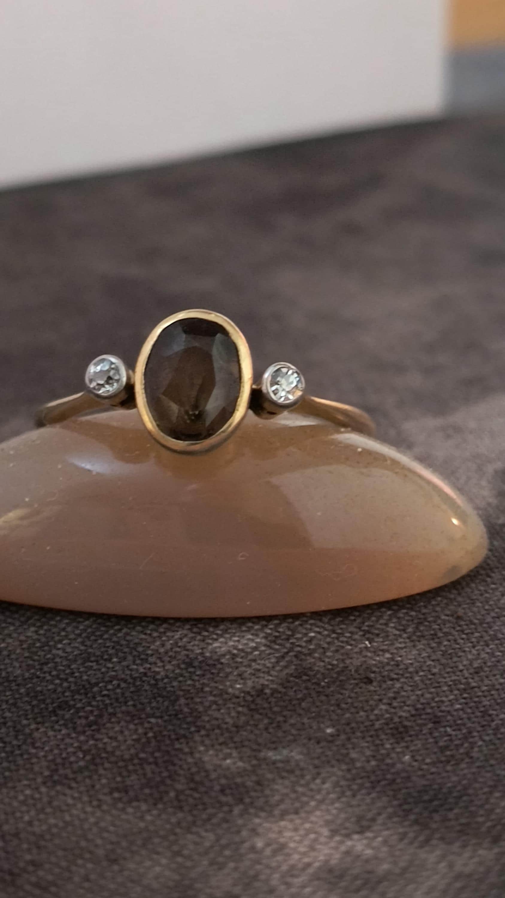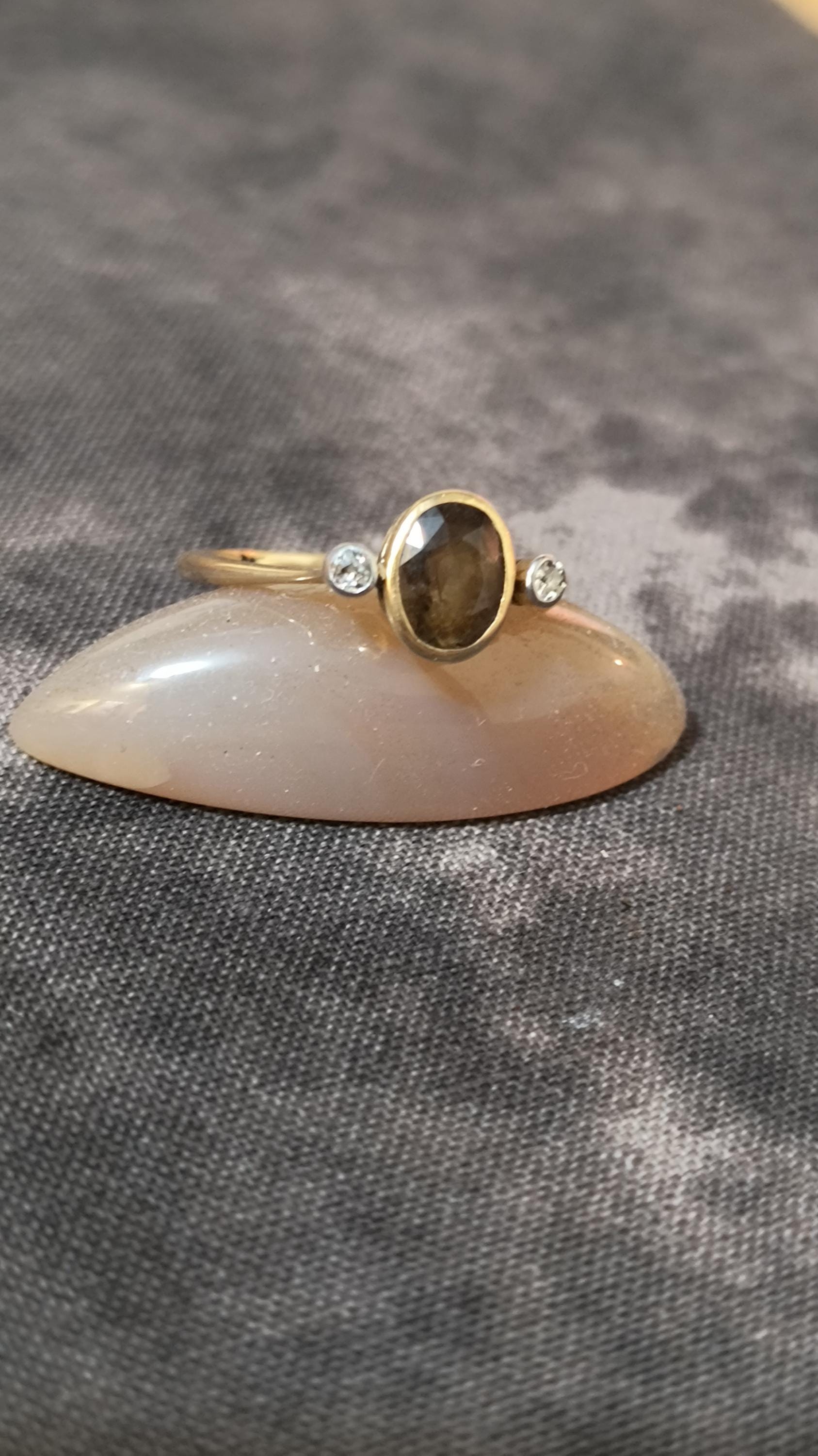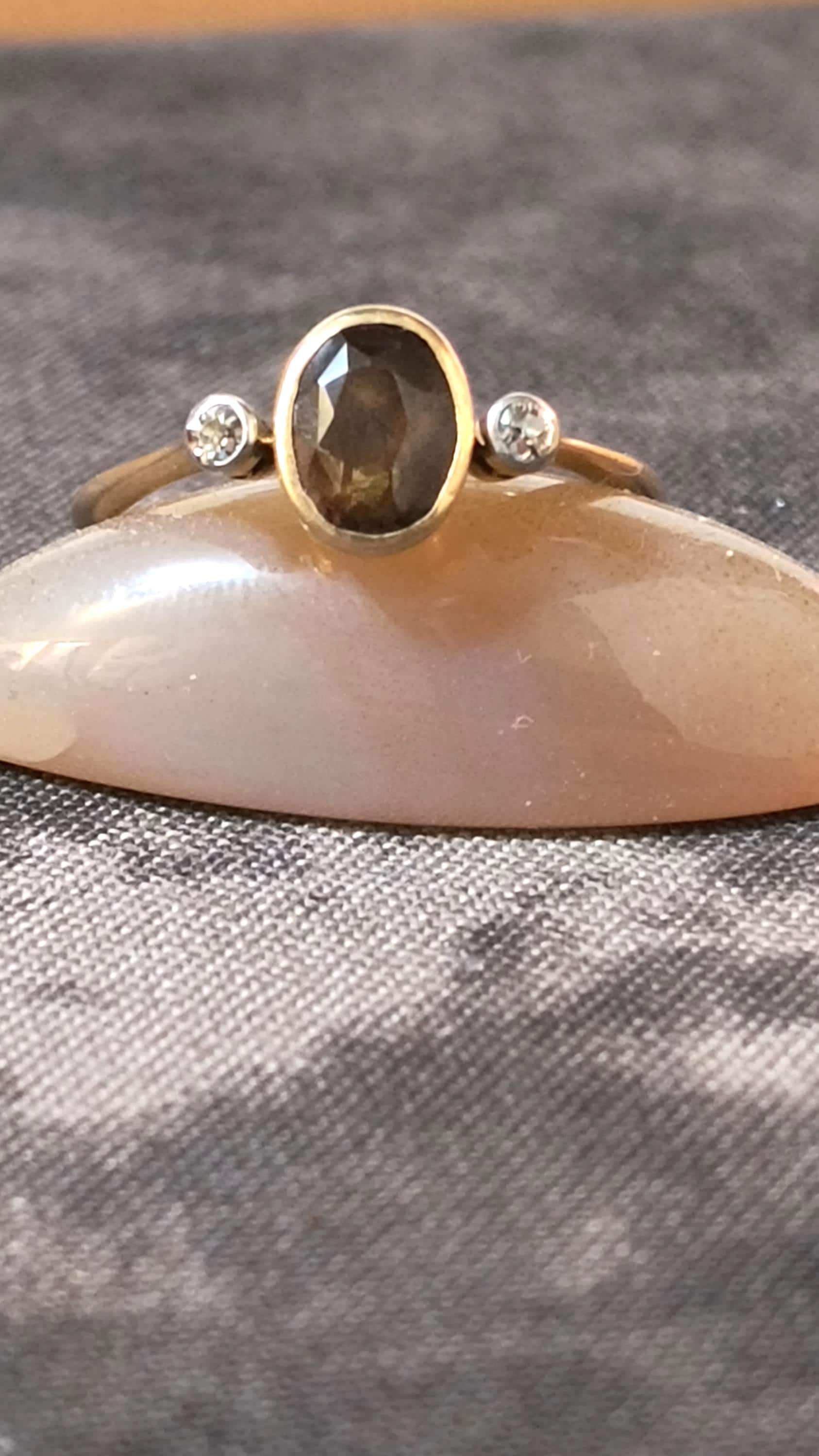 This particular ring is particularly interesting - the gem at the center is a bright, Hazel hued Sapphire. The stone is golden brown with hightlights of honey and soft green undertones. The diamonds on either side are single cuts, helping confirm the age of this lovely ring!