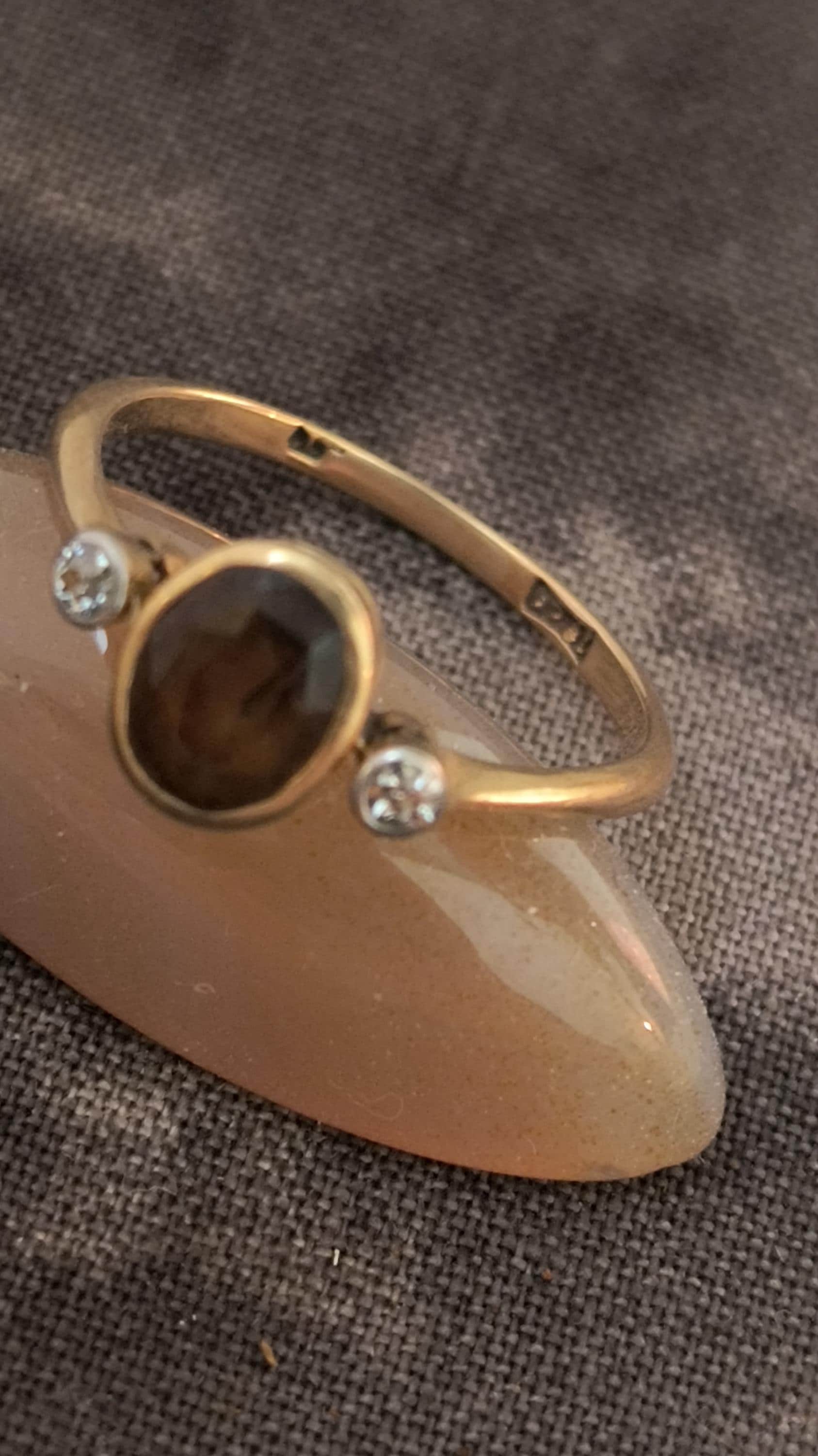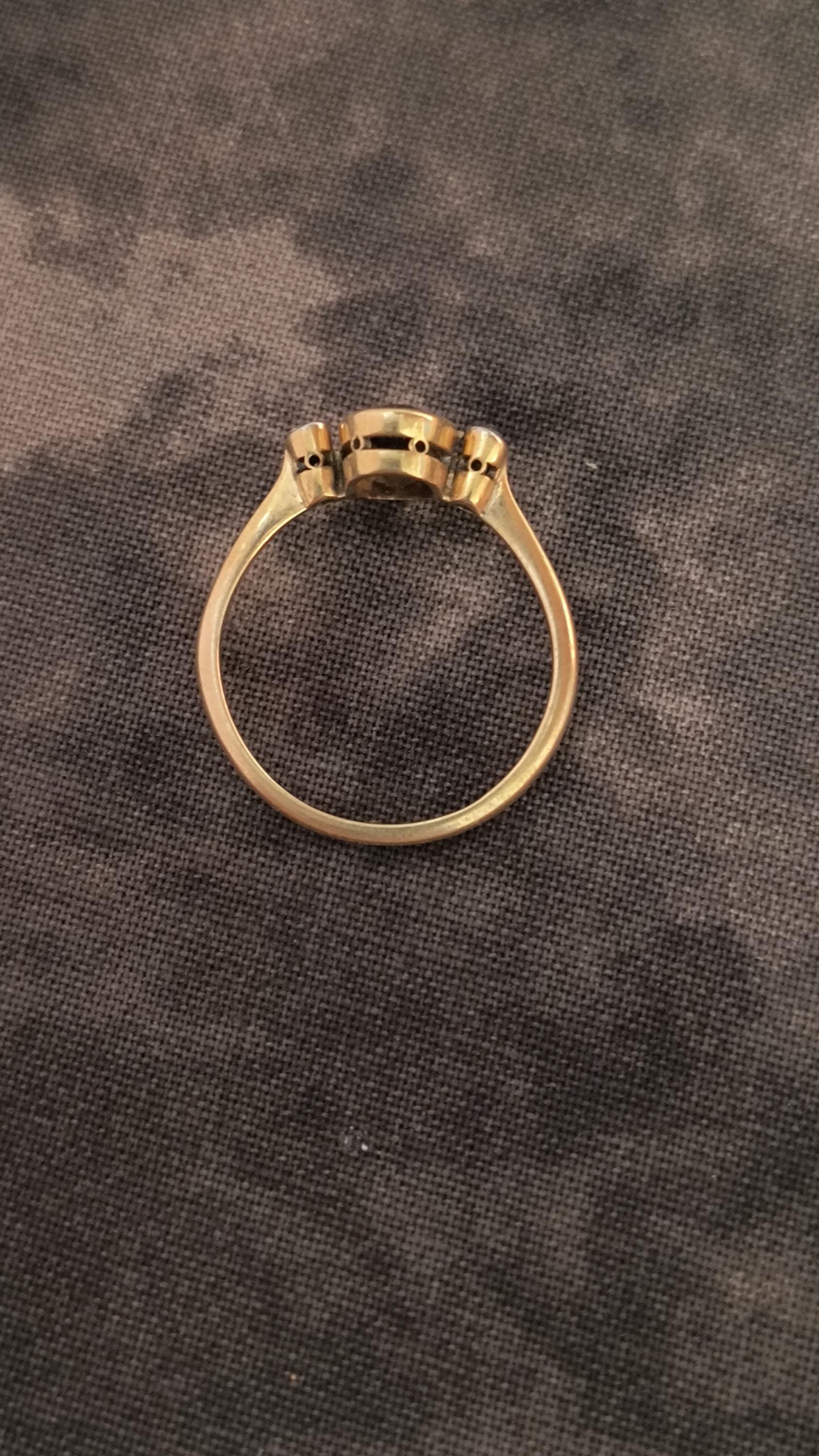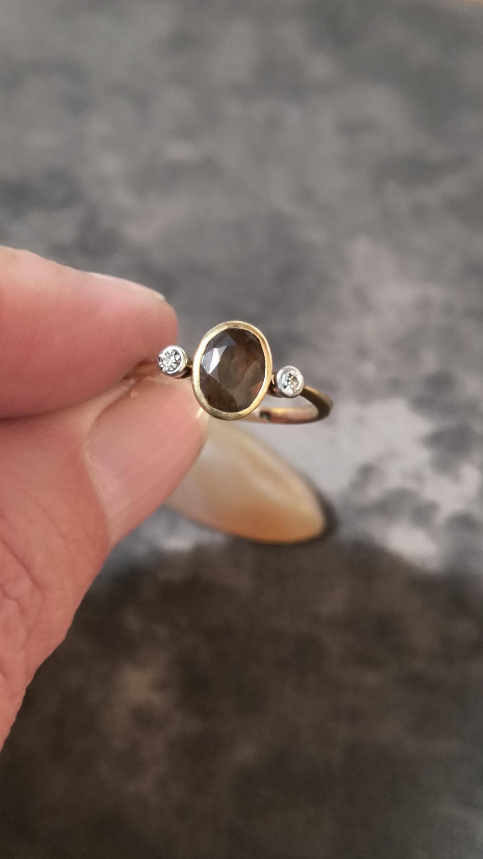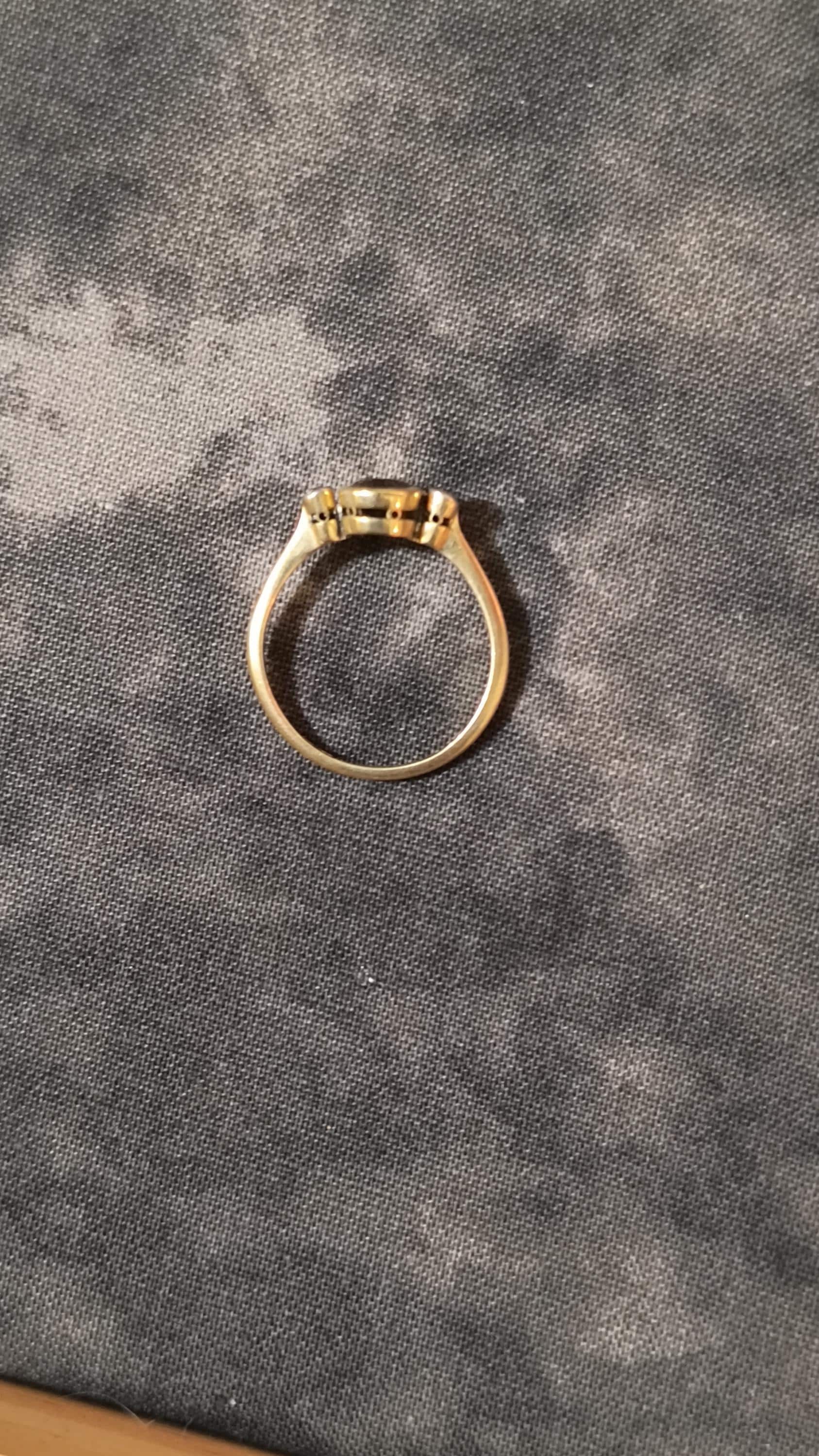 This particular ring is particularly interesting - the gem at the center is a bright, Hazel hued Sapphire. The stone is golden brown with hightlights of honey and soft green undertones. The diamonds on either side are single cuts, helping confirm the age of this lovely ring!