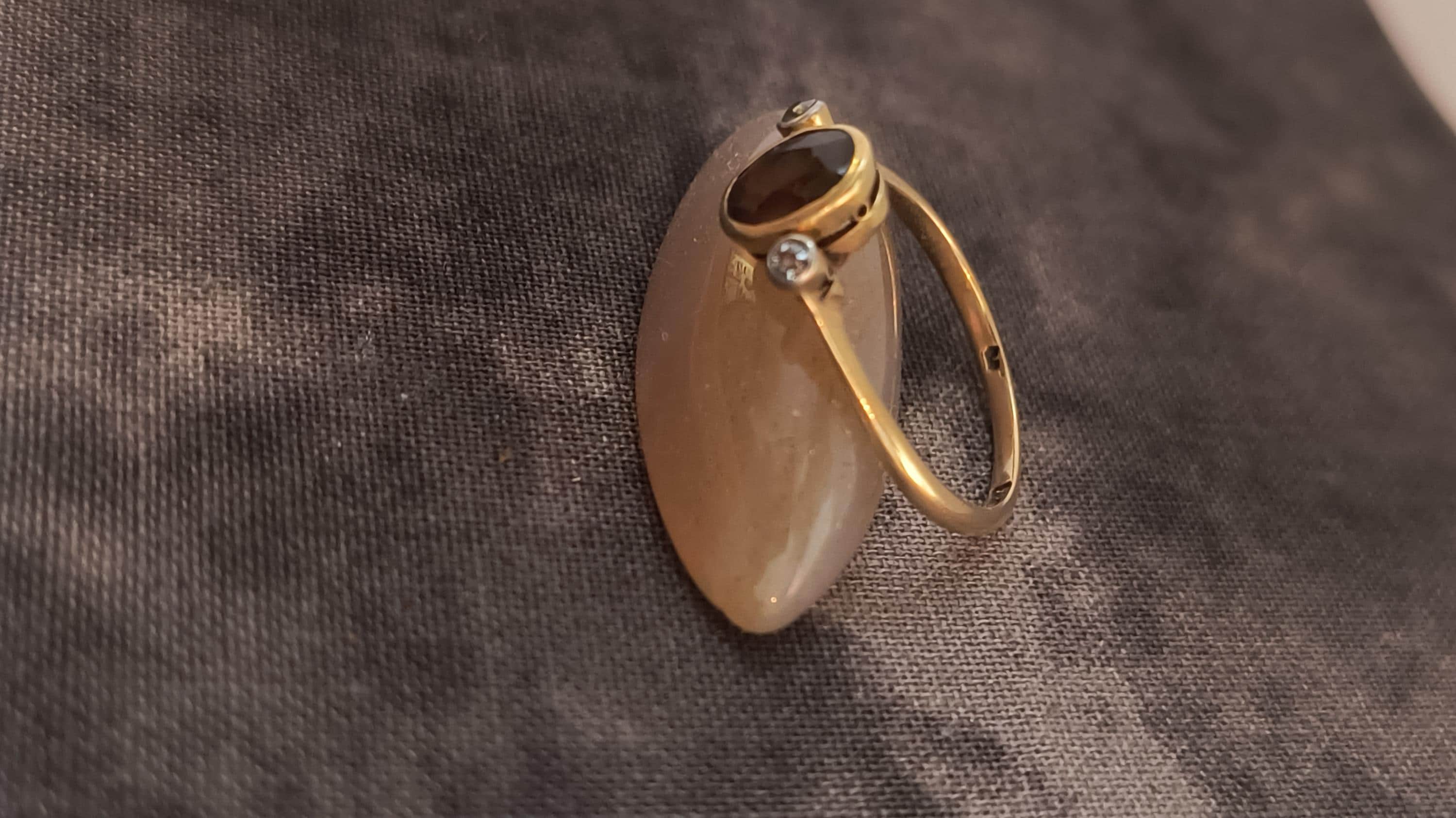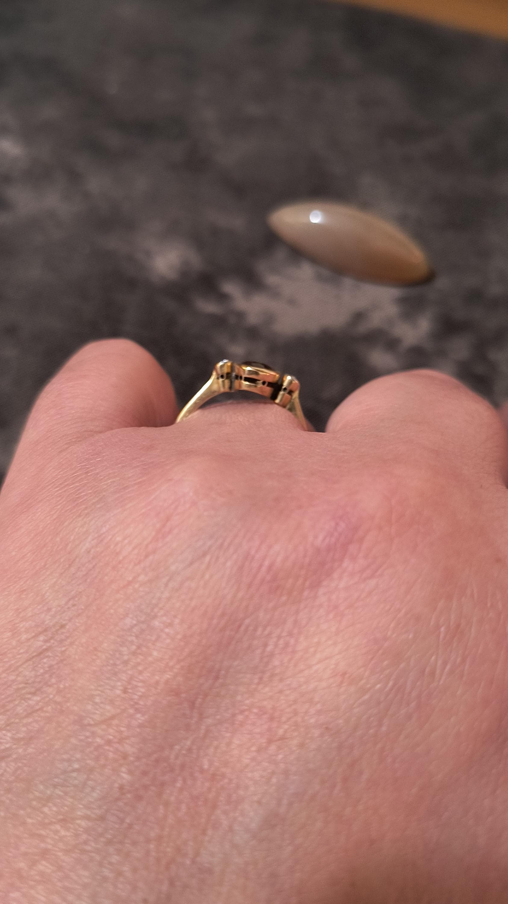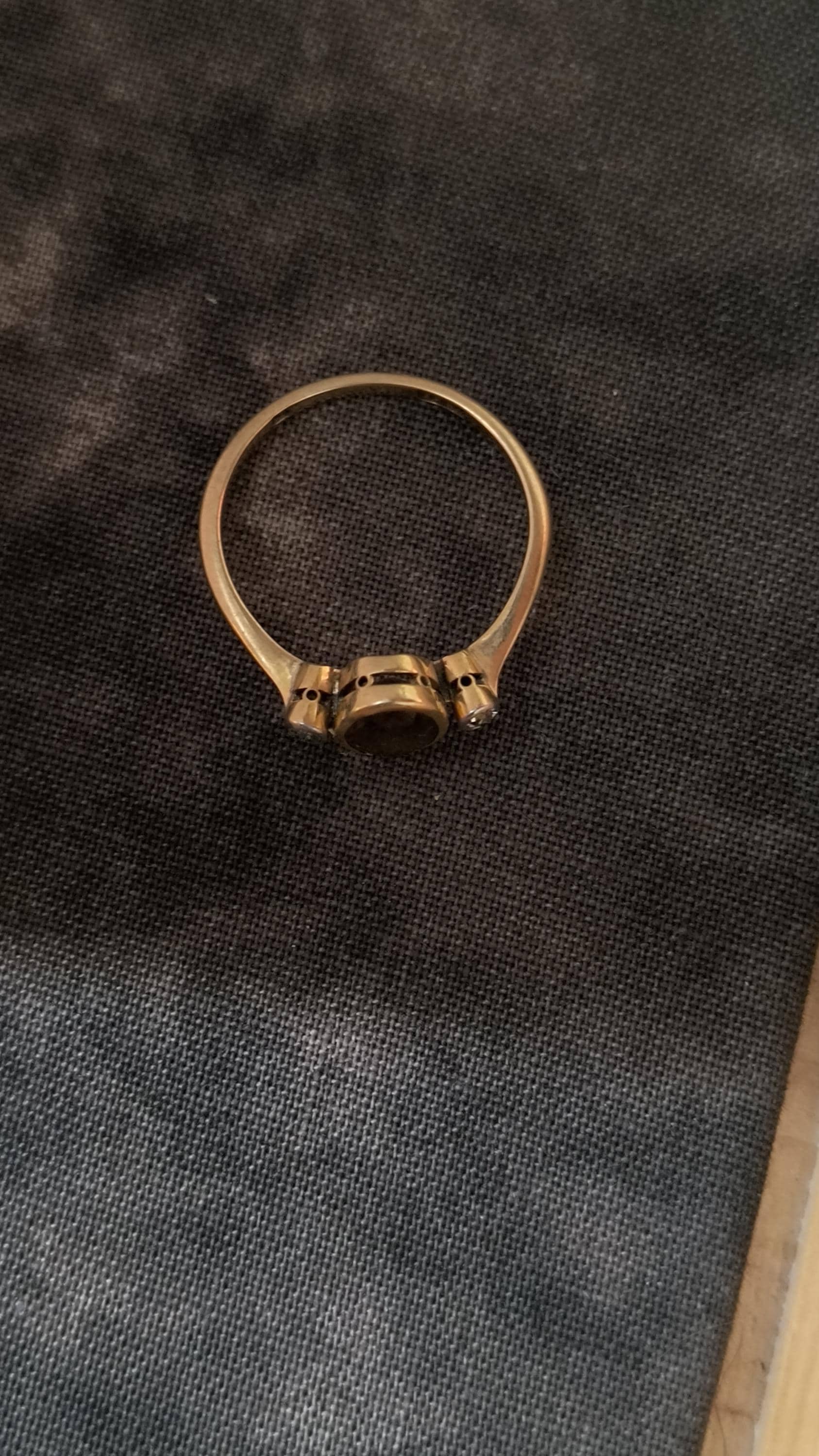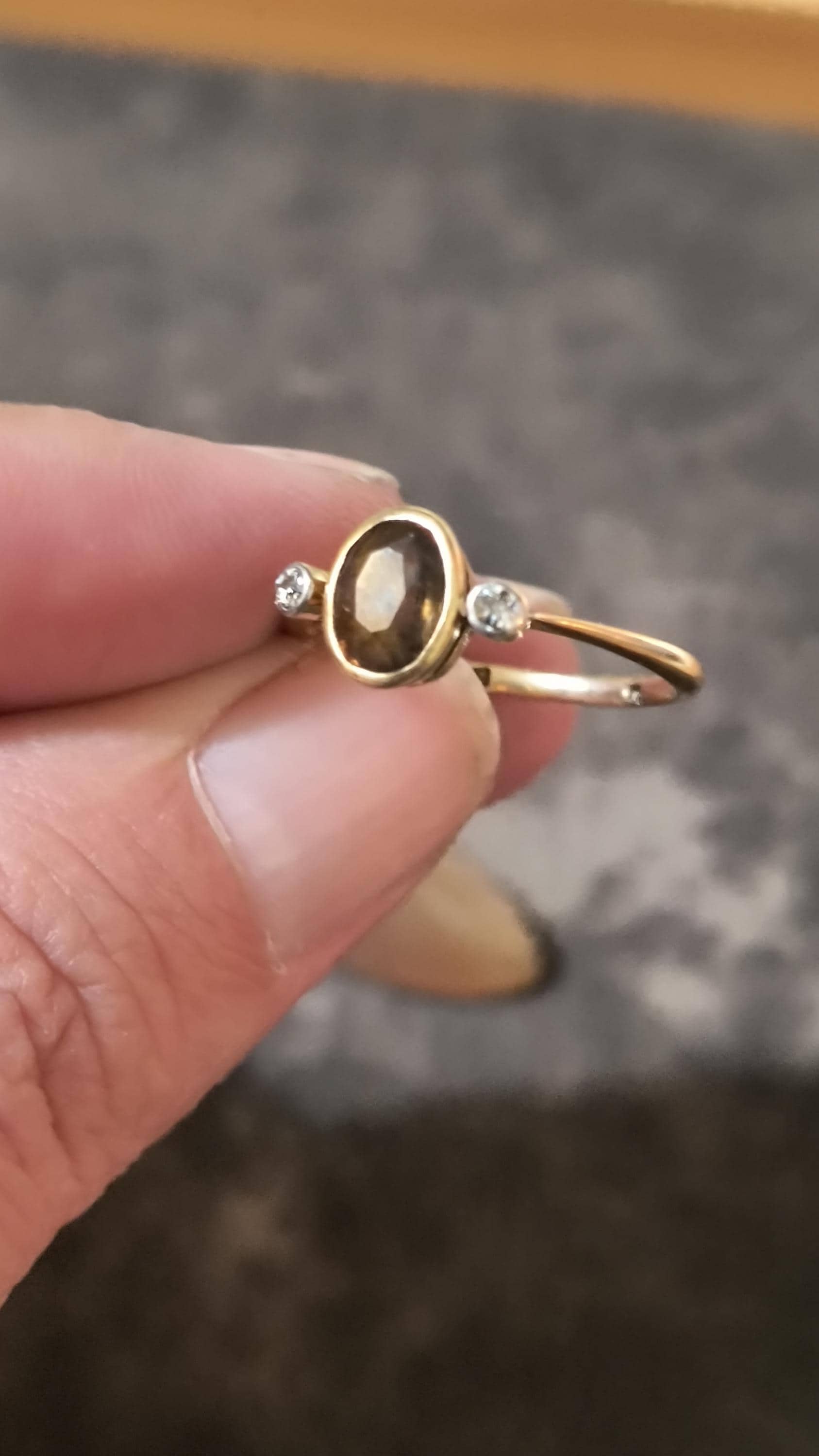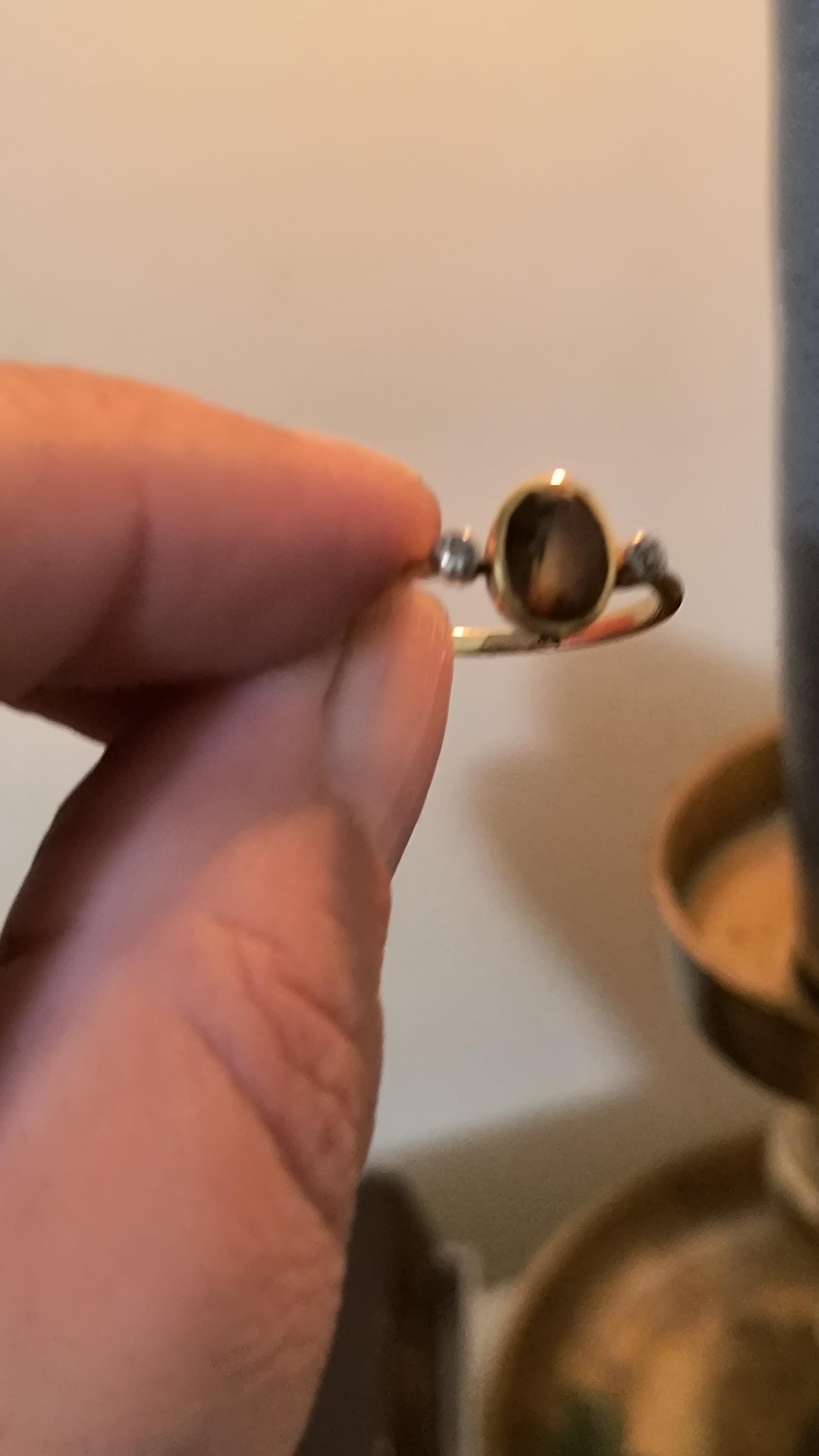 This particular ring is particularly interesting - the gem at the center is a bright, Hazel hued Sapphire. The stone is golden brown with hightlights of honey and soft green undertones. The diamonds on either side are single cuts, helping confirm the age of this lovely ring!