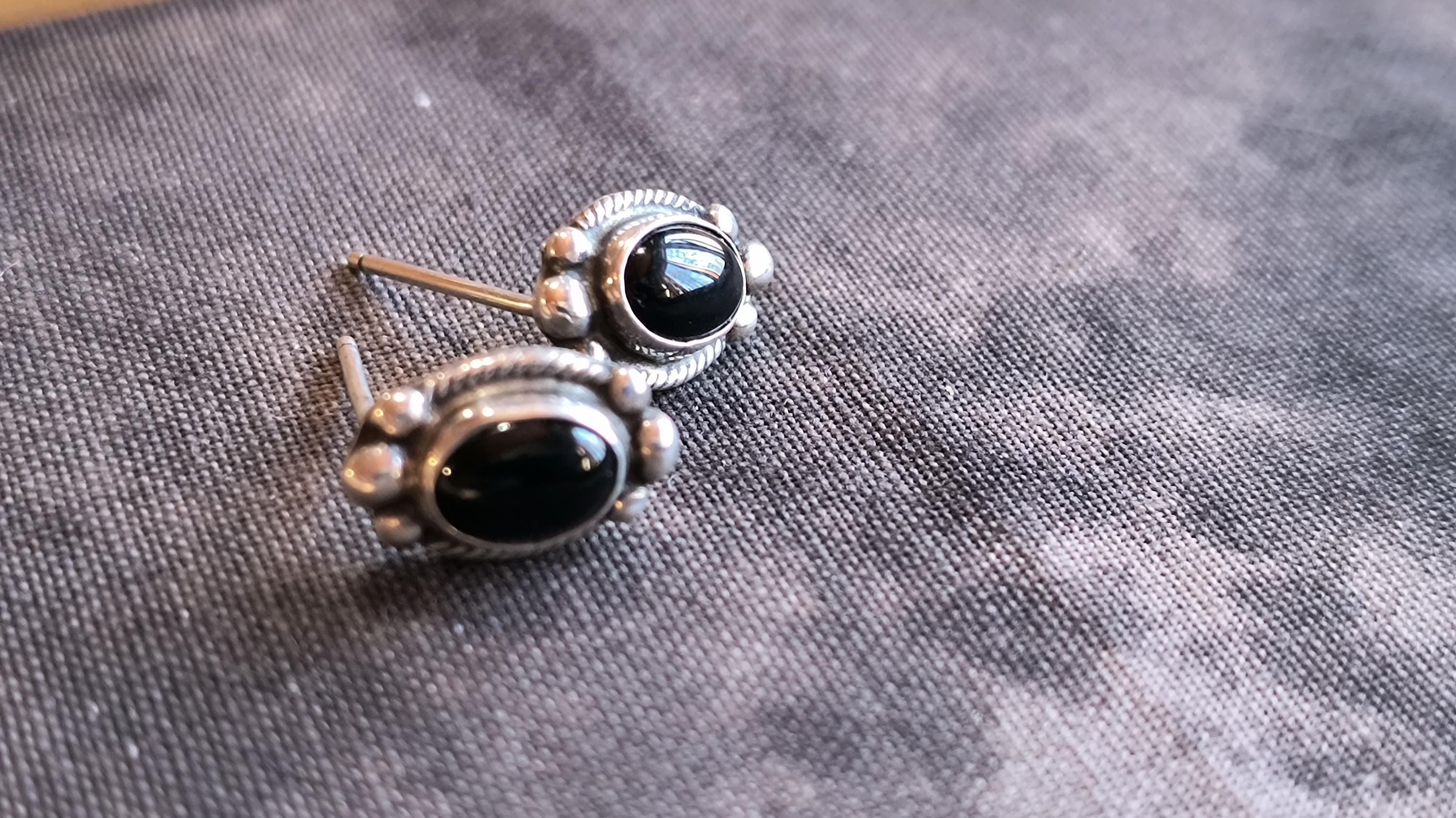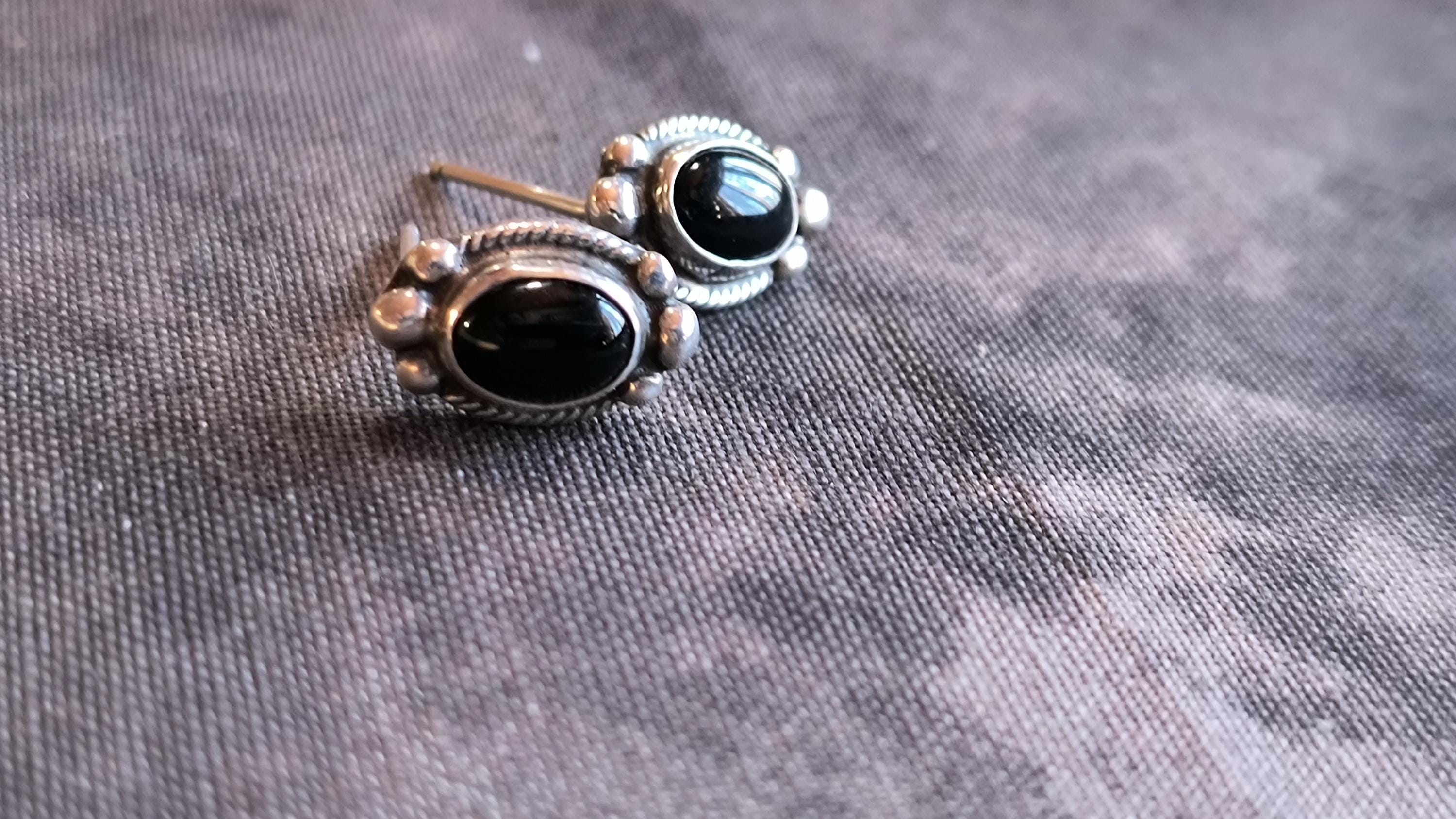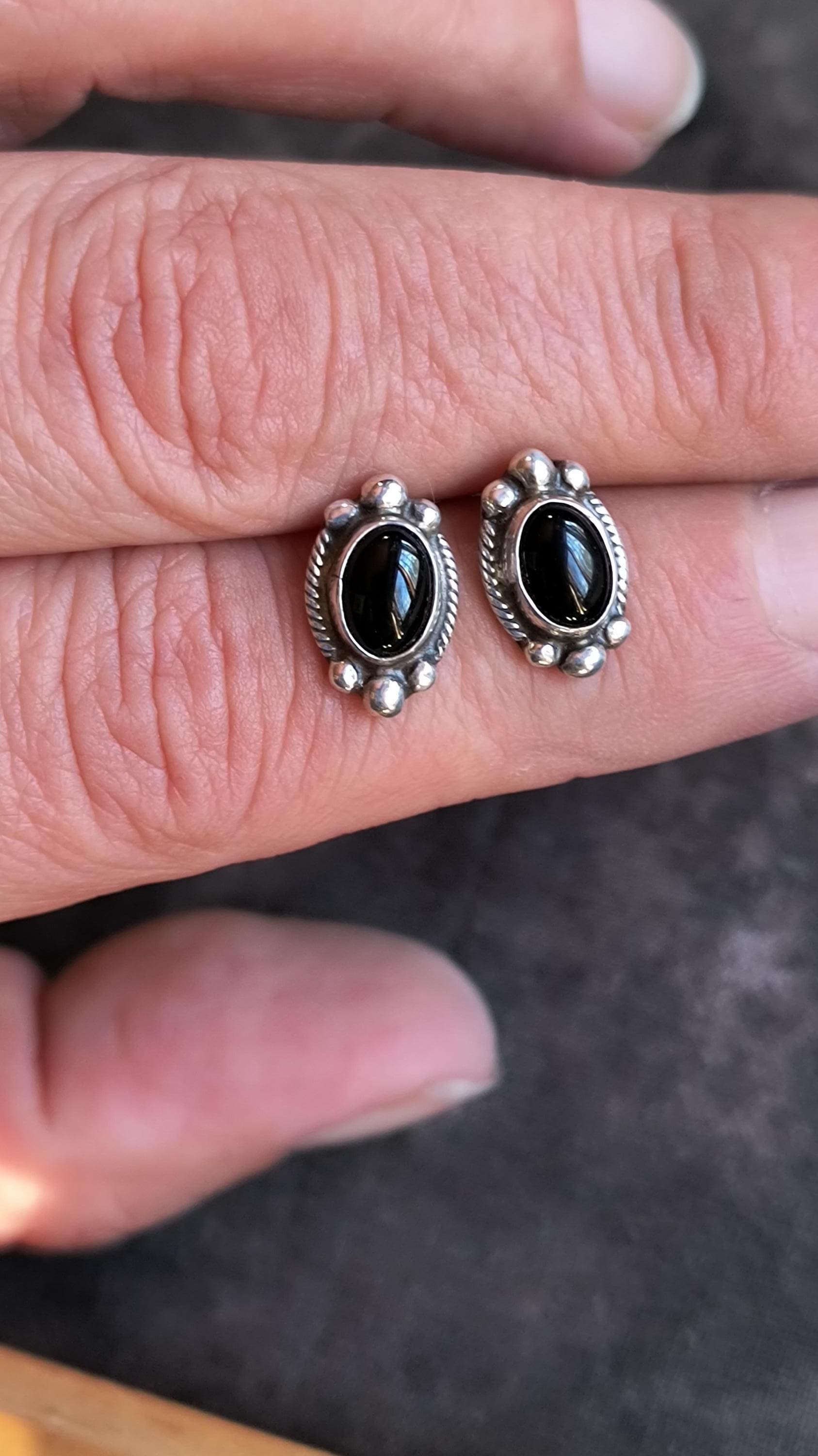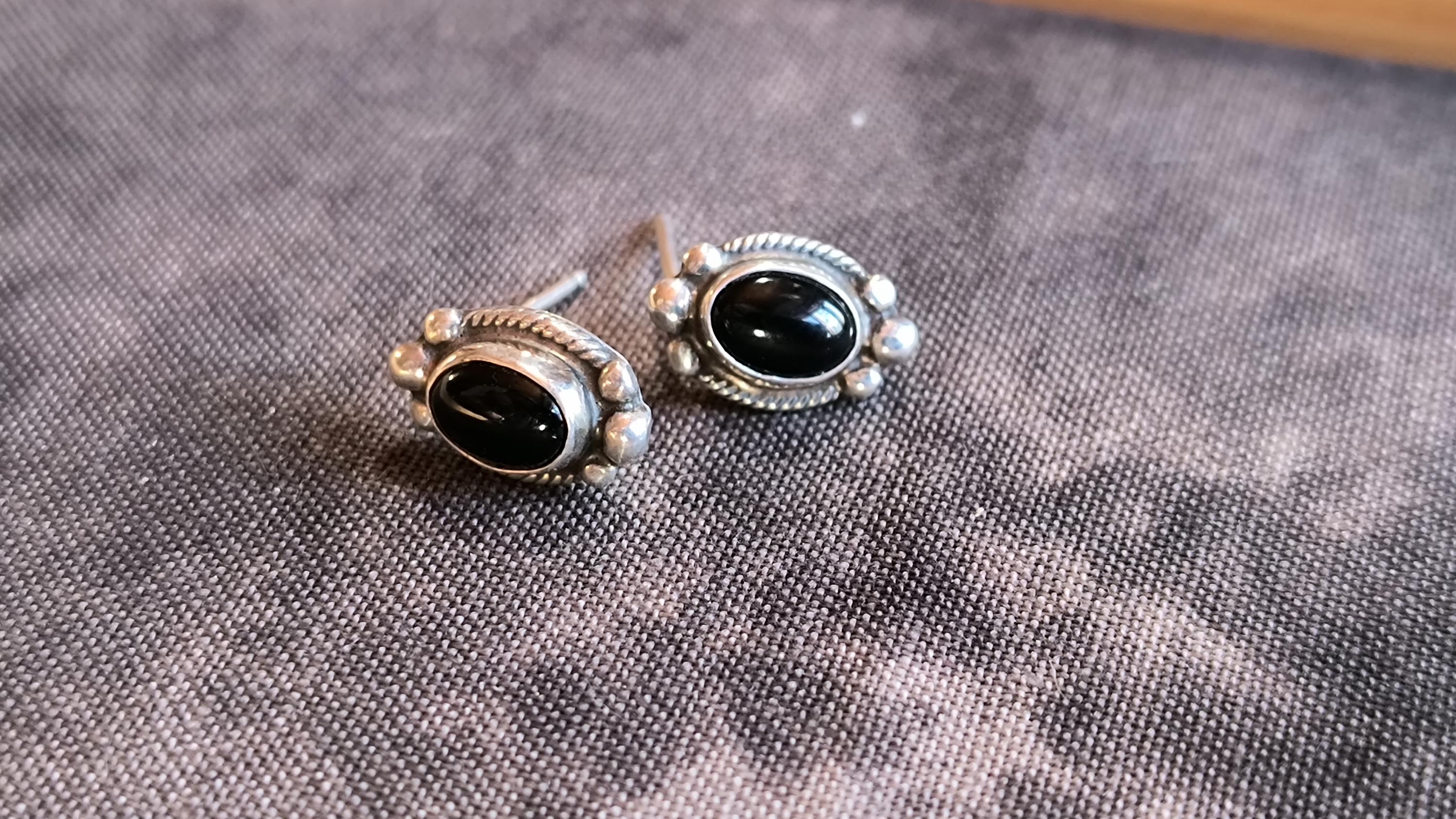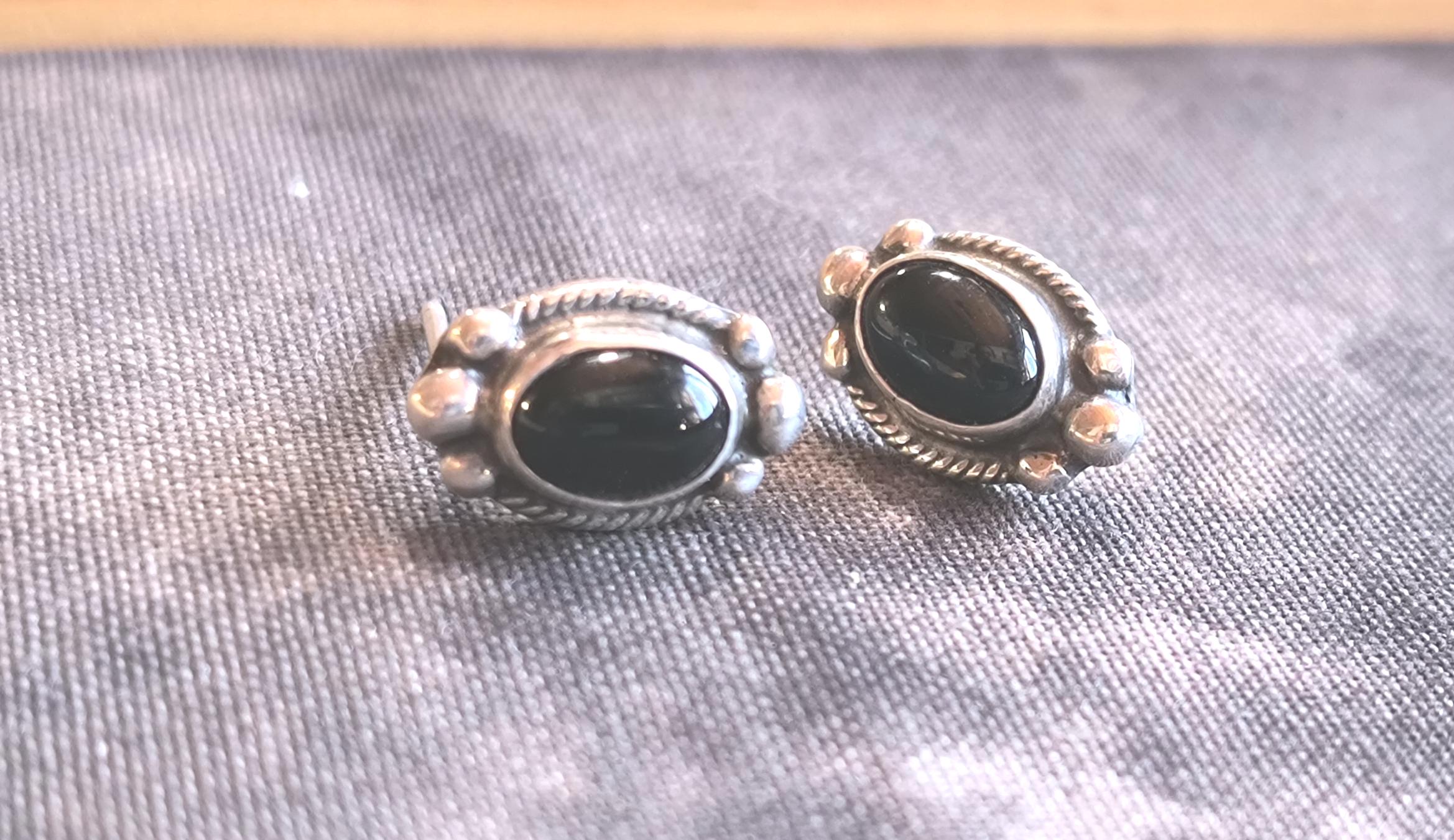 Simple classics, these are great vintage earrings for wearing day to day, or stacking with other, more complicated earrings. The onyx is deep black, with an excellent polish. The Sterling mark on these indicates they were made in the American Southwest.