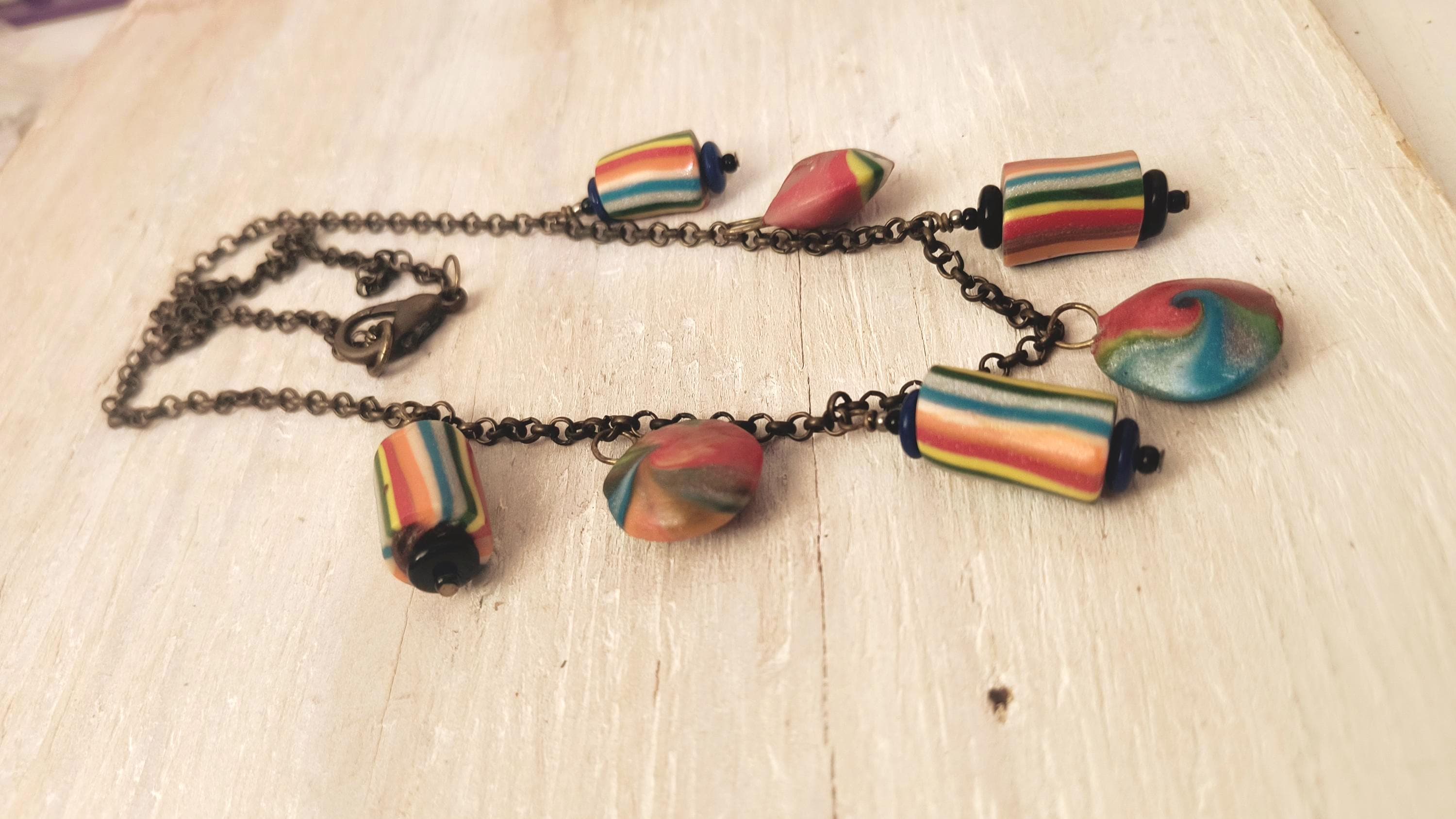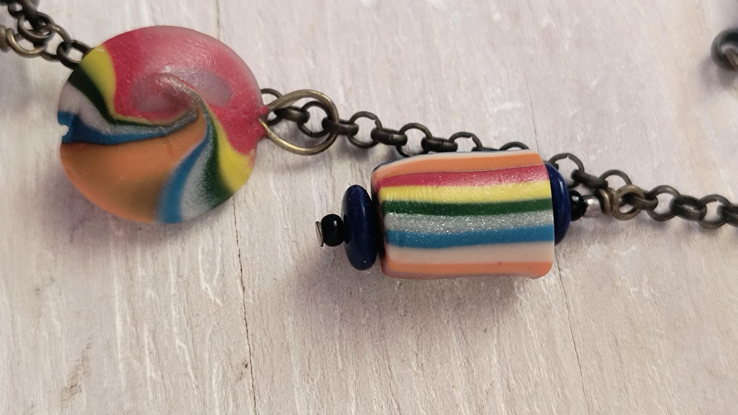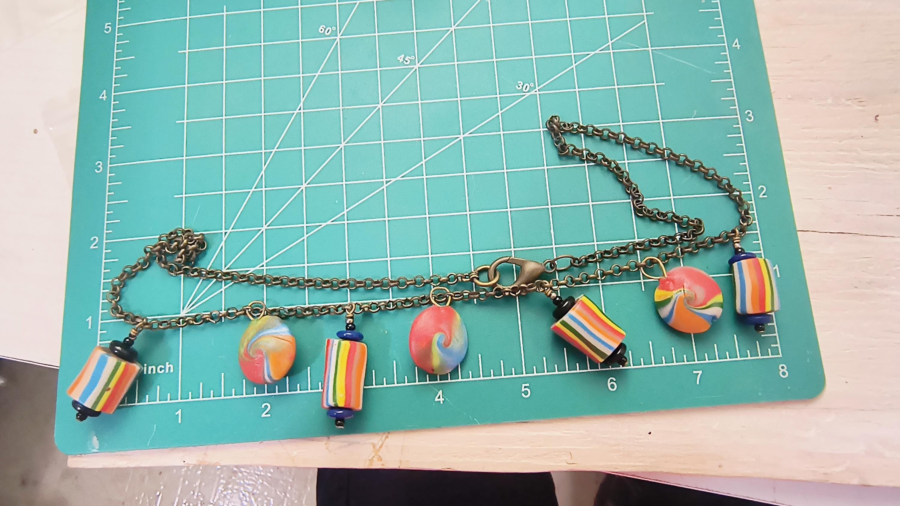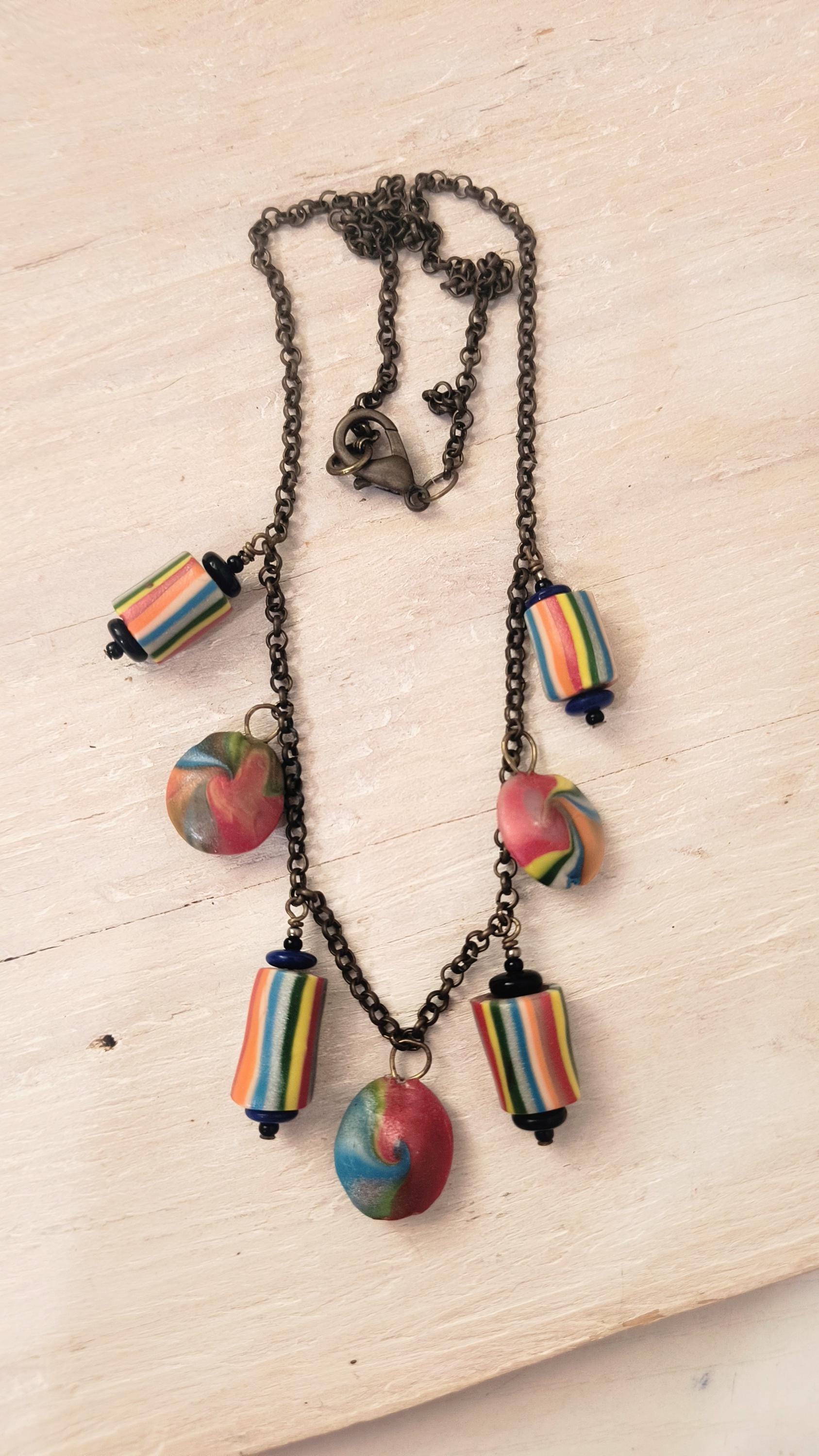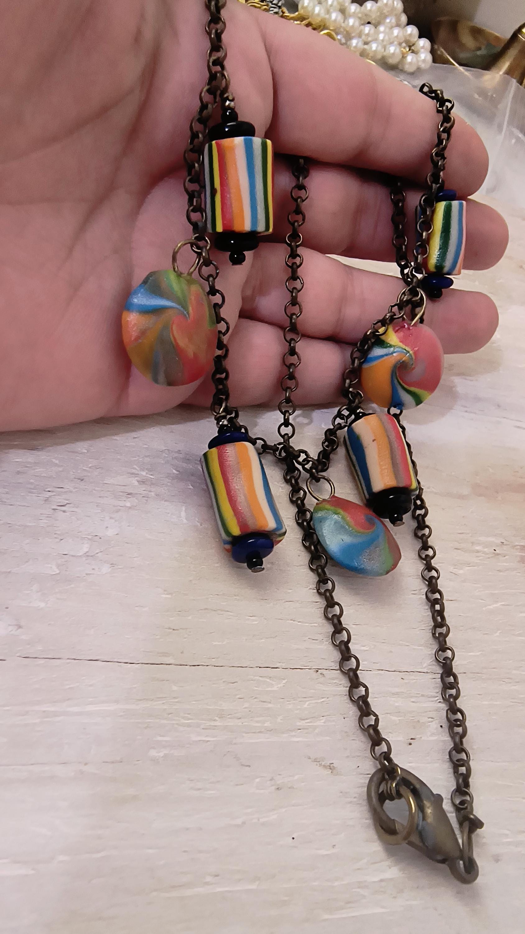Super fun and funky!! This Handmade necklace was crafted in Maine, using polymer clay to create color beads, and brass findings and chain. Perfect for Pride season, or to dress up a boho look, year round!