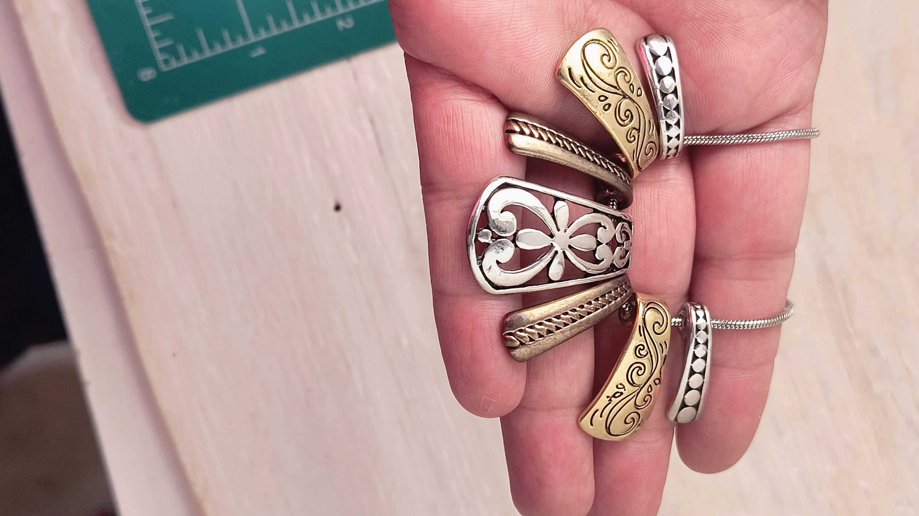 Metal: Bright Silvertone, Copper and goldstone metal.