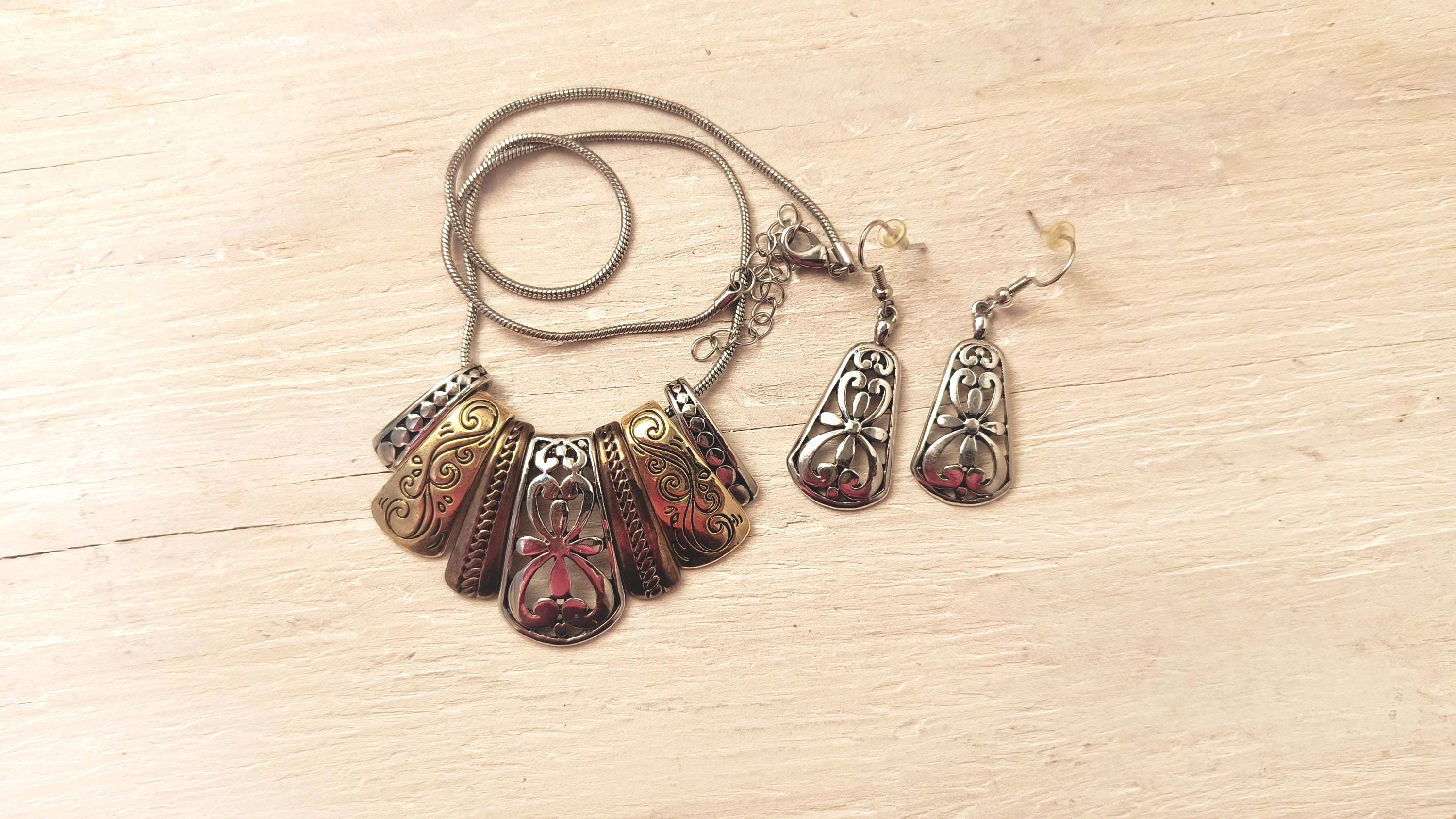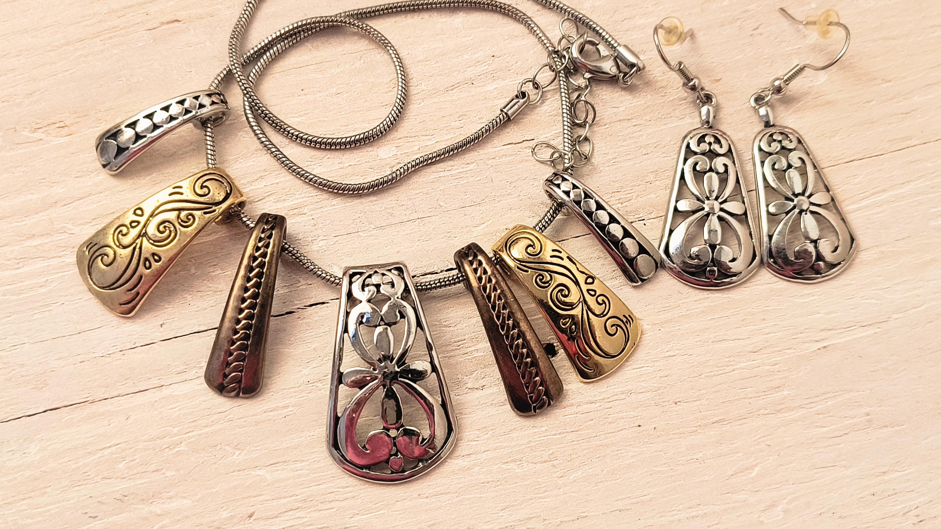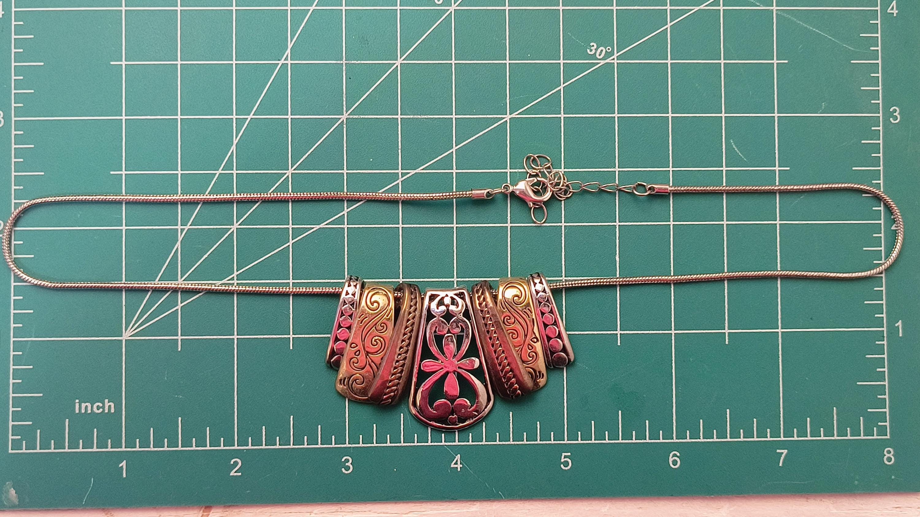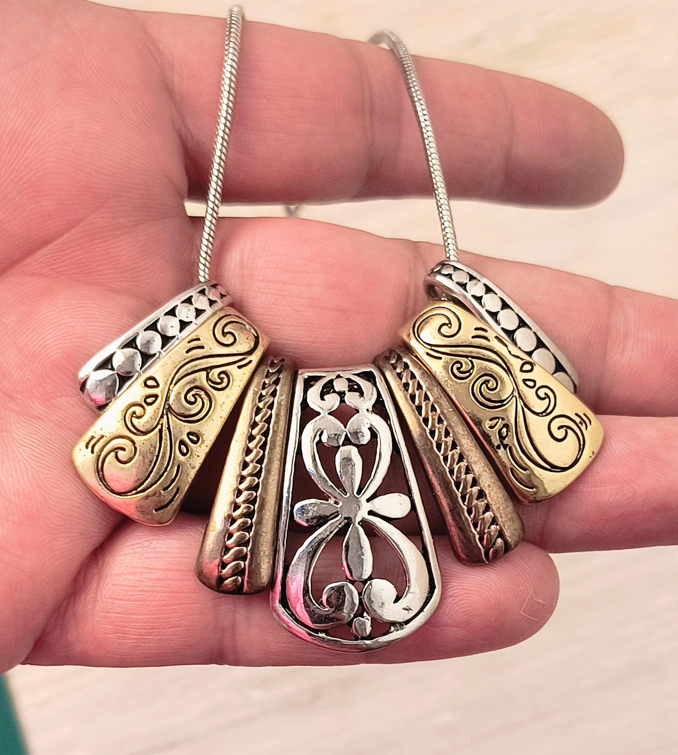 This necklace is the definition of high end costume jewelry! 7 panels, or tabs, slide freely on a snake chain, each with their own, distinctive, style. The earrings match the center slide, with a pretty, almost Spanish look to the filigree.
