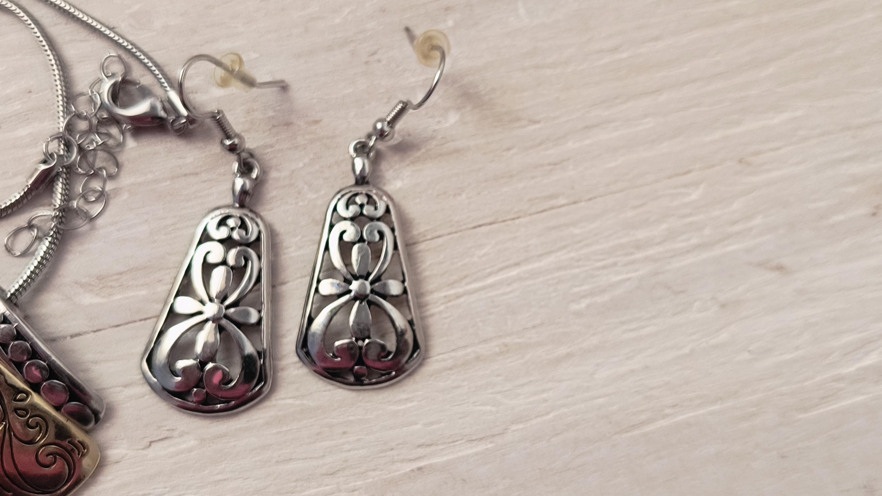 Length: Chain is 16 inches long, with the adjuster, this can be worn as long as 18 inches. The slides vary from 1 inch to 1 1/3 inch long. The earrings are 1 1/3 inch long total.