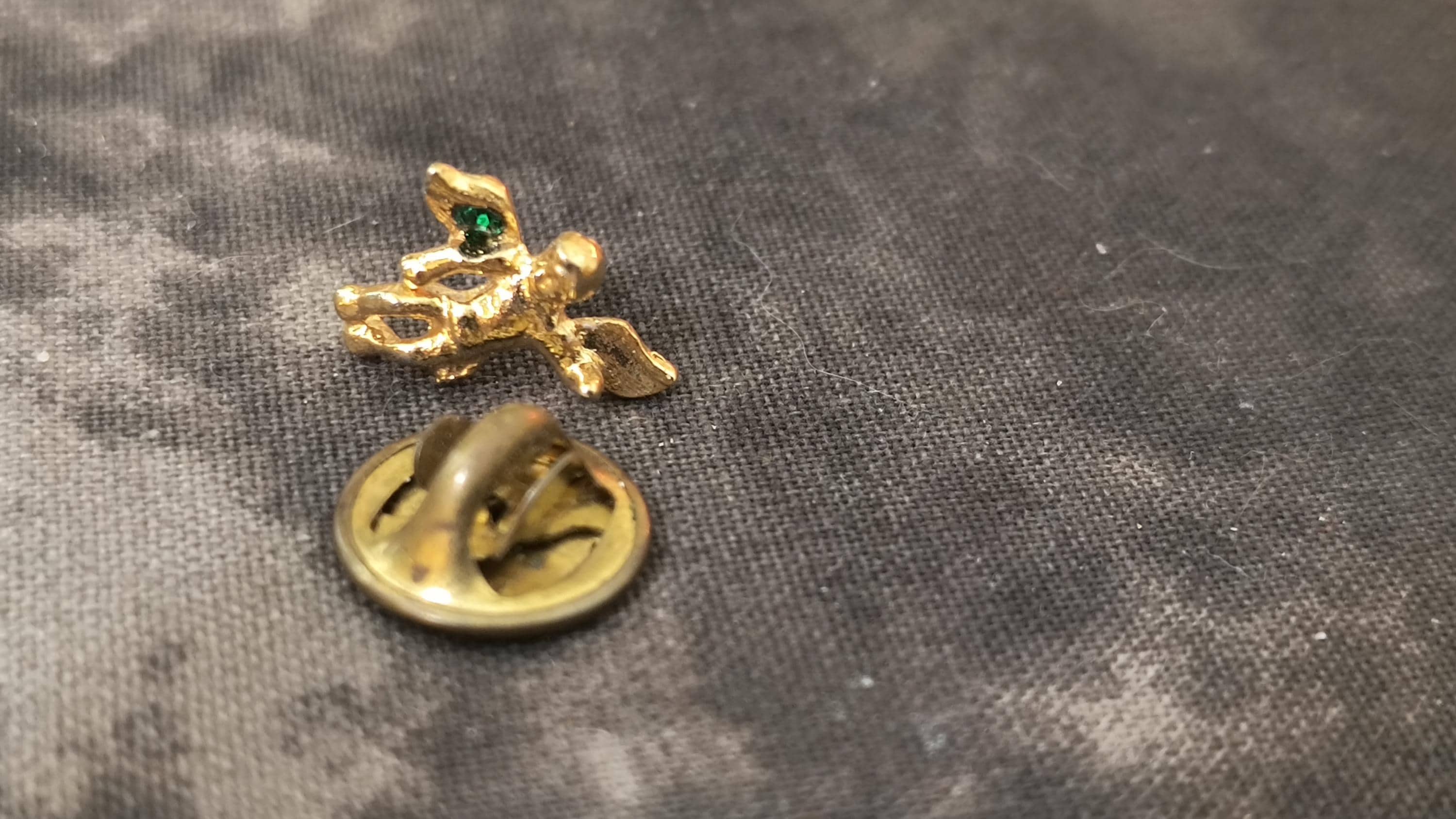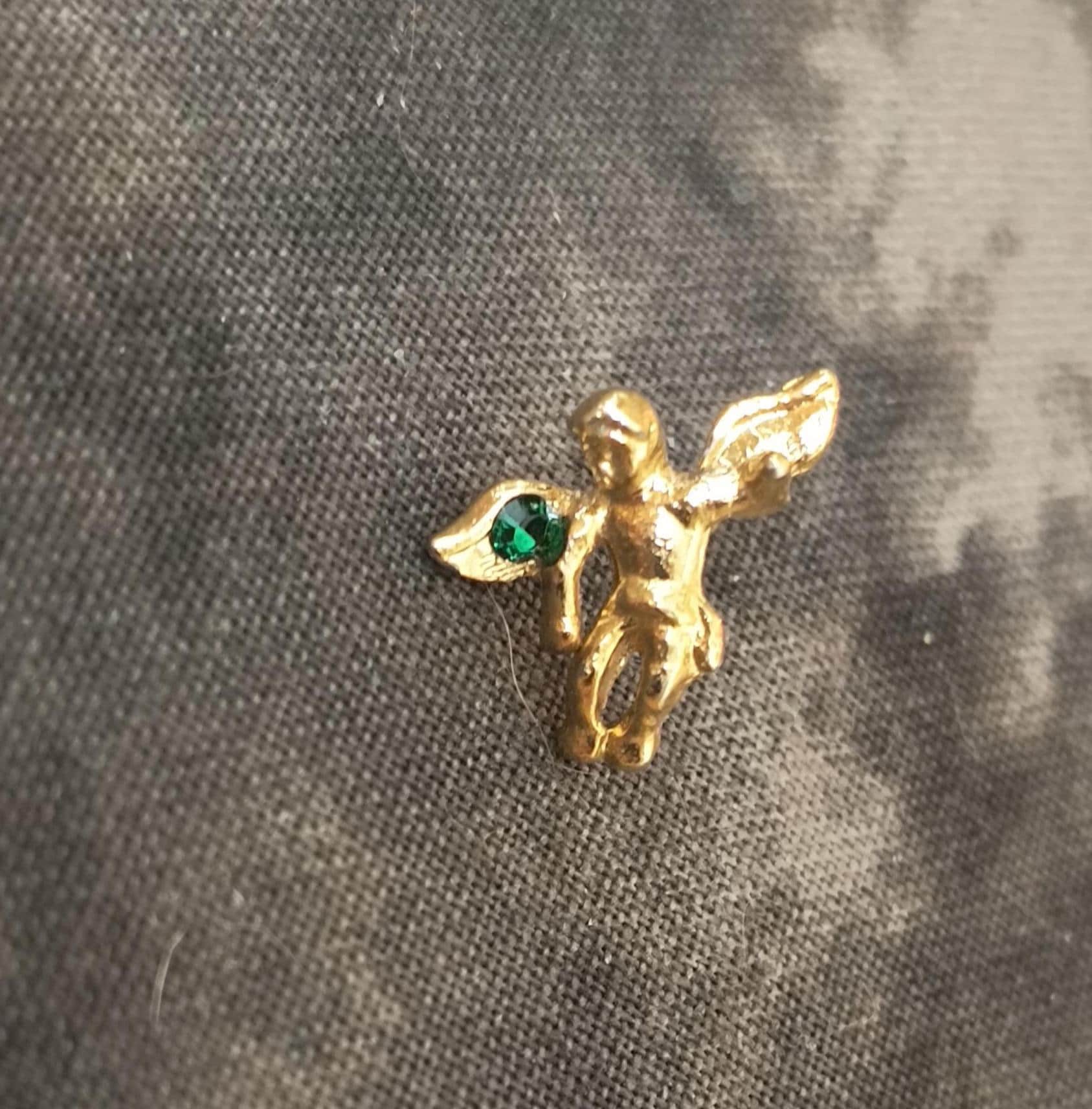 Here's a classic pin that can be worn on a lapel, hat, collar, or even pinned to a baby blanket or Christening / Baptism robe! The little green Rhinestone represents an emerald, the birthstone for the month of May.