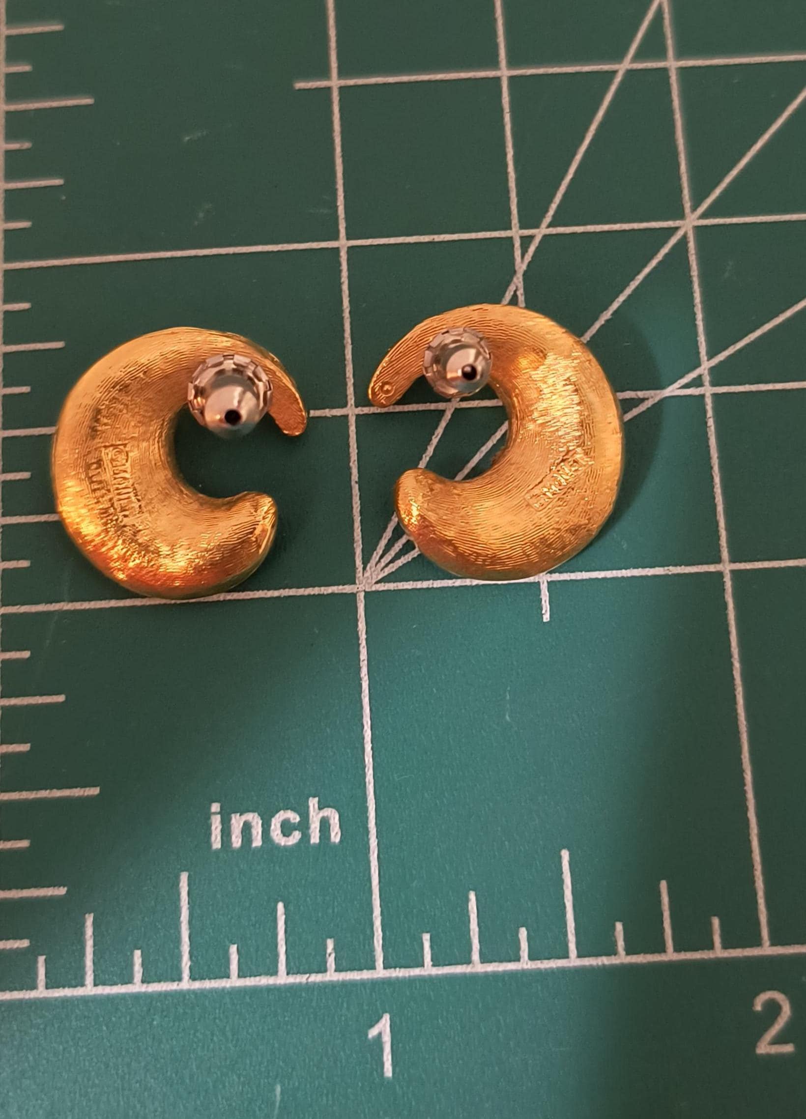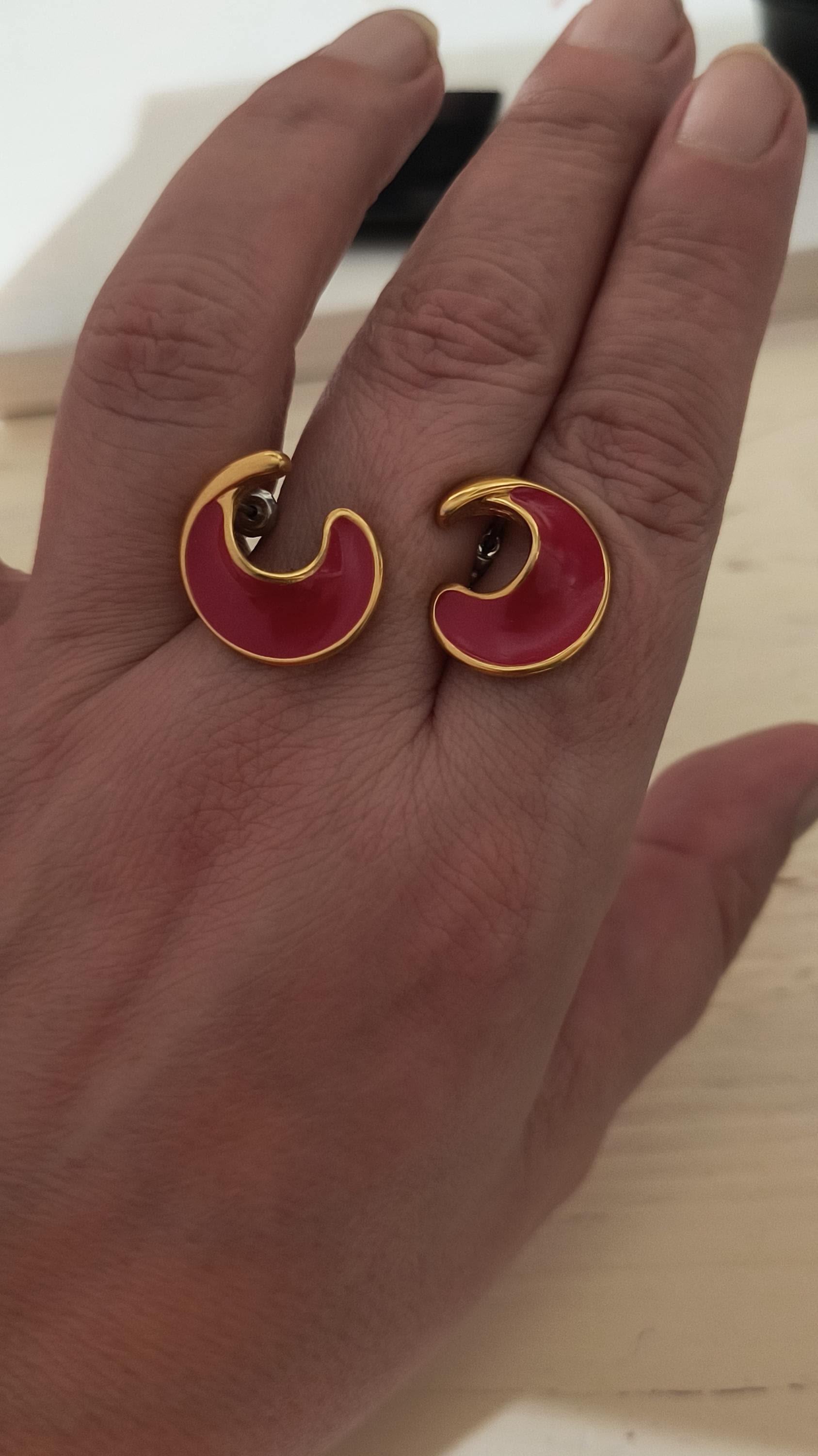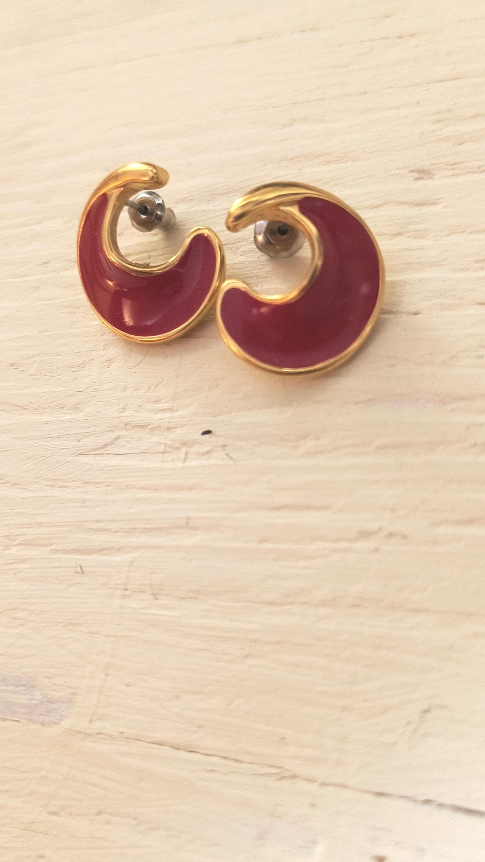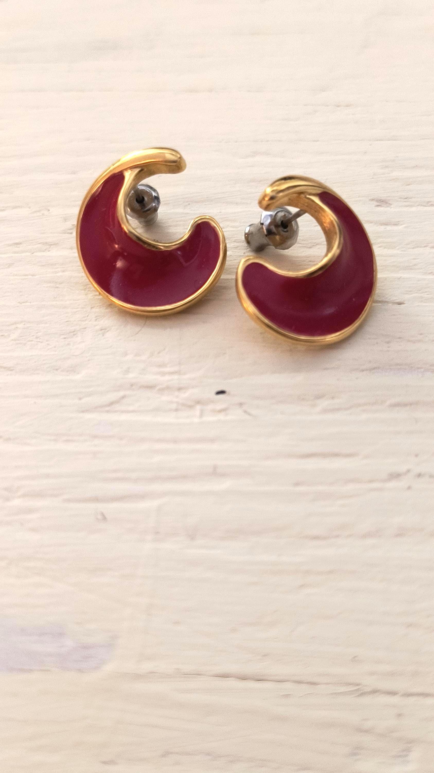 These are substantial, well crafted vintage earrings at an affordable price! Rhese have bright gold finish over the domed surface, with sweeping curves in deep, 80s hue crimson!
